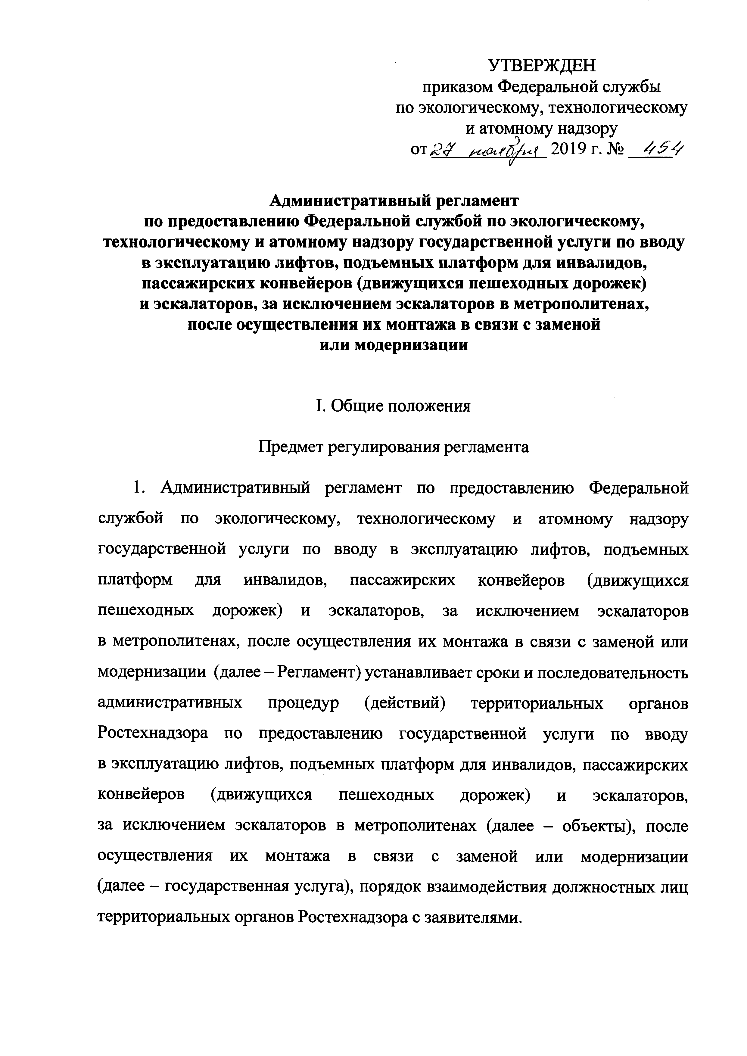Скачать Административный регламент по предоставлению Федеральной службой по экологическому, технологическому и атомному надзору государственной услуги по вводу в эксплуатацию лифтов, подъемных платформ для инвалидов, пассажирских конвейеров (движущихся пешеходных дорожек) и эскалаторов, за исключением эскалаторов в метрополитенах, после осуществления их монтажа в связи с заменой или модернизацииДата актуализации: 01.01.2021