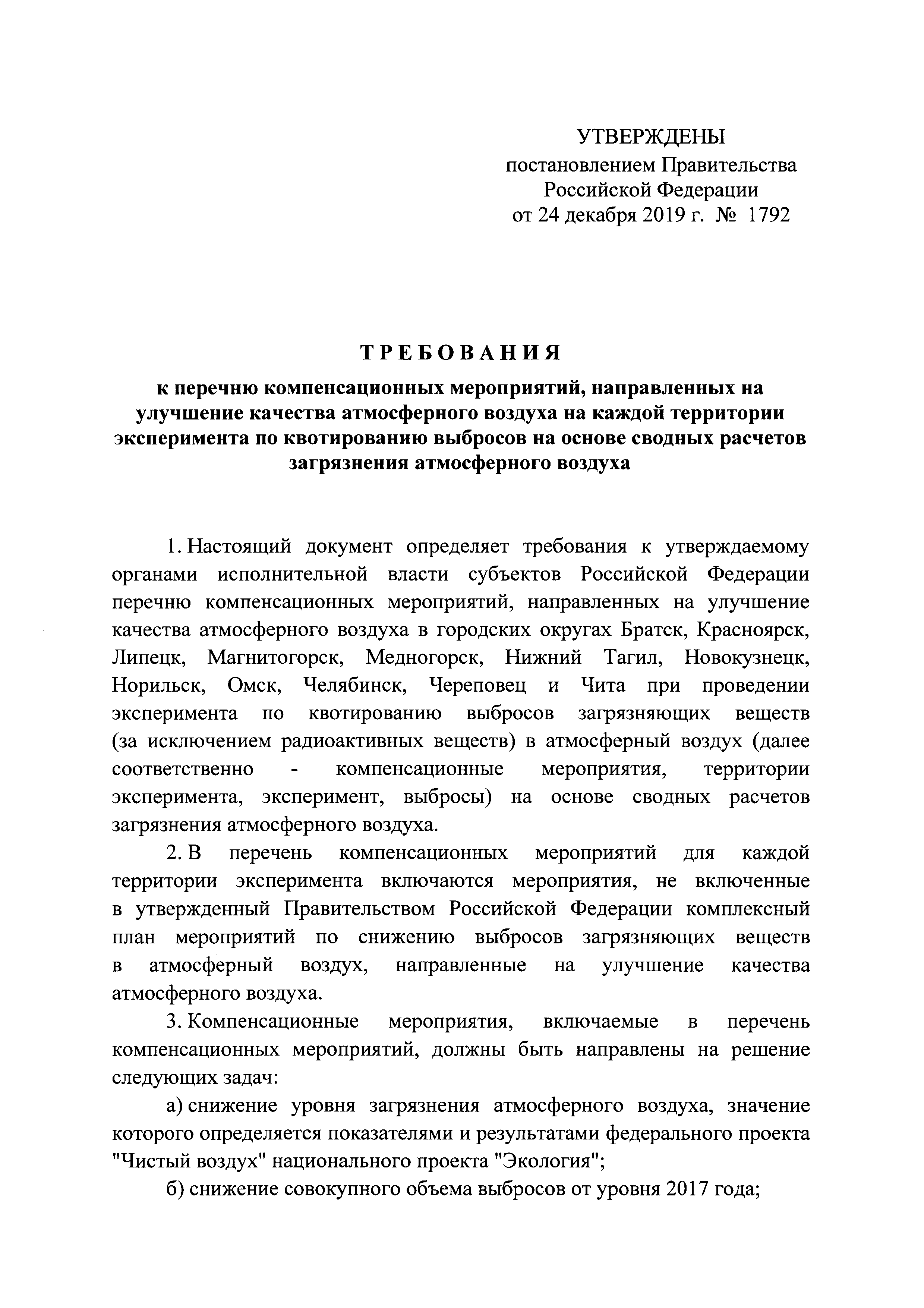 Требования к перечню компенсационных мероприятий, направленных на улучшение качества атмосферного воздуха на каждой территории эксперимента по квотированию выбросов на основе сводных расчетов загрязнения атмосферного воздуха| Статус: | действует | | Название рус.: | Требования к перечню компенсационных мероприятий, направленных на улучшение качества атмосферного воздуха на каждой территории эксперимента по квотированию выбросов на основе сводных расчетов загрязнения атмосферного воздуха | | Дата добавления в базу: | 01.01.2021 | | Дата актуализации: | 01.01.2021 | | Дата введения: | 07.01.2020 | | Область применения: | Документ определяет требования к утверждаемому органами исполнительной власти субъектов Российской Федерации перечню компенсационных мероприятий, направленных на улучшение качества атмосферного воздуха в городских округах Братск, Красноярск, Липецк, Магнитогорск, Медногорск, Нижний Тагил, Новокузнецк, Норильск, Омск, Челябинск, Череповец и Чита при проведении эксперимента по квотированию выбросов загрязняющих веществ (за исключением радиоактивных веществ) в атмосферный воздух на основе сводных расчетов загрязнения атмосферного воздуха | | Утверждён: | 24.12.2019 Правительство Российской Федерации (1792)