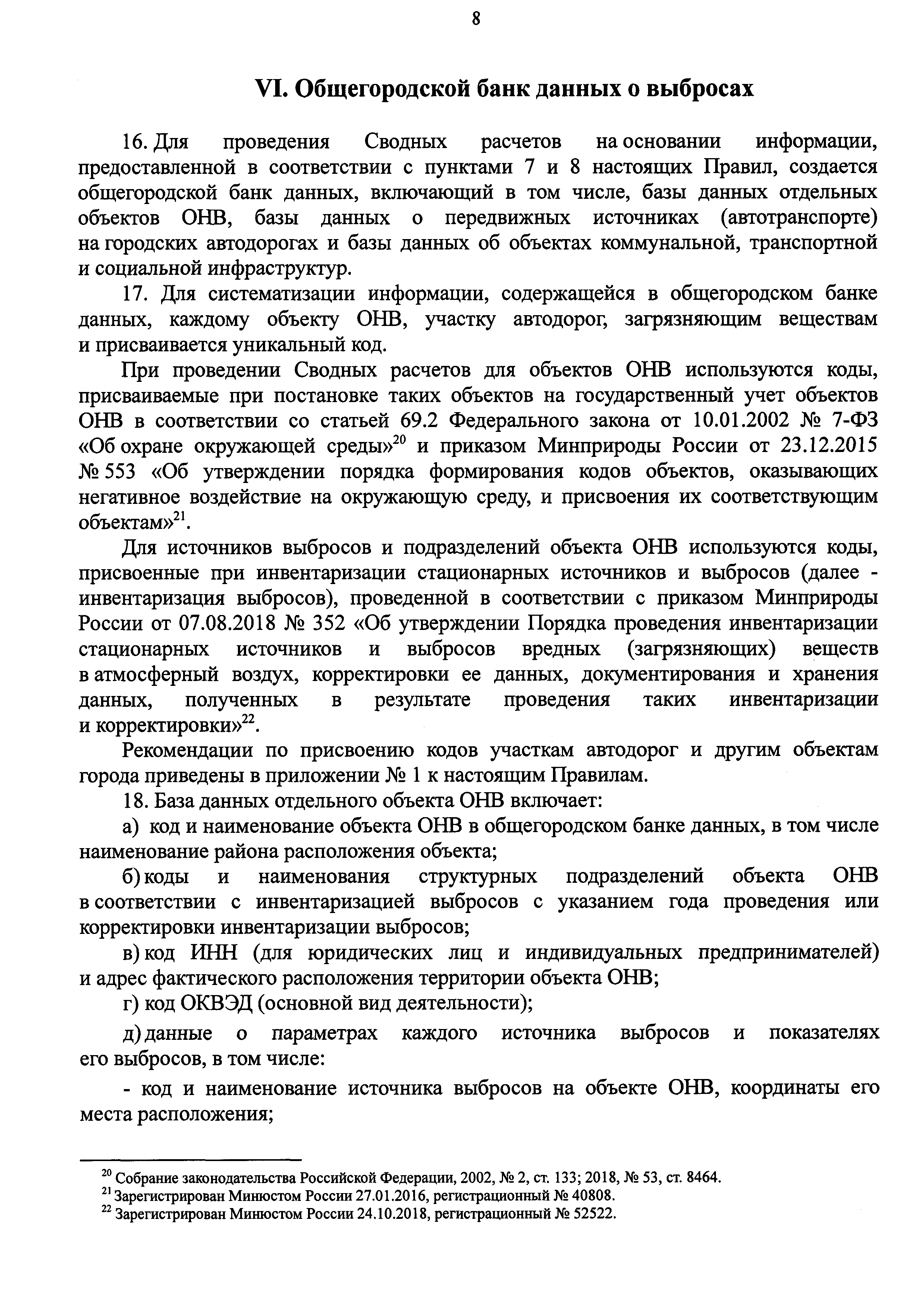 | Оглавление: | I. Общие положения II. Информация, необходимая для проведения Сводных расчетов, включая уточнение их результатов III. Сбор информации для проведения Сводных расчетов IV. Организация работ по проведению Сводных расчетов V. Программные средства, используемые для проведения Сводных расчетов VI. Общегородской банк данных о выбросах VII. Расчеты концентраций загрязняющих веществ в атмосферном воздухе VIII. Уточнение результатов проведения Сводных расчетов IX. Заключение о проведении Сводных расчетов X. Актуализация результатов проведения Сводных расчетов Приложение № 1. Рекомендации по присвоению кодов участкам автодорог и другим объектам города Приложение № 2. Перечень загрязняющих веществ, по которым превышены гигиенические нормативы качества атмосферного воздуха Приложение № 3. Перечень объектов с наибольшим воздействием на атмосферный воздух Приложение № 4. Перечень контрольных точек для определения допустимых вкладов |