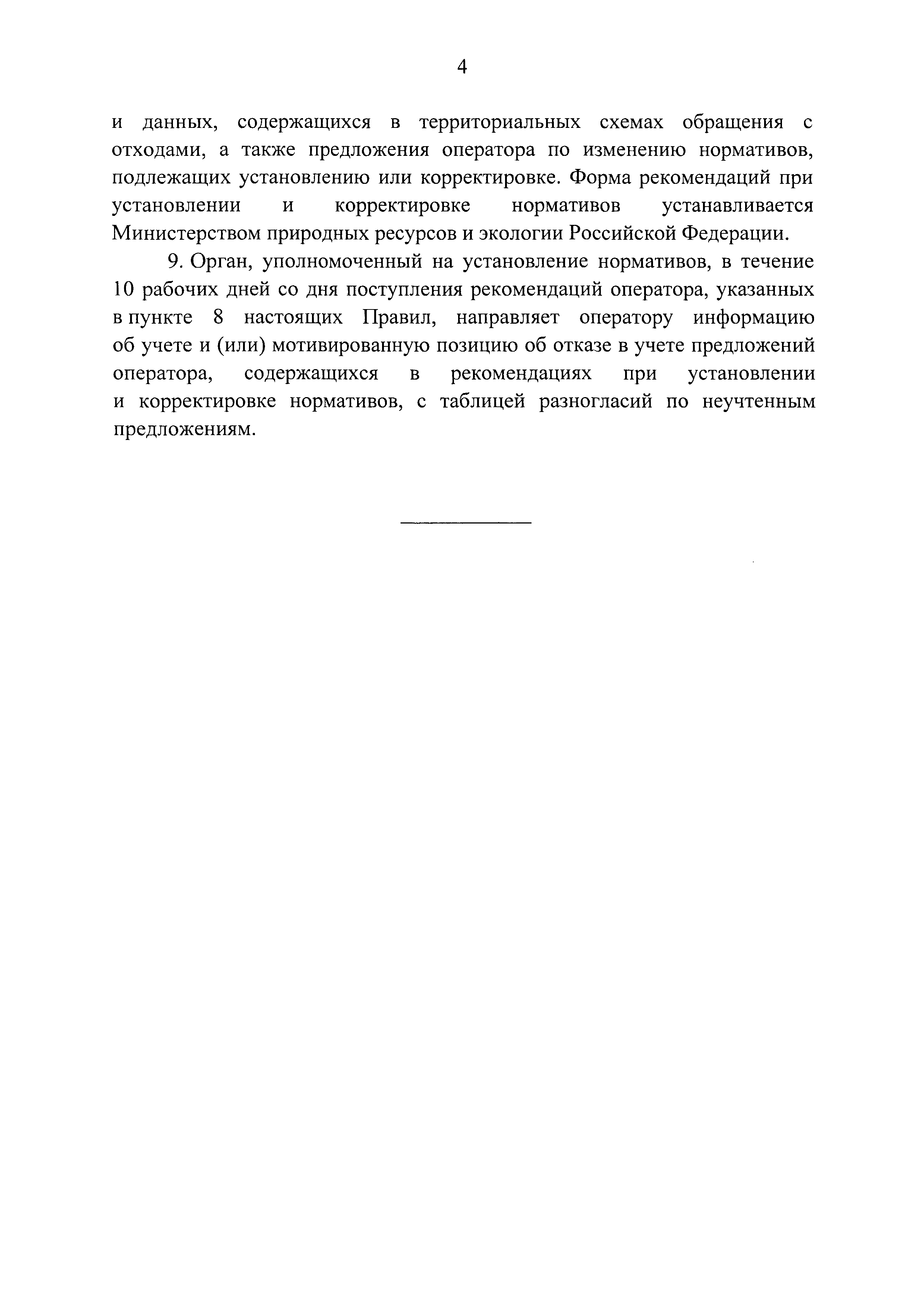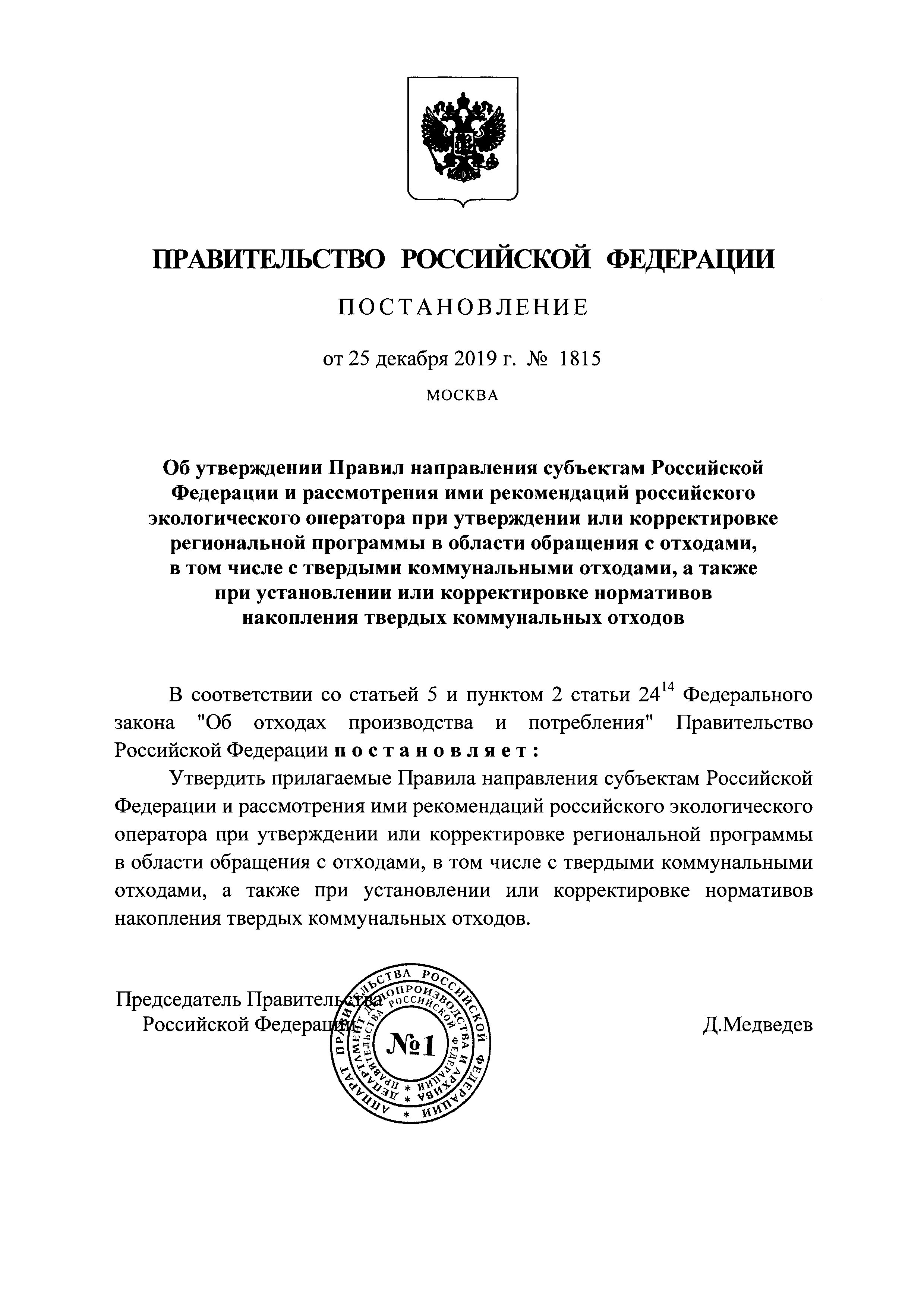 Правила направления субъектам Российской Федерации и рассмотрения ими рекомендаций российского экологического оператора при утверждении или корректировке региональной программы в области обращения с отходами, в том числе с твердыми коммунальными отходами, а также при установлении или корректировке нормативов накопления твердых коммунальных отходов| Статус: | действует | | Название рус.: | Правила направления субъектам Российской Федерации и рассмотрения ими рекомендаций российского экологического оператора при утверждении или корректировке региональной программы в области обращения с отходами, в том числе с твердыми коммунальными отходами, а также при установлении или корректировке нормативов накопления твердых коммунальных отходов | | Дата добавления в базу: | 01.01.2021 | | Дата актуализации: | 01.01.2021 | | Дата введения: | 04.01.2020 | | Область применения: | Правила устанавливают порядок направления субъектам Российской Федерации и рассмотрения ими рекомендаций российского экологического оператора при утверждении или корректировке региональной программы в области обращения с отходами, в том числе с твердыми коммунальными отходами, а также при установлении или корректировке нормативов накопления твердых коммунальных отходов | | Утверждён: | 25.12.2019 Правительство Российской Федерации (1815)