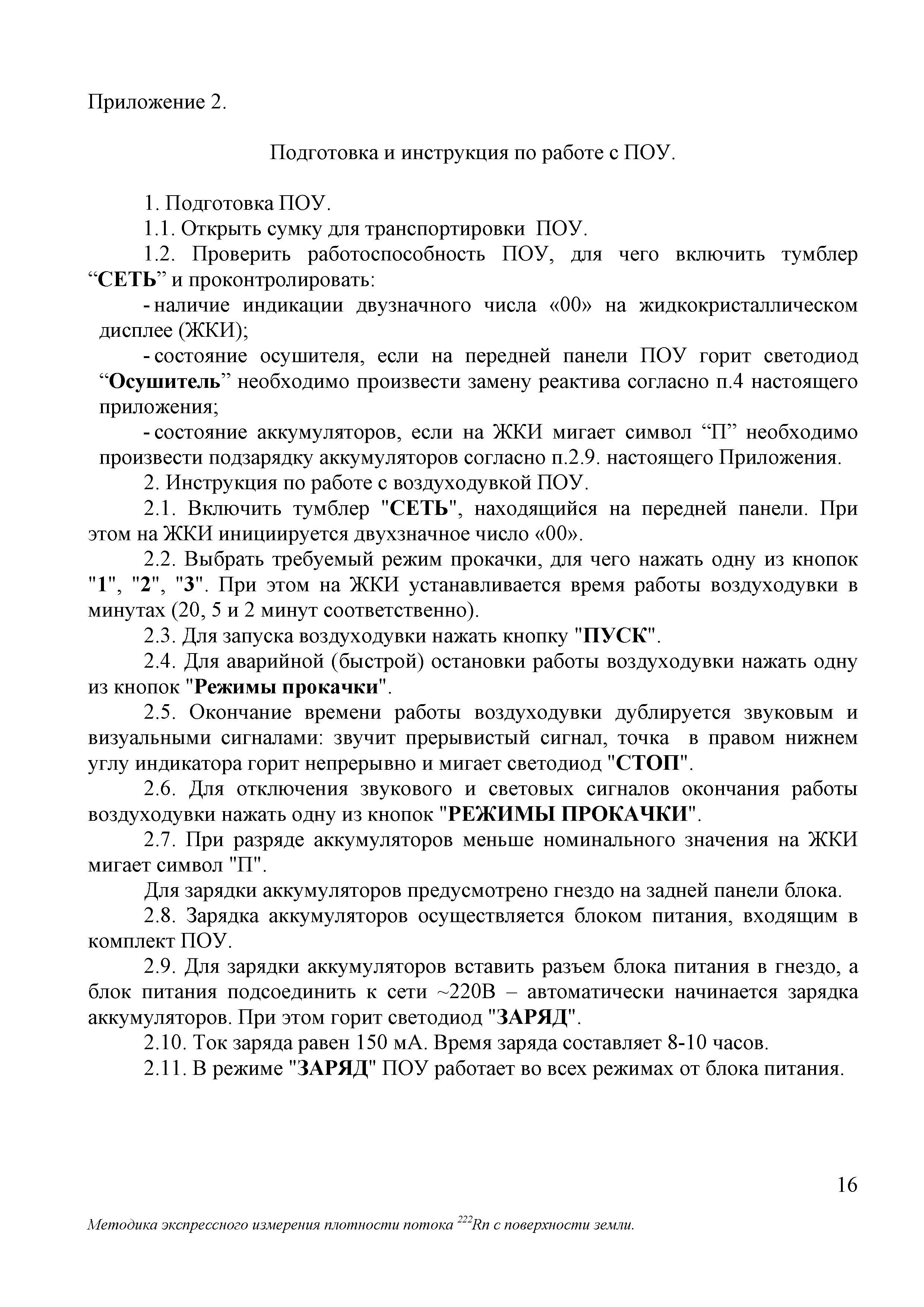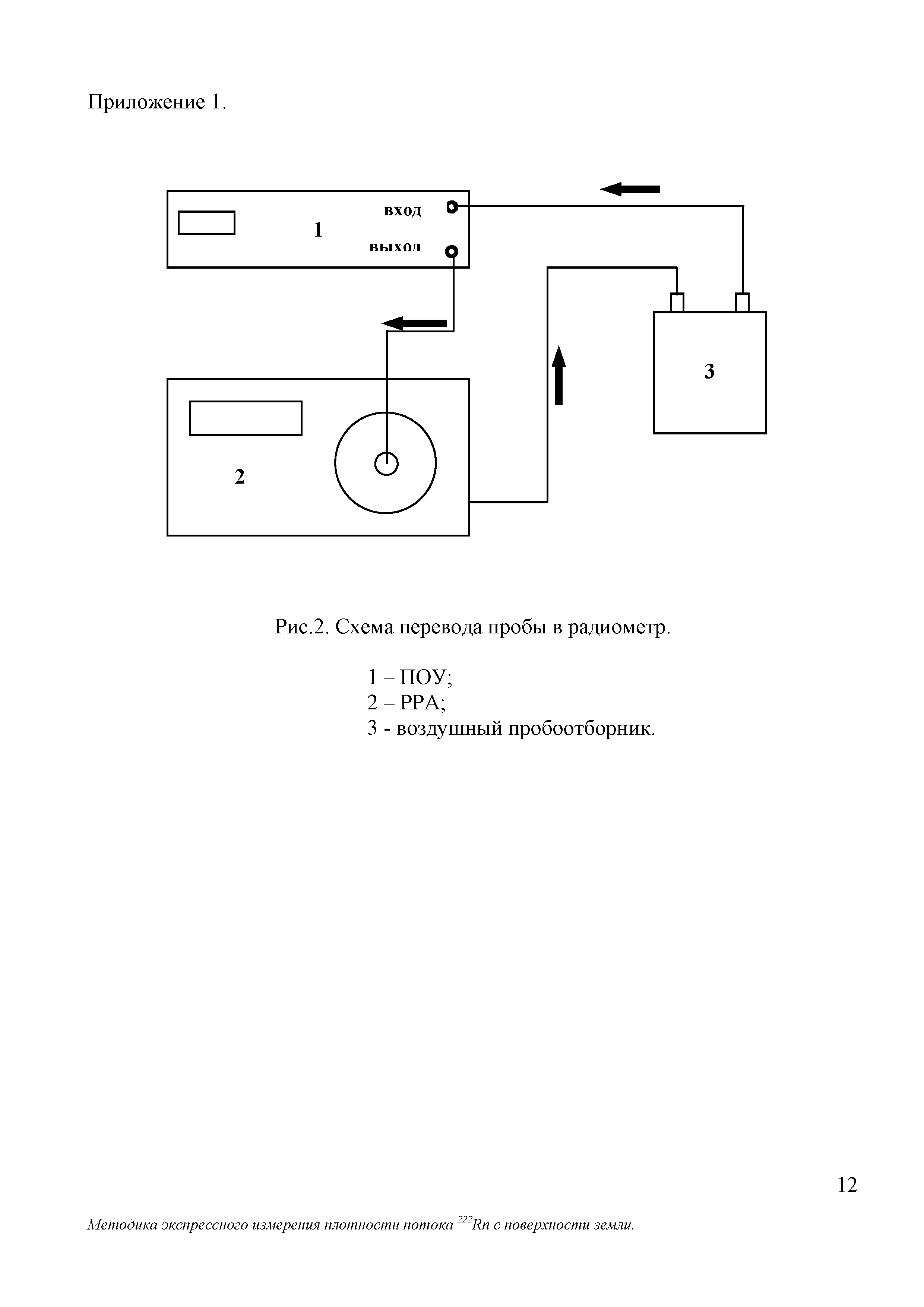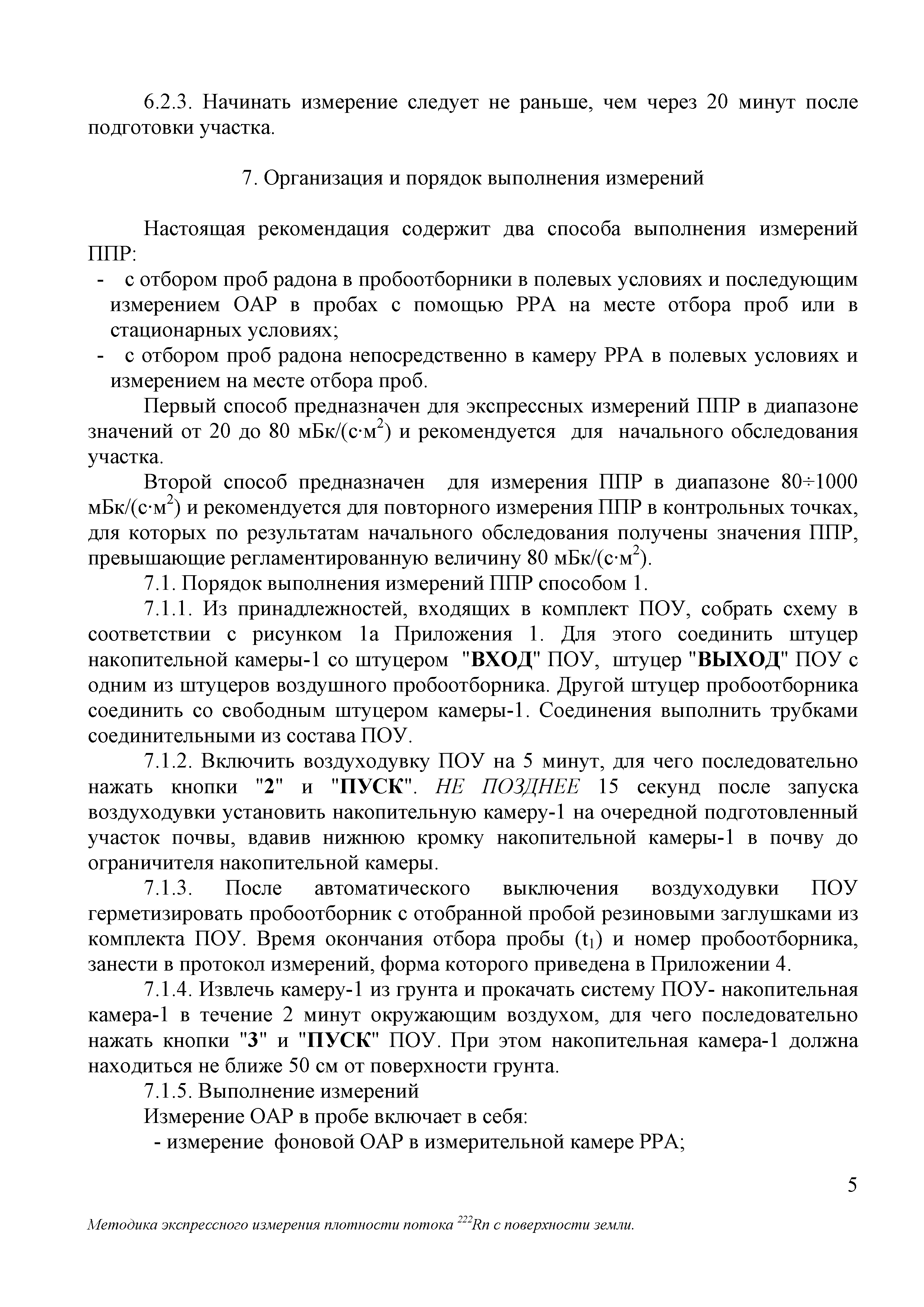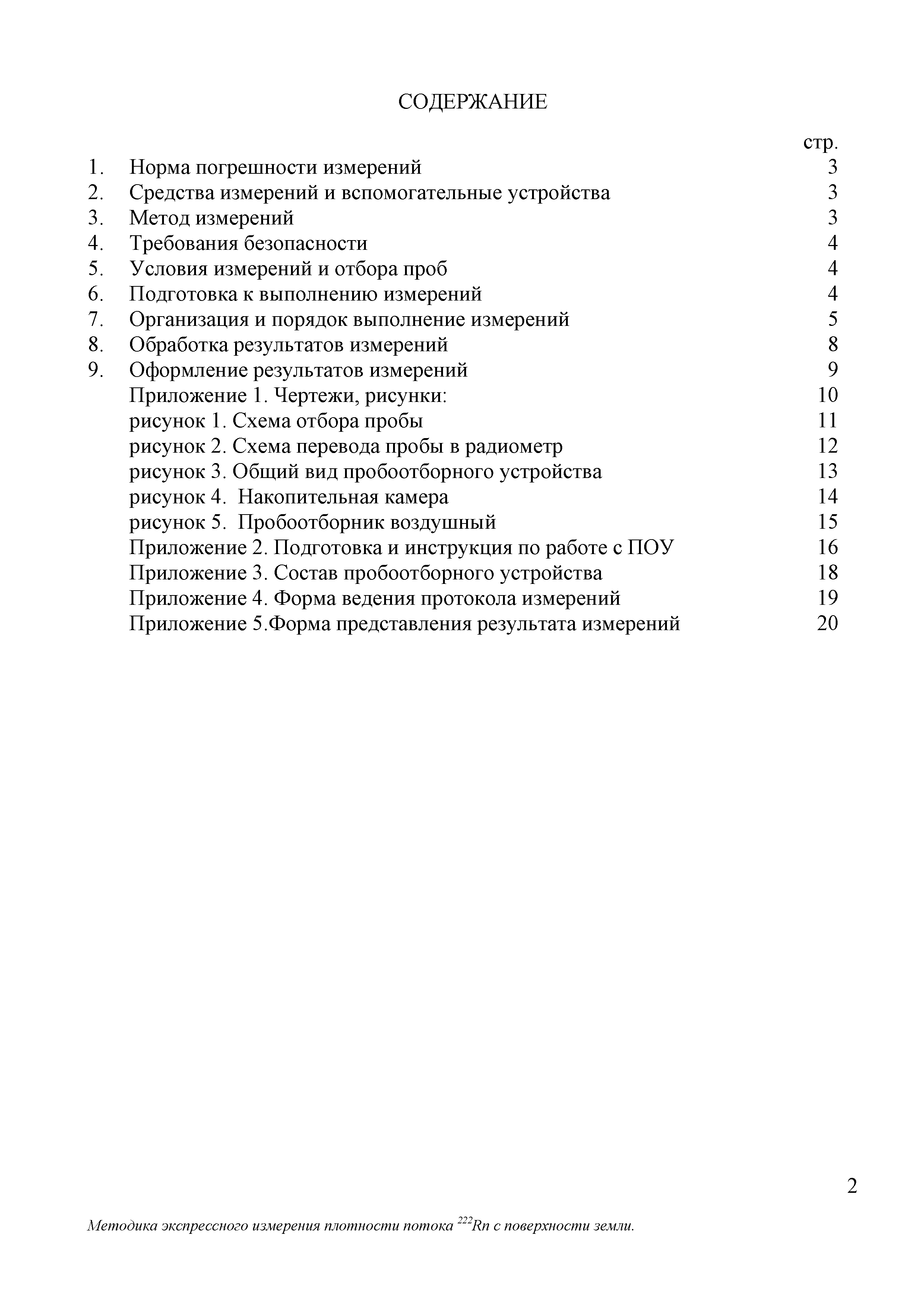 | Оглавление: | 1 Норма погрешности измерений 2 Средства измерений и вспомогательные устройства 3 Метод измерений 4 Требования безопасности 5 Условия измерений и отбора проб 6 Подготовка к выполнению измерений 7 Организация и порядок выполнение измерений 8 Обработка результатов измерений 9 Оформление результатов измерений Приложение 1. Чертежи, рисунки: рисунок 1. Схема отбора пробы рисунок 2. Схема перевода пробы в радиометр рисунок 3. Общий вид пробоотборного устройства рисунок 4. Накопительная камера рисунок 5. Пробоотборник воздушный Приложение 2. Подготовка и инструкция по работе с ПОУ Приложение 3. Состав пробоотборного устройства Приложение 4. Форма ведения протокола измерений Приложение 5. Форма представления результата измерений |