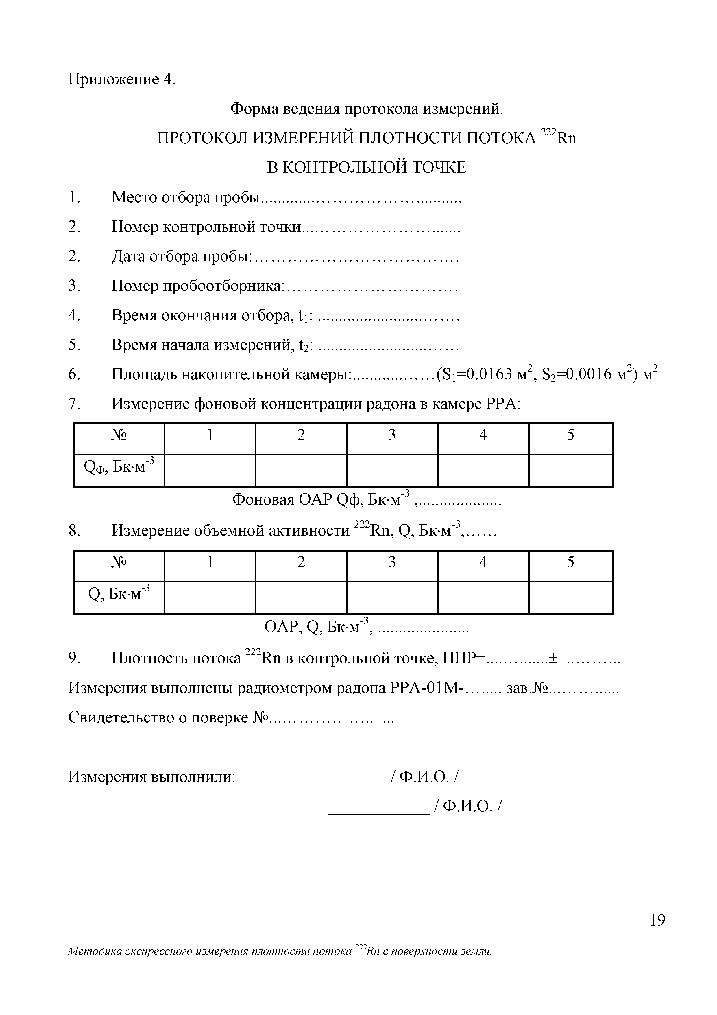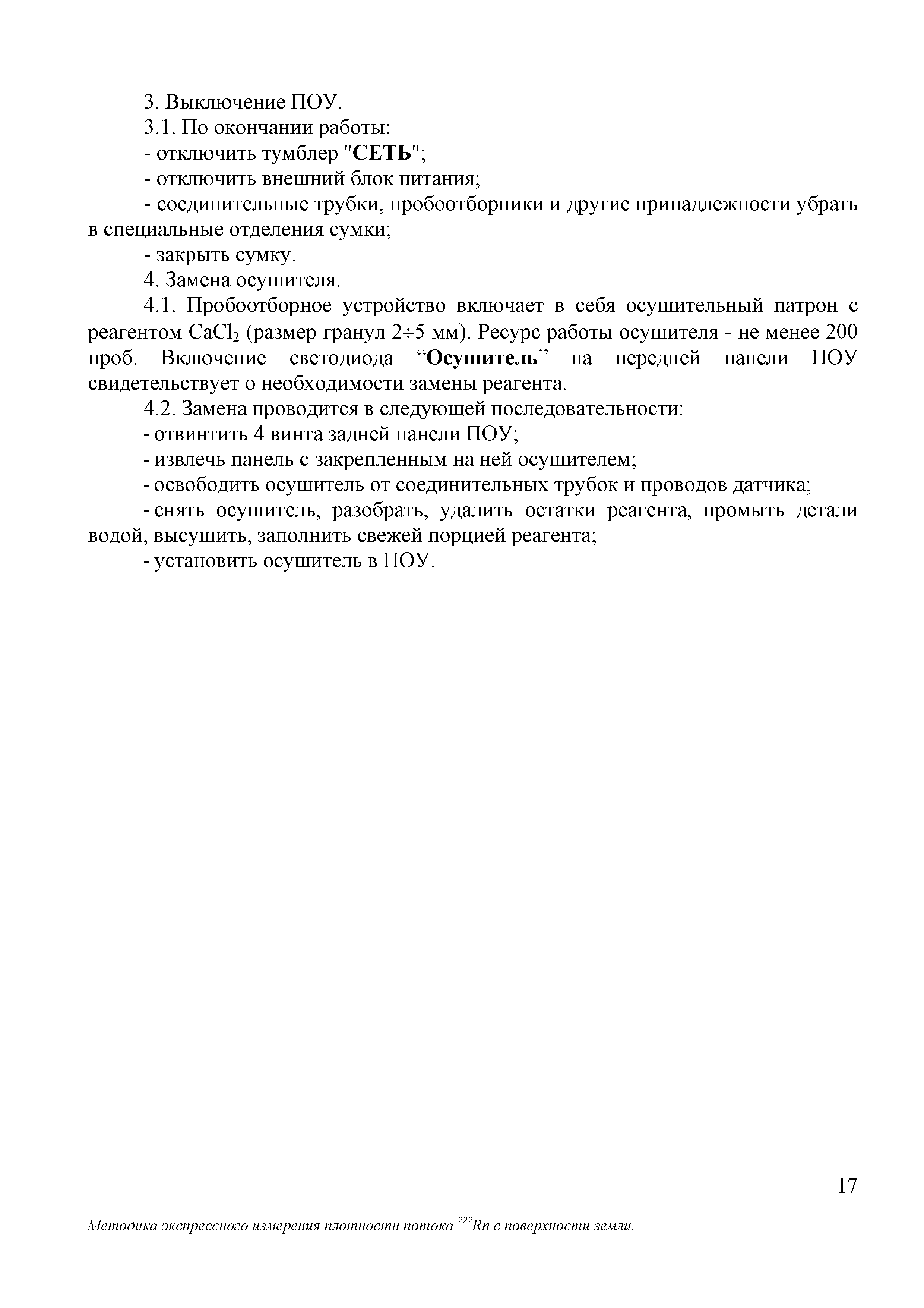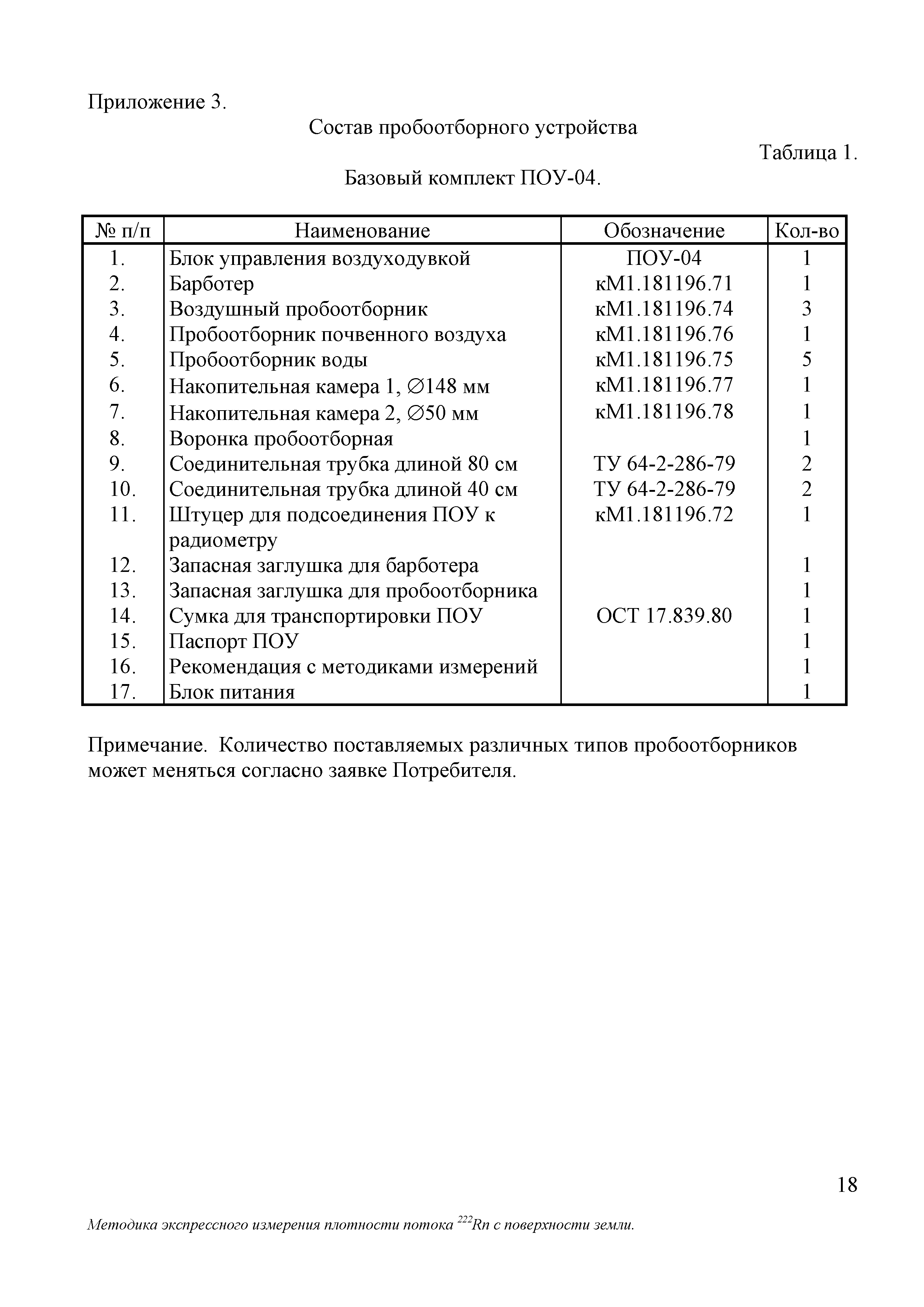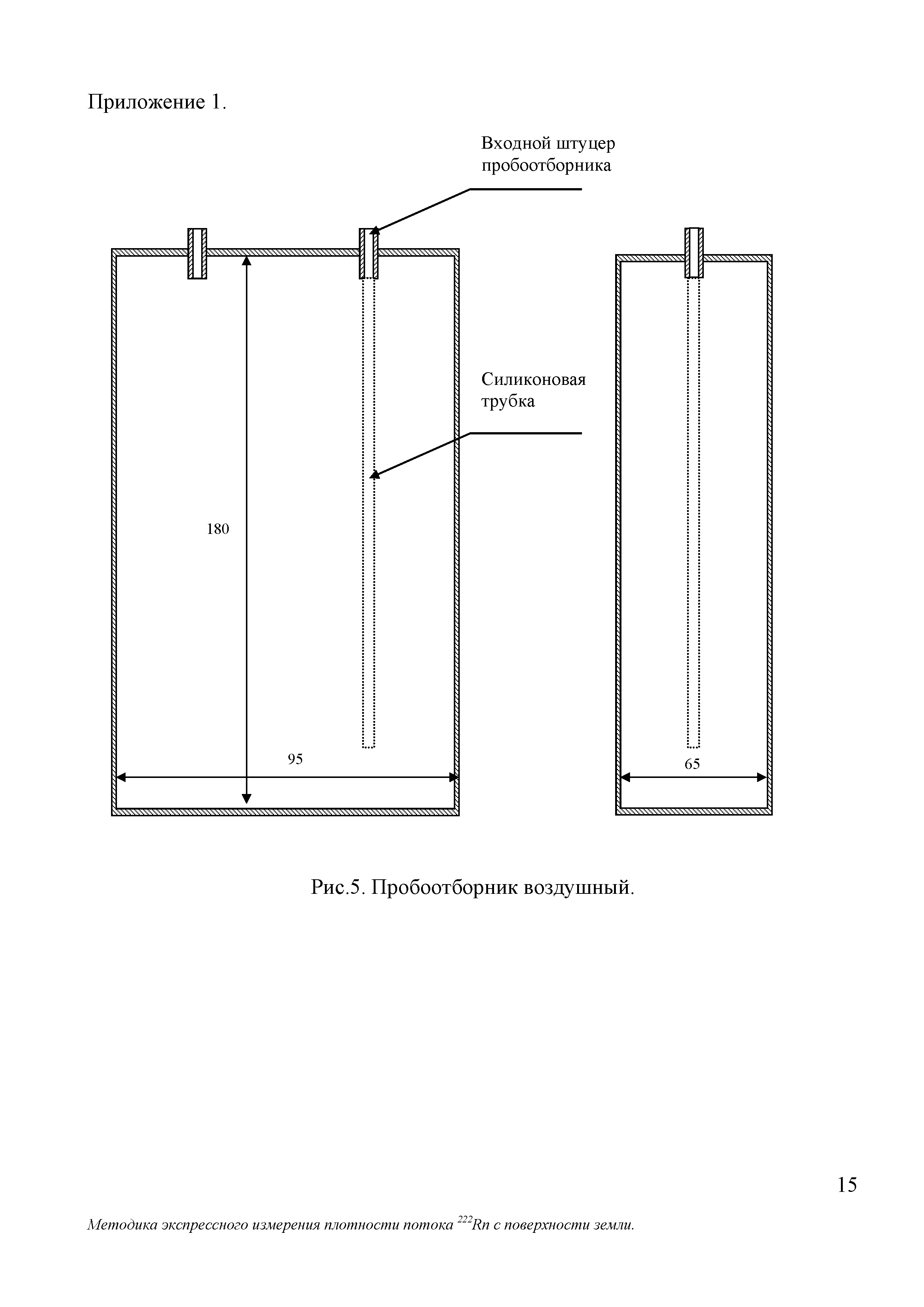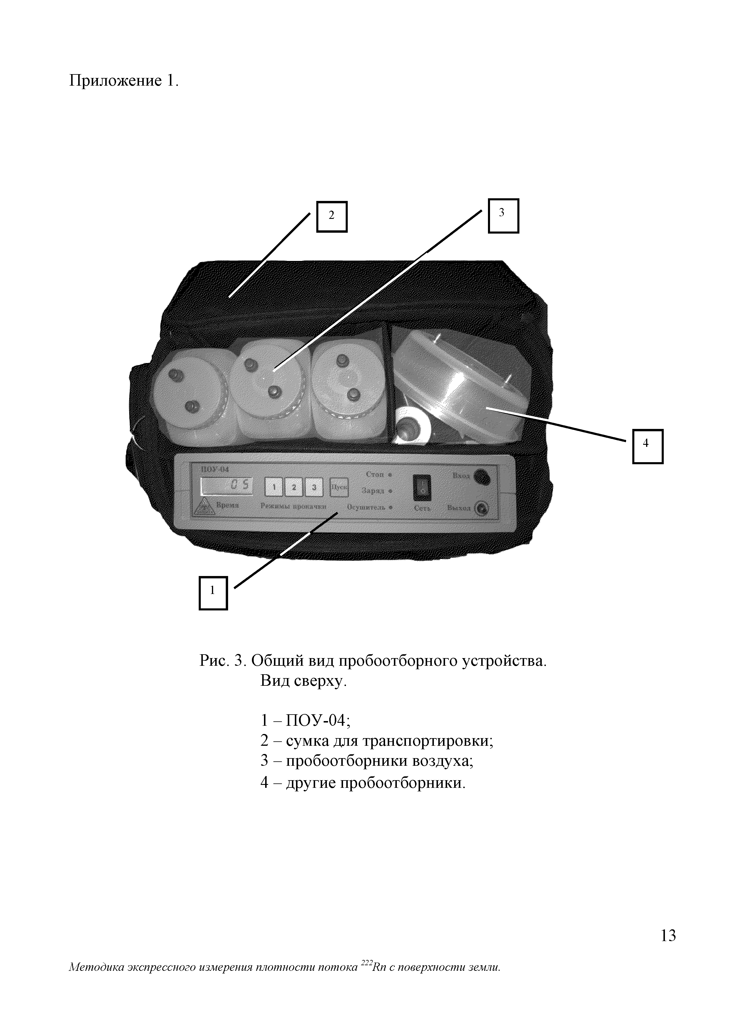 | Оглавление: | 1 Норма погрешности измерений 2 Средства измерений и вспомогательные устройства 3 Метод измерений 4 Требования безопасности 5 Условия измерений и отбора проб 6 Подготовка к выполнению измерений 7 Организация и порядок выполнение измерений 8 Обработка результатов измерений 9 Оформление результатов измерений Приложение 1. Чертежи, рисунки: рисунок 1. Схема отбора пробы рисунок 2. Схема перевода пробы в радиометр рисунок 3. Общий вид пробоотборного устройства рисунок 4. Накопительная камера рисунок 5. Пробоотборник воздушный Приложение 2. Подготовка и инструкция по работе с ПОУ Приложение 3. Состав пробоотборного устройства Приложение 4. Форма ведения протокола измерений Приложение 5. Форма представления результата измерений |