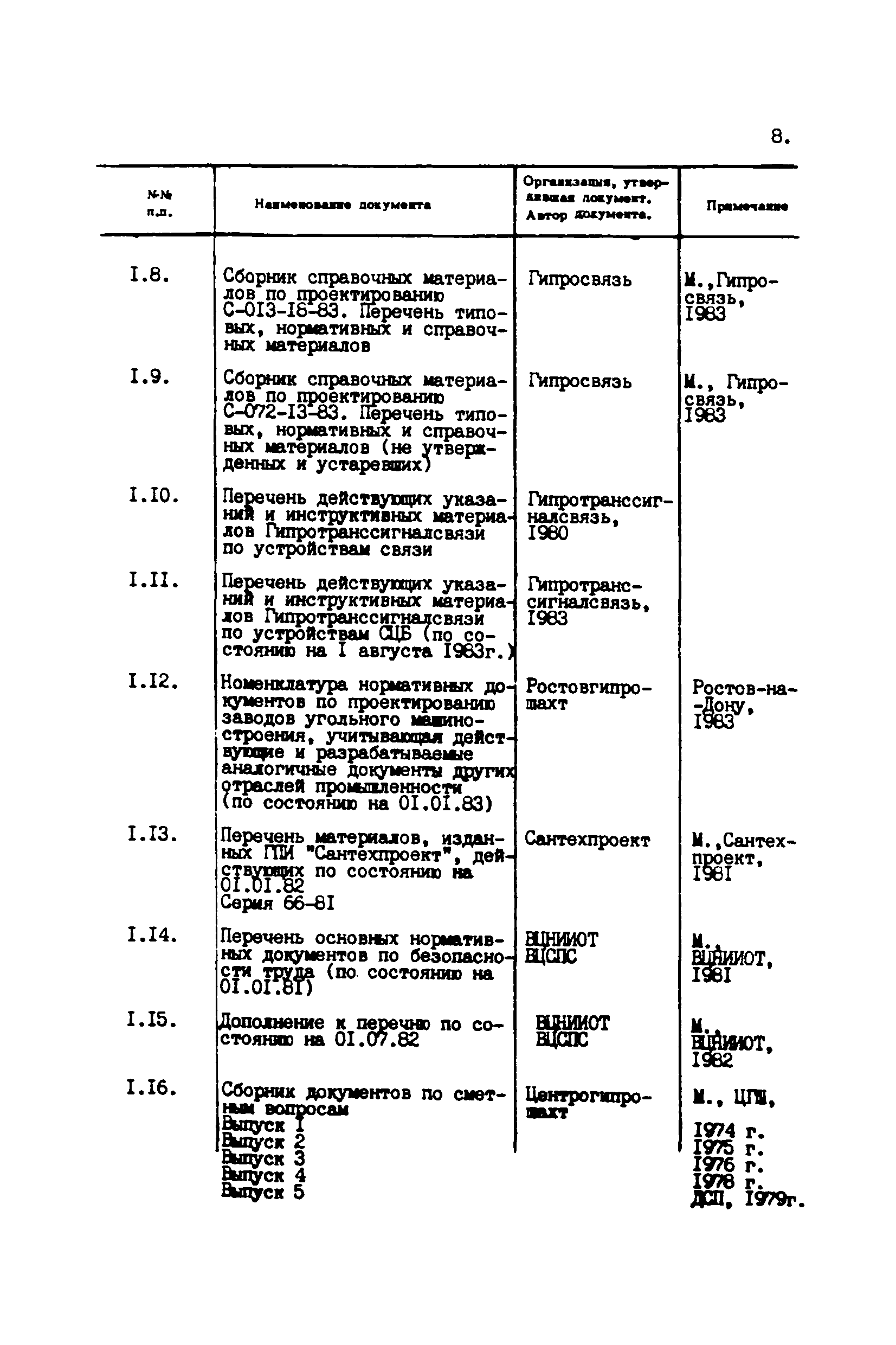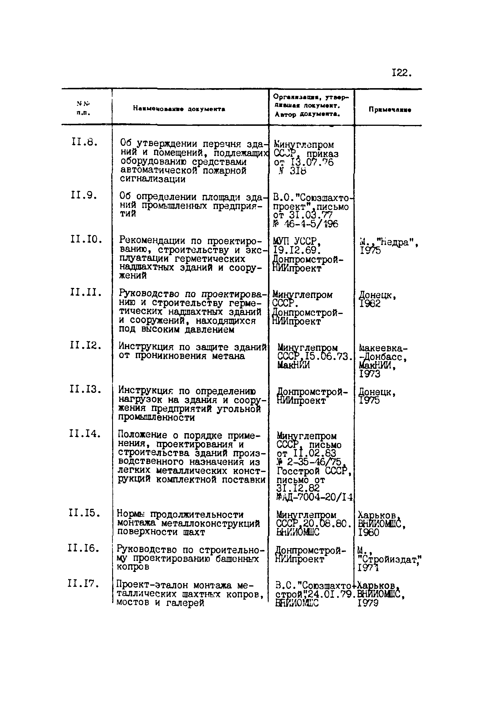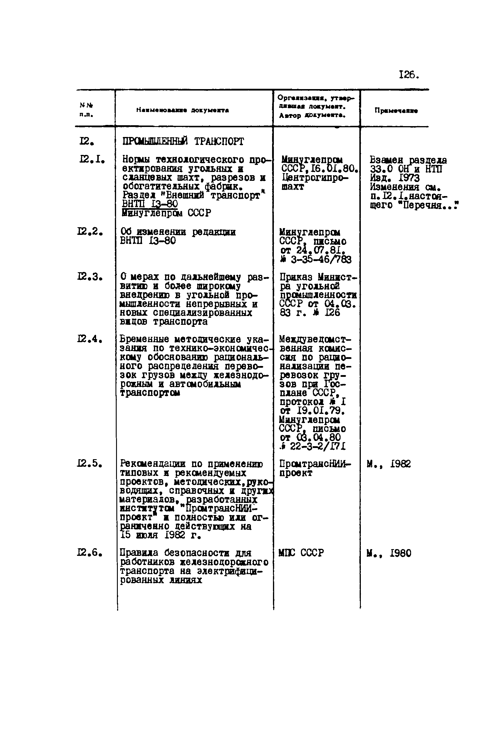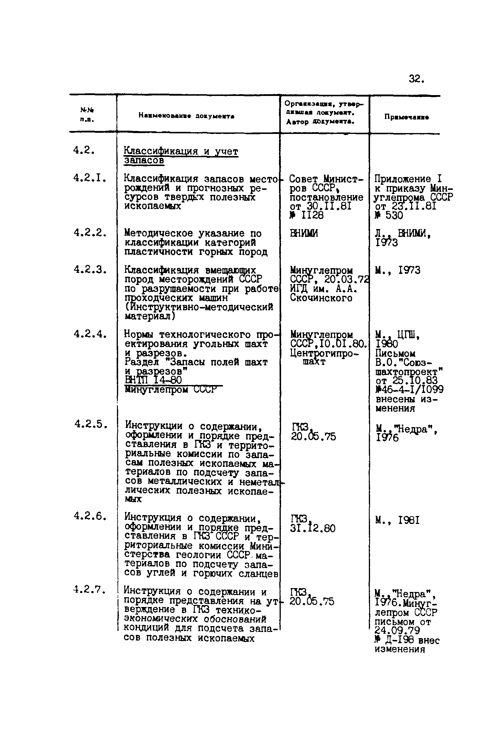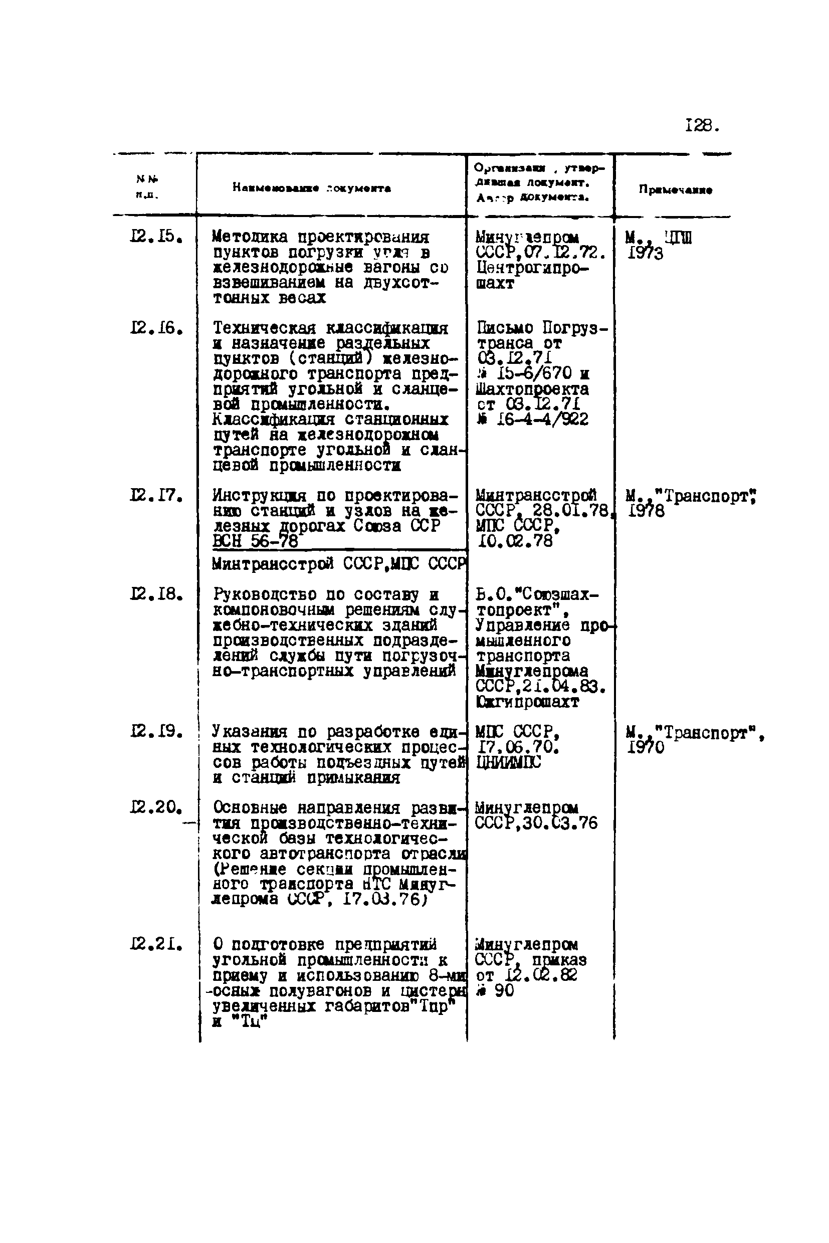 Перечень отраслевых нормативных документов и руководящих материалов по вопросам проектирования предприятий угольной промышленности| Статус: | справочные материалы, мп, тпр | | Название рус.: | Перечень отраслевых нормативных документов и руководящих материалов по вопросам проектирования предприятий угольной промышленности | | Дата добавления в базу: | 01.01.2021 | | Дата актуализации: | 01.01.2021 | | Область применения: | Перечень является периодическим изданием Центрогипрошахта и включает в себя отраслевые нормативные, директивные и руководящие материалы, используемые при проектировании предприятий угольной промышленности. Основными документами, входящими в Перечень, являются нормы технологического проектирования, инструкции, руководства, методики и другие работы, содержащие рекомендации по проектированию | | Оглавление: | 1. Перечни нормативных документов 2. Общие вопросы проектирования предприятий угольной промышленности 3. Отвод земель. Охрана окружающей среды 4. Геология. Гидрогеология 5. Маркшейдерия и геодезия 6. Подземная разработка угольных и сланцевых месторождений 7. Разработка угольных (сланцевых) месторождений открытым способом 8. Обогатительные фабрики 9. Буровзрывные работы на шахтах и разрезах 10. Горношахтное оборудование. Ремонт 11. Промышленные здания и сооружения 12. Промышленный транспорт 13. Складское хозяйство. Породные отвалы 14. Электроснабжение и электрооборудование. Автоматизация производственных процессов 15. Пневматическое хозяйство 16. Сантехника 17. Трубопроводы 18. Промсанитария. Гигиена труда 19. Экономика угольной промышленности 20. Управление угольными предприятиями и производственными процессами. Связь 21. НОТ в проектах 22. Инженерно-технические мероприятия гражданской обороны 23. Рационализация и изобретения 24. Информационное обслуживание | | Разработан: | Центрогипрошахт