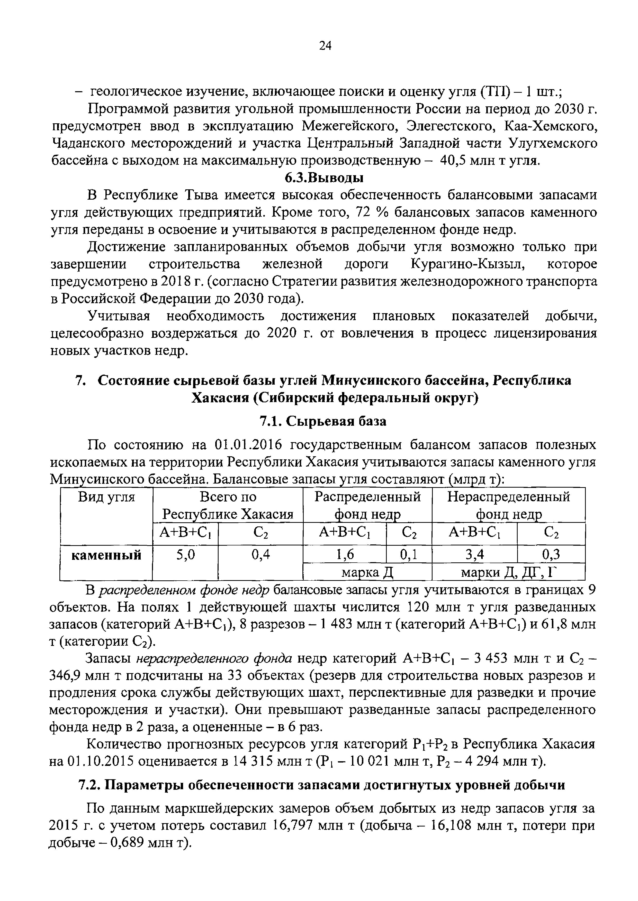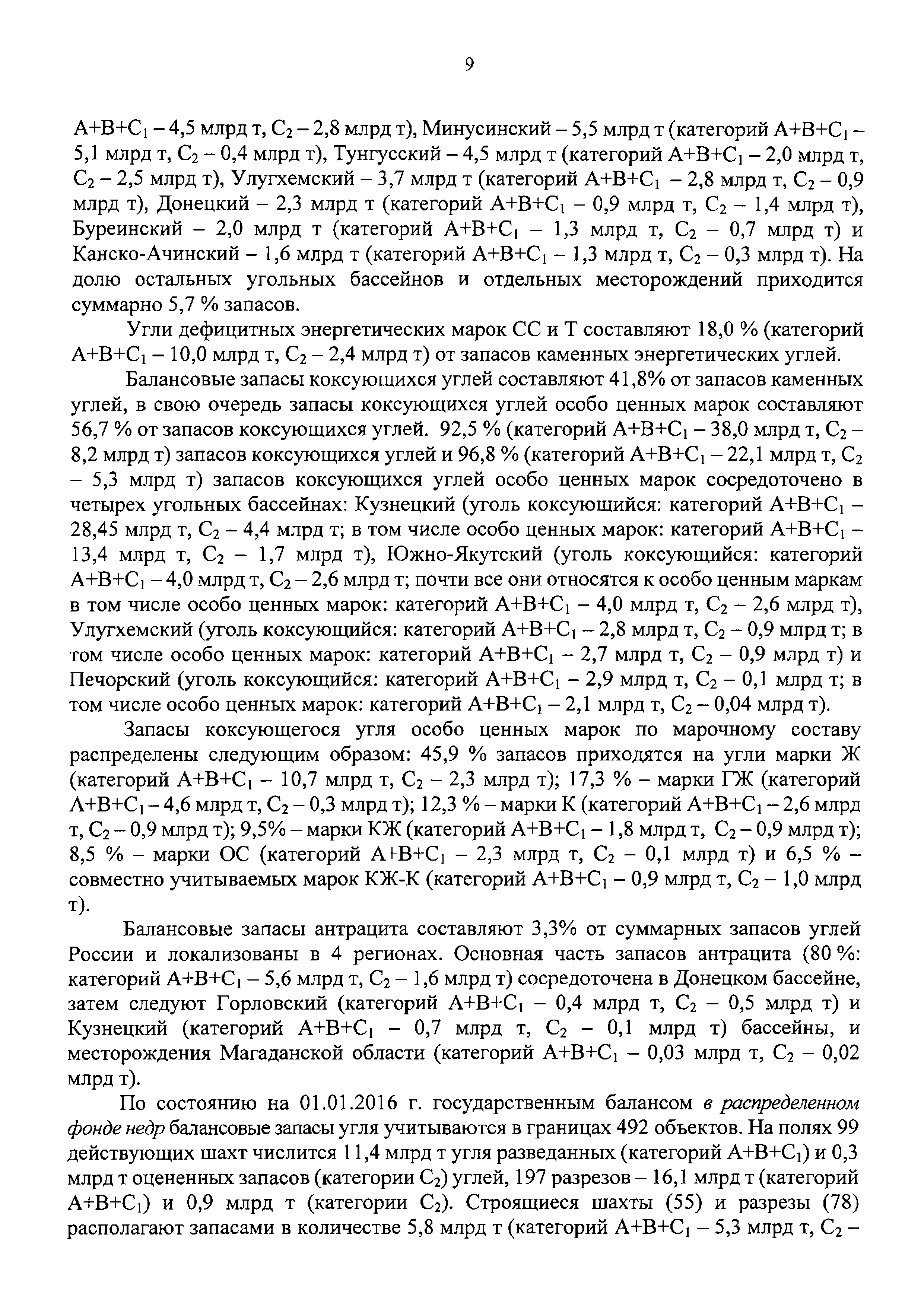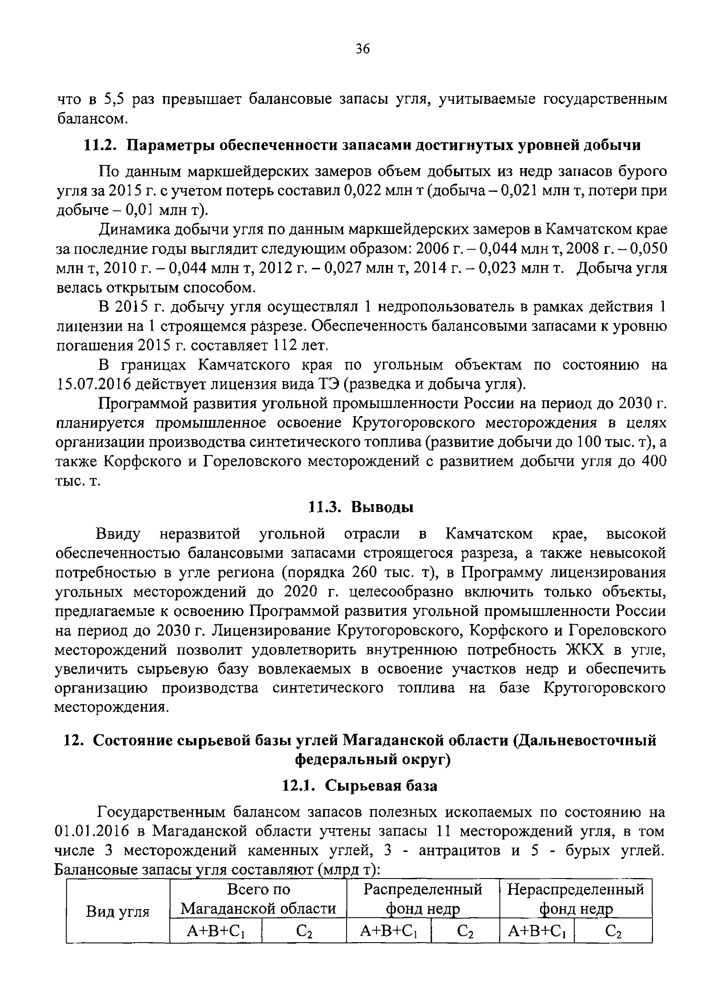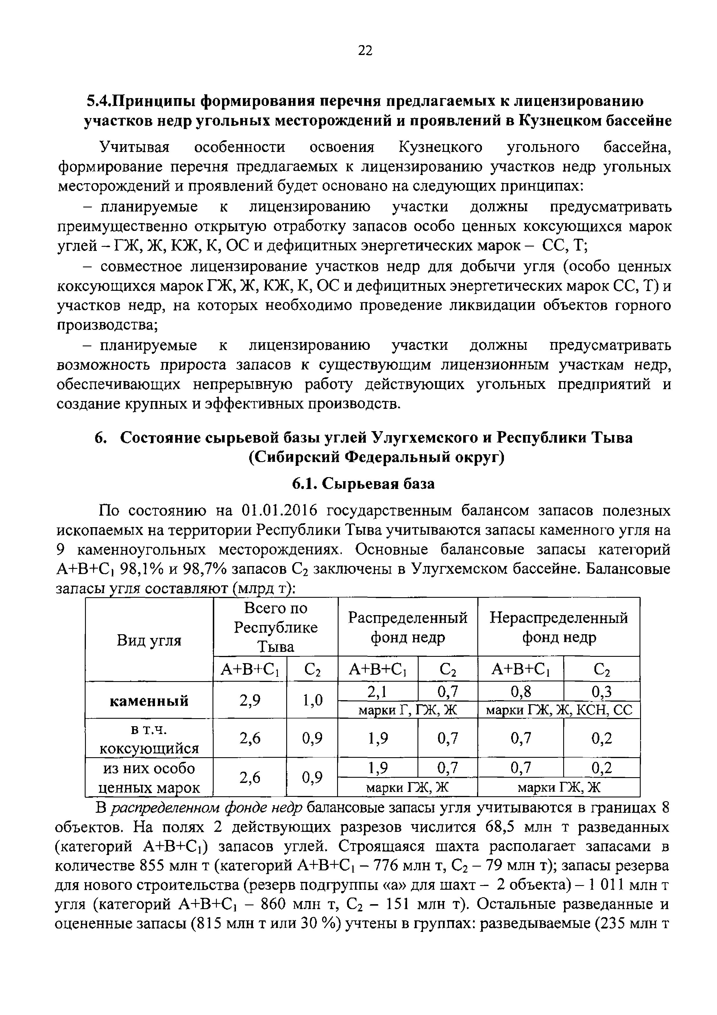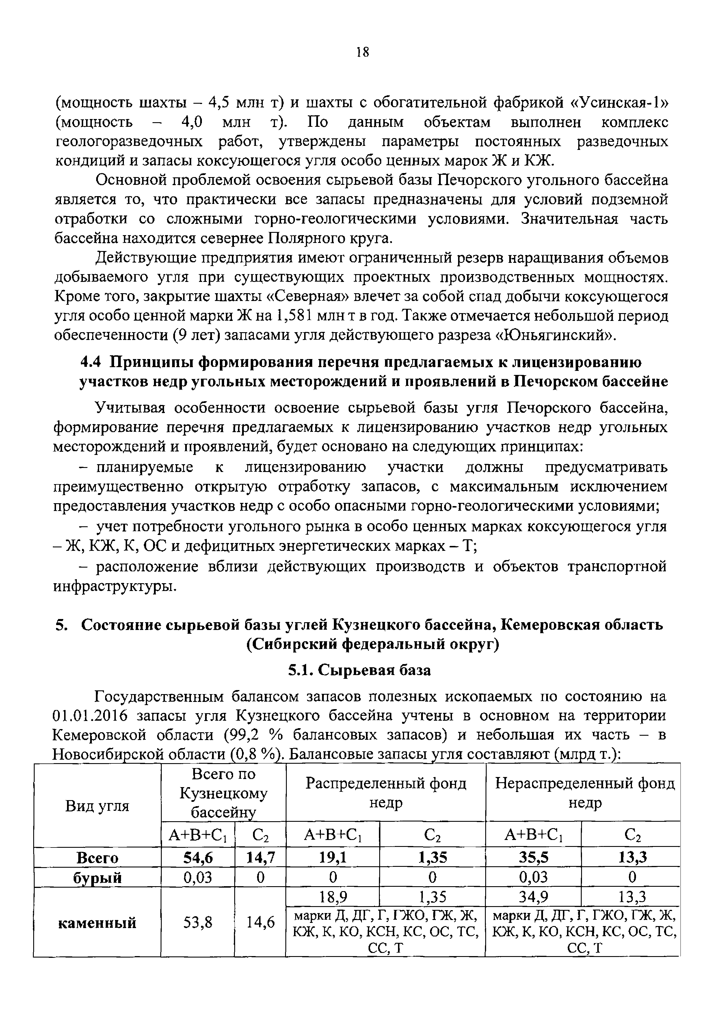 | Оглавление: | Введение 1. Основные направления реализации программы развития угольной промышленности России на период до 2030 г. 2. Состояние сырьевой базы углей Российской Федерации 3. Состояние сырьевой базы углей Восточного Донбасса, Ростовская область (Южный федеральный округ) 4. Состояние сырьевой базы углей Печорского бассейна, Республика Коми и Ненецкий автономный округ (Северо-Западный федеральный округ) 5. Состояние сырьевой базы углей Кузнецкого бассейна, Кемеровская область (Сибирский федеральный округ) 6. Состояние сырьевой базы углей Улугхемского и Республики Тыва (Сибирский Федеральный округ) 7. Состояние сырьевой базы углей Минусинского бассейна, Республика Хакасия (Сибирский федеральный округ) 8. Состояние сырьевой базы углей Забайкальского края (Сибирский федеральный округ) 9. Состояние сырьевой базы углей Республики Саха (Якутия) (Дальневосточный федеральный округ) 10. Состояние сырьевой базы углей Чукотского автономного округа (Дальневосточный федеральный округ) 11. Состояние сырьевой базы углей Камчатского края (Дальневосточный федеральный округ) 12. Состояние сырьевой базы углей Магаданской области (Дальневосточный федеральный округ) 13. Состояние сырьевой базы углей Хабаровского края (Дальневосточный федеральный округ) 14. Состояние сырьевой базы углей Амурской области (Дальневосточный федеральный округ) 15. Состояние сырьевой базы углей Приморского края (Дальневосточный федеральный округ) 16. Состояние сырьевой базы углей Сахалинской области (Дальневосточный федеральный округ) 17. Ожидаемые результаты выполнения программы Приложение 1. Оценка баланса производства и потребления коксующихся углей Приложение 2. Перечень участков нераспределенного фонда недр, содержащих угли особо ценных коксующихся марок К, КЖ, ОС, КЖ, и дефицитных энергетических марок СС, Т для условий открытой отработки по состоянию на 10.11.2016 г. (млн т) |