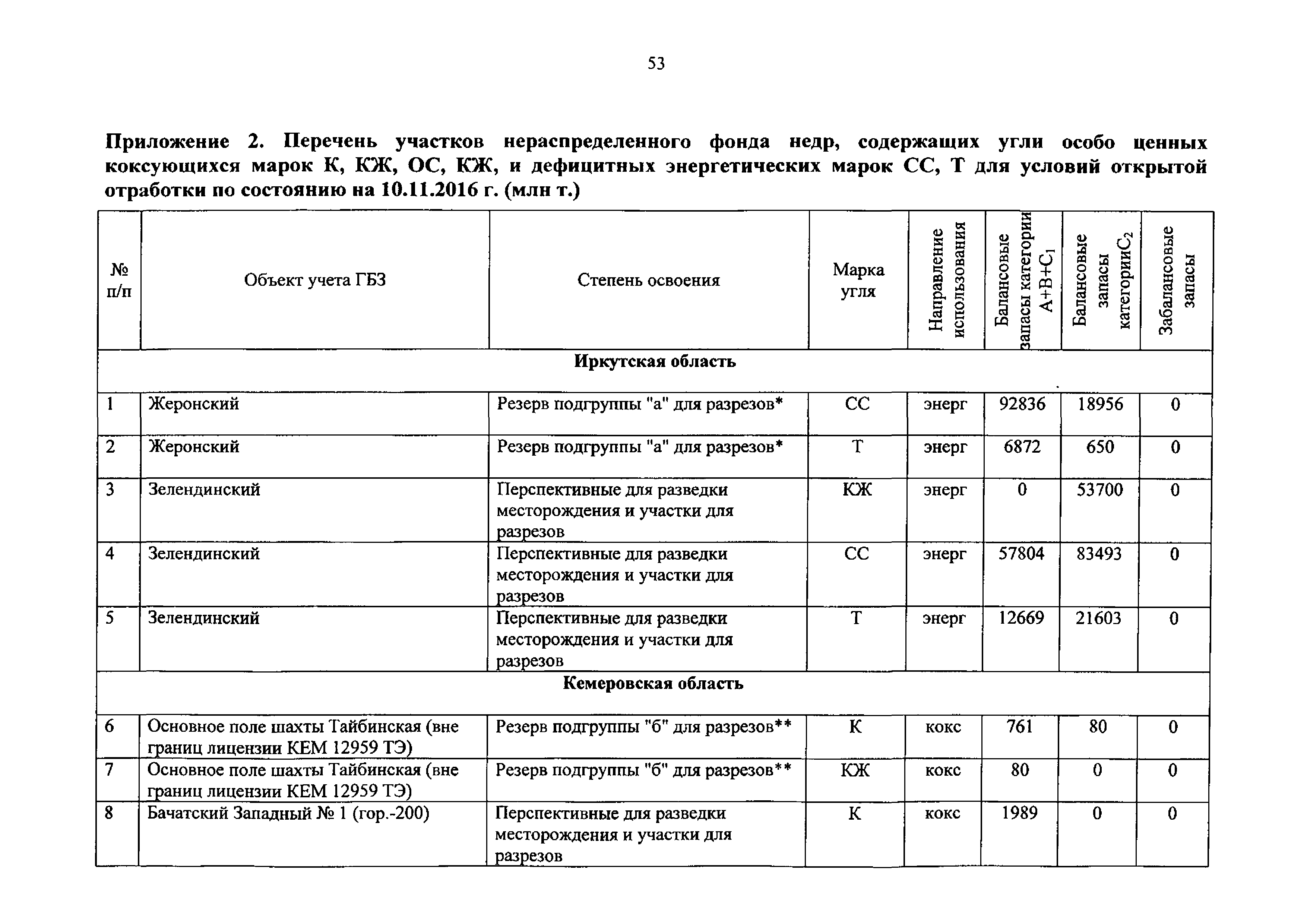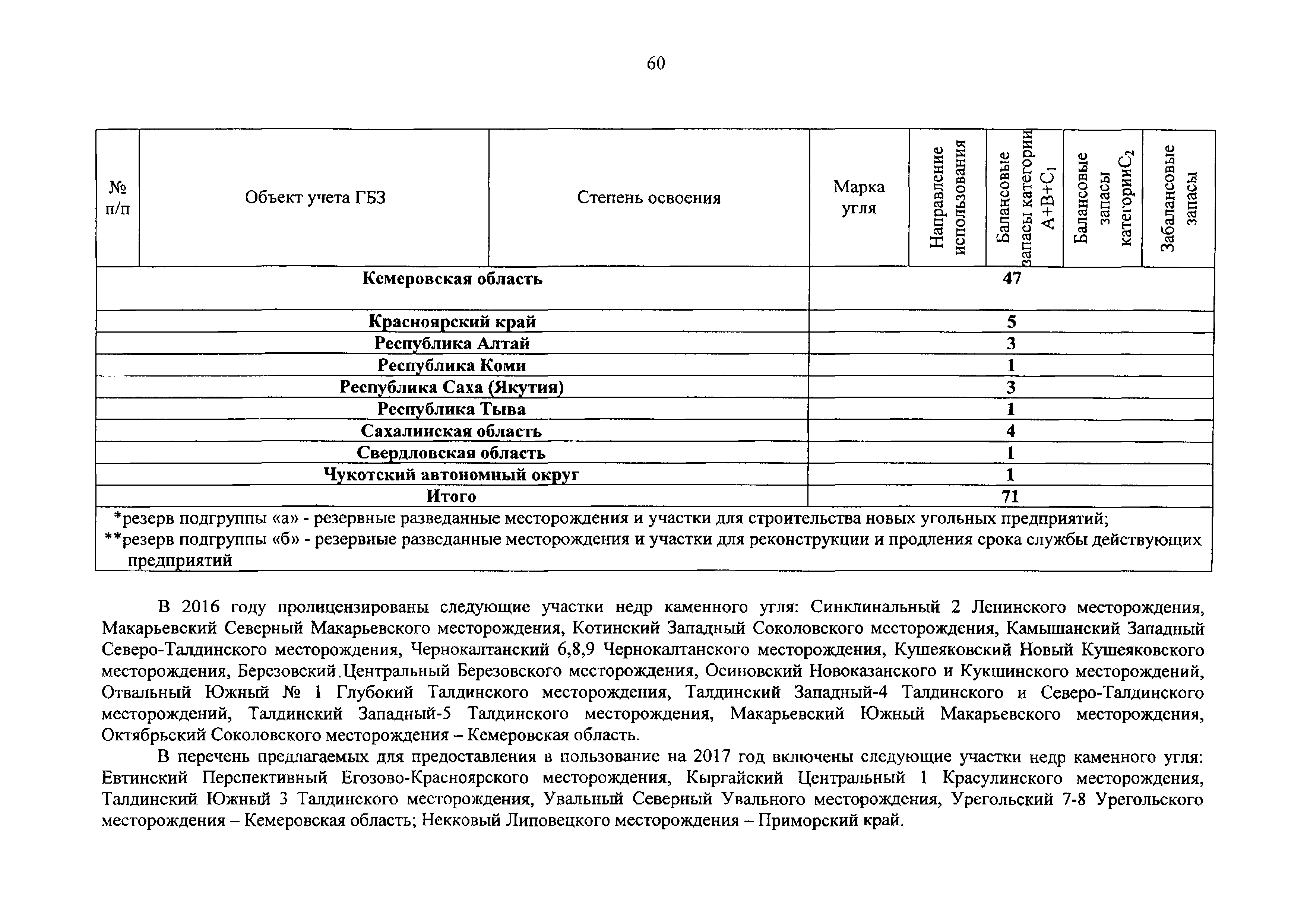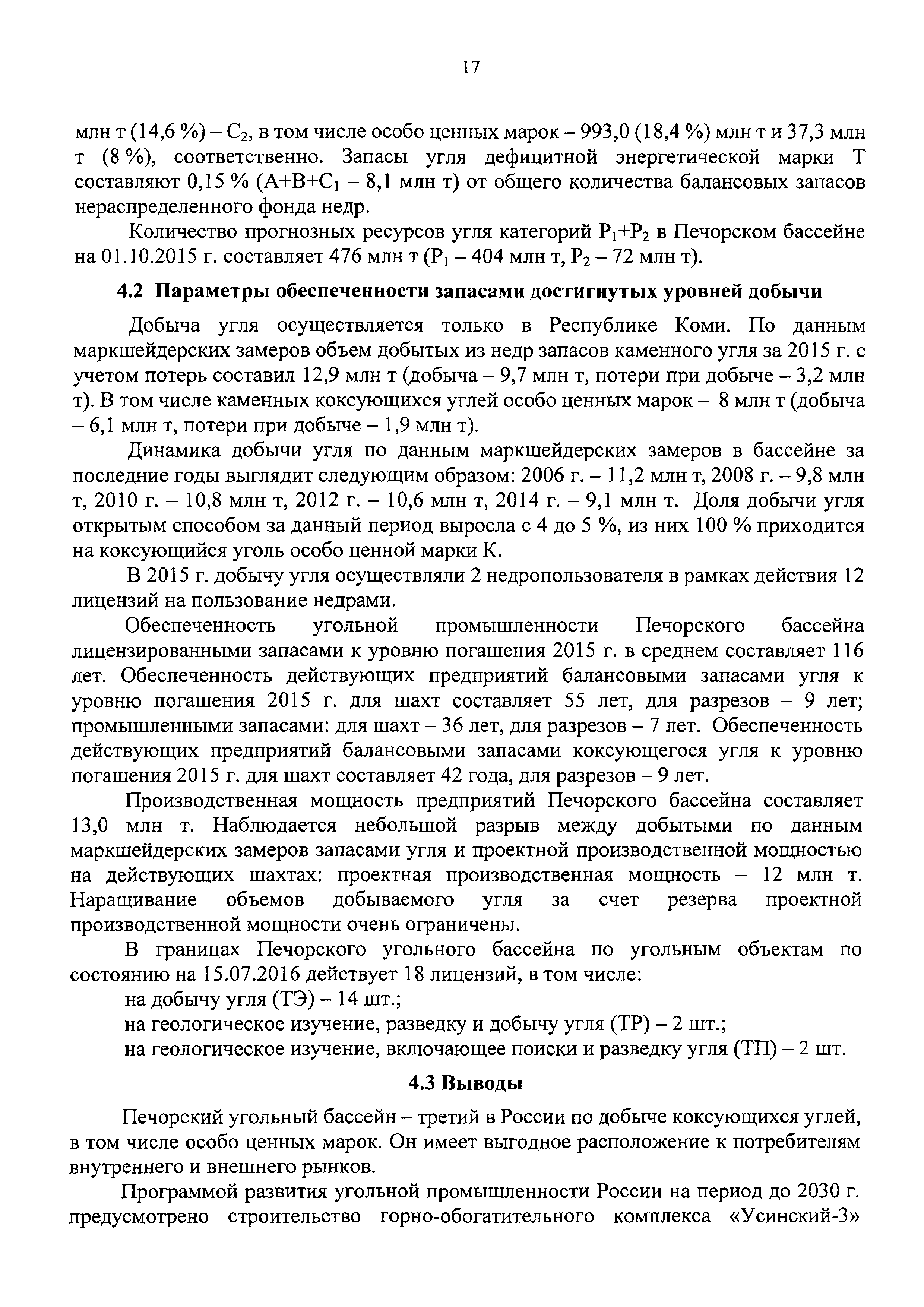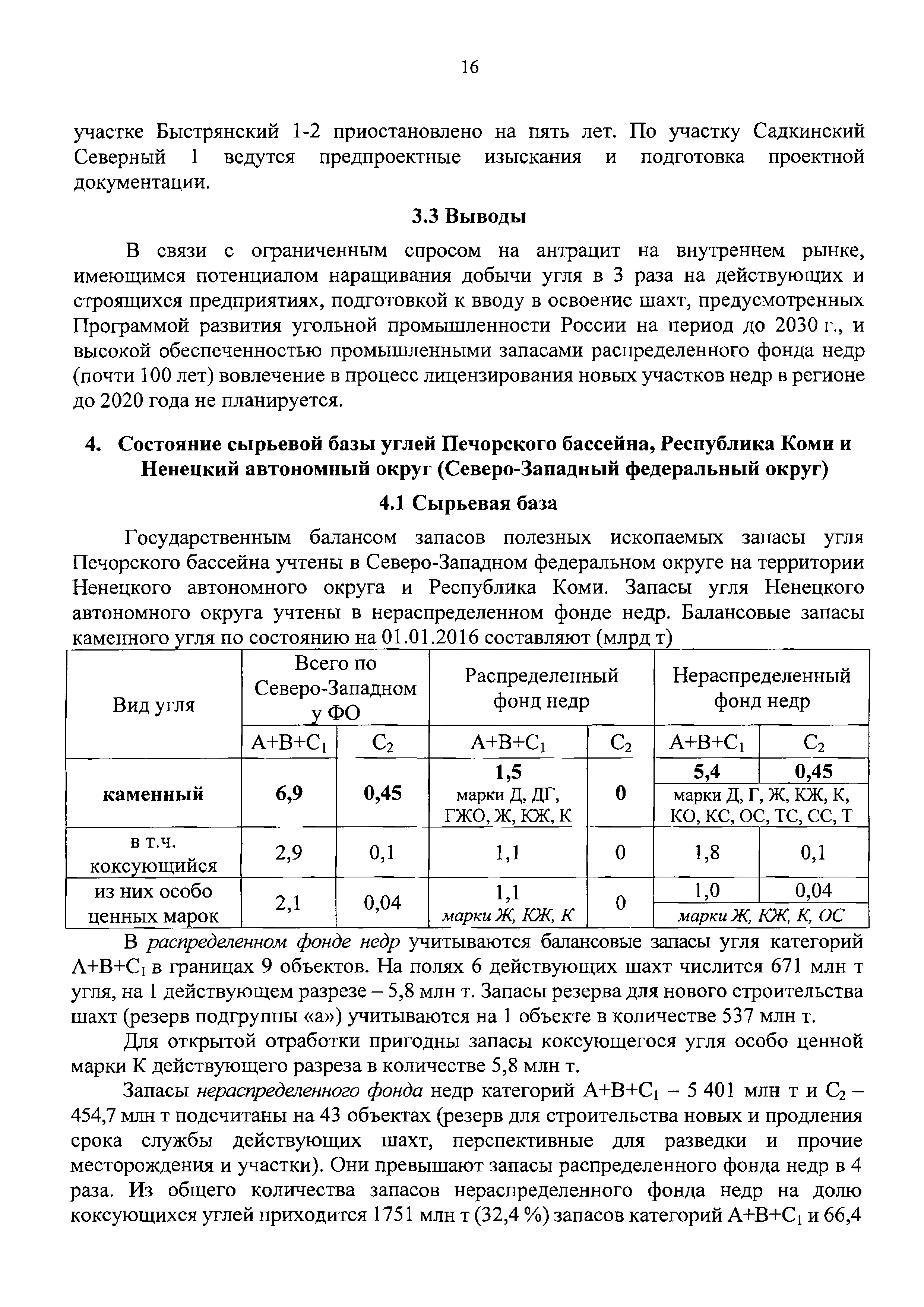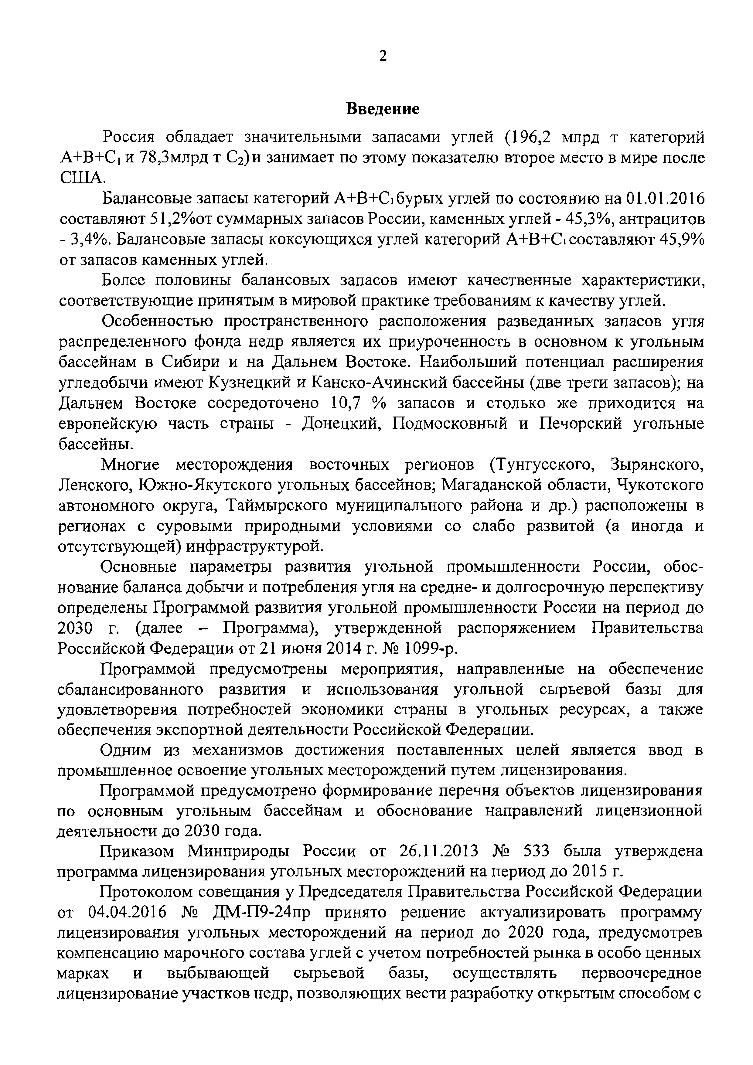 | Оглавление: | Введение 1. Основные направления реализации программы развития угольной промышленности России на период до 2030 г. 2. Состояние сырьевой базы углей Российской Федерации 3. Состояние сырьевой базы углей Восточного Донбасса, Ростовская область (Южный федеральный округ) 4. Состояние сырьевой базы углей Печорского бассейна, Республика Коми и Ненецкий автономный округ (Северо-Западный федеральный округ) 5. Состояние сырьевой базы углей Кузнецкого бассейна, Кемеровская область (Сибирский федеральный округ) 6. Состояние сырьевой базы углей Улугхемского и Республики Тыва (Сибирский Федеральный округ) 7. Состояние сырьевой базы углей Минусинского бассейна, Республика Хакасия (Сибирский федеральный округ) 8. Состояние сырьевой базы углей Забайкальского края (Сибирский федеральный округ) 9. Состояние сырьевой базы углей Республики Саха (Якутия) (Дальневосточный федеральный округ) 10. Состояние сырьевой базы углей Чукотского автономного округа (Дальневосточный федеральный округ) 11. Состояние сырьевой базы углей Камчатского края (Дальневосточный федеральный округ) 12. Состояние сырьевой базы углей Магаданской области (Дальневосточный федеральный округ) 13. Состояние сырьевой базы углей Хабаровского края (Дальневосточный федеральный округ) 14. Состояние сырьевой базы углей Амурской области (Дальневосточный федеральный округ) 15. Состояние сырьевой базы углей Приморского края (Дальневосточный федеральный округ) 16. Состояние сырьевой базы углей Сахалинской области (Дальневосточный федеральный округ) 17. Ожидаемые результаты выполнения программы Приложение 1. Оценка баланса производства и потребления коксующихся углей Приложение 2. Перечень участков нераспределенного фонда недр, содержащих угли особо ценных коксующихся марок К, КЖ, ОС, КЖ, и дефицитных энергетических марок СС, Т для условий открытой отработки по состоянию на 10.11.2016 г. (млн т) |