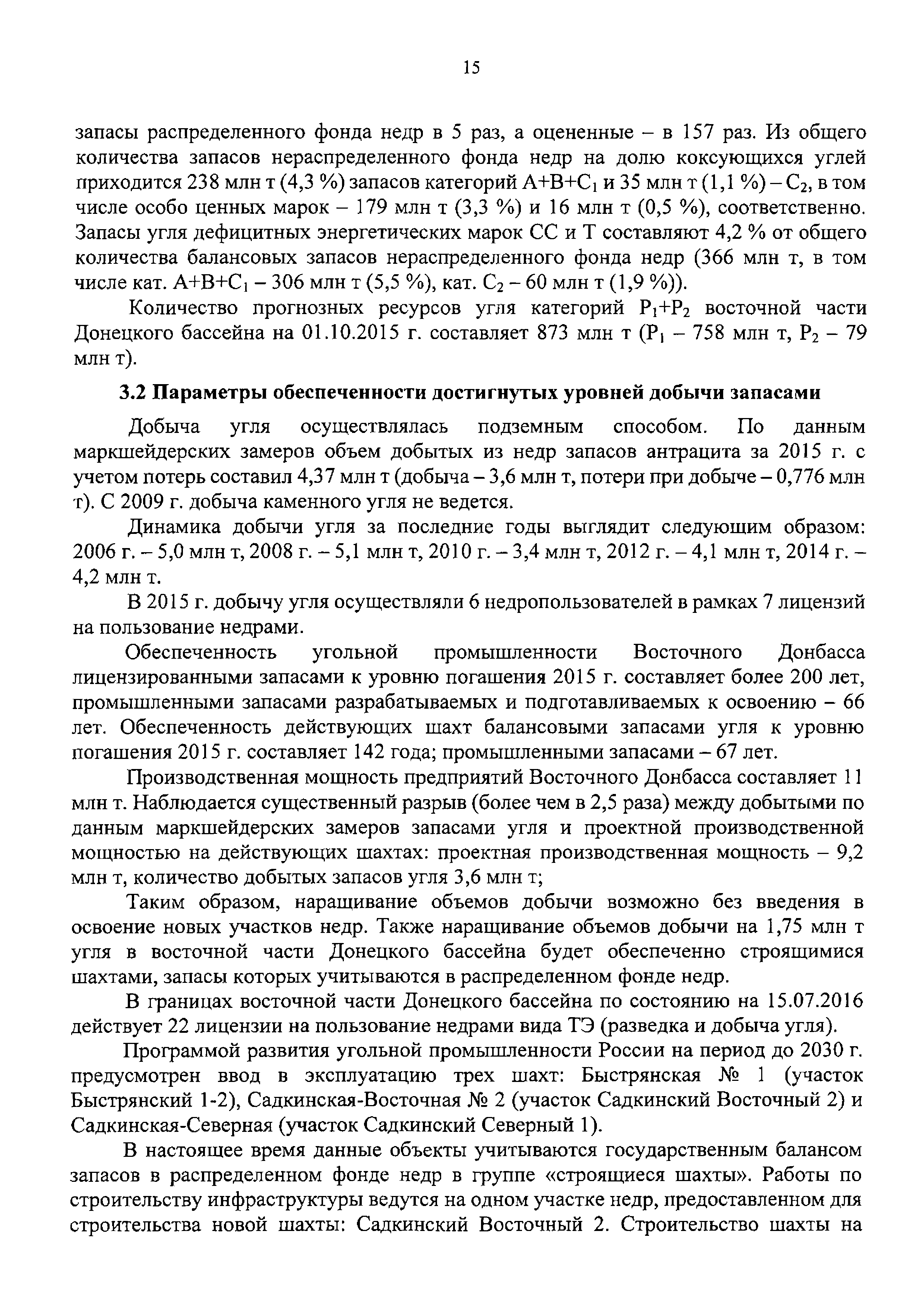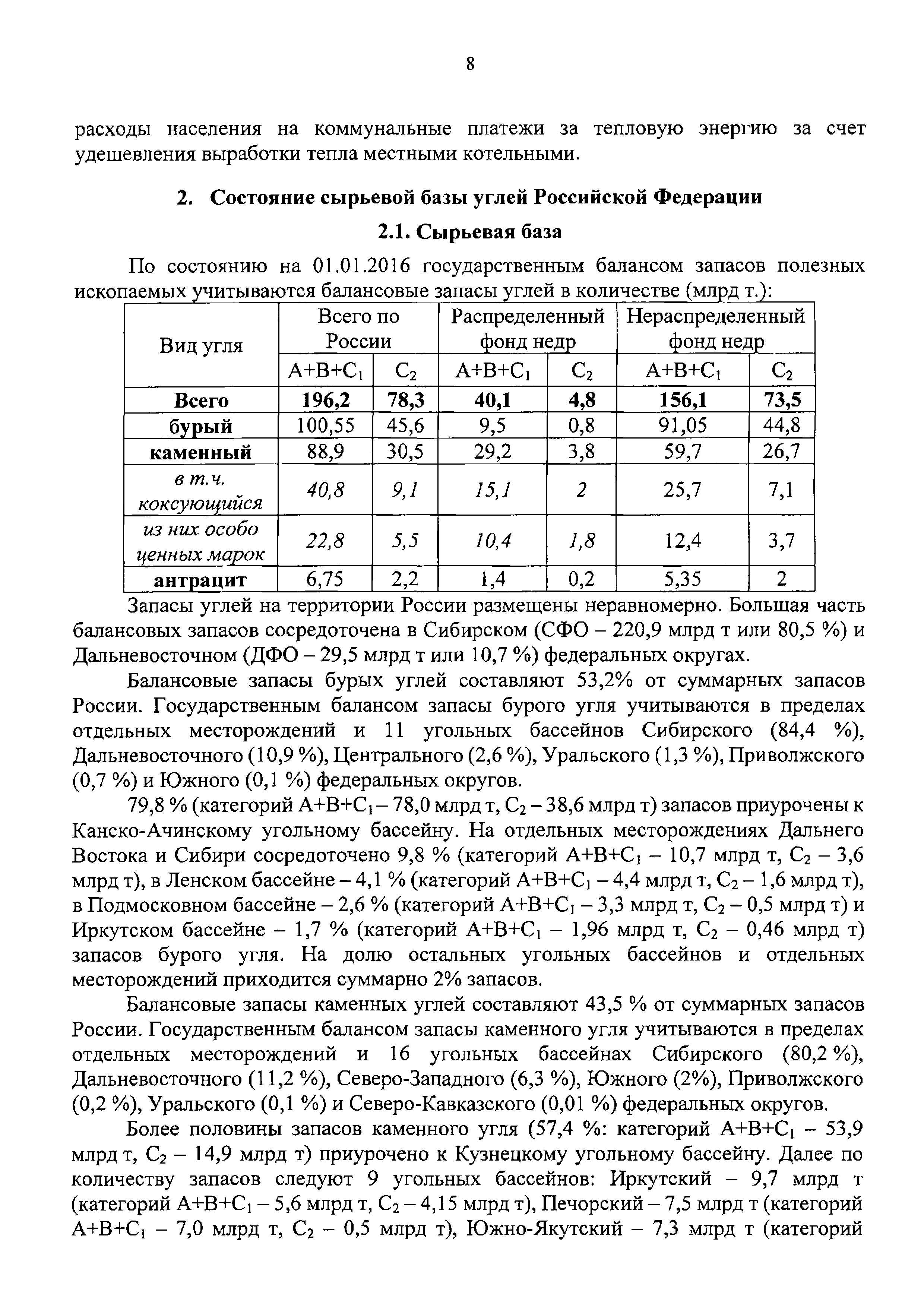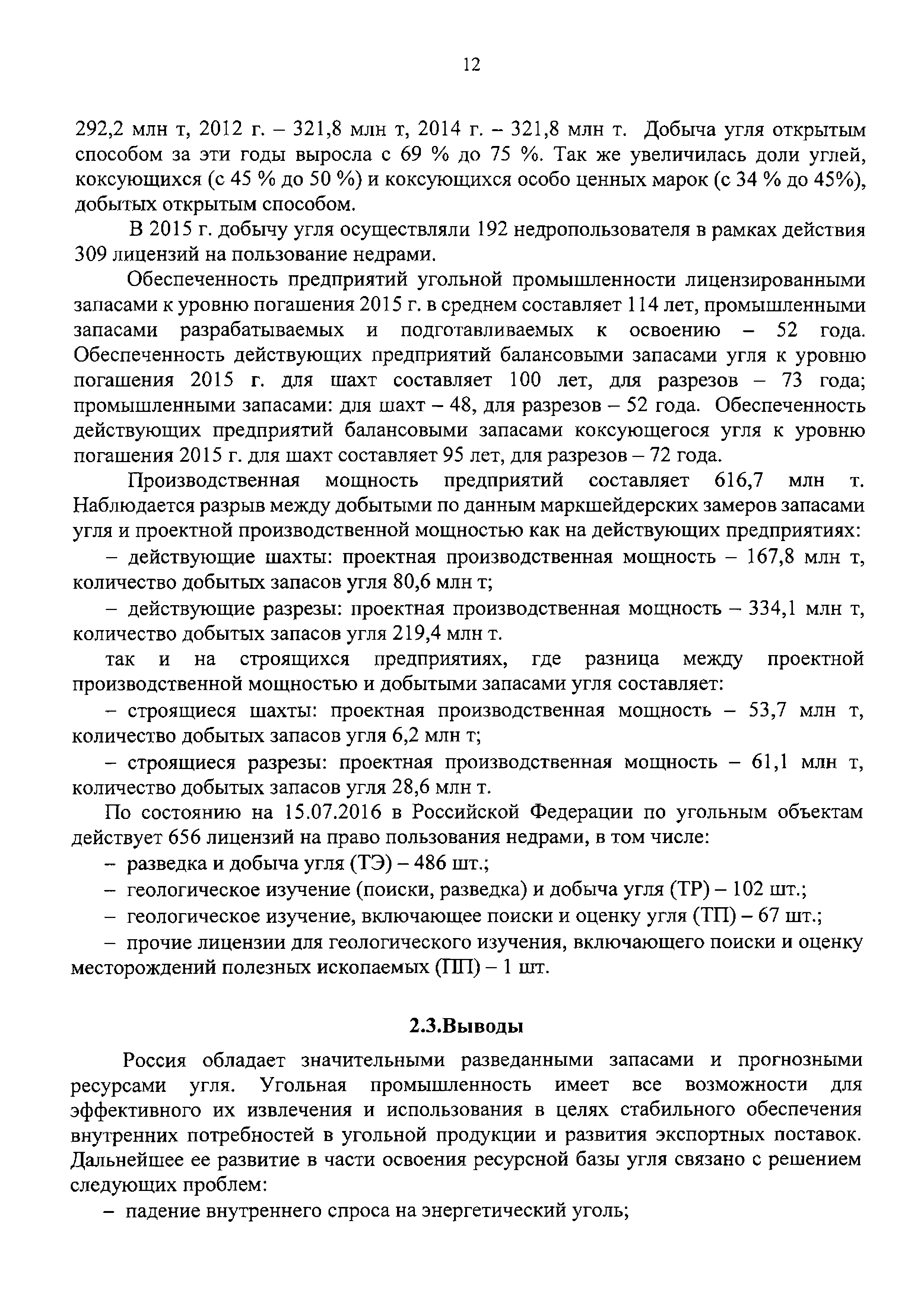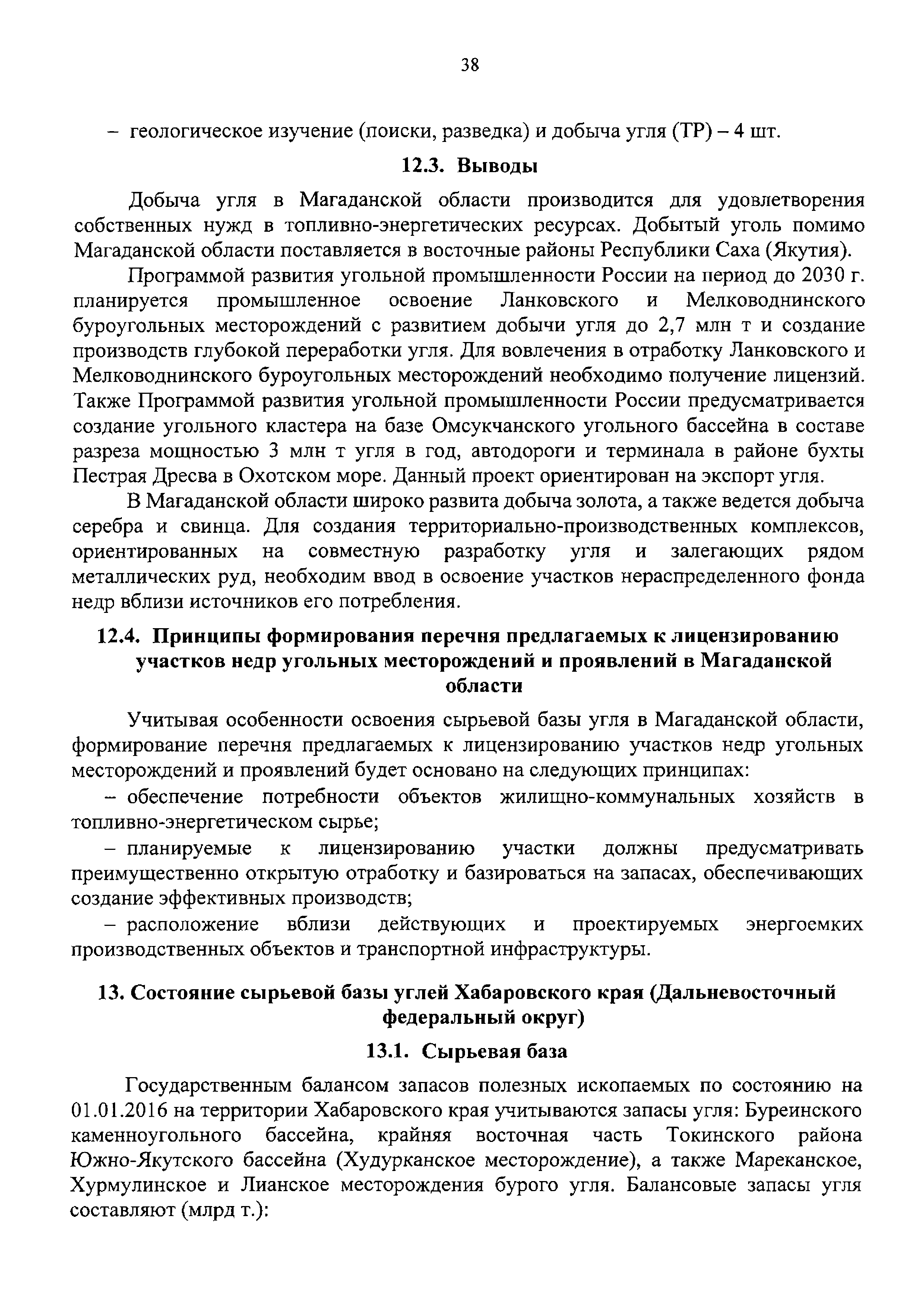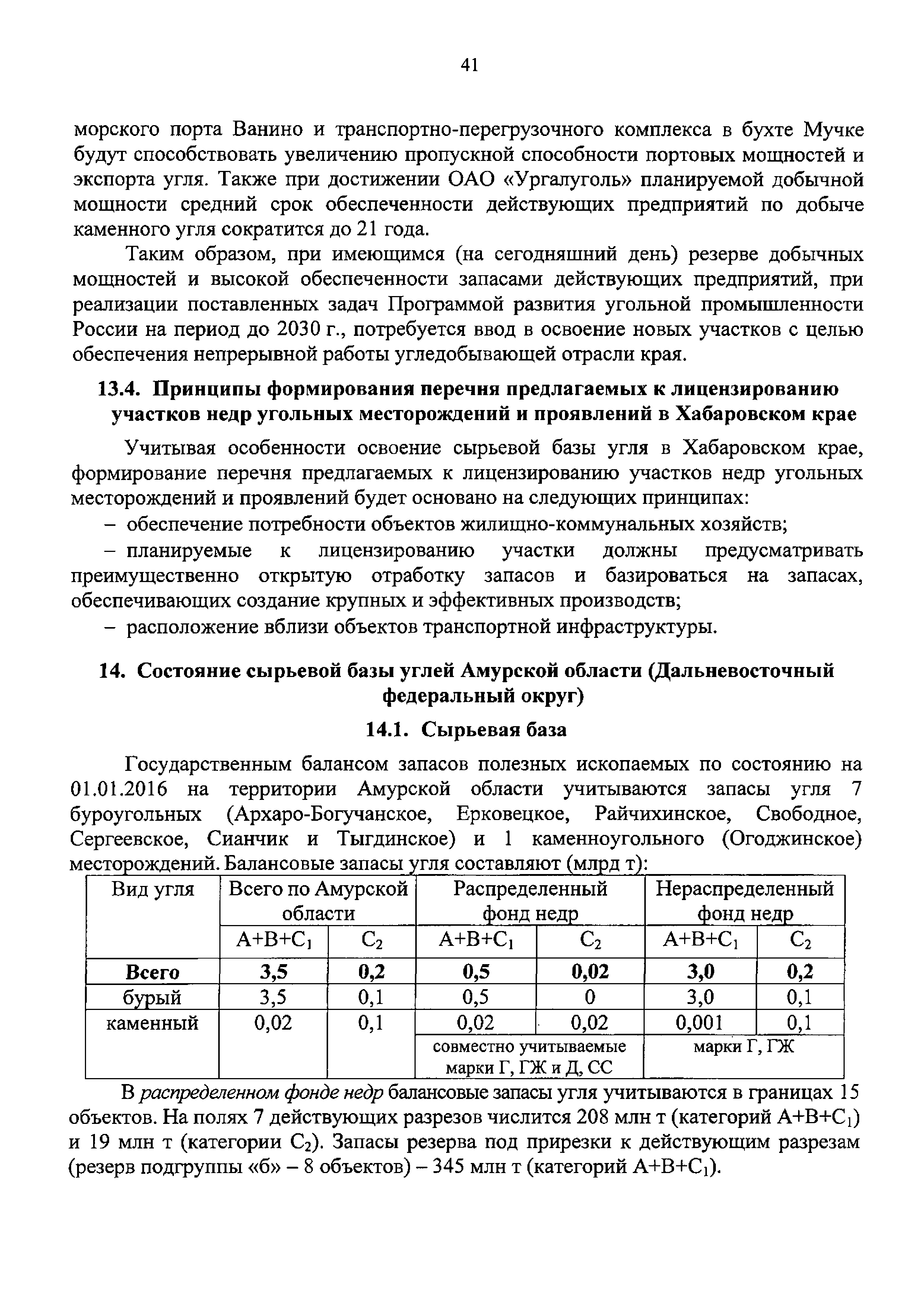 | Оглавление: | Введение 1. Основные направления реализации программы развития угольной промышленности России на период до 2030 г. 2. Состояние сырьевой базы углей Российской Федерации 3. Состояние сырьевой базы углей Восточного Донбасса, Ростовская область (Южный федеральный округ) 4. Состояние сырьевой базы углей Печорского бассейна, Республика Коми и Ненецкий автономный округ (Северо-Западный федеральный округ) 5. Состояние сырьевой базы углей Кузнецкого бассейна, Кемеровская область (Сибирский федеральный округ) 6. Состояние сырьевой базы углей Улугхемского и Республики Тыва (Сибирский Федеральный округ) 7. Состояние сырьевой базы углей Минусинского бассейна, Республика Хакасия (Сибирский федеральный округ) 8. Состояние сырьевой базы углей Забайкальского края (Сибирский федеральный округ) 9. Состояние сырьевой базы углей Республики Саха (Якутия) (Дальневосточный федеральный округ) 10. Состояние сырьевой базы углей Чукотского автономного округа (Дальневосточный федеральный округ) 11. Состояние сырьевой базы углей Камчатского края (Дальневосточный федеральный округ) 12. Состояние сырьевой базы углей Магаданской области (Дальневосточный федеральный округ) 13. Состояние сырьевой базы углей Хабаровского края (Дальневосточный федеральный округ) 14. Состояние сырьевой базы углей Амурской области (Дальневосточный федеральный округ) 15. Состояние сырьевой базы углей Приморского края (Дальневосточный федеральный округ) 16. Состояние сырьевой базы углей Сахалинской области (Дальневосточный федеральный округ) 17. Ожидаемые результаты выполнения программы Приложение 1. Оценка баланса производства и потребления коксующихся углей Приложение 2. Перечень участков нераспределенного фонда недр, содержащих угли особо ценных коксующихся марок К, КЖ, ОС, КЖ, и дефицитных энергетических марок СС, Т для условий открытой отработки по состоянию на 10.11.2016 г. (млн т) |