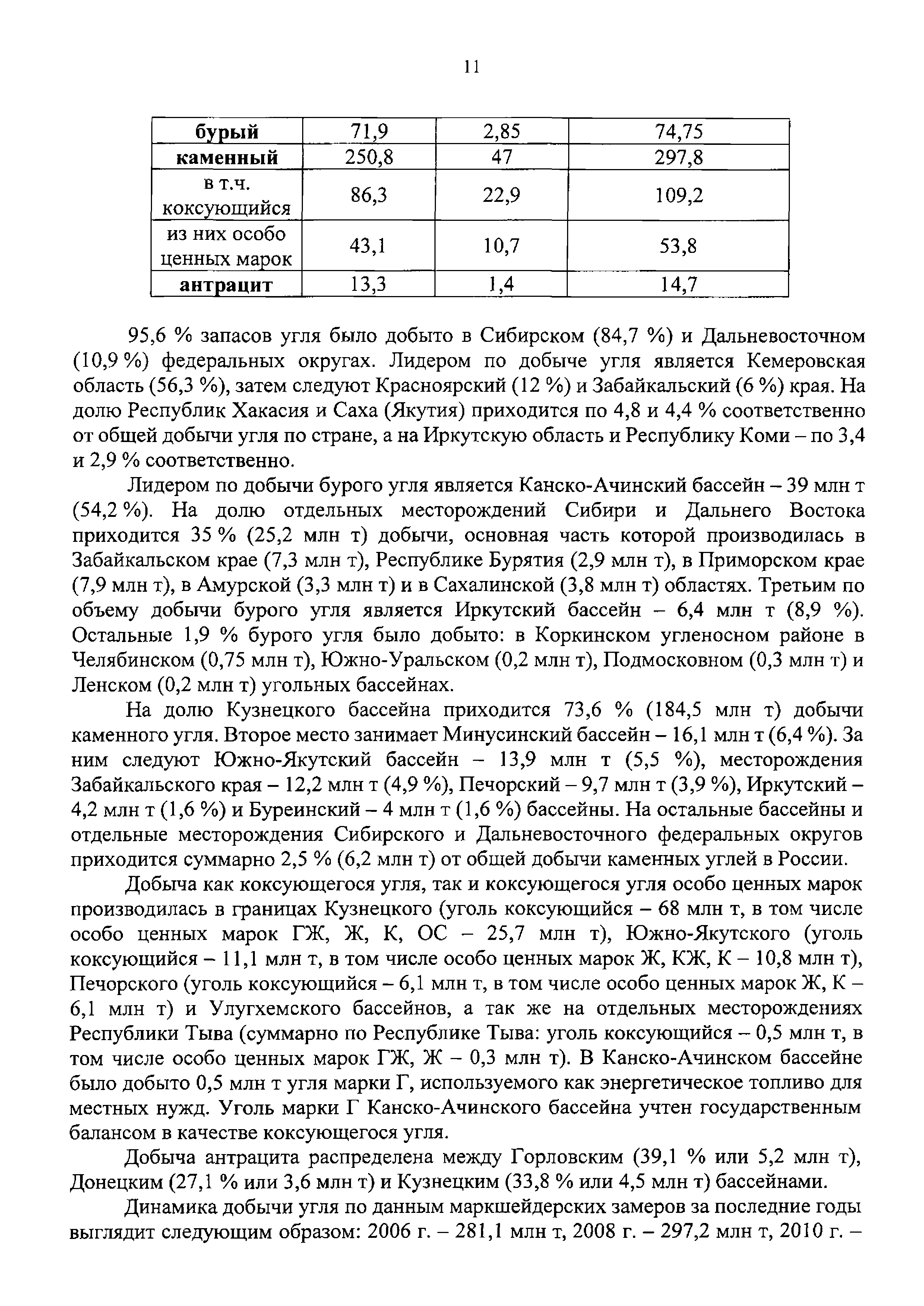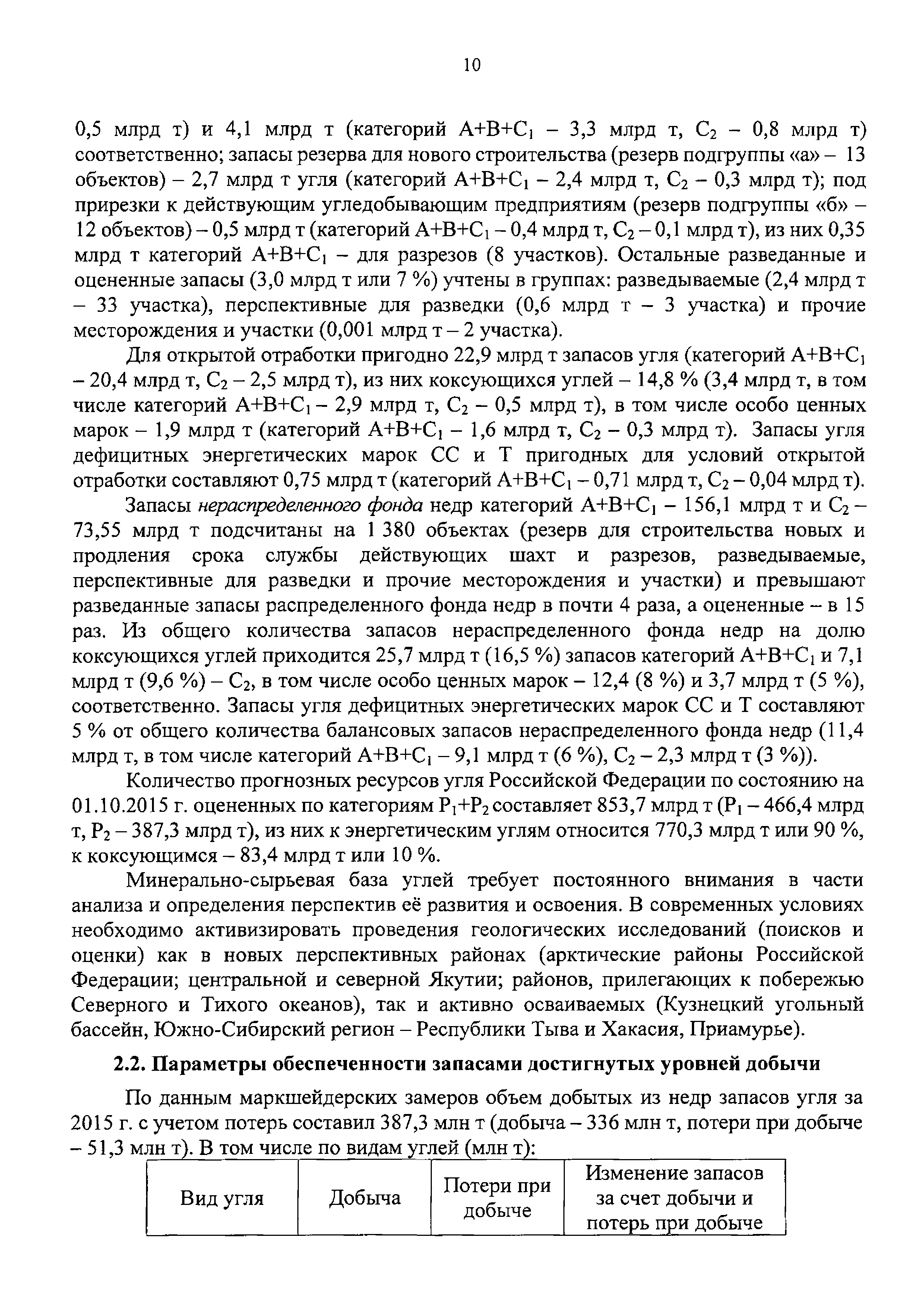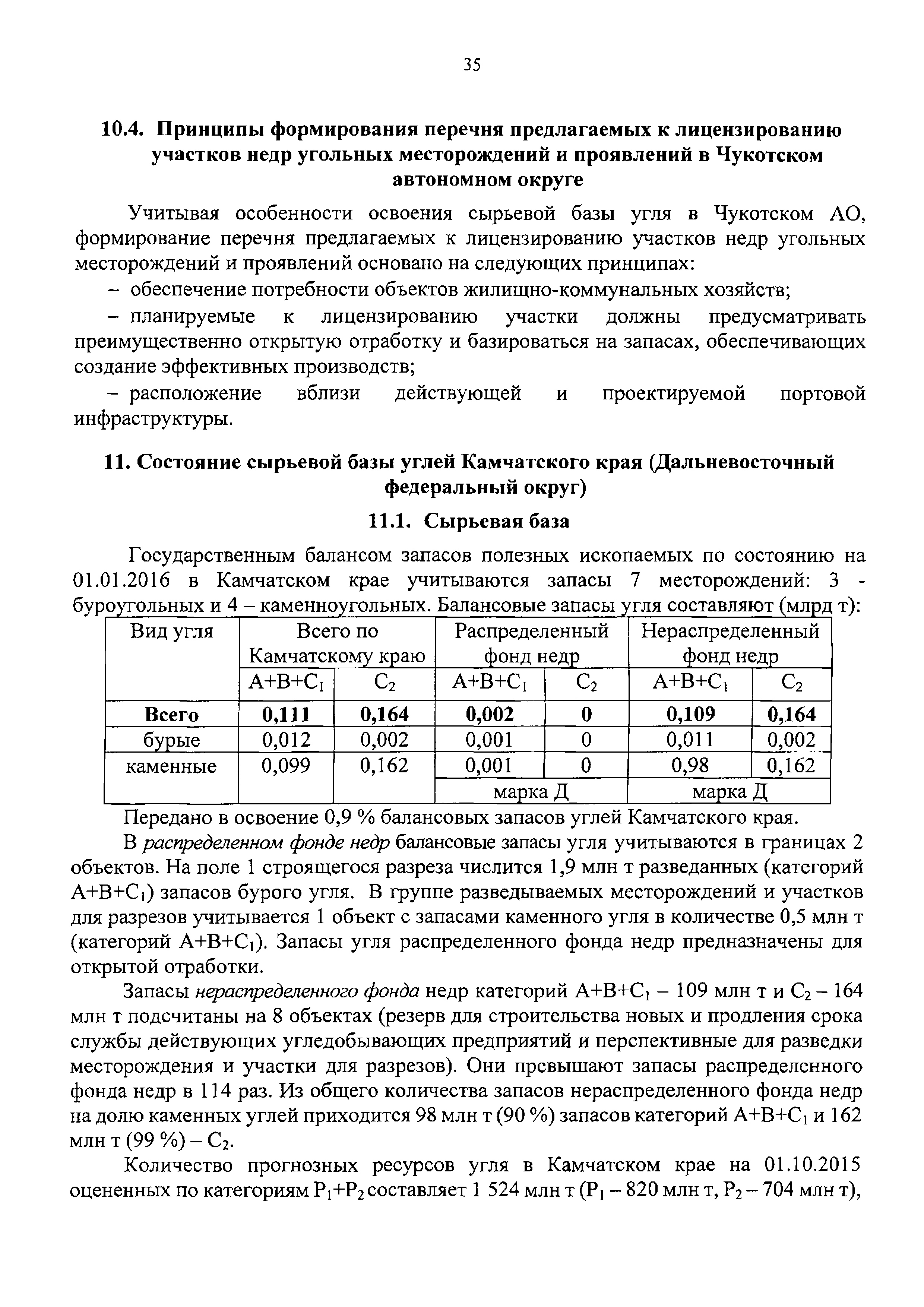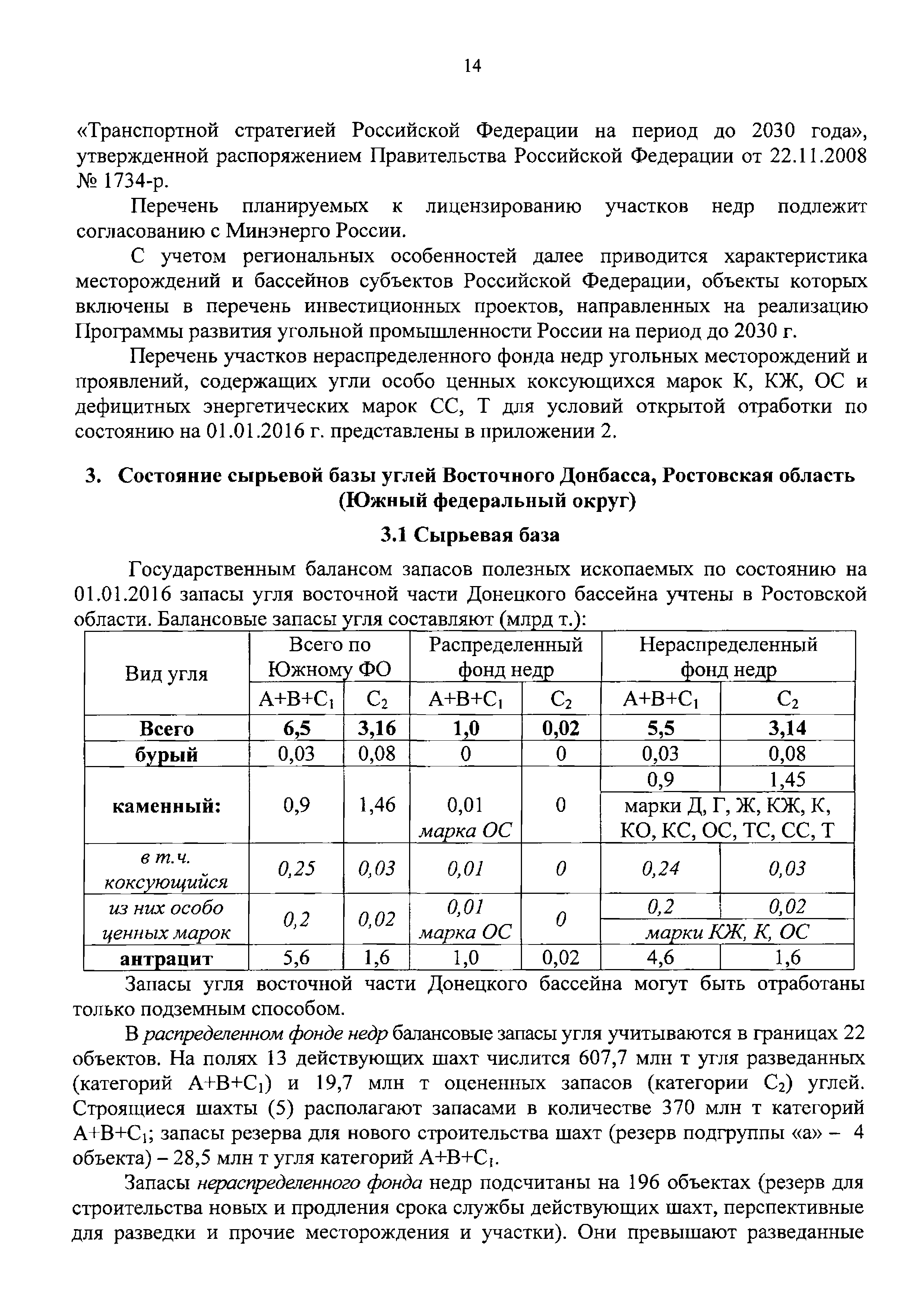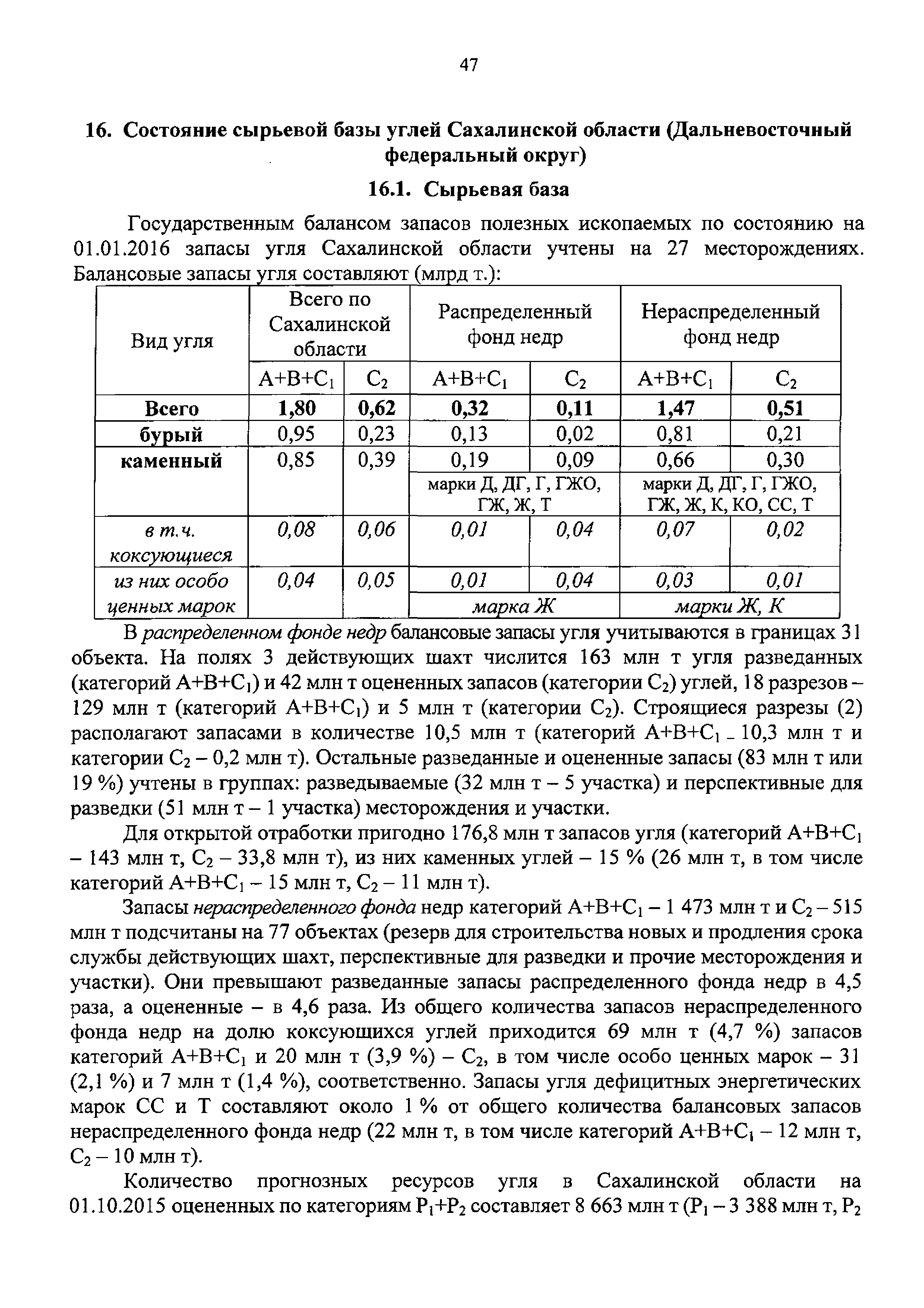| Оглавление: | Введение 1. Основные направления реализации программы развития угольной промышленности России на период до 2030 г. 2. Состояние сырьевой базы углей Российской Федерации 3. Состояние сырьевой базы углей Восточного Донбасса, Ростовская область (Южный федеральный округ) 4. Состояние сырьевой базы углей Печорского бассейна, Республика Коми и Ненецкий автономный округ (Северо-Западный федеральный округ) 5. Состояние сырьевой базы углей Кузнецкого бассейна, Кемеровская область (Сибирский федеральный округ) 6. Состояние сырьевой базы углей Улугхемского и Республики Тыва (Сибирский Федеральный округ) 7. Состояние сырьевой базы углей Минусинского бассейна, Республика Хакасия (Сибирский федеральный округ) 8. Состояние сырьевой базы углей Забайкальского края (Сибирский федеральный округ) 9. Состояние сырьевой базы углей Республики Саха (Якутия) (Дальневосточный федеральный округ) 10. Состояние сырьевой базы углей Чукотского автономного округа (Дальневосточный федеральный округ) 11. Состояние сырьевой базы углей Камчатского края (Дальневосточный федеральный округ) 12. Состояние сырьевой базы углей Магаданской области (Дальневосточный федеральный округ) 13. Состояние сырьевой базы углей Хабаровского края (Дальневосточный федеральный округ) 14. Состояние сырьевой базы углей Амурской области (Дальневосточный федеральный округ) 15. Состояние сырьевой базы углей Приморского края (Дальневосточный федеральный округ) 16. Состояние сырьевой базы углей Сахалинской области (Дальневосточный федеральный округ) 17. Ожидаемые результаты выполнения программы Приложение 1. Оценка баланса производства и потребления коксующихся углей Приложение 2. Перечень участков нераспределенного фонда недр, содержащих угли особо ценных коксующихся марок К, КЖ, ОС, КЖ, и дефицитных энергетических марок СС, Т для условий открытой отработки по состоянию на 10.11.2016 г. (млн т) |