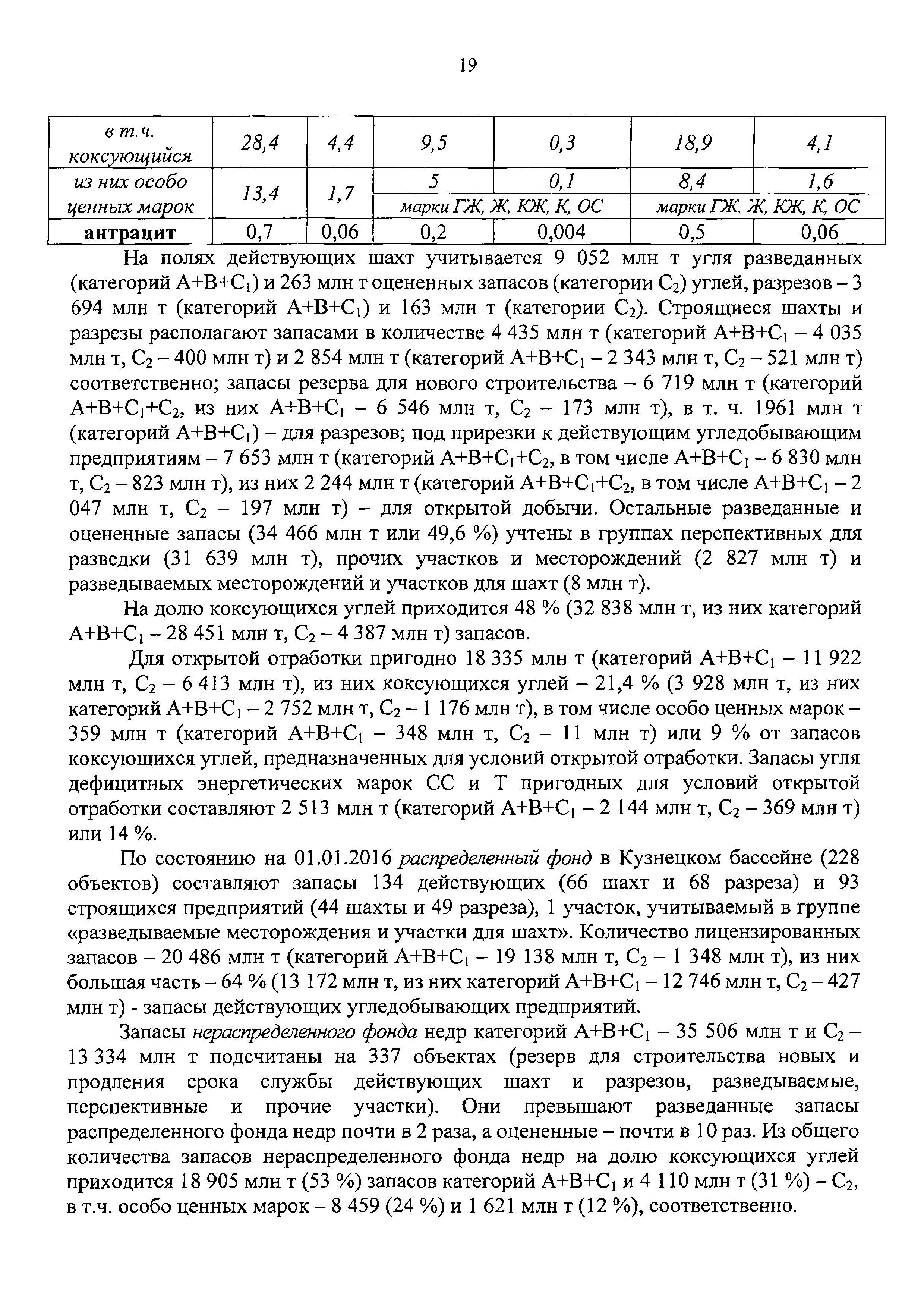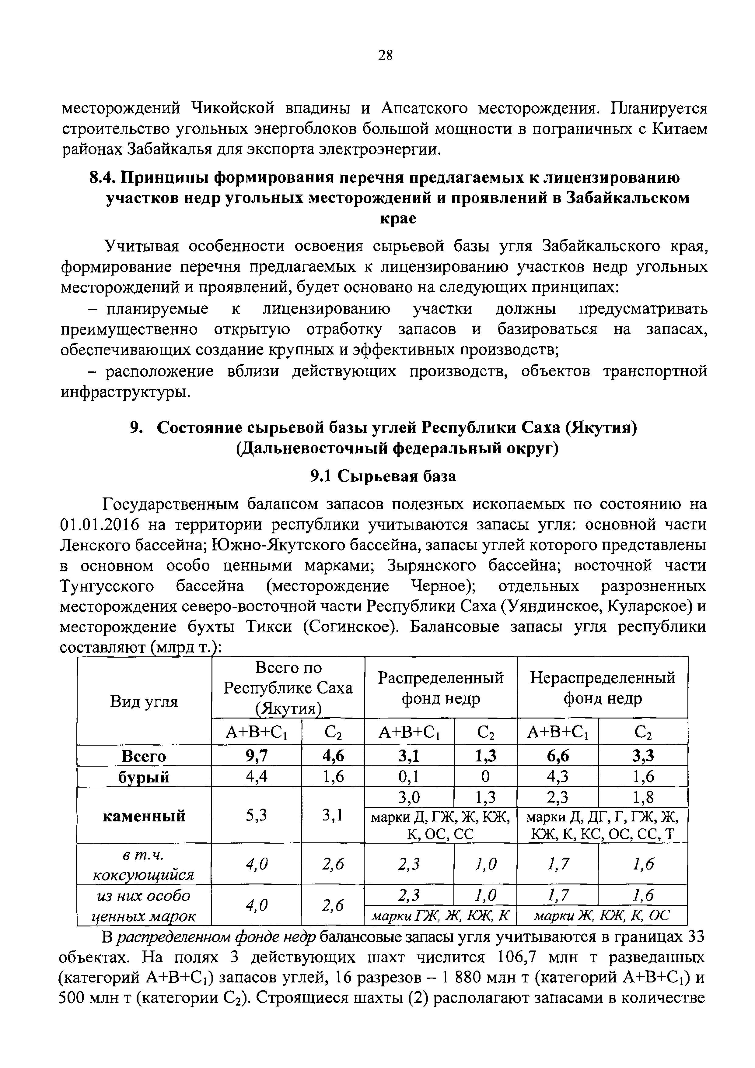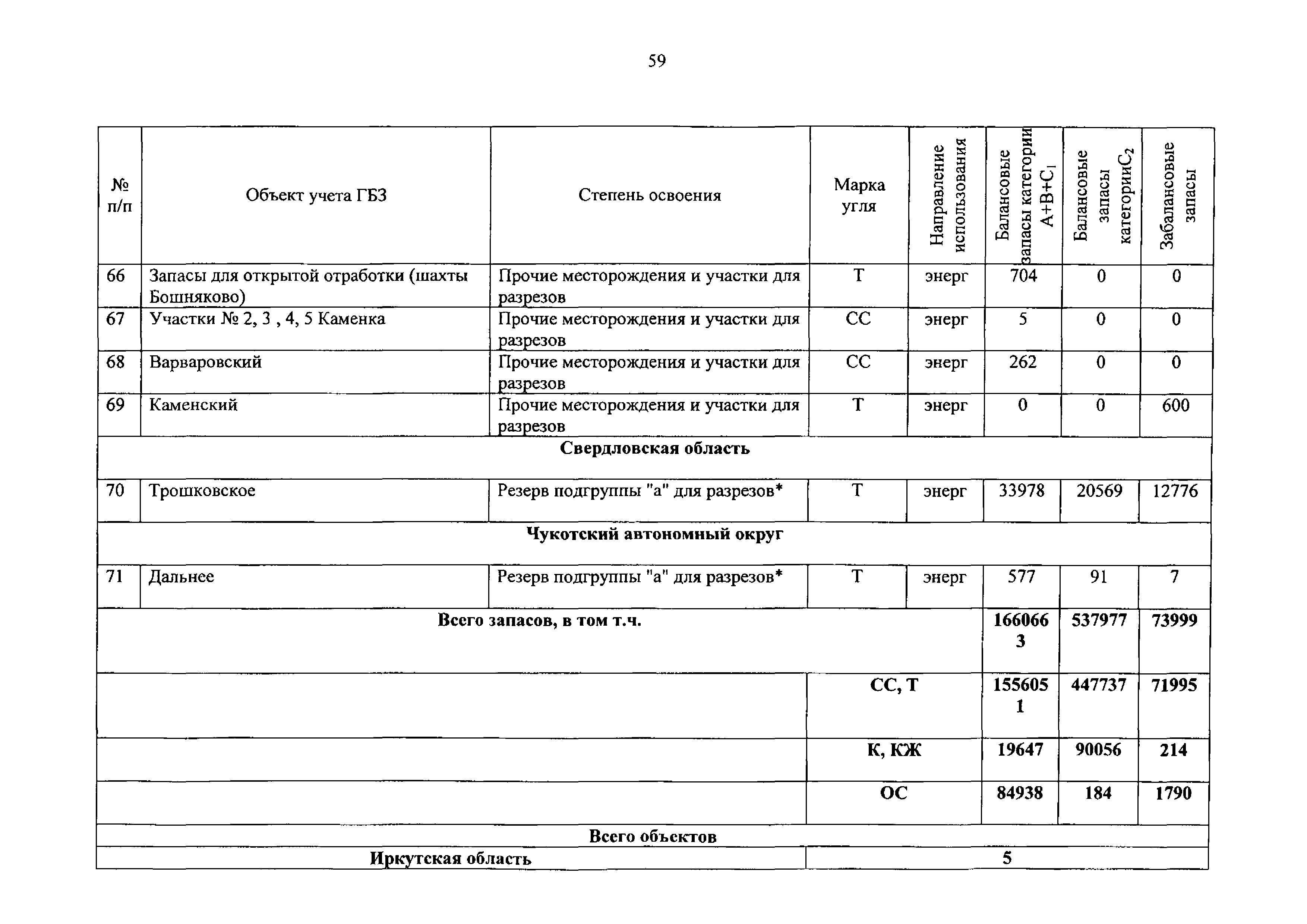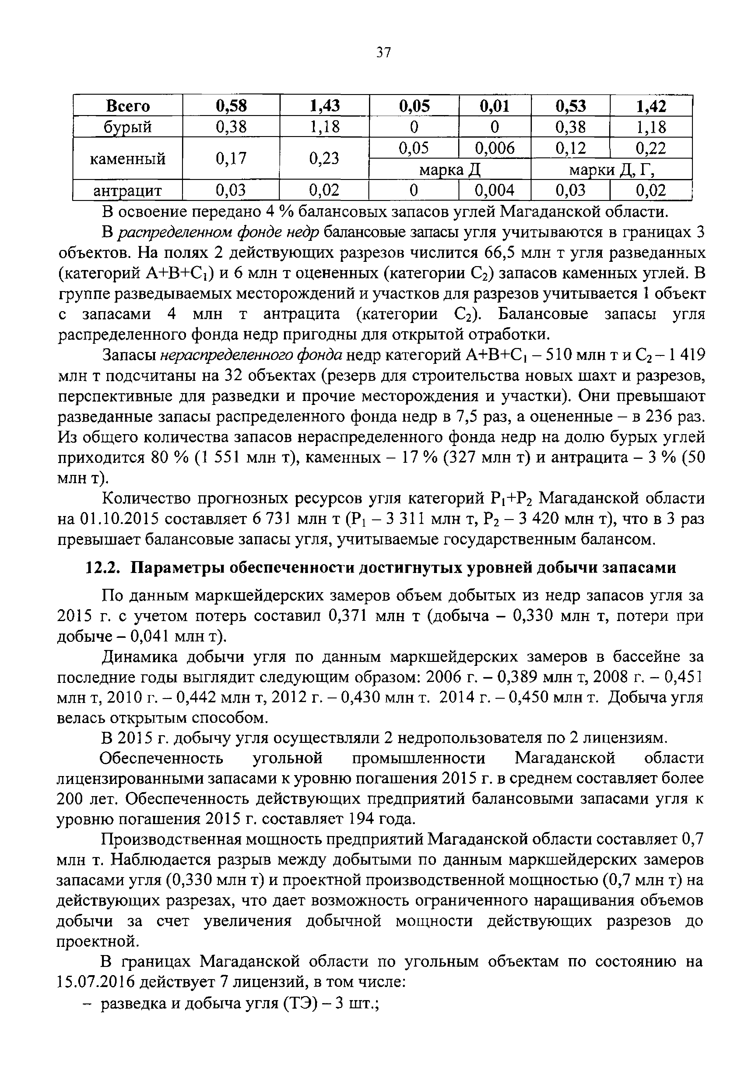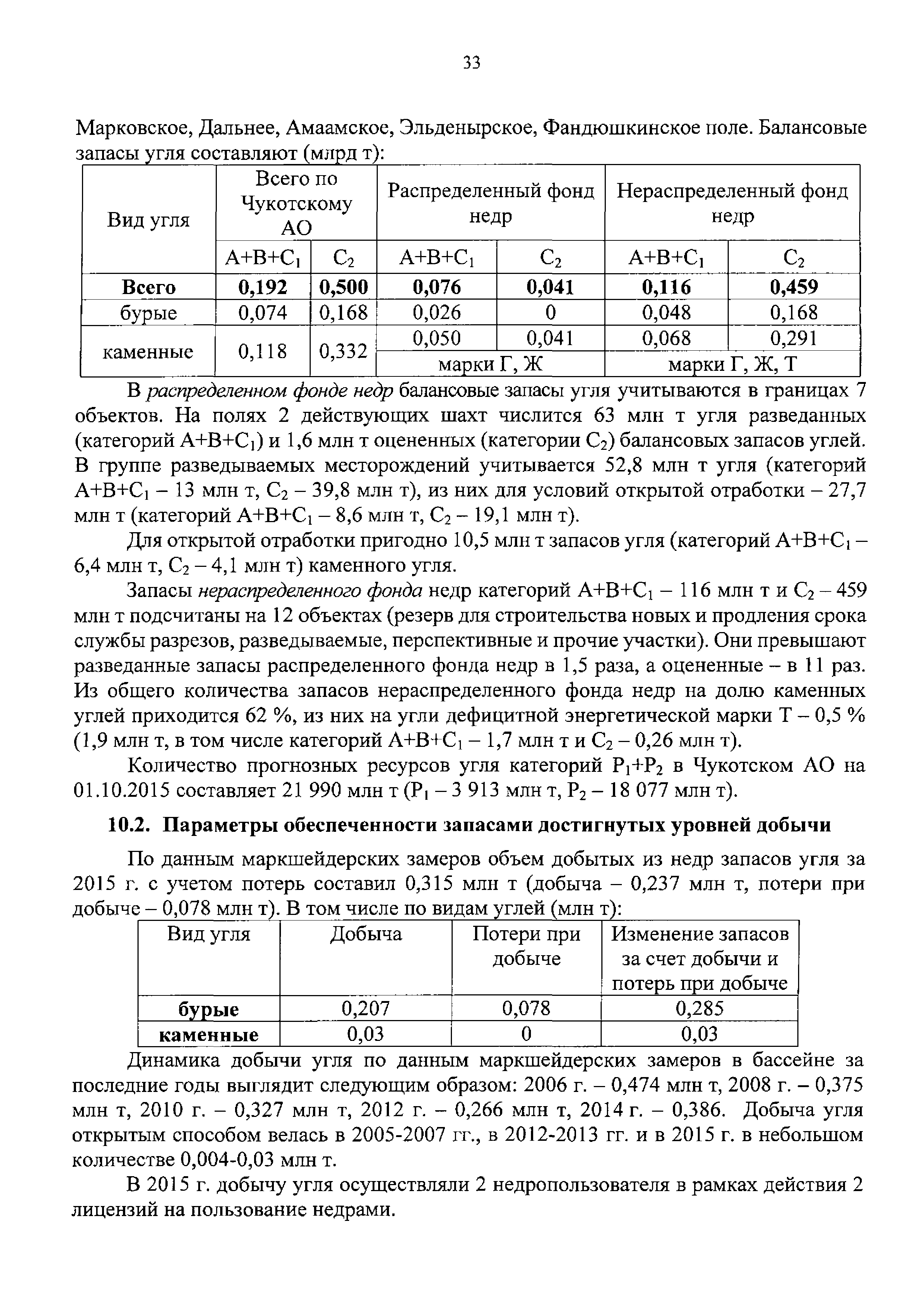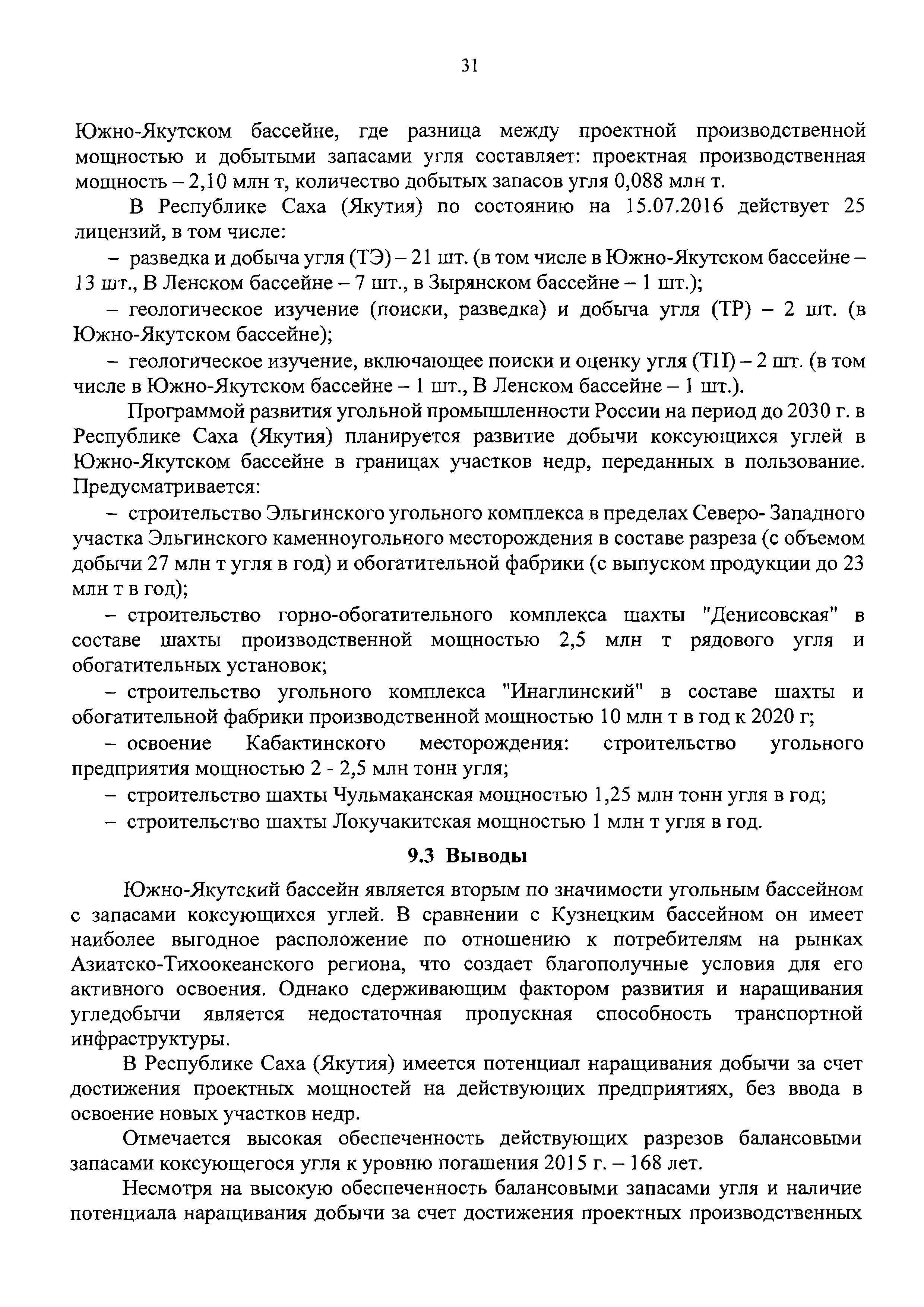 | Оглавление: | Введение 1. Основные направления реализации программы развития угольной промышленности России на период до 2030 г. 2. Состояние сырьевой базы углей Российской Федерации 3. Состояние сырьевой базы углей Восточного Донбасса, Ростовская область (Южный федеральный округ) 4. Состояние сырьевой базы углей Печорского бассейна, Республика Коми и Ненецкий автономный округ (Северо-Западный федеральный округ) 5. Состояние сырьевой базы углей Кузнецкого бассейна, Кемеровская область (Сибирский федеральный округ) 6. Состояние сырьевой базы углей Улугхемского и Республики Тыва (Сибирский Федеральный округ) 7. Состояние сырьевой базы углей Минусинского бассейна, Республика Хакасия (Сибирский федеральный округ) 8. Состояние сырьевой базы углей Забайкальского края (Сибирский федеральный округ) 9. Состояние сырьевой базы углей Республики Саха (Якутия) (Дальневосточный федеральный округ) 10. Состояние сырьевой базы углей Чукотского автономного округа (Дальневосточный федеральный округ) 11. Состояние сырьевой базы углей Камчатского края (Дальневосточный федеральный округ) 12. Состояние сырьевой базы углей Магаданской области (Дальневосточный федеральный округ) 13. Состояние сырьевой базы углей Хабаровского края (Дальневосточный федеральный округ) 14. Состояние сырьевой базы углей Амурской области (Дальневосточный федеральный округ) 15. Состояние сырьевой базы углей Приморского края (Дальневосточный федеральный округ) 16. Состояние сырьевой базы углей Сахалинской области (Дальневосточный федеральный округ) 17. Ожидаемые результаты выполнения программы Приложение 1. Оценка баланса производства и потребления коксующихся углей Приложение 2. Перечень участков нераспределенного фонда недр, содержащих угли особо ценных коксующихся марок К, КЖ, ОС, КЖ, и дефицитных энергетических марок СС, Т для условий открытой отработки по состоянию на 10.11.2016 г. (млн т) |