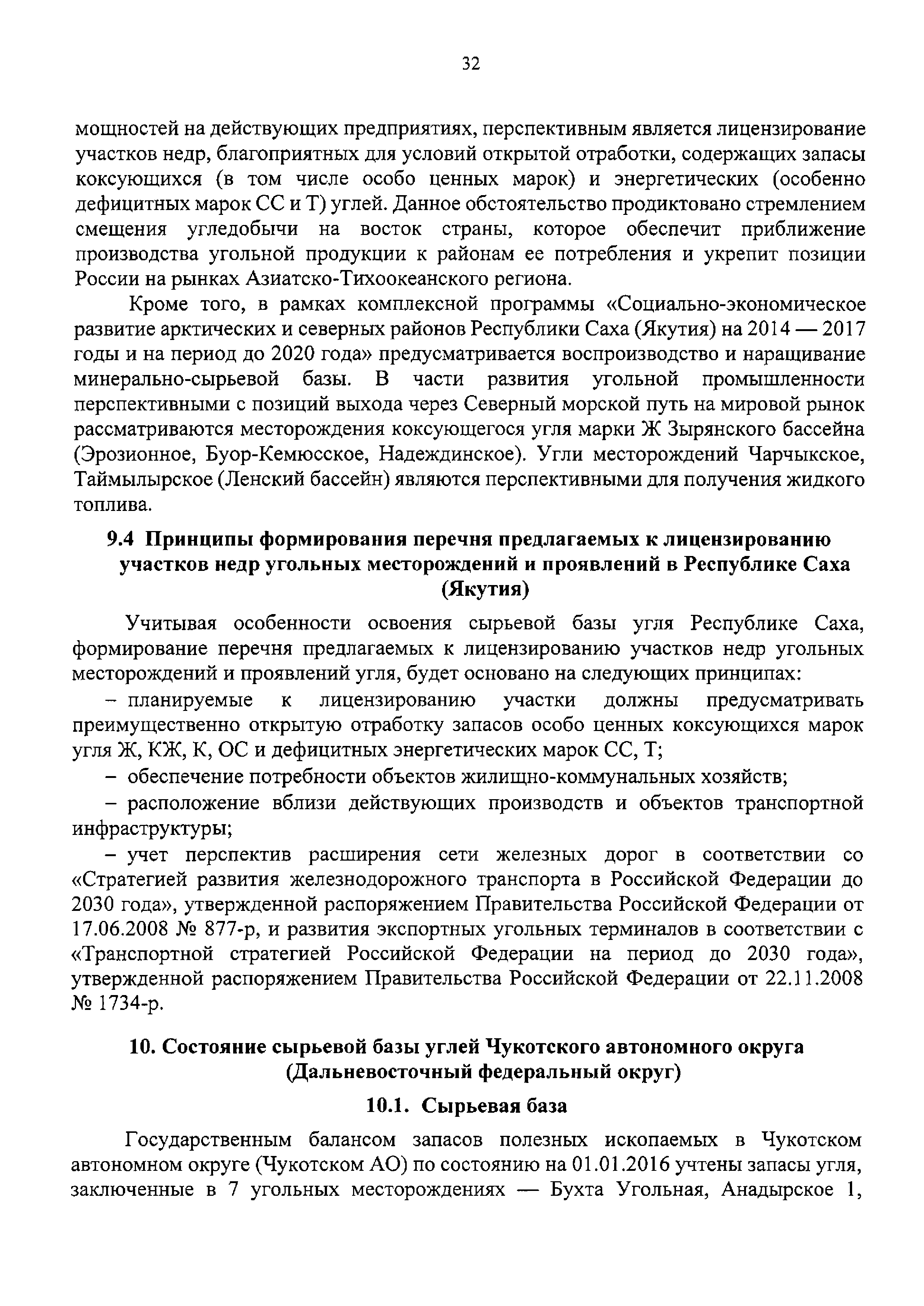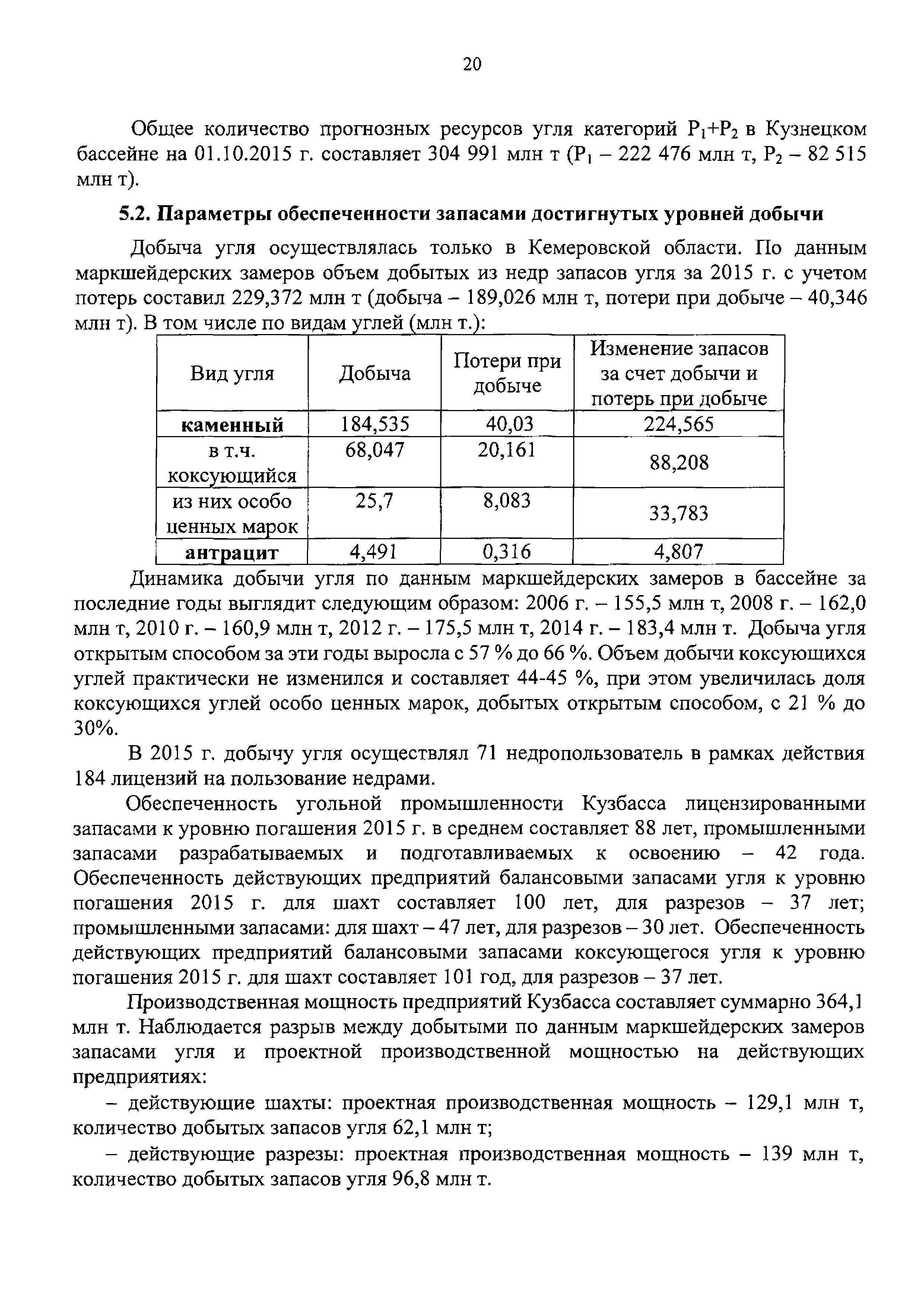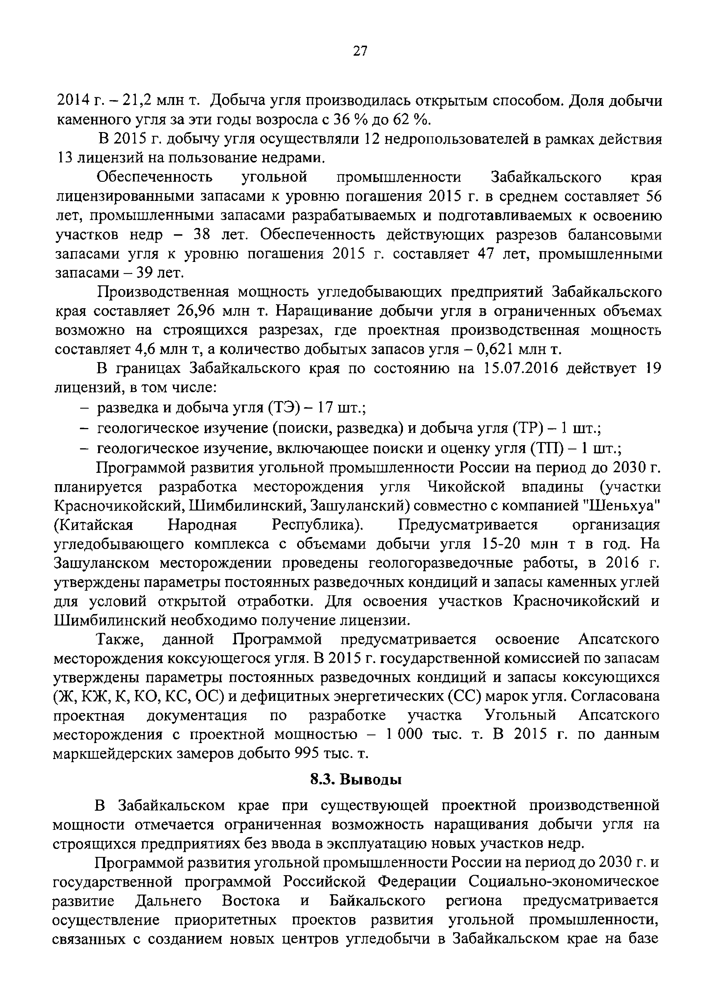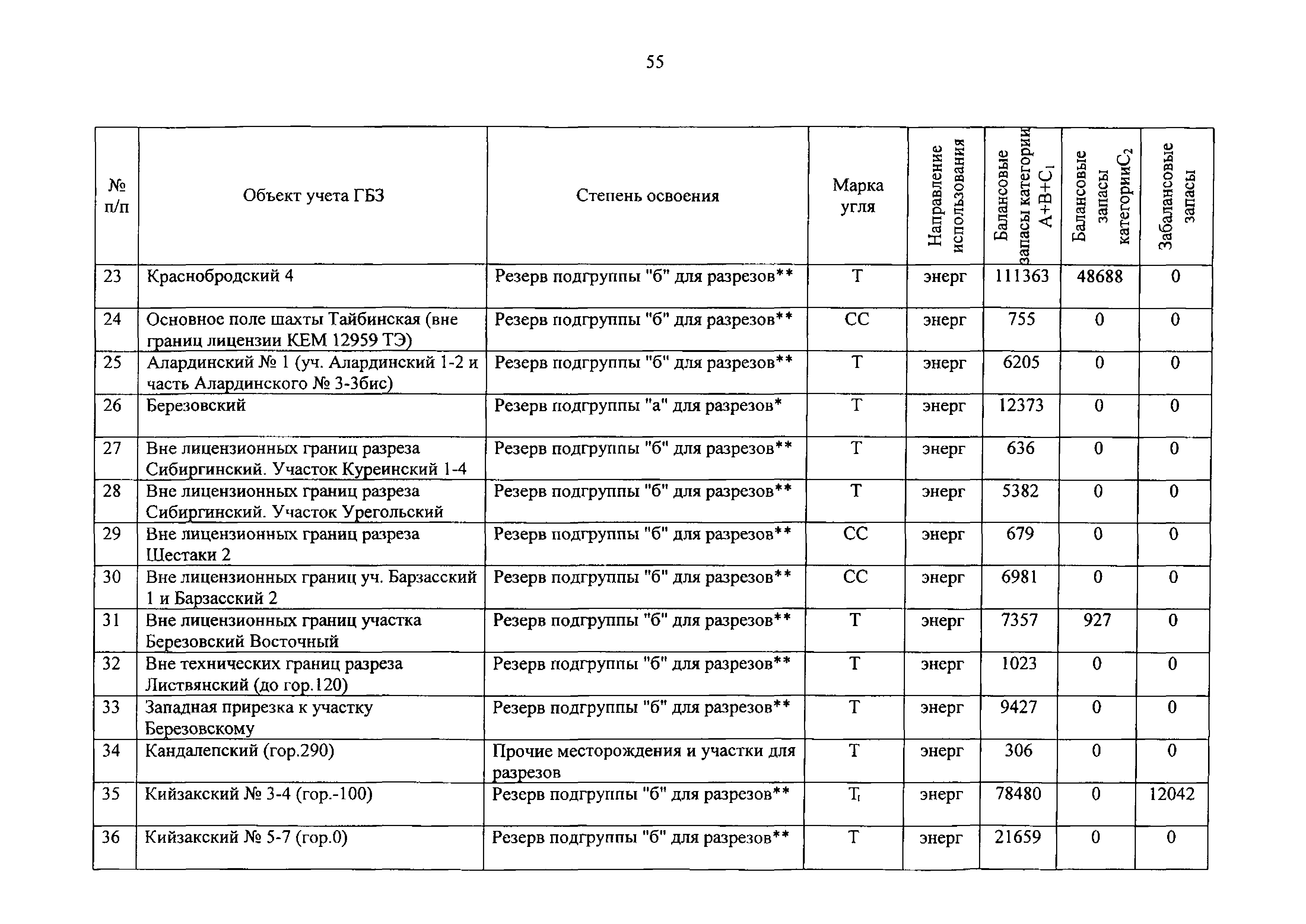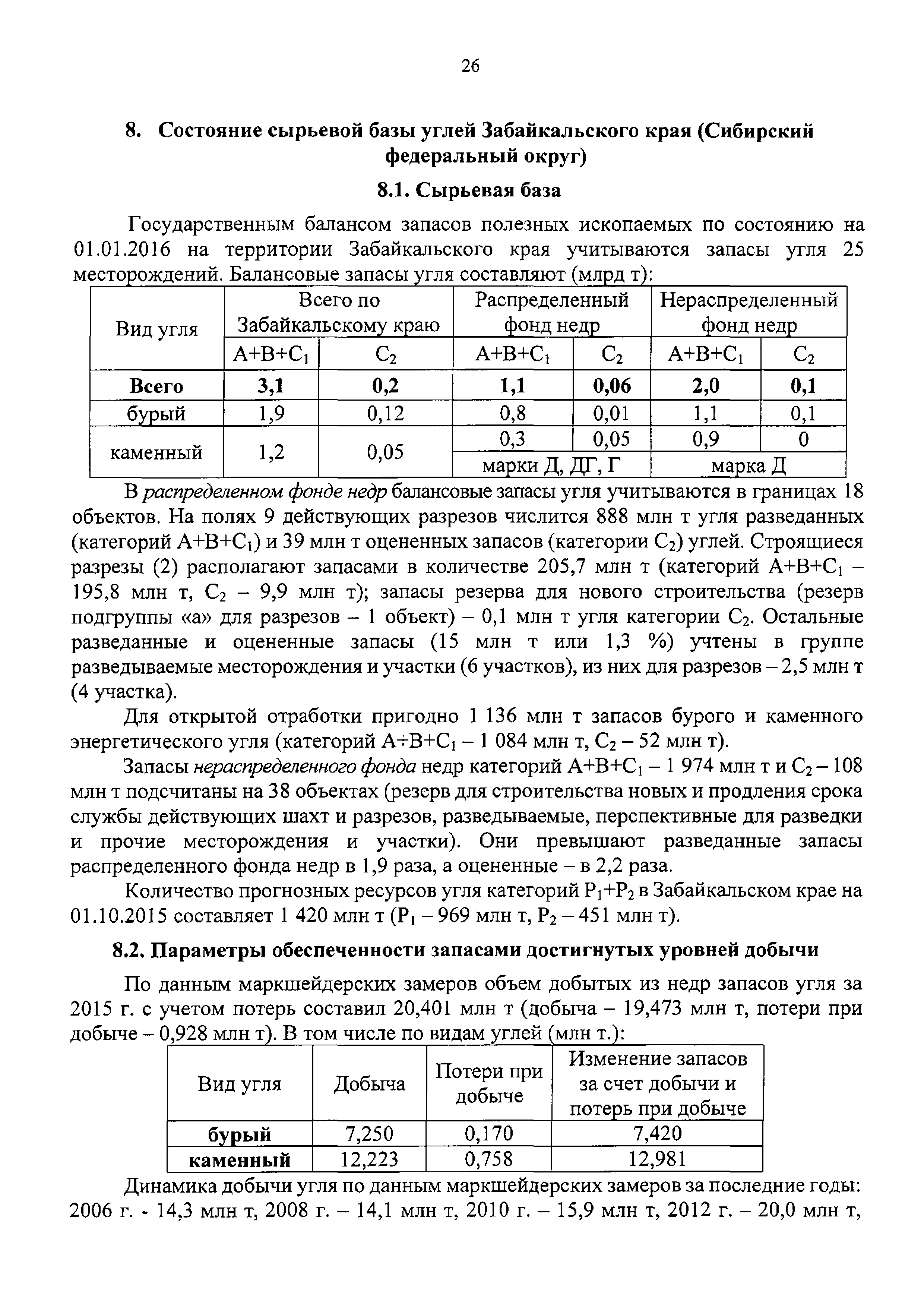 | Оглавление: | Введение 1. Основные направления реализации программы развития угольной промышленности России на период до 2030 г. 2. Состояние сырьевой базы углей Российской Федерации 3. Состояние сырьевой базы углей Восточного Донбасса, Ростовская область (Южный федеральный округ) 4. Состояние сырьевой базы углей Печорского бассейна, Республика Коми и Ненецкий автономный округ (Северо-Западный федеральный округ) 5. Состояние сырьевой базы углей Кузнецкого бассейна, Кемеровская область (Сибирский федеральный округ) 6. Состояние сырьевой базы углей Улугхемского и Республики Тыва (Сибирский Федеральный округ) 7. Состояние сырьевой базы углей Минусинского бассейна, Республика Хакасия (Сибирский федеральный округ) 8. Состояние сырьевой базы углей Забайкальского края (Сибирский федеральный округ) 9. Состояние сырьевой базы углей Республики Саха (Якутия) (Дальневосточный федеральный округ) 10. Состояние сырьевой базы углей Чукотского автономного округа (Дальневосточный федеральный округ) 11. Состояние сырьевой базы углей Камчатского края (Дальневосточный федеральный округ) 12. Состояние сырьевой базы углей Магаданской области (Дальневосточный федеральный округ) 13. Состояние сырьевой базы углей Хабаровского края (Дальневосточный федеральный округ) 14. Состояние сырьевой базы углей Амурской области (Дальневосточный федеральный округ) 15. Состояние сырьевой базы углей Приморского края (Дальневосточный федеральный округ) 16. Состояние сырьевой базы углей Сахалинской области (Дальневосточный федеральный округ) 17. Ожидаемые результаты выполнения программы Приложение 1. Оценка баланса производства и потребления коксующихся углей Приложение 2. Перечень участков нераспределенного фонда недр, содержащих угли особо ценных коксующихся марок К, КЖ, ОС, КЖ, и дефицитных энергетических марок СС, Т для условий открытой отработки по состоянию на 10.11.2016 г. (млн т) |