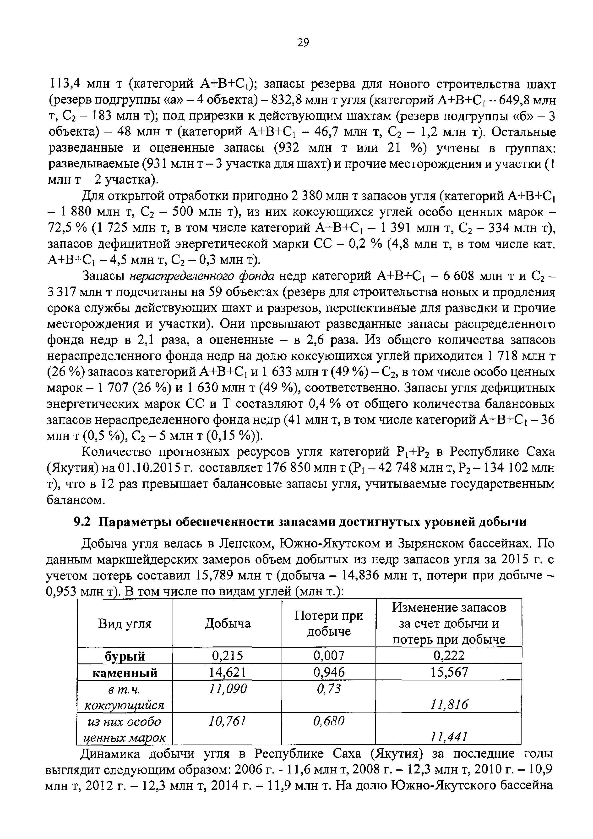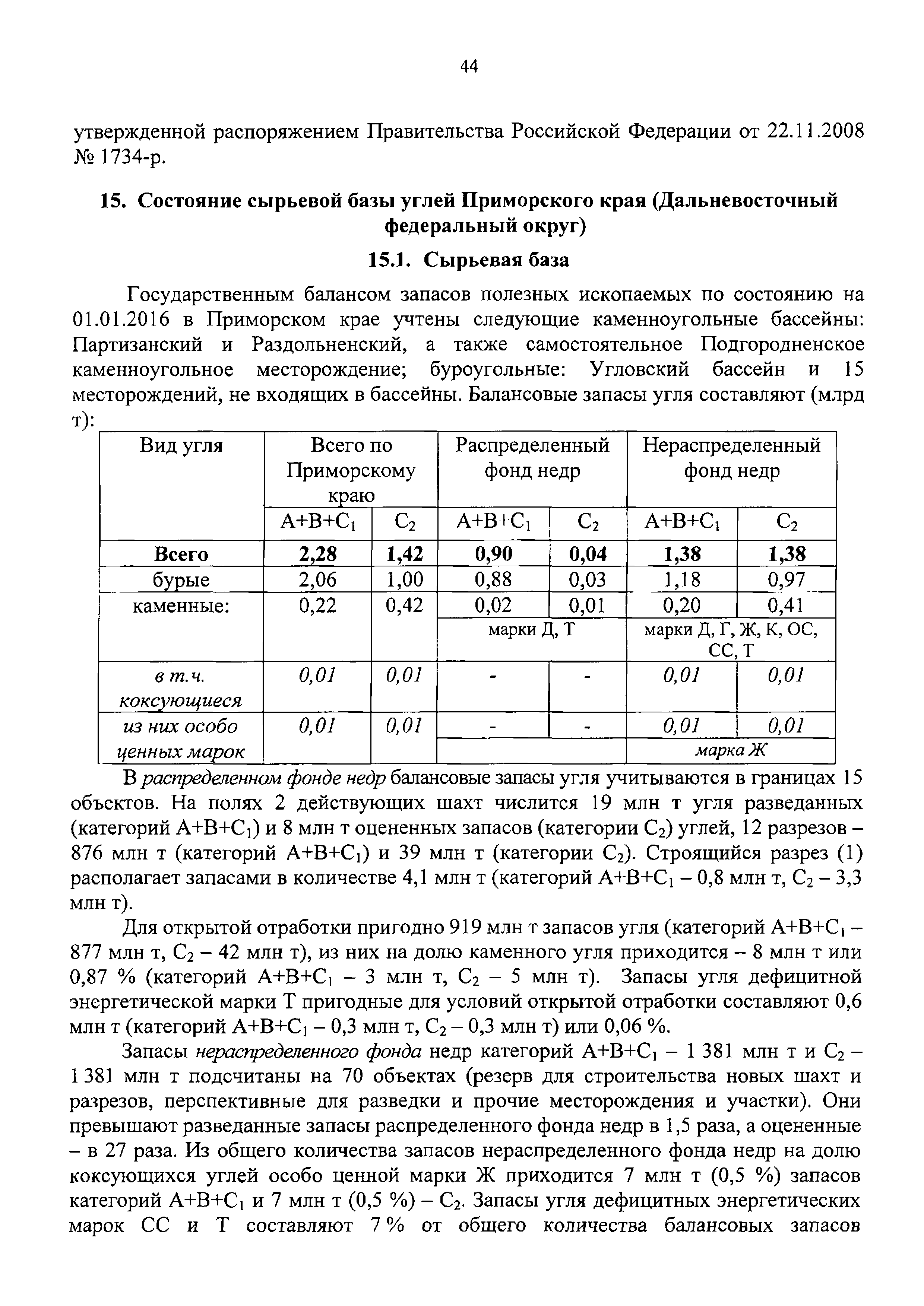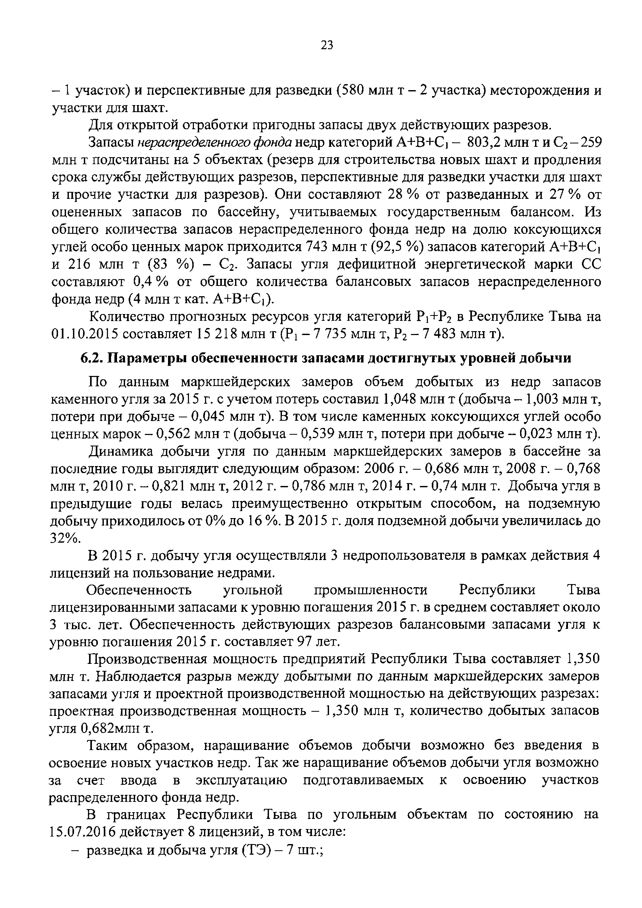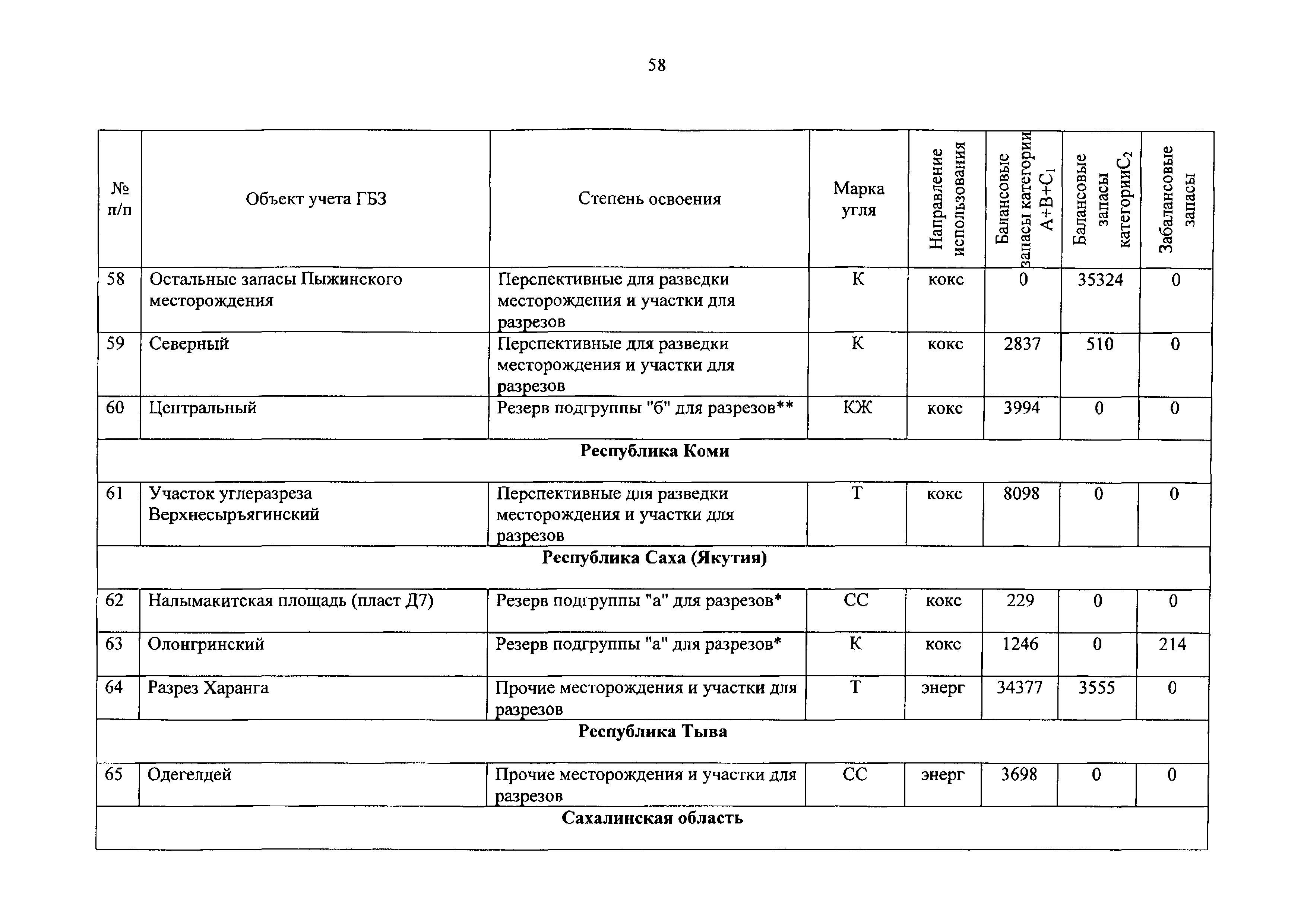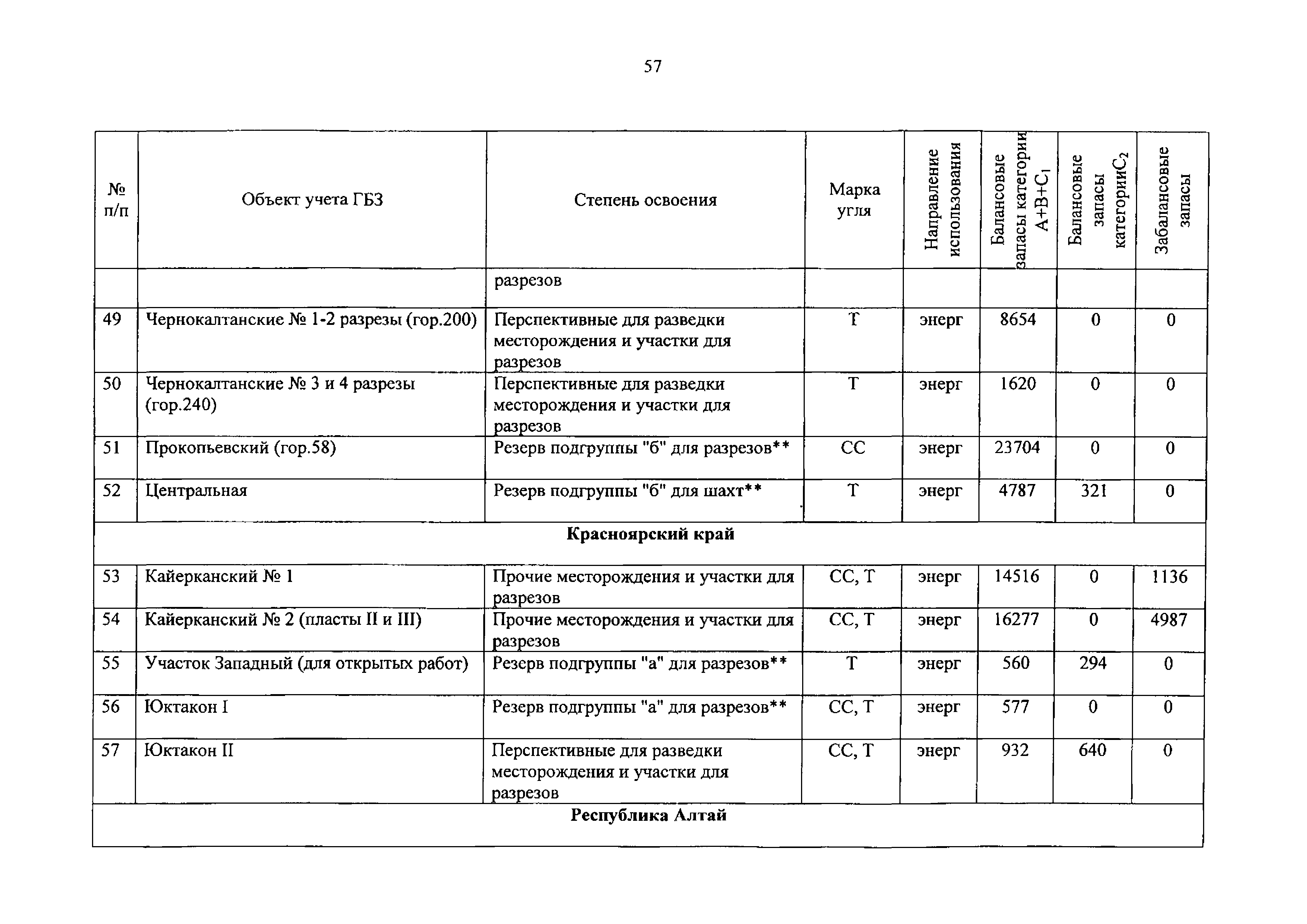 | Оглавление: | Введение 1. Основные направления реализации программы развития угольной промышленности России на период до 2030 г. 2. Состояние сырьевой базы углей Российской Федерации 3. Состояние сырьевой базы углей Восточного Донбасса, Ростовская область (Южный федеральный округ) 4. Состояние сырьевой базы углей Печорского бассейна, Республика Коми и Ненецкий автономный округ (Северо-Западный федеральный округ) 5. Состояние сырьевой базы углей Кузнецкого бассейна, Кемеровская область (Сибирский федеральный округ) 6. Состояние сырьевой базы углей Улугхемского и Республики Тыва (Сибирский Федеральный округ) 7. Состояние сырьевой базы углей Минусинского бассейна, Республика Хакасия (Сибирский федеральный округ) 8. Состояние сырьевой базы углей Забайкальского края (Сибирский федеральный округ) 9. Состояние сырьевой базы углей Республики Саха (Якутия) (Дальневосточный федеральный округ) 10. Состояние сырьевой базы углей Чукотского автономного округа (Дальневосточный федеральный округ) 11. Состояние сырьевой базы углей Камчатского края (Дальневосточный федеральный округ) 12. Состояние сырьевой базы углей Магаданской области (Дальневосточный федеральный округ) 13. Состояние сырьевой базы углей Хабаровского края (Дальневосточный федеральный округ) 14. Состояние сырьевой базы углей Амурской области (Дальневосточный федеральный округ) 15. Состояние сырьевой базы углей Приморского края (Дальневосточный федеральный округ) 16. Состояние сырьевой базы углей Сахалинской области (Дальневосточный федеральный округ) 17. Ожидаемые результаты выполнения программы Приложение 1. Оценка баланса производства и потребления коксующихся углей Приложение 2. Перечень участков нераспределенного фонда недр, содержащих угли особо ценных коксующихся марок К, КЖ, ОС, КЖ, и дефицитных энергетических марок СС, Т для условий открытой отработки по состоянию на 10.11.2016 г. (млн т) |