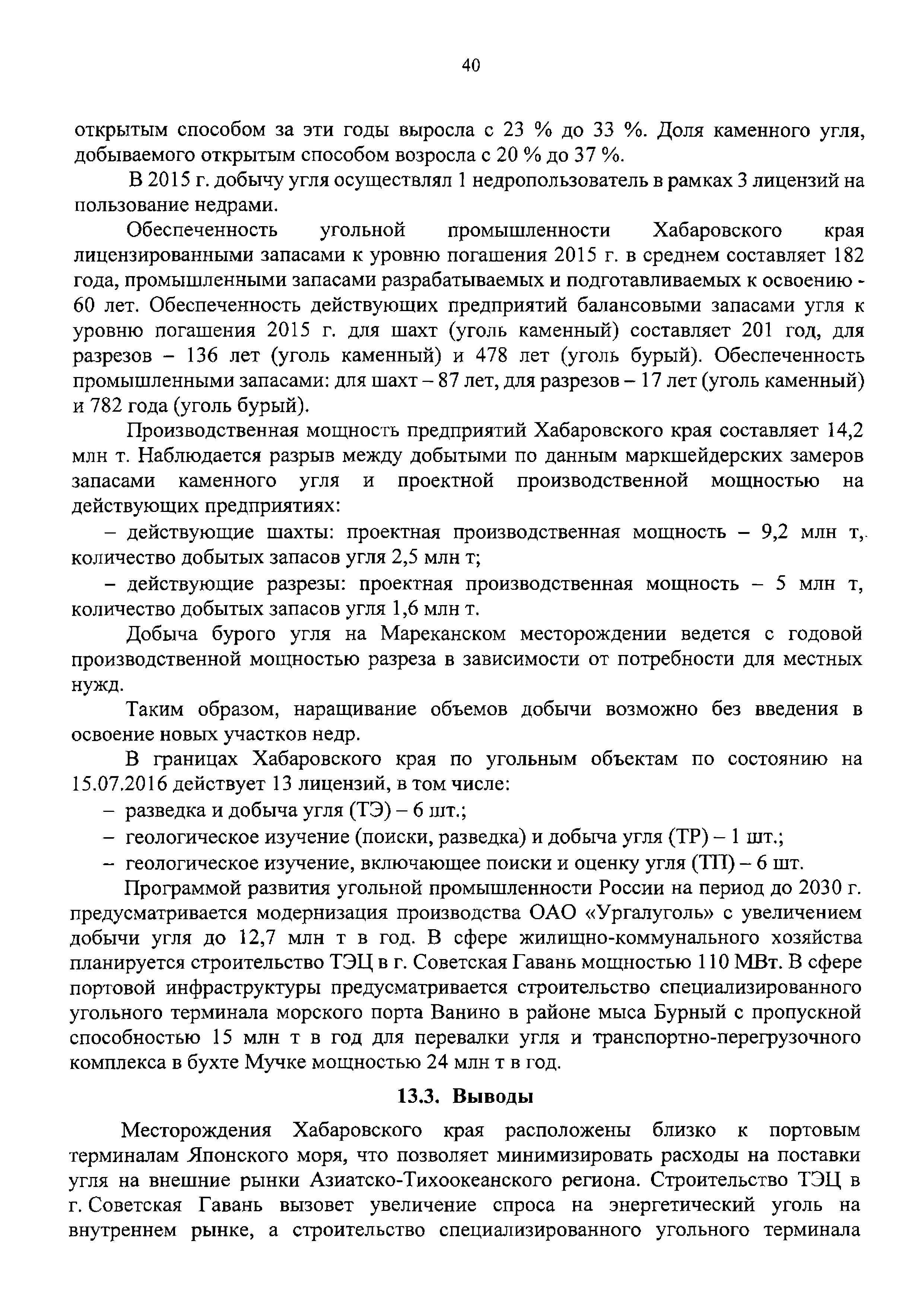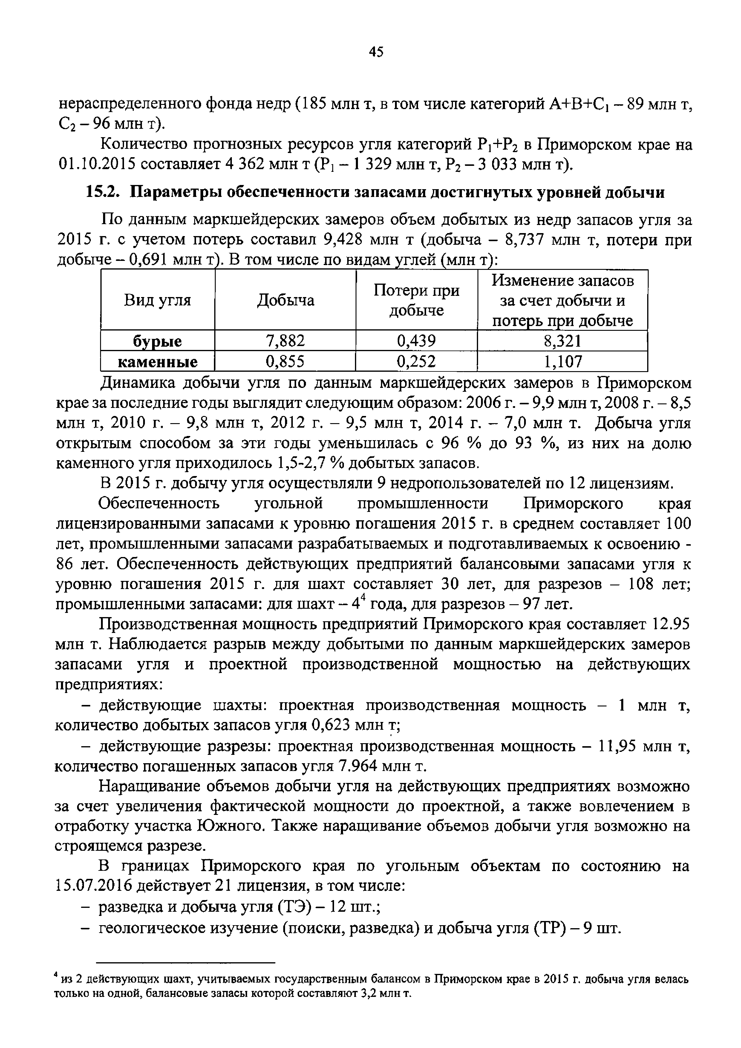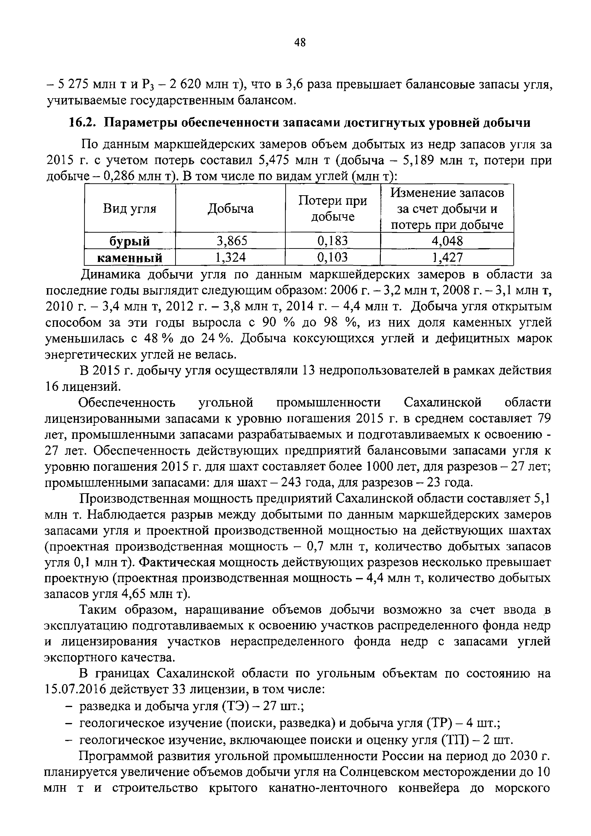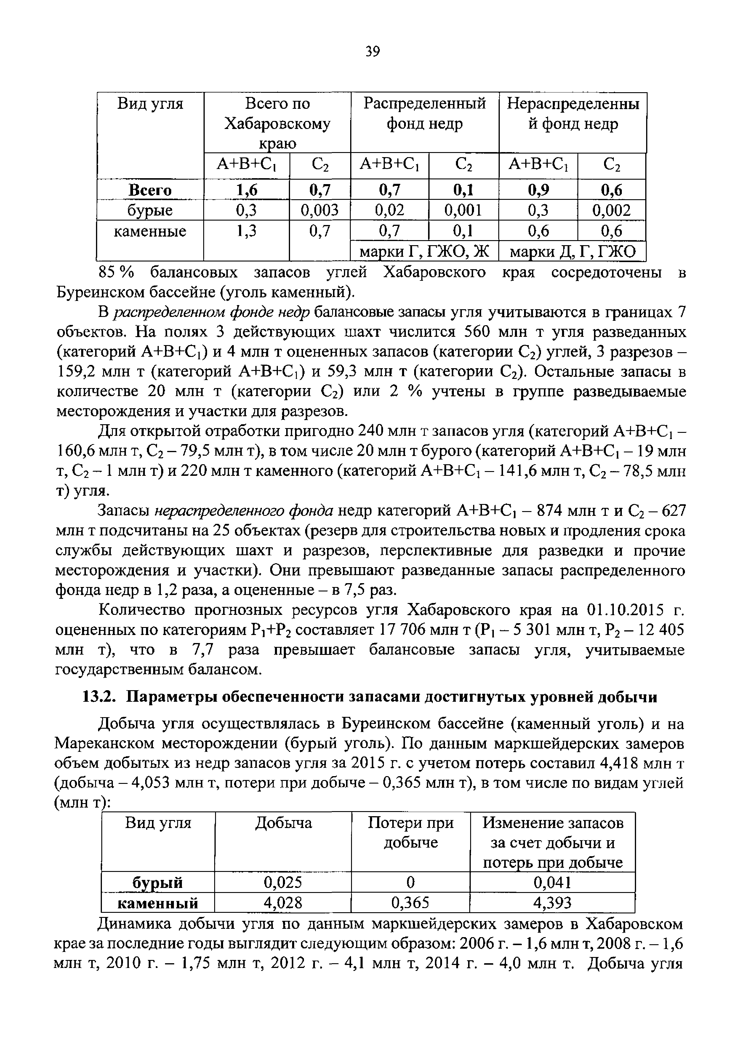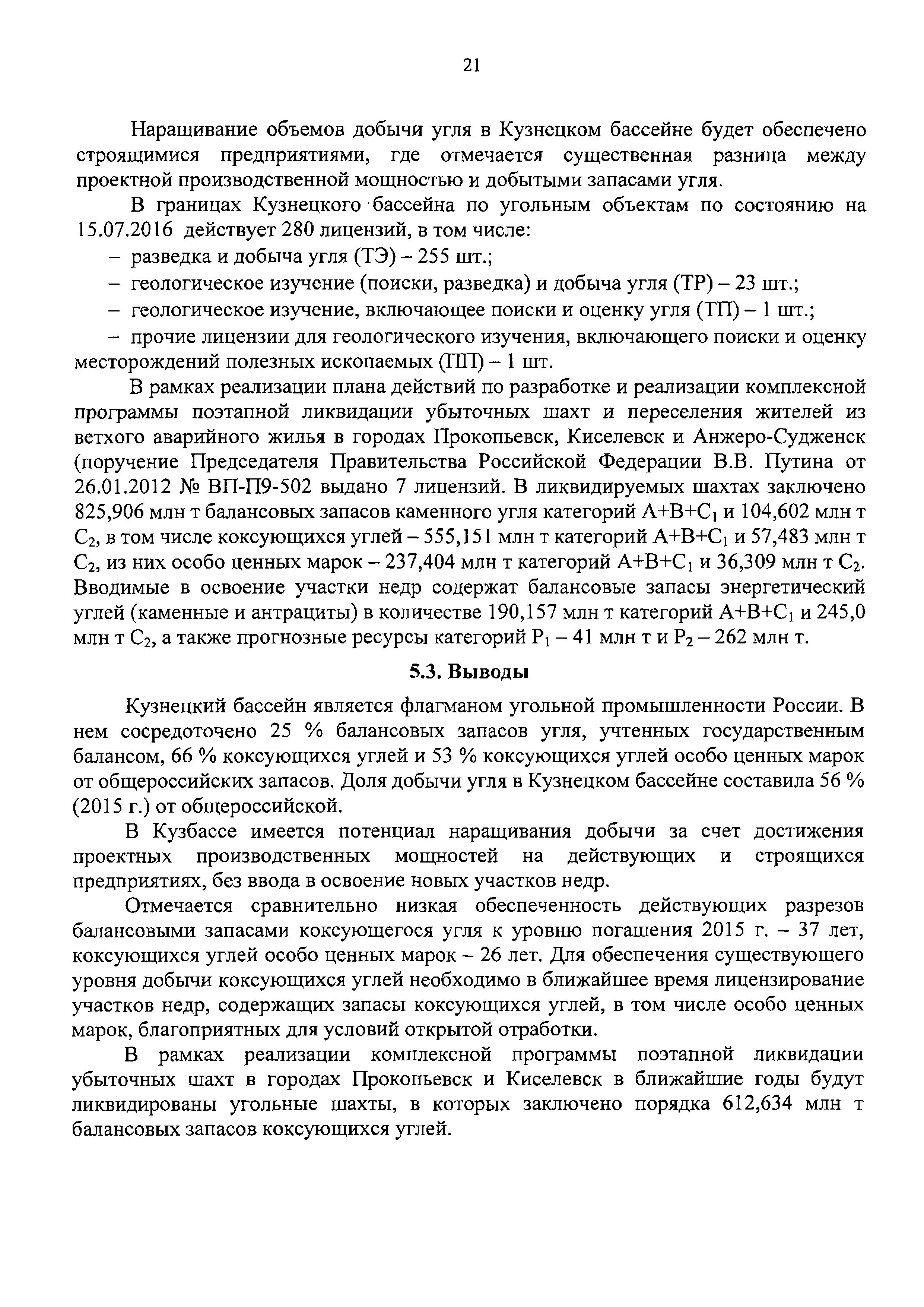 | Оглавление: | Введение 1. Основные направления реализации программы развития угольной промышленности России на период до 2030 г. 2. Состояние сырьевой базы углей Российской Федерации 3. Состояние сырьевой базы углей Восточного Донбасса, Ростовская область (Южный федеральный округ) 4. Состояние сырьевой базы углей Печорского бассейна, Республика Коми и Ненецкий автономный округ (Северо-Западный федеральный округ) 5. Состояние сырьевой базы углей Кузнецкого бассейна, Кемеровская область (Сибирский федеральный округ) 6. Состояние сырьевой базы углей Улугхемского и Республики Тыва (Сибирский Федеральный округ) 7. Состояние сырьевой базы углей Минусинского бассейна, Республика Хакасия (Сибирский федеральный округ) 8. Состояние сырьевой базы углей Забайкальского края (Сибирский федеральный округ) 9. Состояние сырьевой базы углей Республики Саха (Якутия) (Дальневосточный федеральный округ) 10. Состояние сырьевой базы углей Чукотского автономного округа (Дальневосточный федеральный округ) 11. Состояние сырьевой базы углей Камчатского края (Дальневосточный федеральный округ) 12. Состояние сырьевой базы углей Магаданской области (Дальневосточный федеральный округ) 13. Состояние сырьевой базы углей Хабаровского края (Дальневосточный федеральный округ) 14. Состояние сырьевой базы углей Амурской области (Дальневосточный федеральный округ) 15. Состояние сырьевой базы углей Приморского края (Дальневосточный федеральный округ) 16. Состояние сырьевой базы углей Сахалинской области (Дальневосточный федеральный округ) 17. Ожидаемые результаты выполнения программы Приложение 1. Оценка баланса производства и потребления коксующихся углей Приложение 2. Перечень участков нераспределенного фонда недр, содержащих угли особо ценных коксующихся марок К, КЖ, ОС, КЖ, и дефицитных энергетических марок СС, Т для условий открытой отработки по состоянию на 10.11.2016 г. (млн т) |