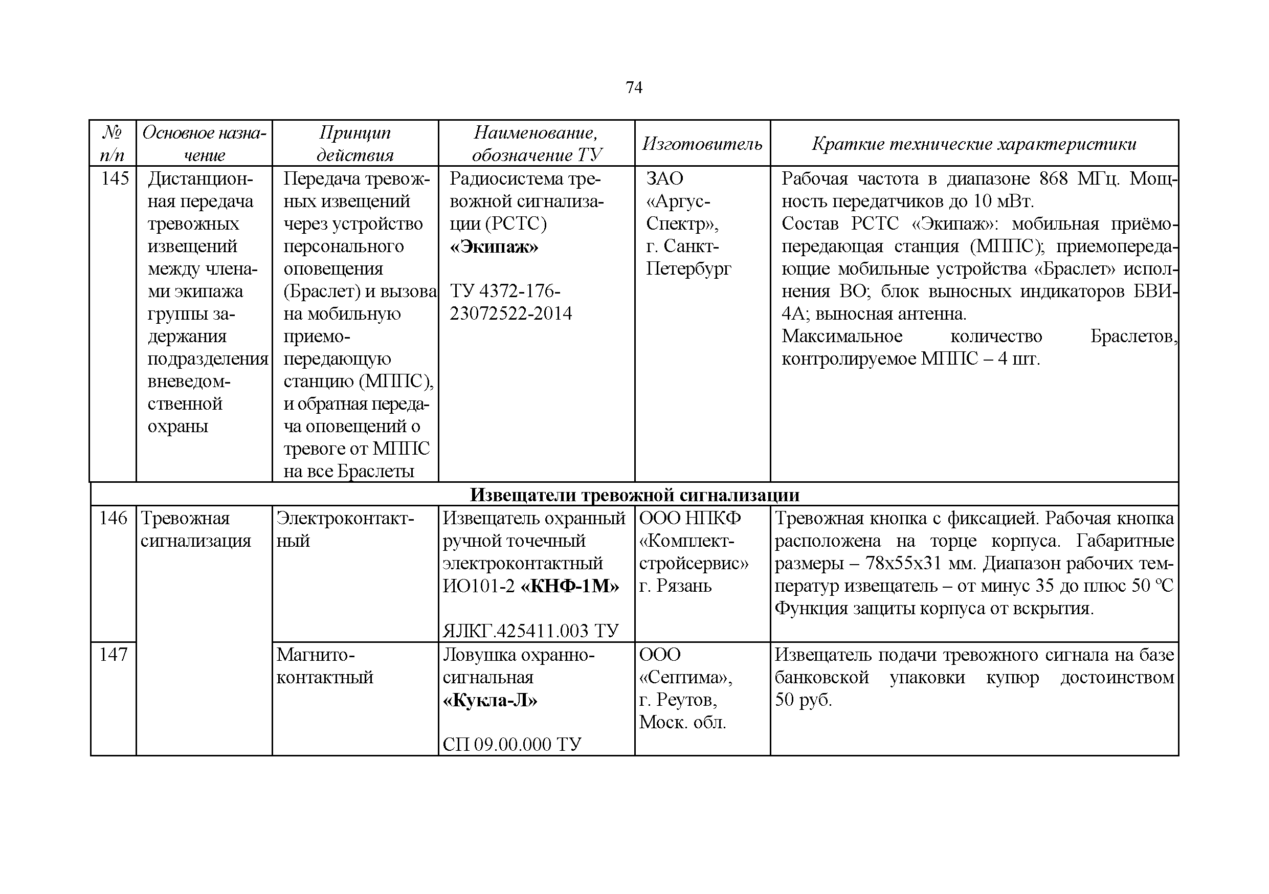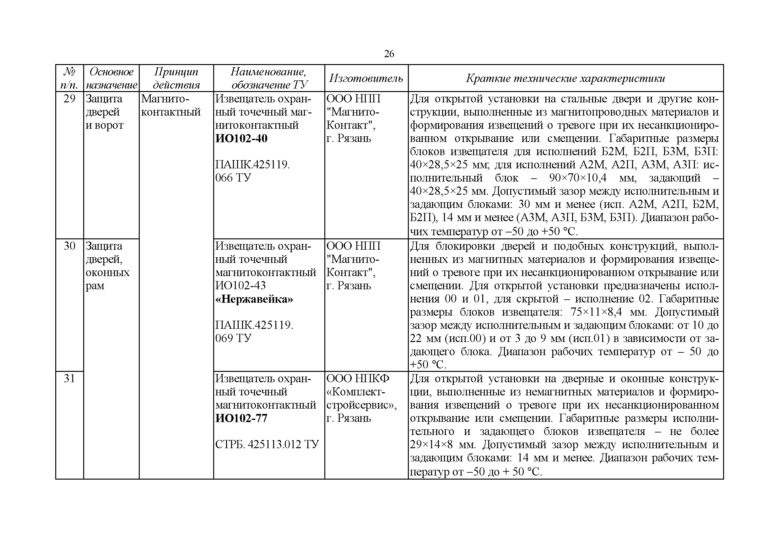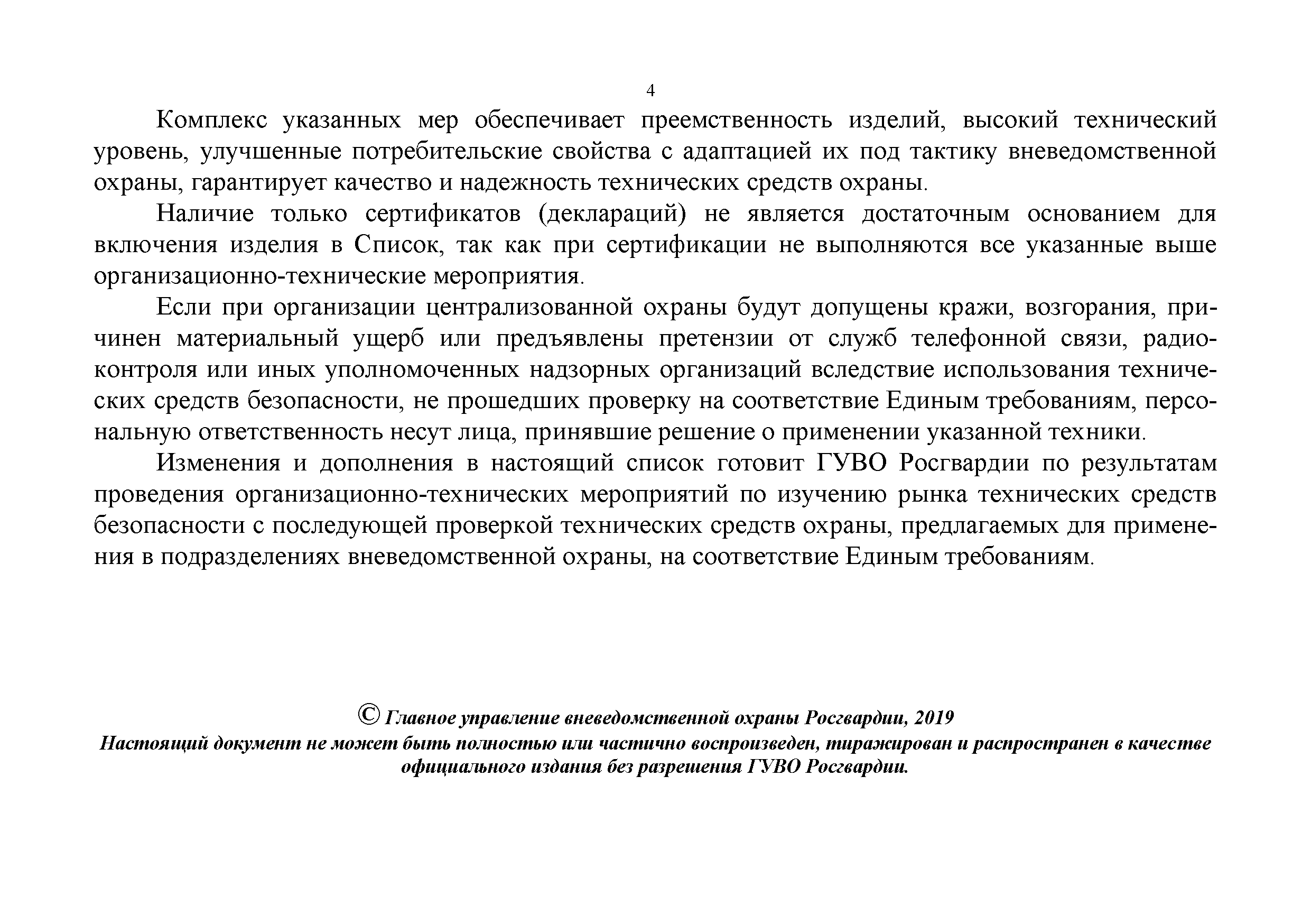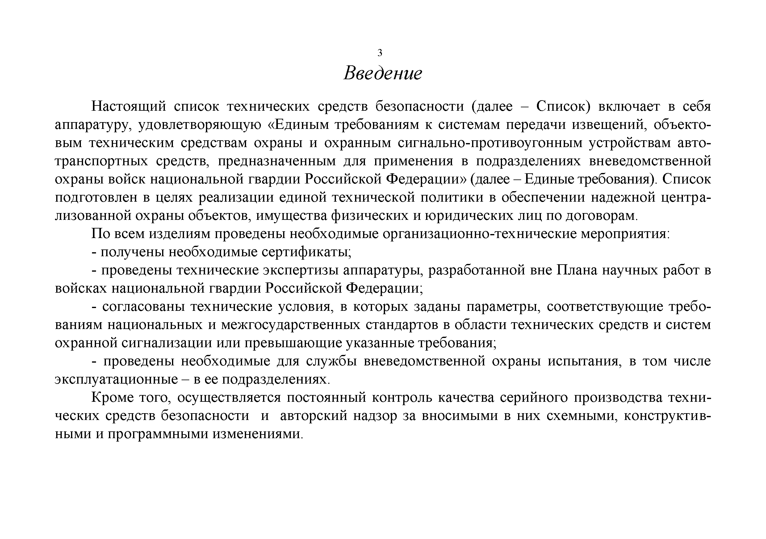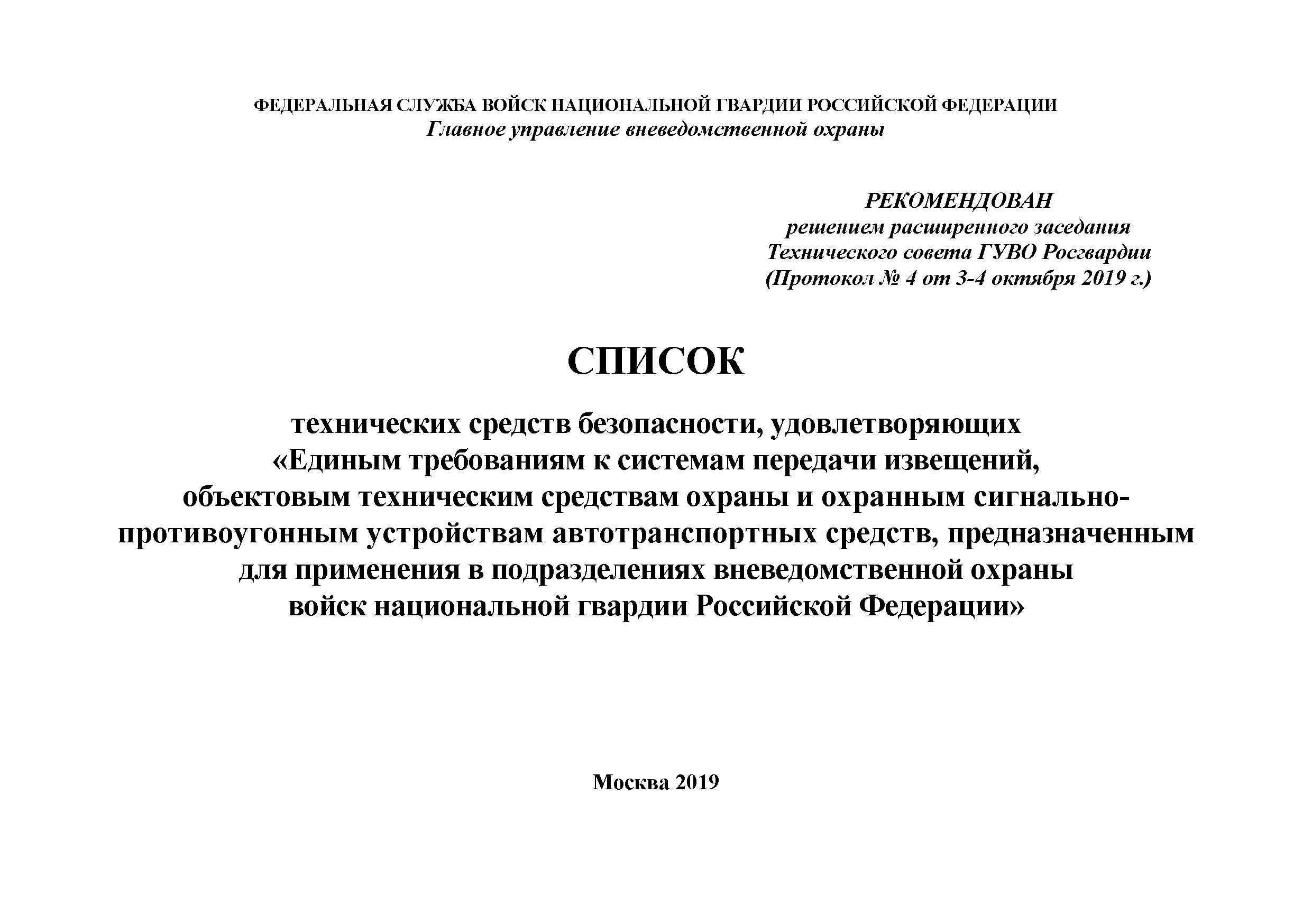 Список технических средств безопасности, удовлетворяющих "Единым требованиям к системам передачи извещений, объектовым техническим средствам охраны и охранным сигнально-противоугонным устройствам автотранспортных средств, предназначенным для применения в подразделениях вневедомственной охраны войск национальной гвардии Российской Федерации"| Статус: | не действует | | Название рус.: | Список технических средств безопасности, удовлетворяющих "Единым требованиям к системам передачи извещений, объектовым техническим средствам охраны и охранным сигнально-противоугонным устройствам автотранспортных средств, предназначенным для применения в подразделениях вневедомственной охраны войск национальной гвардии Российской Федерации" | | Дата добавления в базу: | 01.01.2021 | | Дата актуализации: | 01.01.2021 | | Область применения: | Список включает в себя аппаратуру, удовлетворяющую "Единым требованиям к системам передачи извещений, объектовым техническим средствам охраны и охранным сигнально-противоугонным устройствам автотранспортных средств, предназначенным для применения в подразделениях вневедомственной охраны войск национальной гвардии Российской Федерации". Список подготовлен в целях реализации единой технической политики в обеспечении надежной централизованной охраны объектов, квартир и других мест хранения личного имущества граждан. | | Оглавление: | Введение 1 Средства централизованного наблюдения 2 Средства обнаружения 2.1. Извещатели для помещений 2.2. Извещатели для открытых площадок 3 Объектовые средства 3.1. Интегрированные системы безопасности (комплексы технических средств безопасности, комбинированные системы безопасности) 3.2. Источники электропитания 3.3. Средства тревожной сигнализации 3.4. Средства беспроводной охранной сигнализации 3.5. Охранные сигнально-противоугонные устройства автотранспортных средств | | Разработан: | ФКУ НИЦ Охрана Росгвардии