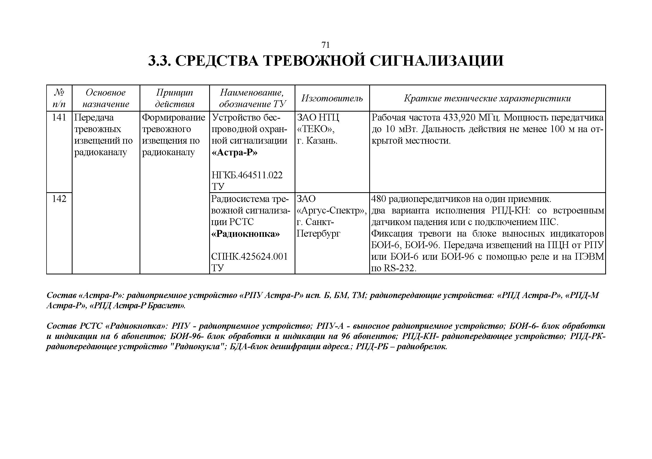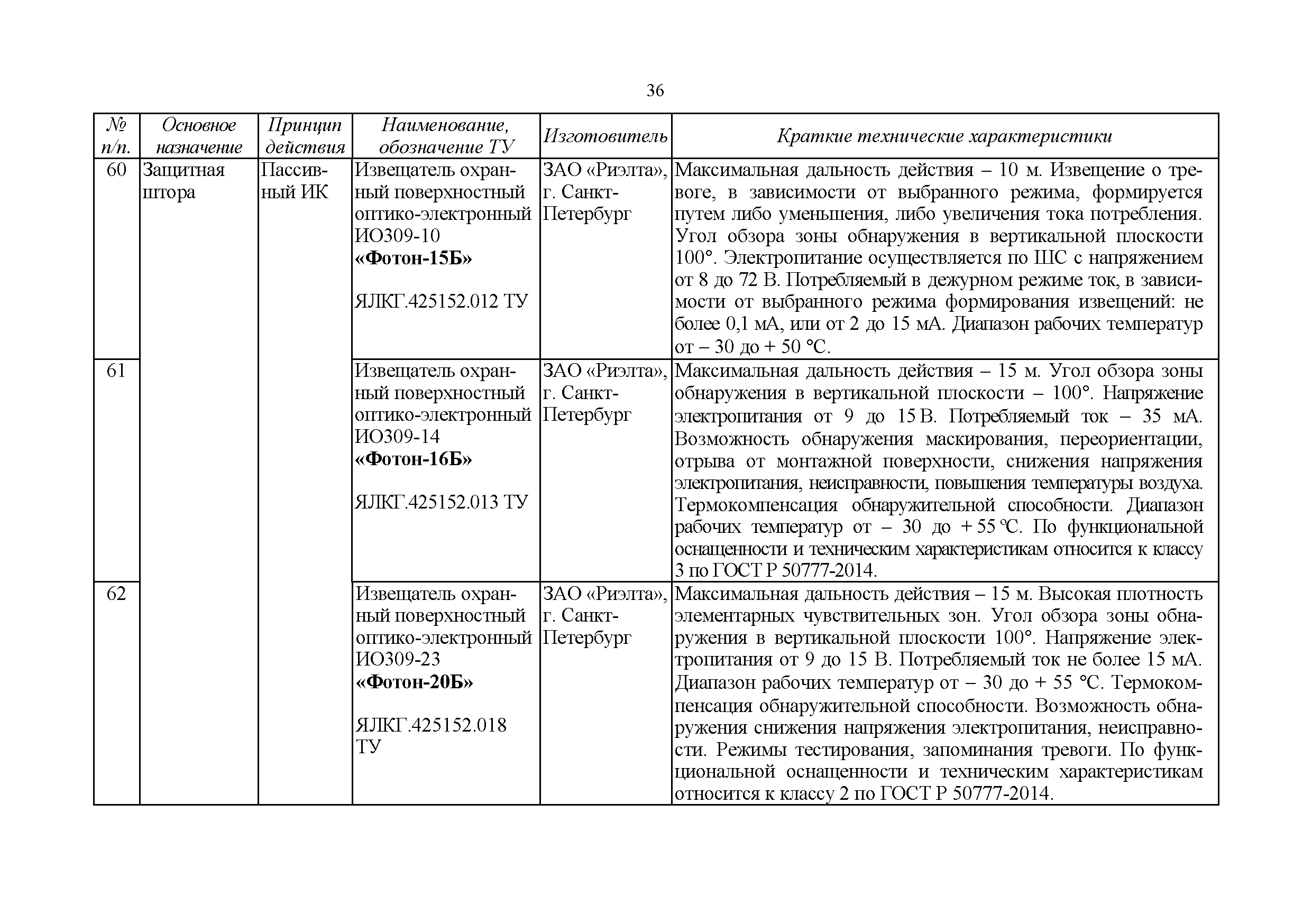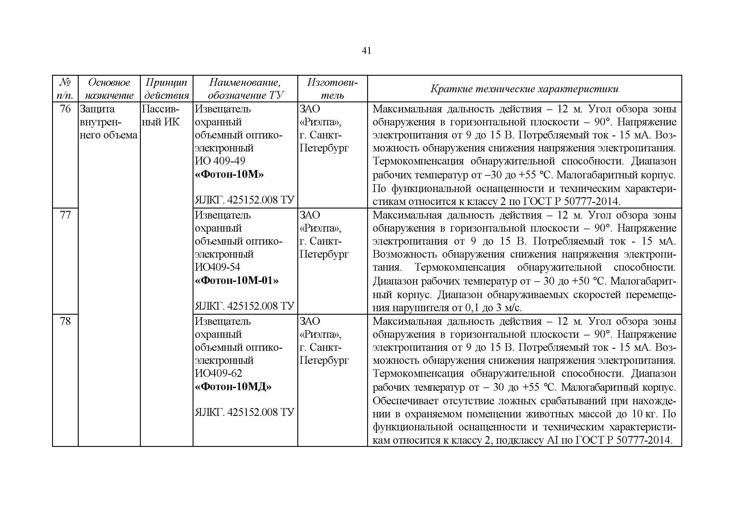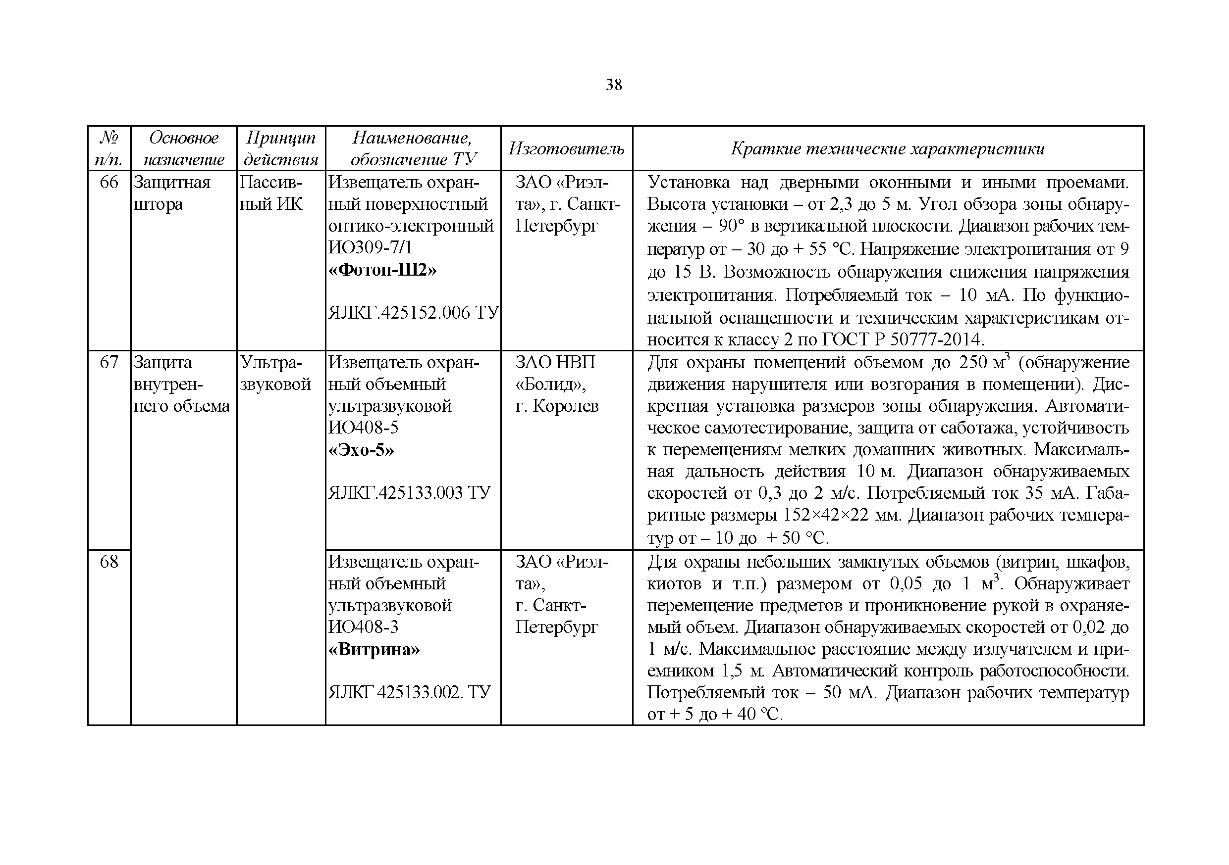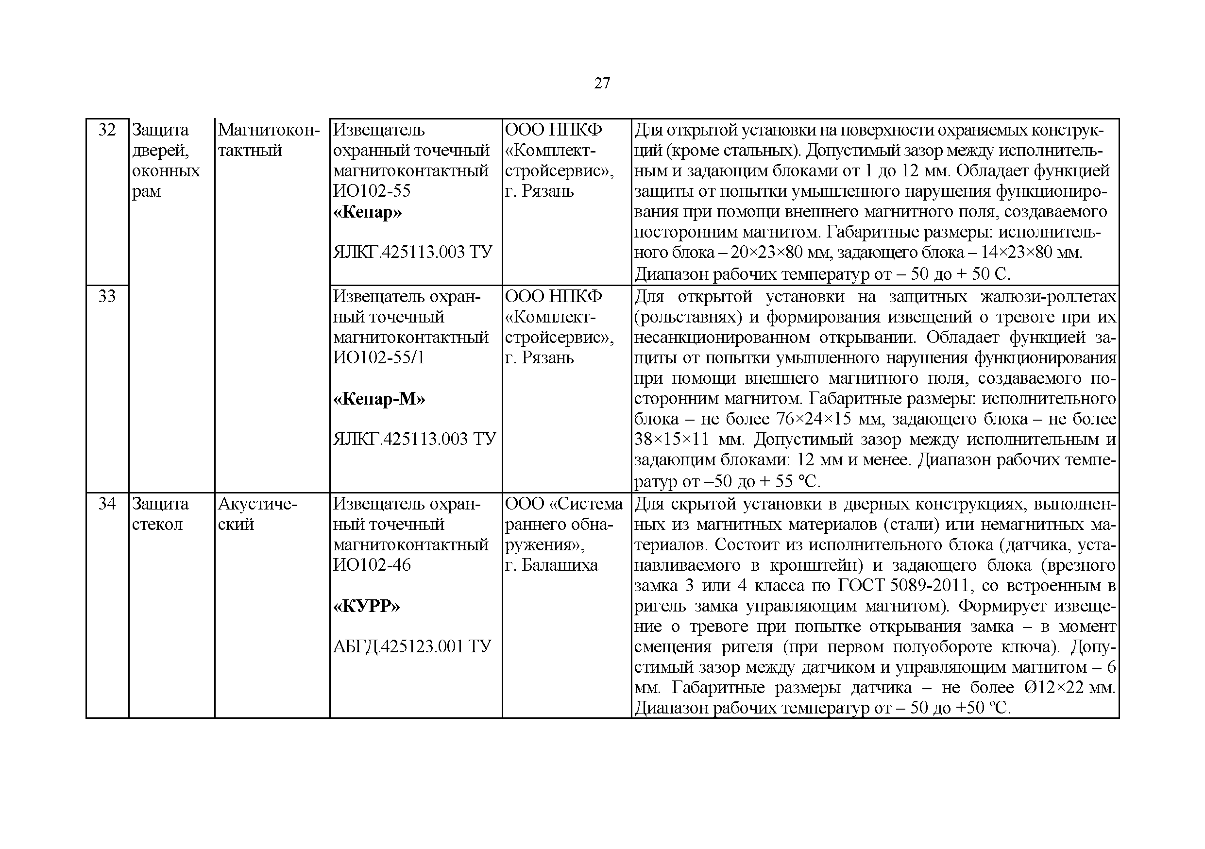 Список технических средств безопасности, удовлетворяющих "Единым требованиям к системам передачи извещений, объектовым техническим средствам охраны и охранным сигнально-противоугонным устройствам автотранспортных средств, предназначенным для применения в подразделениях вневедомственной охраны войск национальной гвардии Российской Федерации"| Статус: | не действует | | Название рус.: | Список технических средств безопасности, удовлетворяющих "Единым требованиям к системам передачи извещений, объектовым техническим средствам охраны и охранным сигнально-противоугонным устройствам автотранспортных средств, предназначенным для применения в подразделениях вневедомственной охраны войск национальной гвардии Российской Федерации" | | Дата добавления в базу: | 01.01.2021 | | Дата актуализации: | 01.01.2021 | | Область применения: | Список включает в себя аппаратуру, удовлетворяющую "Единым требованиям к системам передачи извещений, объектовым техническим средствам охраны и охранным сигнально-противоугонным устройствам автотранспортных средств, предназначенным для применения в подразделениях вневедомственной охраны войск национальной гвардии Российской Федерации". Список подготовлен в целях реализации единой технической политики в обеспечении надежной централизованной охраны объектов, квартир и других мест хранения личного имущества граждан. | | Оглавление: | Введение 1 Средства централизованного наблюдения 2 Средства обнаружения 2.1. Извещатели для помещений 2.2. Извещатели для открытых площадок 3 Объектовые средства 3.1. Интегрированные системы безопасности (комплексы технических средств безопасности, комбинированные системы безопасности) 3.2. Источники электропитания 3.3. Средства тревожной сигнализации 3.4. Средства беспроводной охранной сигнализации 3.5. Охранные сигнально-противоугонные устройства автотранспортных средств | | Разработан: | ФКУ НИЦ Охрана Росгвардии