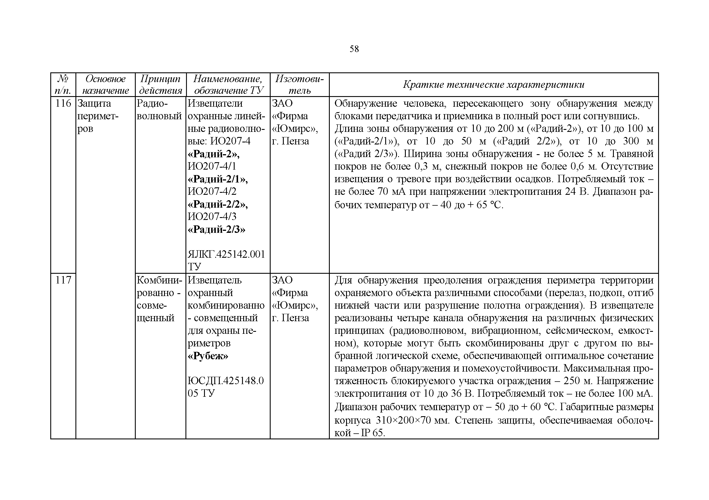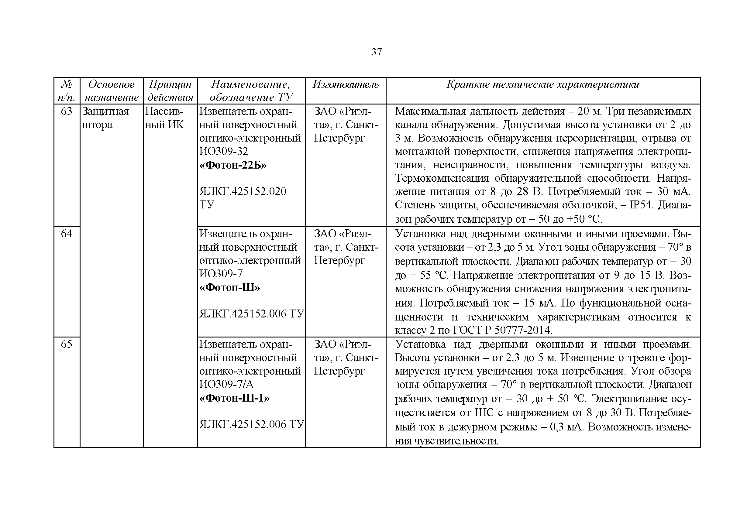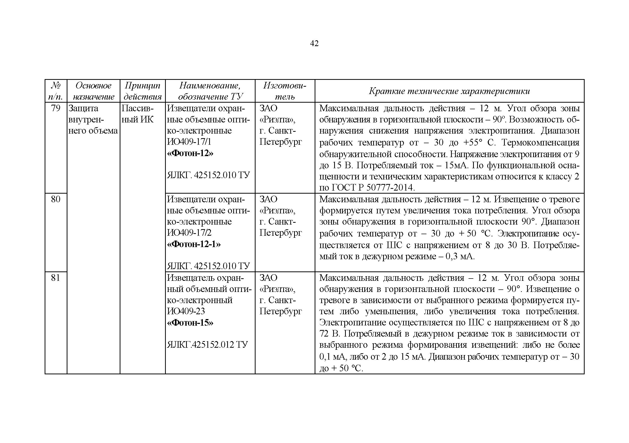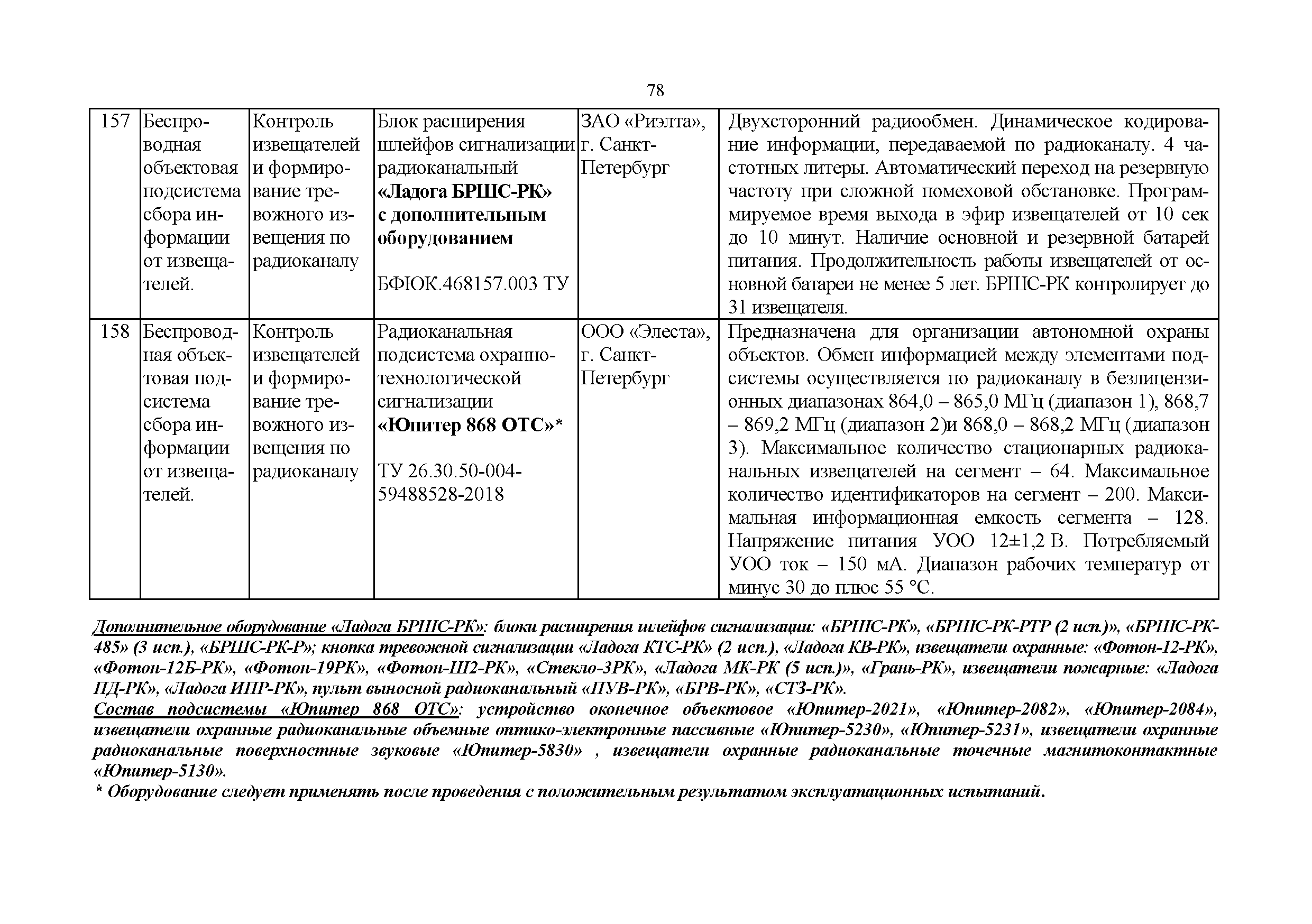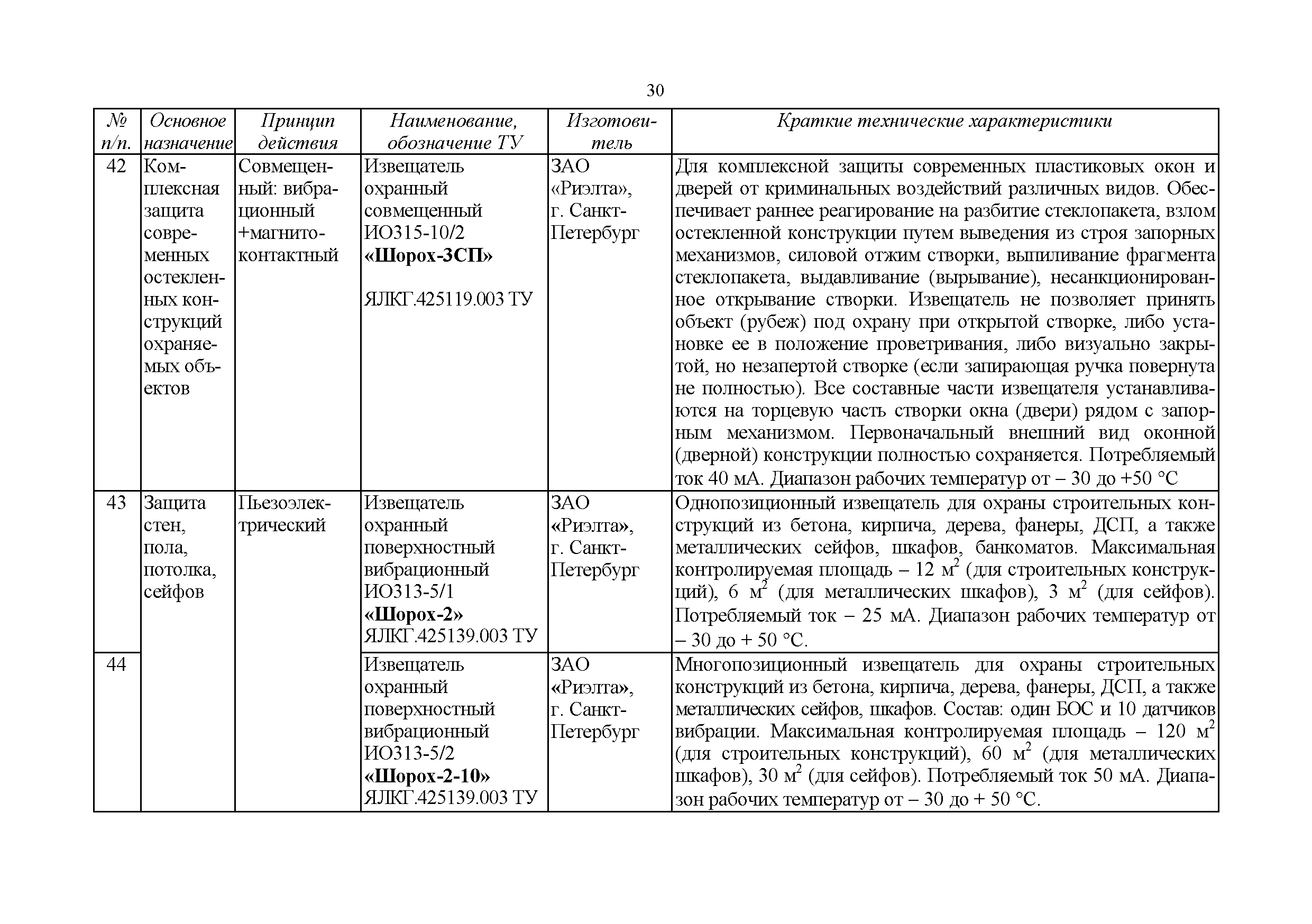Список технических средств безопасности, удовлетворяющих "Единым требованиям к системам передачи извещений, объектовым техническим средствам охраны и охранным сигнально-противоугонным устройствам автотранспортных средств, предназначенным для применения в подразделениях вневедомственной охраны войск национальной гвардии Российской Федерации"| Статус: | не действует | | Название рус.: | Список технических средств безопасности, удовлетворяющих "Единым требованиям к системам передачи извещений, объектовым техническим средствам охраны и охранным сигнально-противоугонным устройствам автотранспортных средств, предназначенным для применения в подразделениях вневедомственной охраны войск национальной гвардии Российской Федерации" | | Дата добавления в базу: | 01.01.2021 | | Дата актуализации: | 01.01.2021 | | Область применения: | Список включает в себя аппаратуру, удовлетворяющую "Единым требованиям к системам передачи извещений, объектовым техническим средствам охраны и охранным сигнально-противоугонным устройствам автотранспортных средств, предназначенным для применения в подразделениях вневедомственной охраны войск национальной гвардии Российской Федерации". Список подготовлен в целях реализации единой технической политики в обеспечении надежной централизованной охраны объектов, квартир и других мест хранения личного имущества граждан. | | Оглавление: | Введение 1 Средства централизованного наблюдения 2 Средства обнаружения 2.1. Извещатели для помещений 2.2. Извещатели для открытых площадок 3 Объектовые средства 3.1. Интегрированные системы безопасности (комплексы технических средств безопасности, комбинированные системы безопасности) 3.2. Источники электропитания 3.3. Средства тревожной сигнализации 3.4. Средства беспроводной охранной сигнализации 3.5. Охранные сигнально-противоугонные устройства автотранспортных средств | | Разработан: | ФКУ НИЦ Охрана Росгвардии