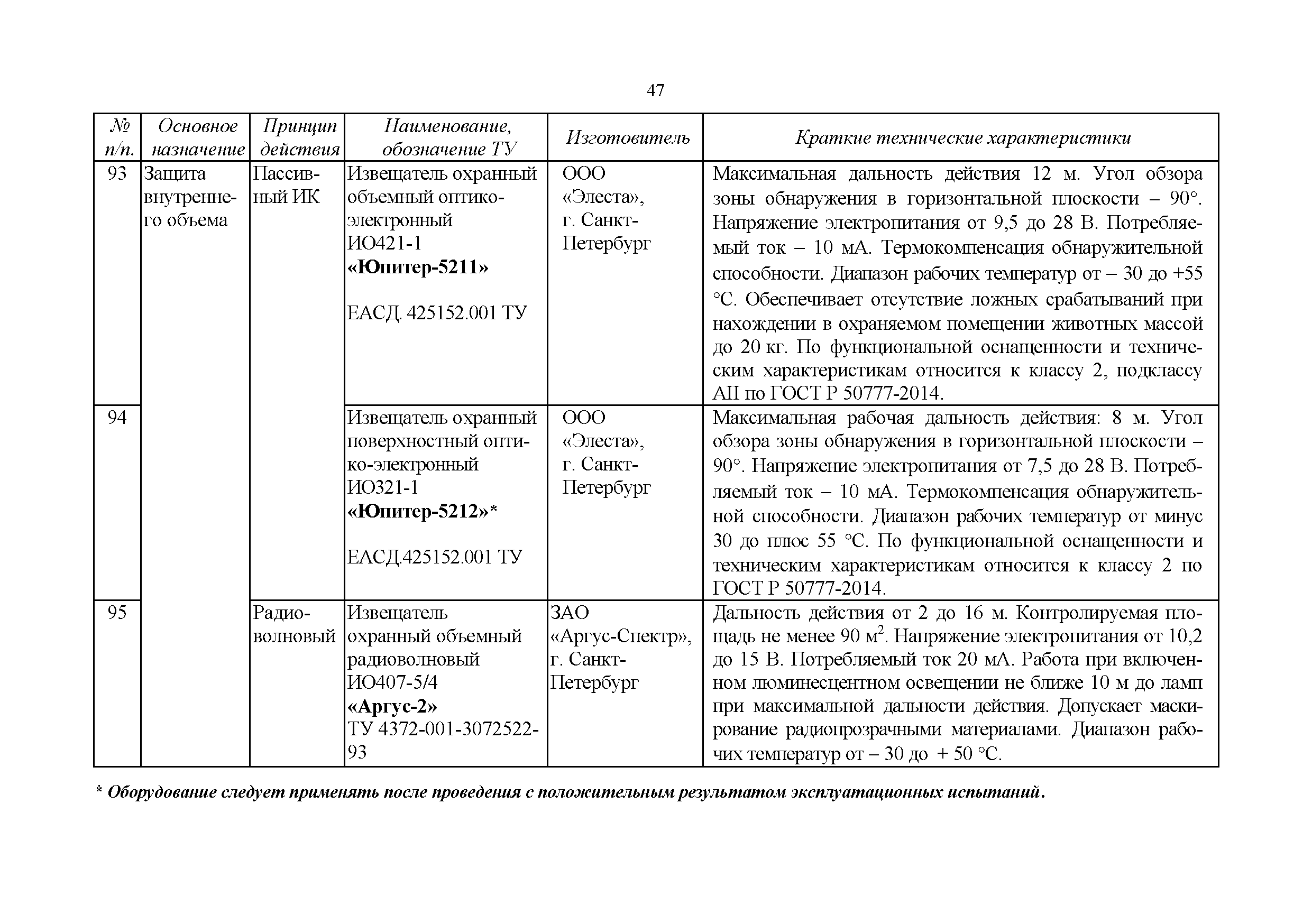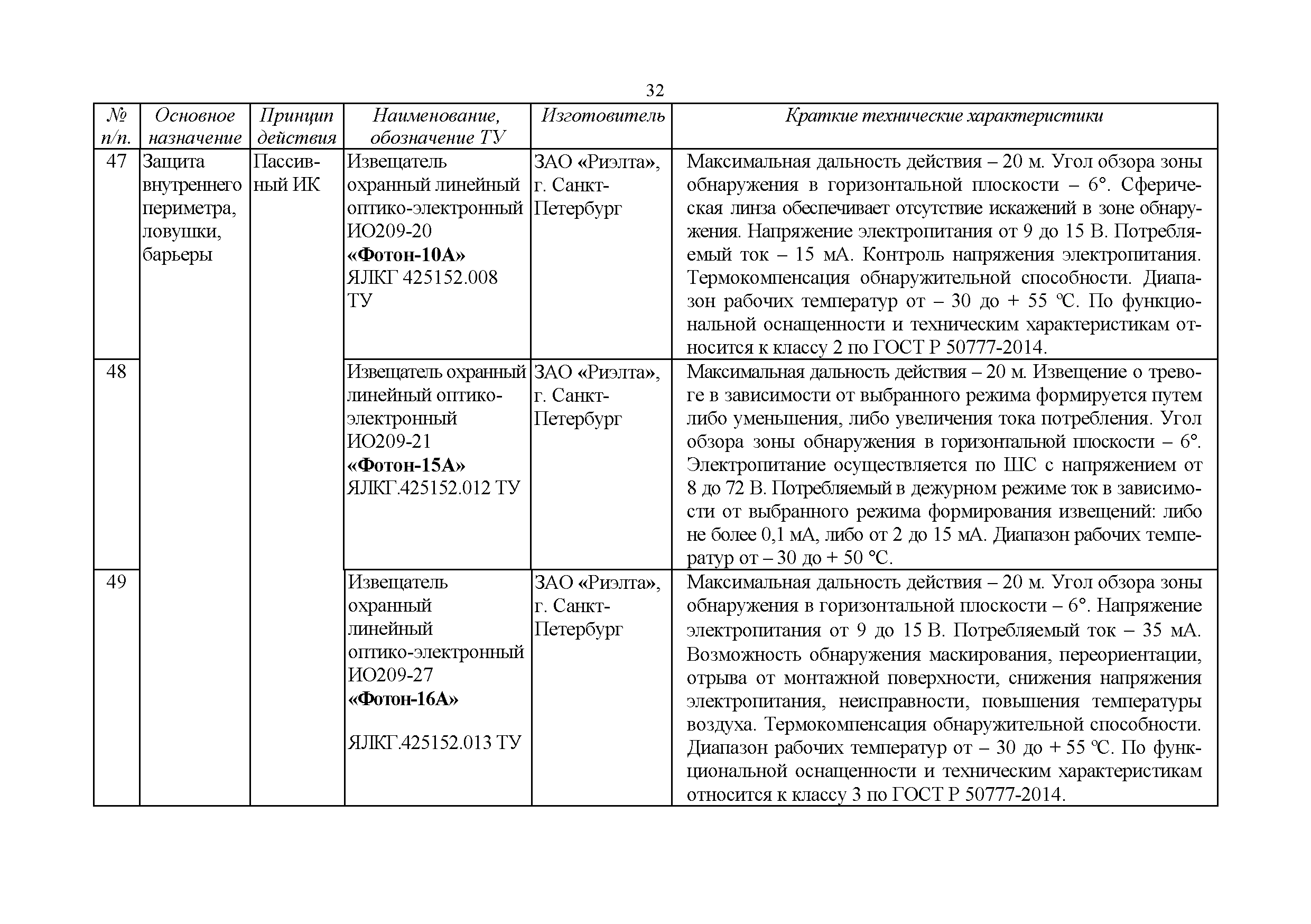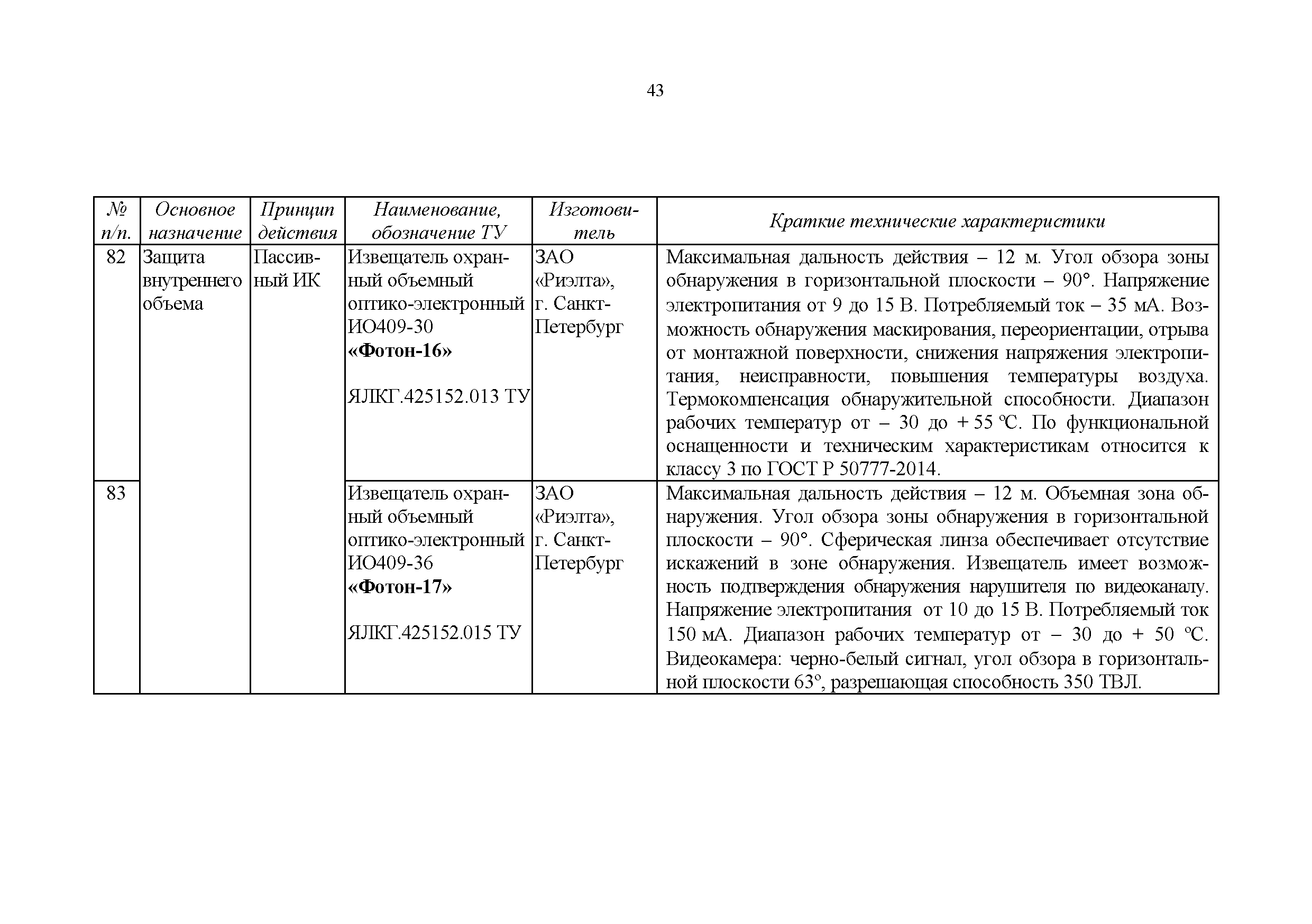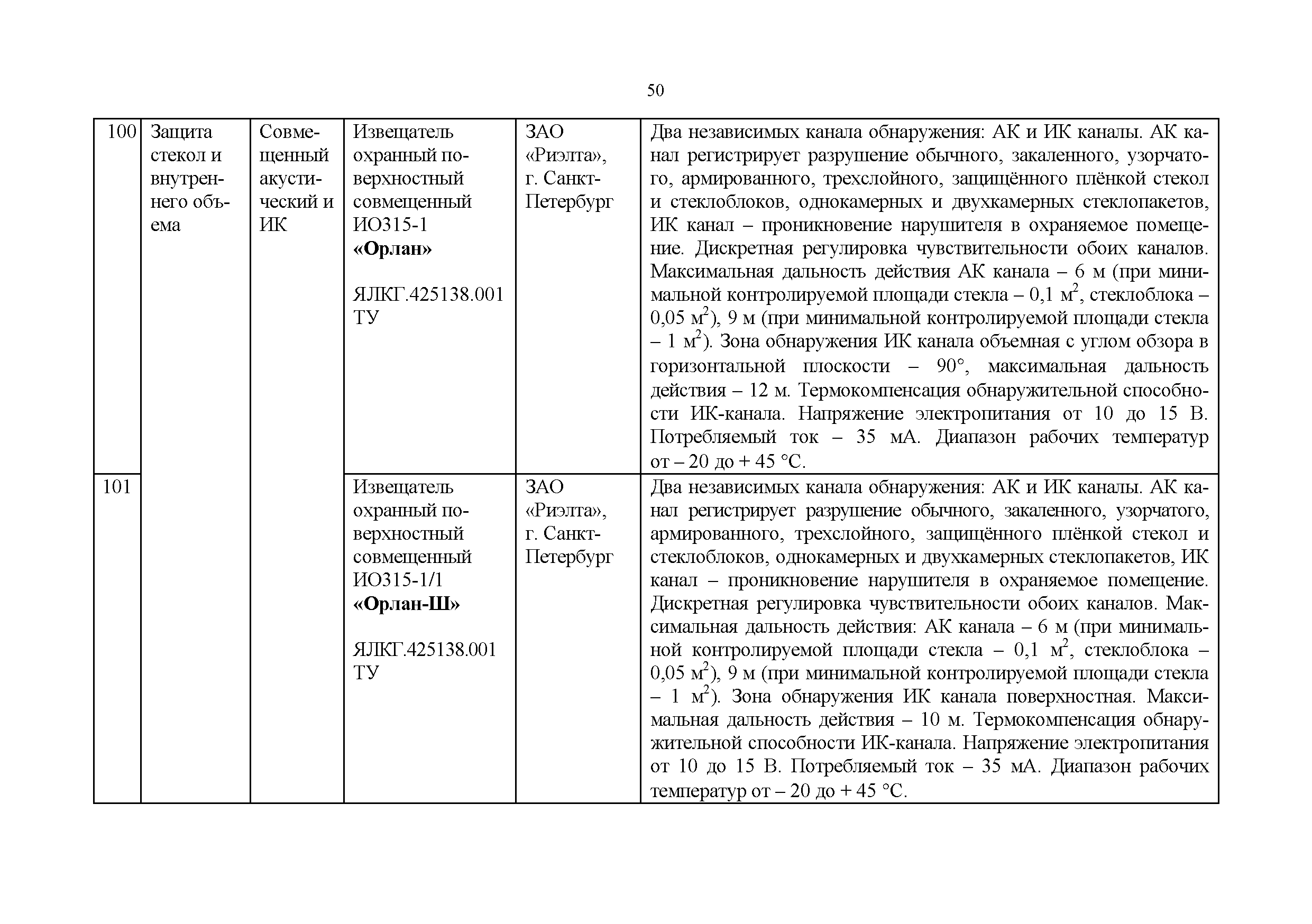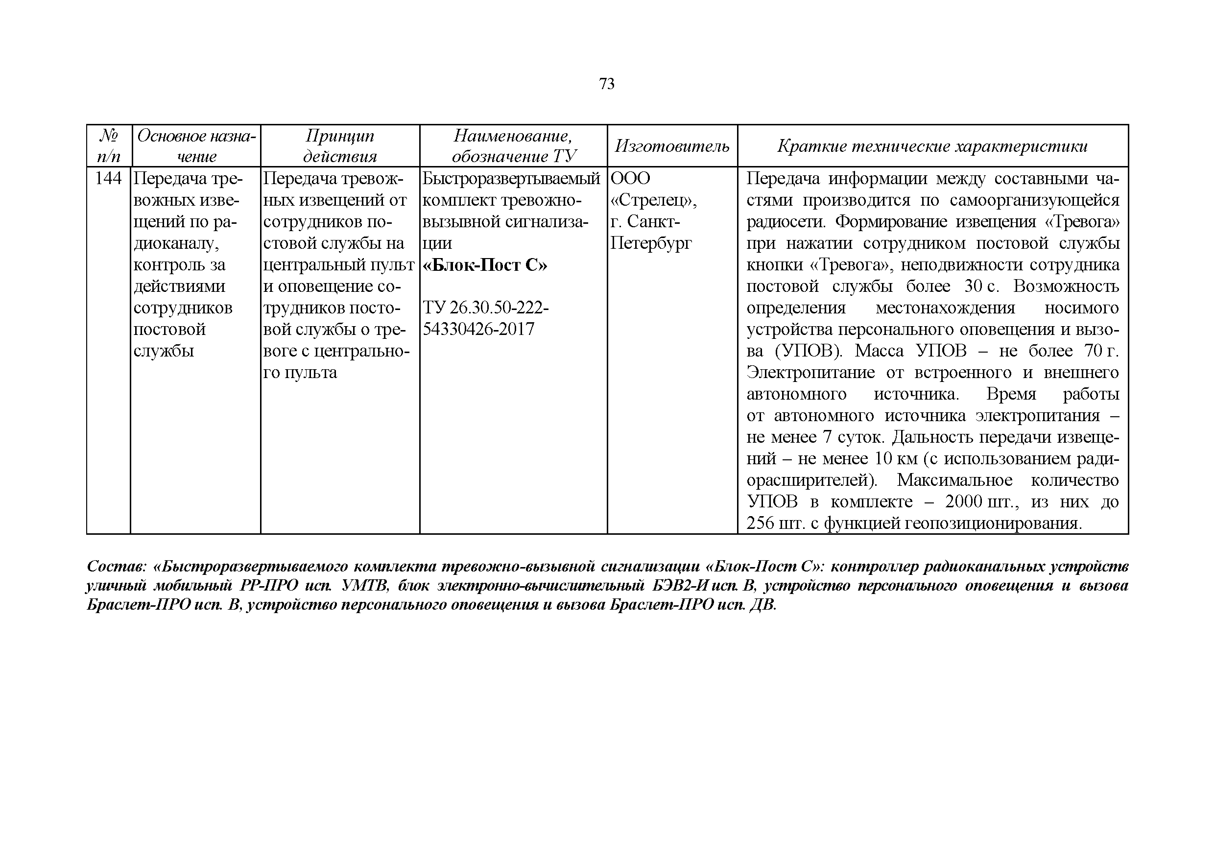 Список технических средств безопасности, удовлетворяющих "Единым требованиям к системам передачи извещений, объектовым техническим средствам охраны и охранным сигнально-противоугонным устройствам автотранспортных средств, предназначенным для применения в подразделениях вневедомственной охраны войск национальной гвардии Российской Федерации"| Статус: | не действует | | Название рус.: | Список технических средств безопасности, удовлетворяющих "Единым требованиям к системам передачи извещений, объектовым техническим средствам охраны и охранным сигнально-противоугонным устройствам автотранспортных средств, предназначенным для применения в подразделениях вневедомственной охраны войск национальной гвардии Российской Федерации" | | Дата добавления в базу: | 01.01.2021 | | Дата актуализации: | 01.01.2021 | | Область применения: | Список включает в себя аппаратуру, удовлетворяющую "Единым требованиям к системам передачи извещений, объектовым техническим средствам охраны и охранным сигнально-противоугонным устройствам автотранспортных средств, предназначенным для применения в подразделениях вневедомственной охраны войск национальной гвардии Российской Федерации". Список подготовлен в целях реализации единой технической политики в обеспечении надежной централизованной охраны объектов, квартир и других мест хранения личного имущества граждан. | | Оглавление: | Введение 1 Средства централизованного наблюдения 2 Средства обнаружения 2.1. Извещатели для помещений 2.2. Извещатели для открытых площадок 3 Объектовые средства 3.1. Интегрированные системы безопасности (комплексы технических средств безопасности, комбинированные системы безопасности) 3.2. Источники электропитания 3.3. Средства тревожной сигнализации 3.4. Средства беспроводной охранной сигнализации 3.5. Охранные сигнально-противоугонные устройства автотранспортных средств | | Разработан: | ФКУ НИЦ Охрана Росгвардии