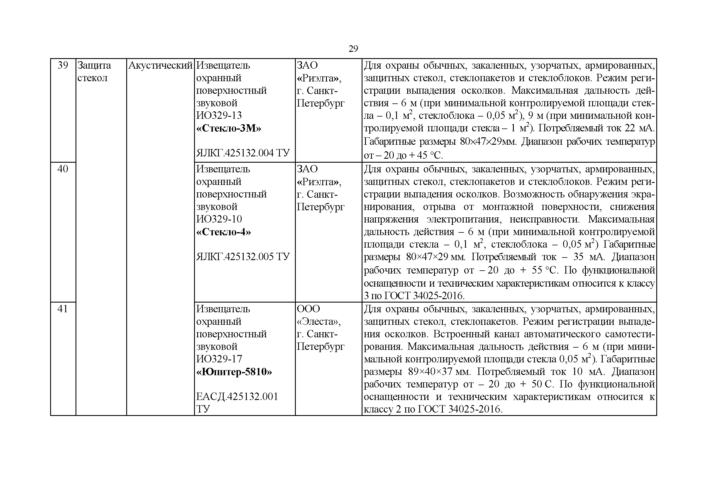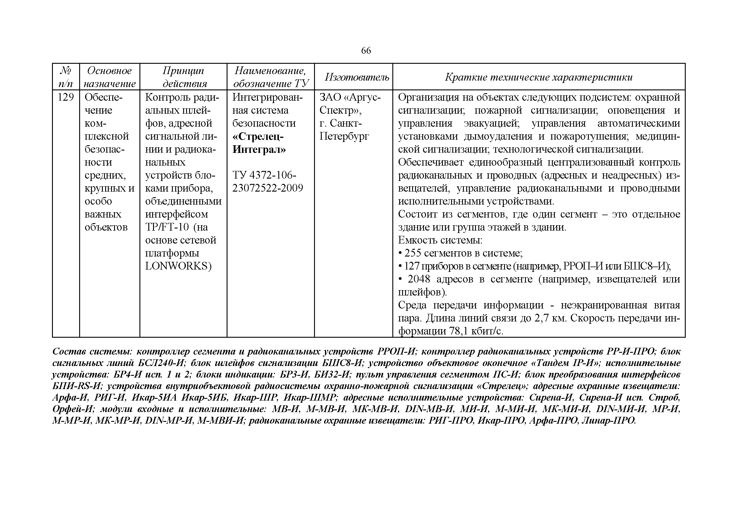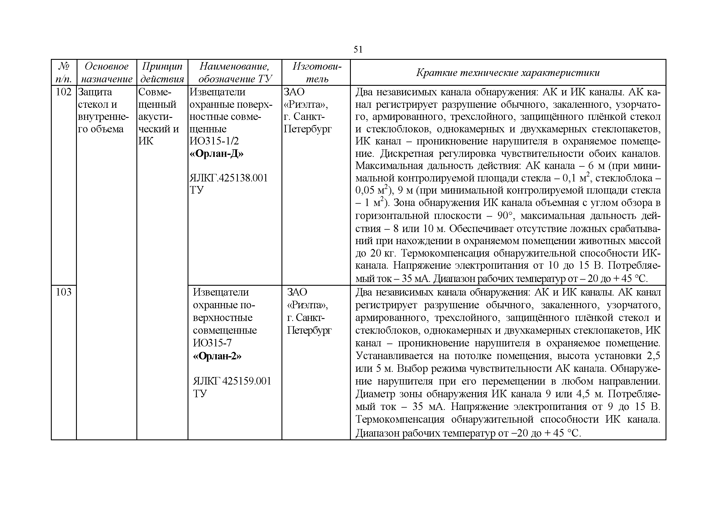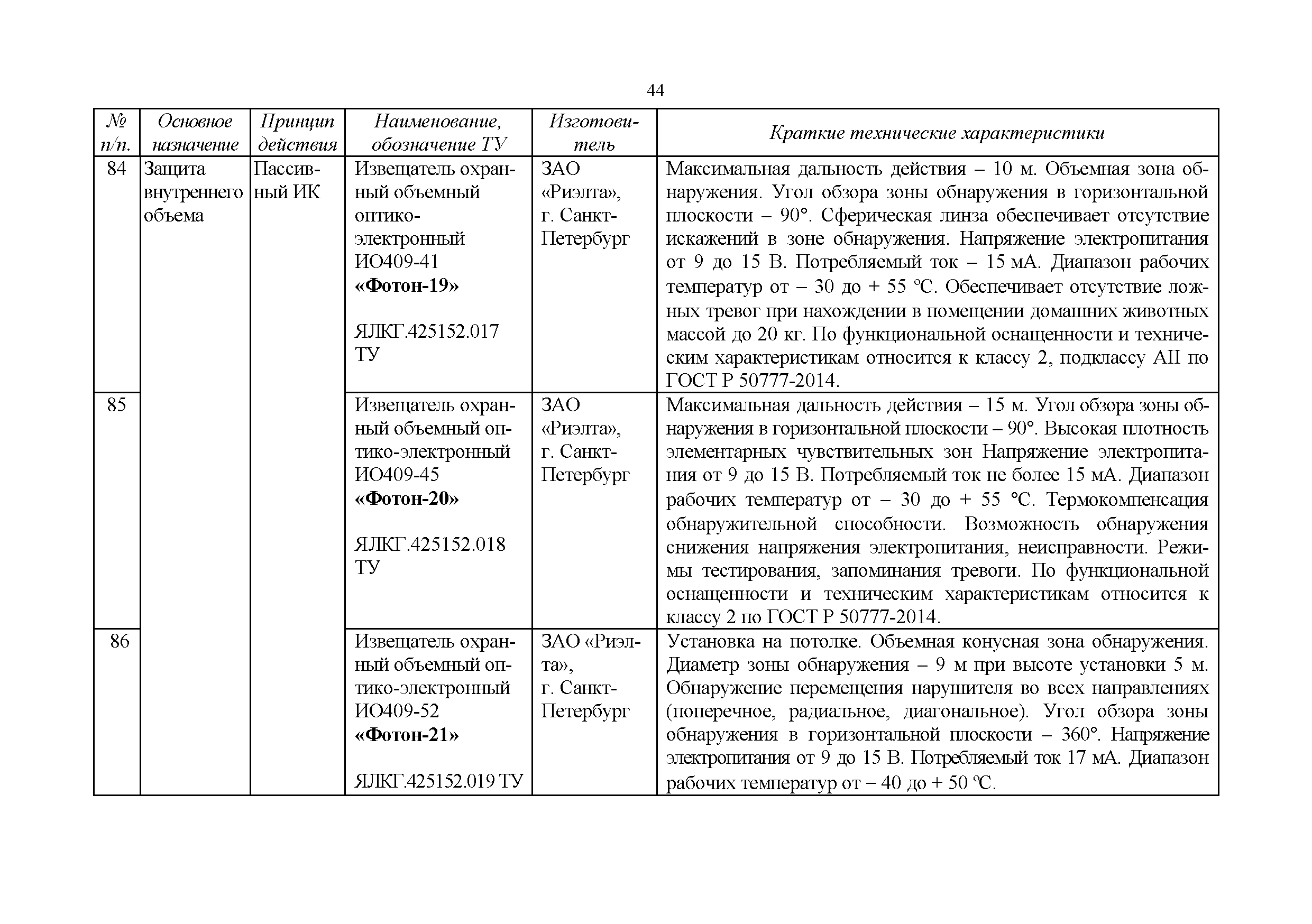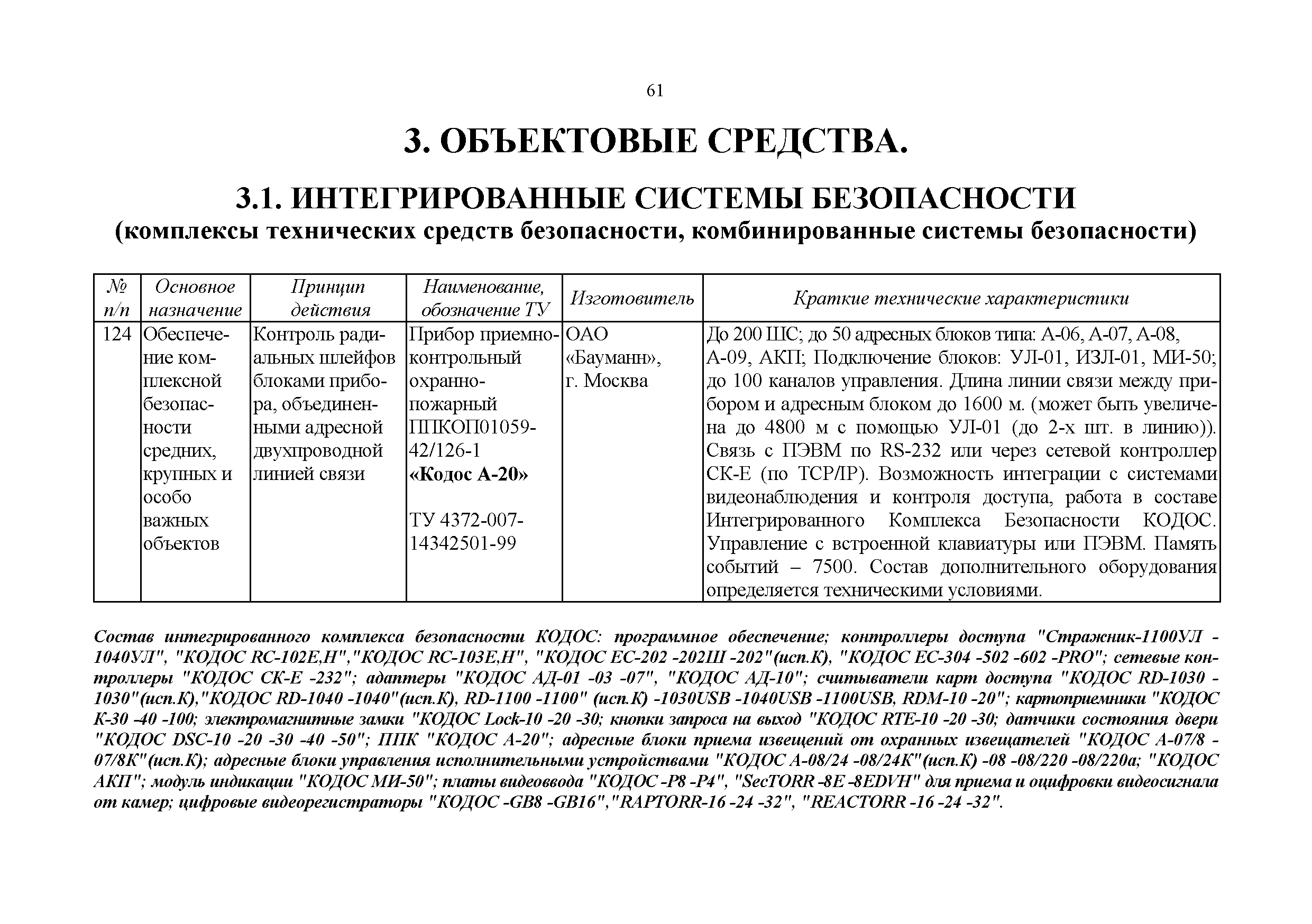 Список технических средств безопасности, удовлетворяющих "Единым требованиям к системам передачи извещений, объектовым техническим средствам охраны и охранным сигнально-противоугонным устройствам автотранспортных средств, предназначенным для применения в подразделениях вневедомственной охраны войск национальной гвардии Российской Федерации"| Статус: | не действует | | Название рус.: | Список технических средств безопасности, удовлетворяющих "Единым требованиям к системам передачи извещений, объектовым техническим средствам охраны и охранным сигнально-противоугонным устройствам автотранспортных средств, предназначенным для применения в подразделениях вневедомственной охраны войск национальной гвардии Российской Федерации" | | Дата добавления в базу: | 01.01.2021 | | Дата актуализации: | 01.01.2021 | | Область применения: | Список включает в себя аппаратуру, удовлетворяющую "Единым требованиям к системам передачи извещений, объектовым техническим средствам охраны и охранным сигнально-противоугонным устройствам автотранспортных средств, предназначенным для применения в подразделениях вневедомственной охраны войск национальной гвардии Российской Федерации". Список подготовлен в целях реализации единой технической политики в обеспечении надежной централизованной охраны объектов, квартир и других мест хранения личного имущества граждан. | | Оглавление: | Введение 1 Средства централизованного наблюдения 2 Средства обнаружения 2.1. Извещатели для помещений 2.2. Извещатели для открытых площадок 3 Объектовые средства 3.1. Интегрированные системы безопасности (комплексы технических средств безопасности, комбинированные системы безопасности) 3.2. Источники электропитания 3.3. Средства тревожной сигнализации 3.4. Средства беспроводной охранной сигнализации 3.5. Охранные сигнально-противоугонные устройства автотранспортных средств | | Разработан: | ФКУ НИЦ Охрана Росгвардии