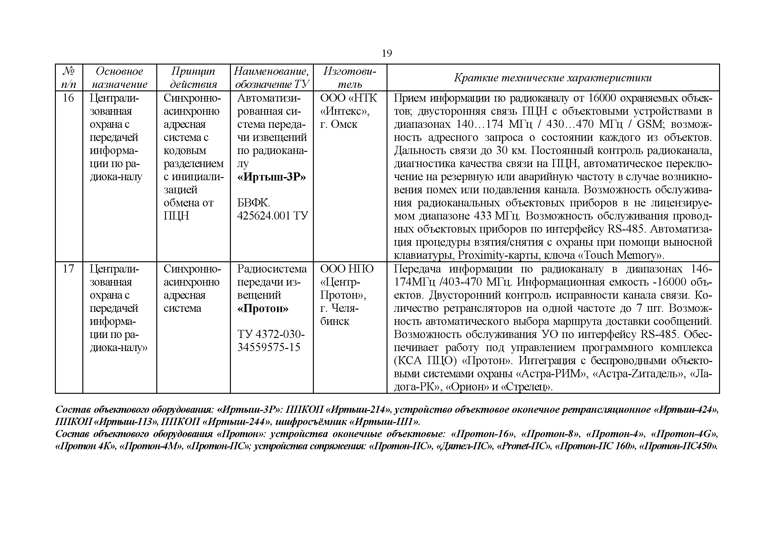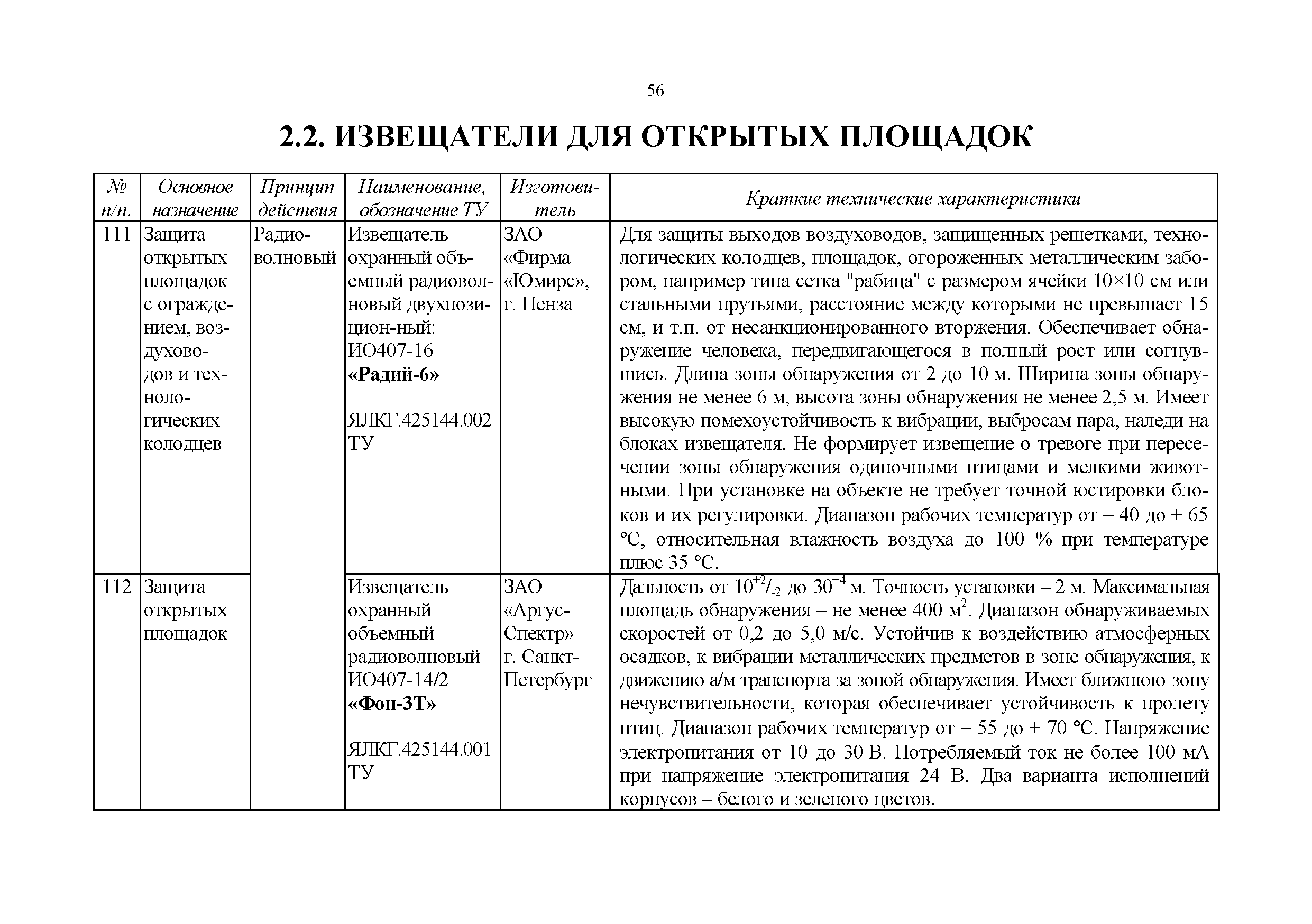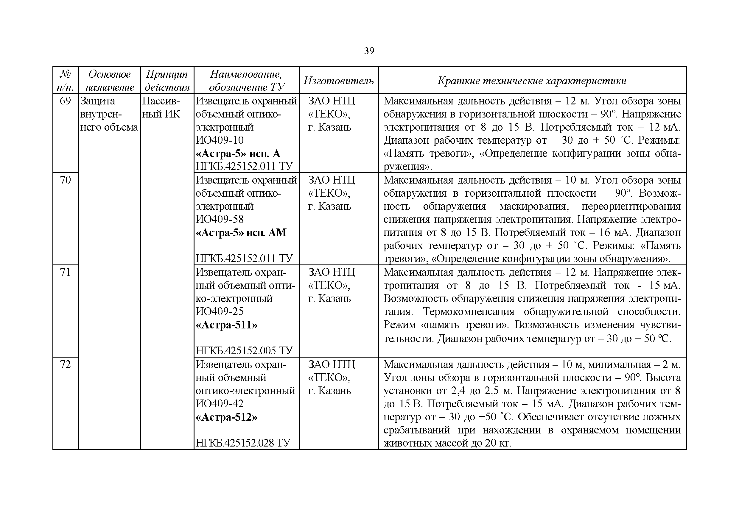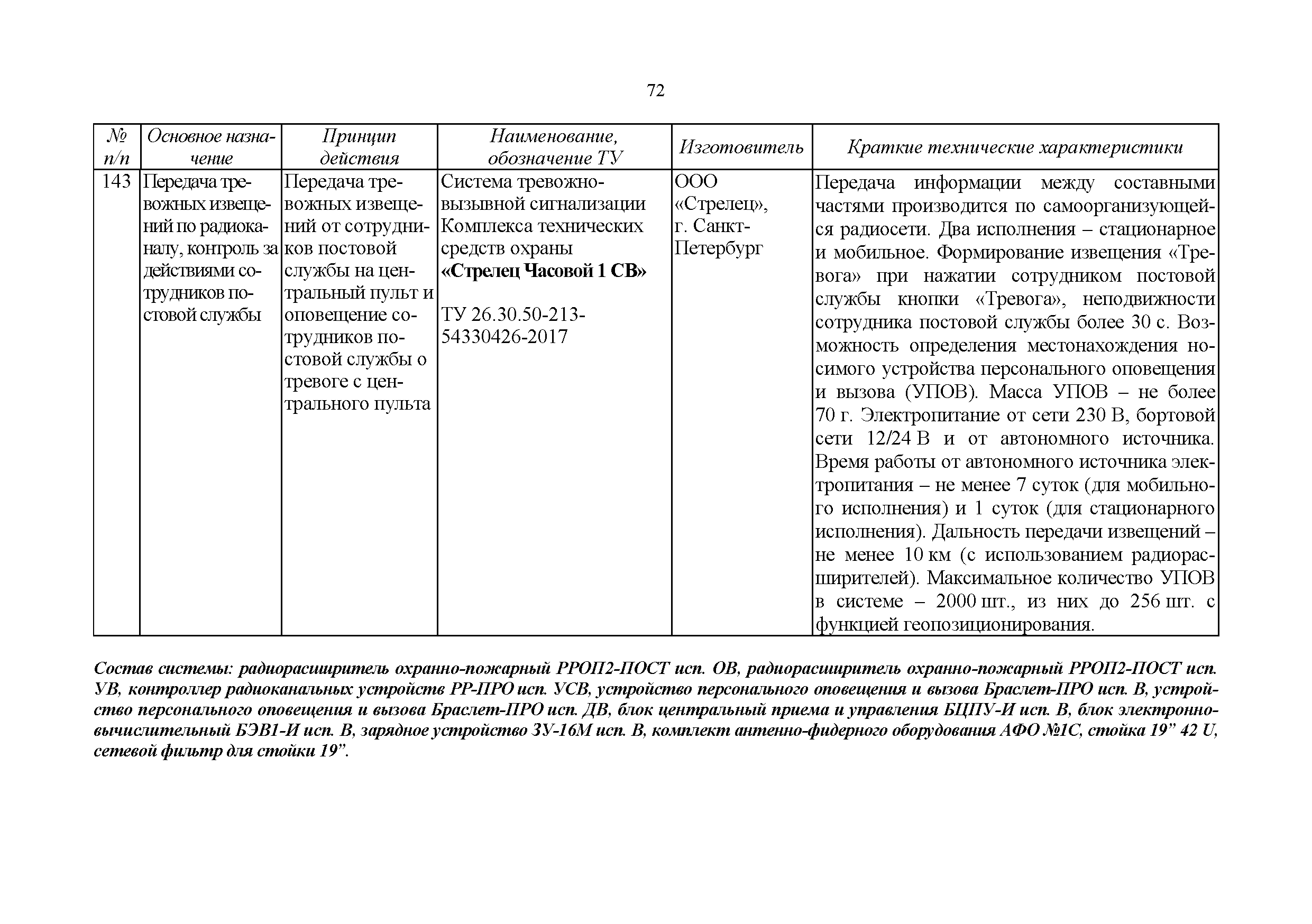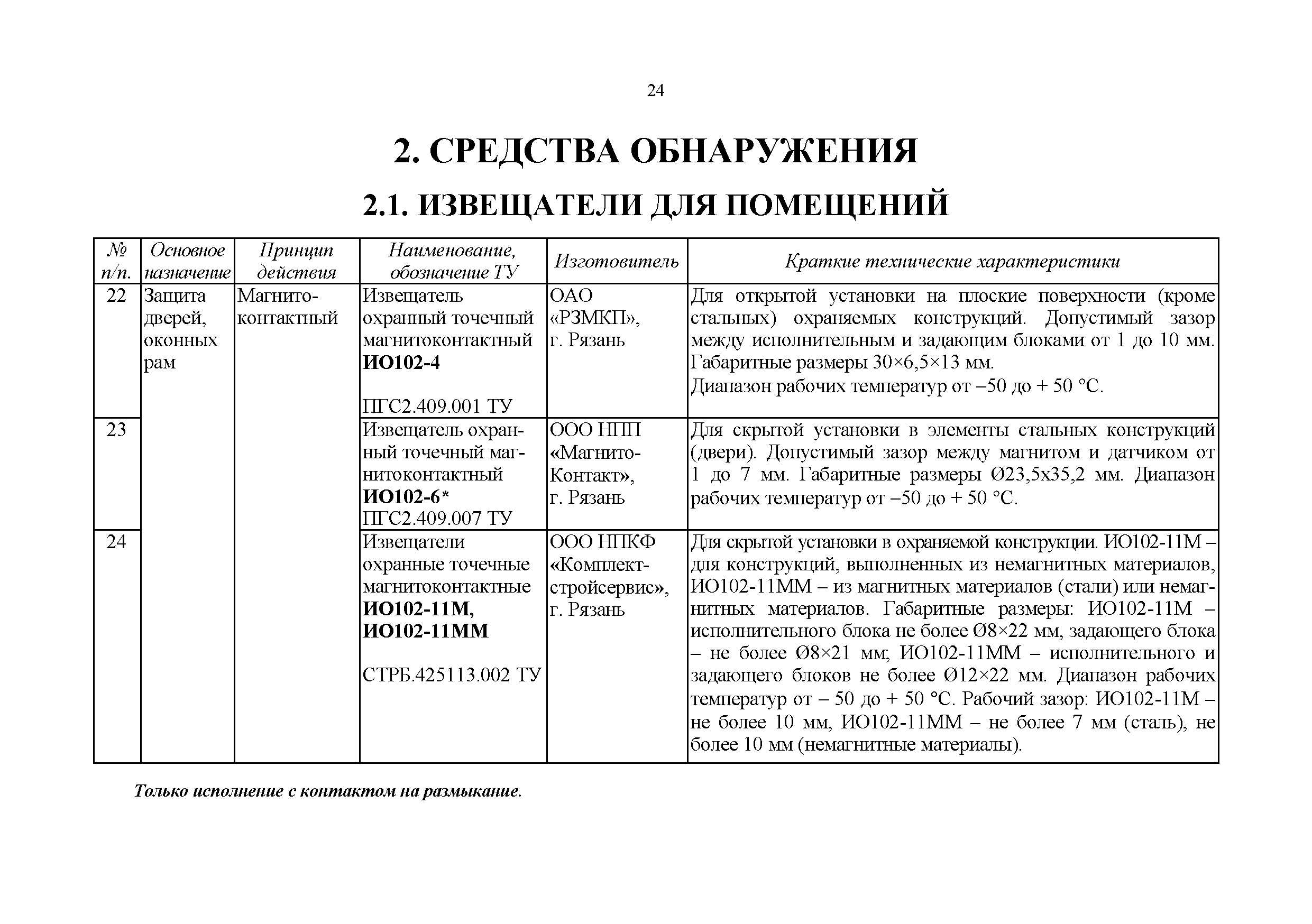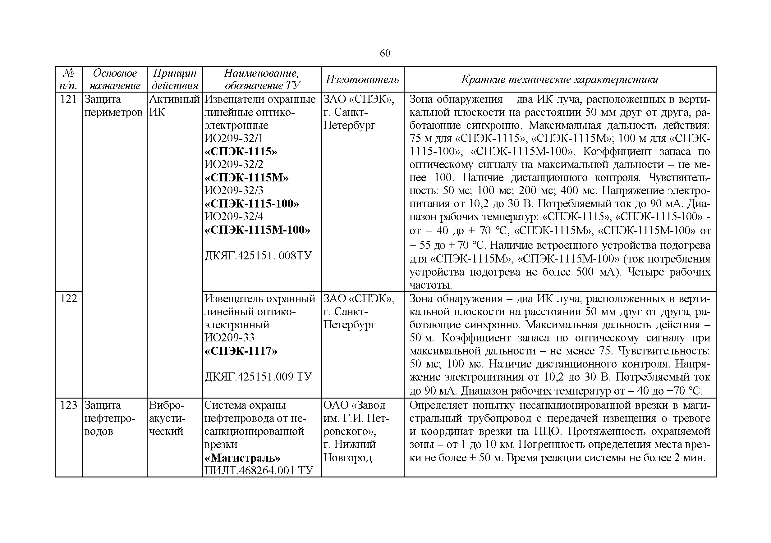 Список технических средств безопасности, удовлетворяющих "Единым требованиям к системам передачи извещений, объектовым техническим средствам охраны и охранным сигнально-противоугонным устройствам автотранспортных средств, предназначенным для применения в подразделениях вневедомственной охраны войск национальной гвардии Российской Федерации"| Статус: | не действует | | Название рус.: | Список технических средств безопасности, удовлетворяющих "Единым требованиям к системам передачи извещений, объектовым техническим средствам охраны и охранным сигнально-противоугонным устройствам автотранспортных средств, предназначенным для применения в подразделениях вневедомственной охраны войск национальной гвардии Российской Федерации" | | Дата добавления в базу: | 01.01.2021 | | Дата актуализации: | 01.01.2021 | | Область применения: | Список включает в себя аппаратуру, удовлетворяющую "Единым требованиям к системам передачи извещений, объектовым техническим средствам охраны и охранным сигнально-противоугонным устройствам автотранспортных средств, предназначенным для применения в подразделениях вневедомственной охраны войск национальной гвардии Российской Федерации". Список подготовлен в целях реализации единой технической политики в обеспечении надежной централизованной охраны объектов, квартир и других мест хранения личного имущества граждан. | | Оглавление: | Введение 1 Средства централизованного наблюдения 2 Средства обнаружения 2.1. Извещатели для помещений 2.2. Извещатели для открытых площадок 3 Объектовые средства 3.1. Интегрированные системы безопасности (комплексы технических средств безопасности, комбинированные системы безопасности) 3.2. Источники электропитания 3.3. Средства тревожной сигнализации 3.4. Средства беспроводной охранной сигнализации 3.5. Охранные сигнально-противоугонные устройства автотранспортных средств | | Разработан: | ФКУ НИЦ Охрана Росгвардии