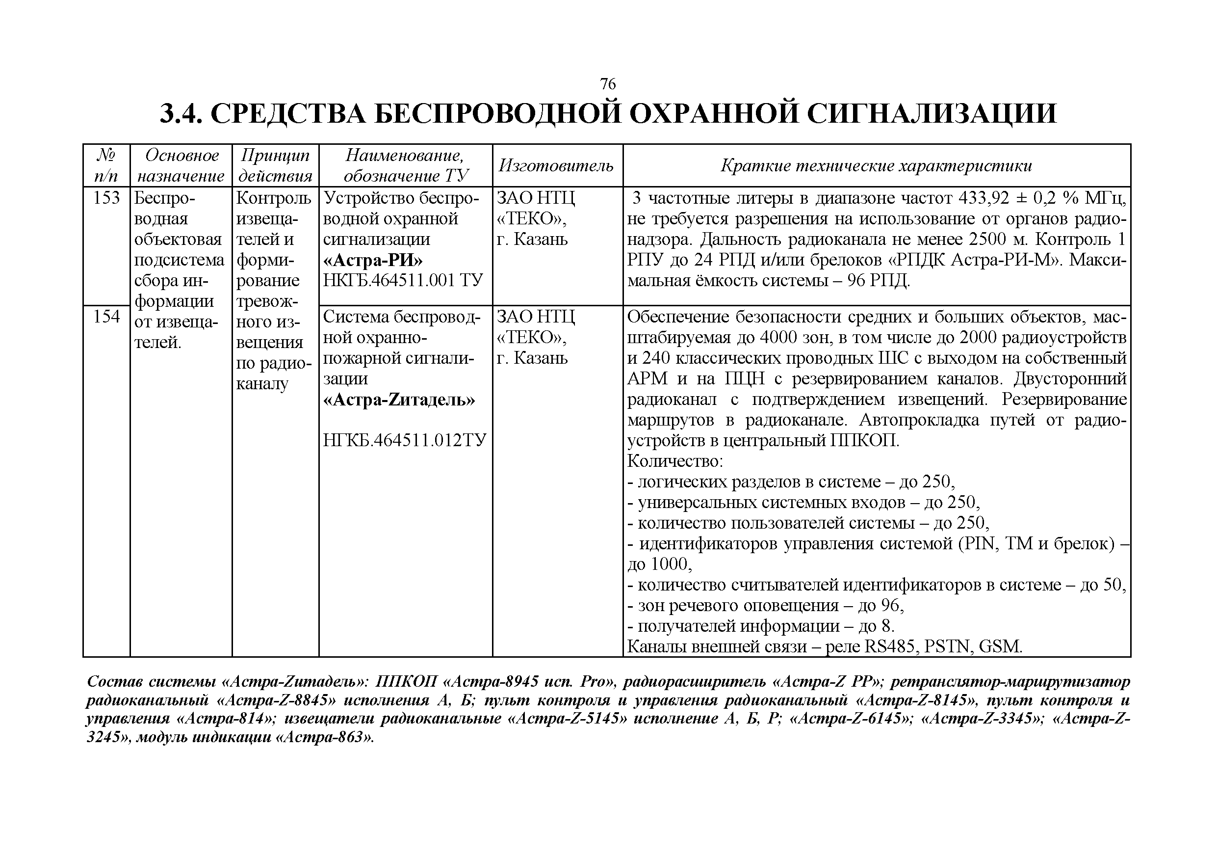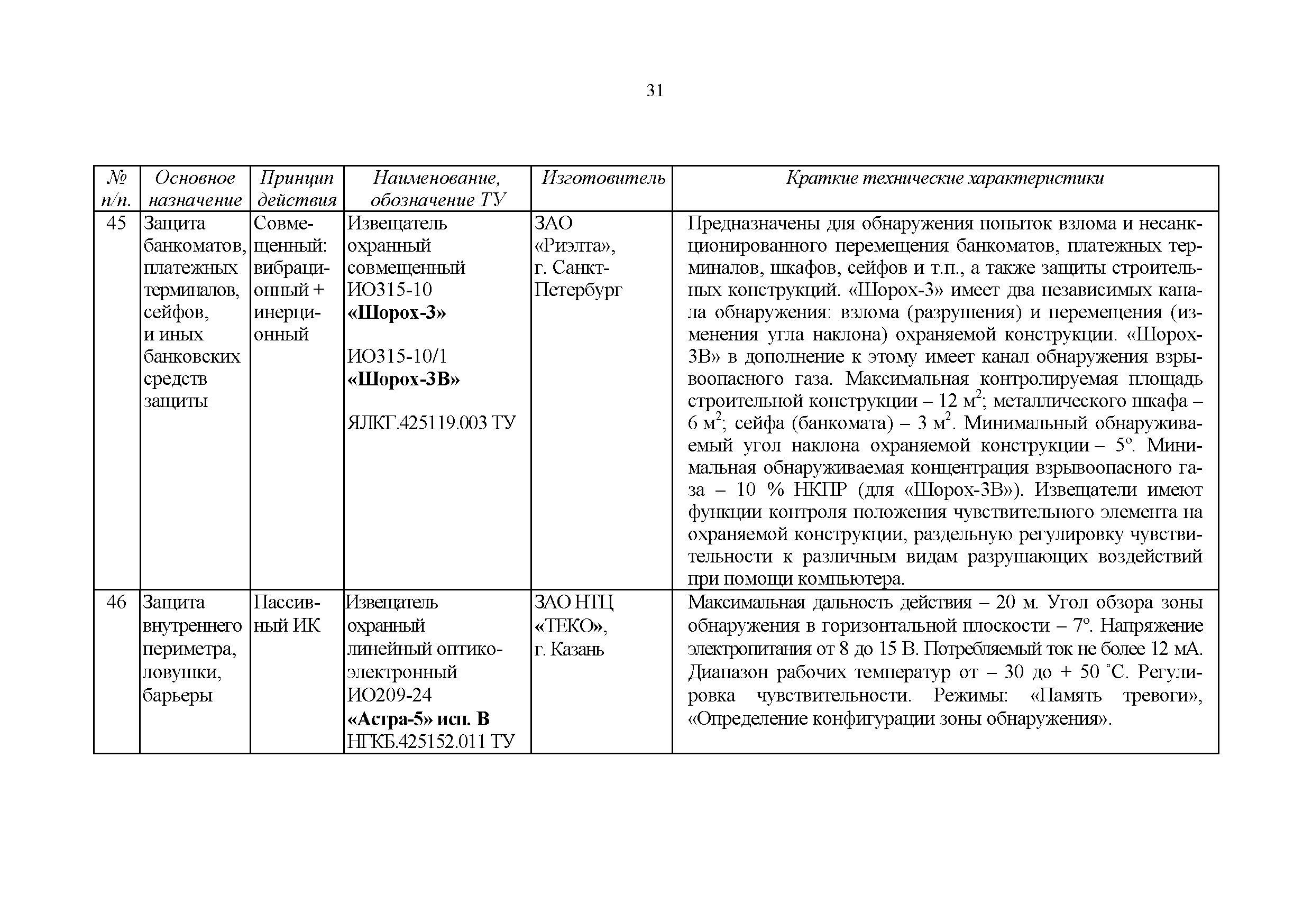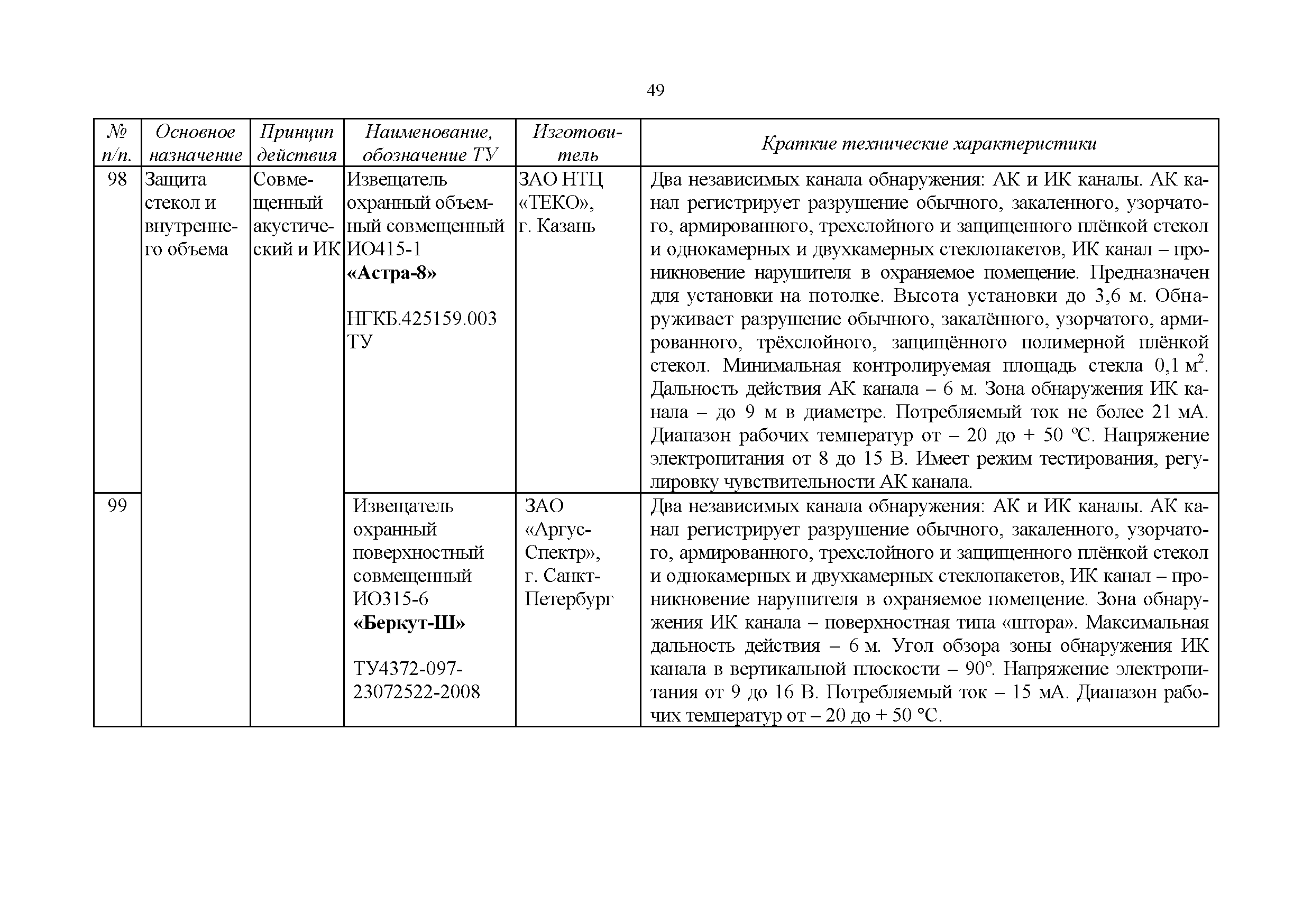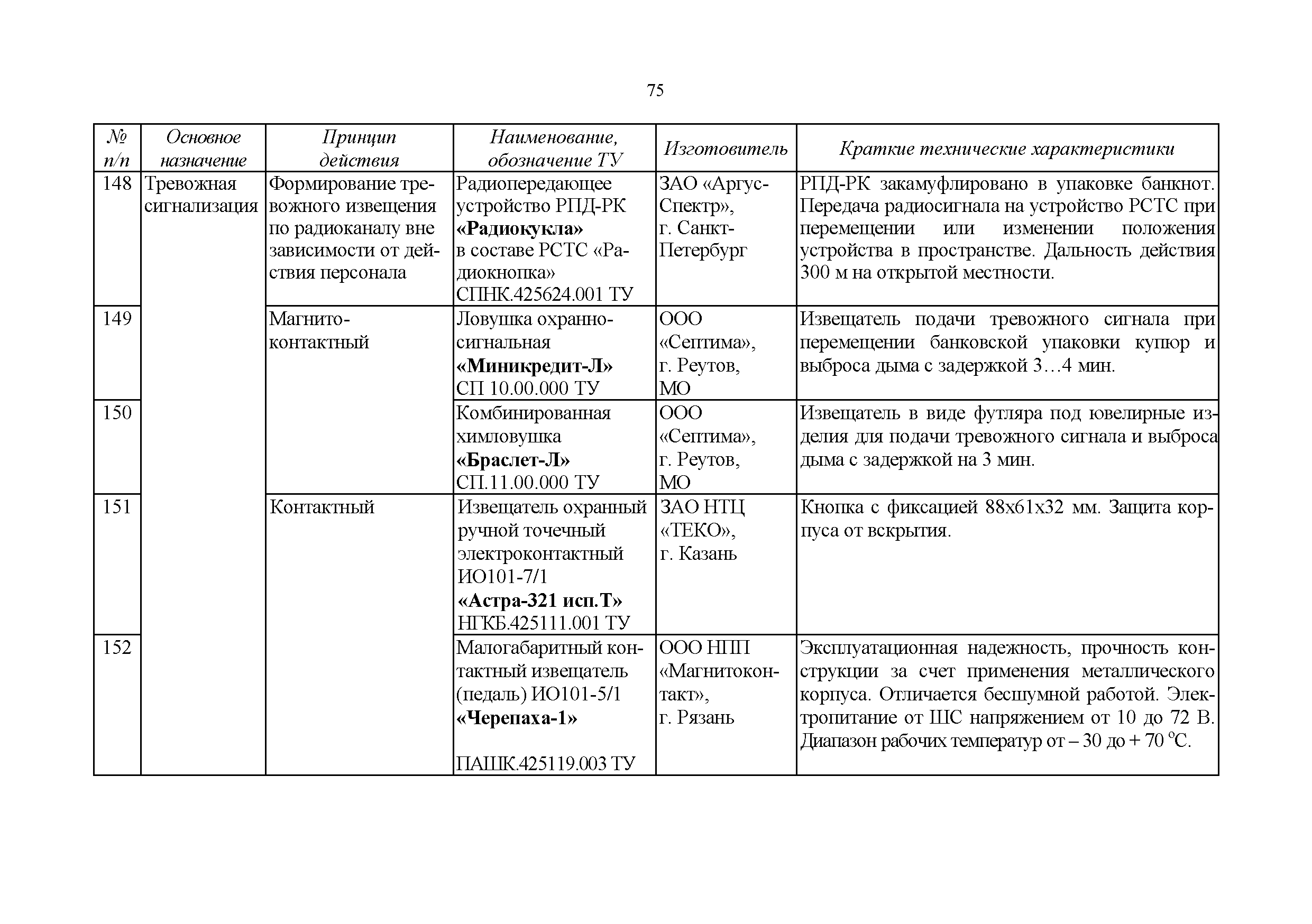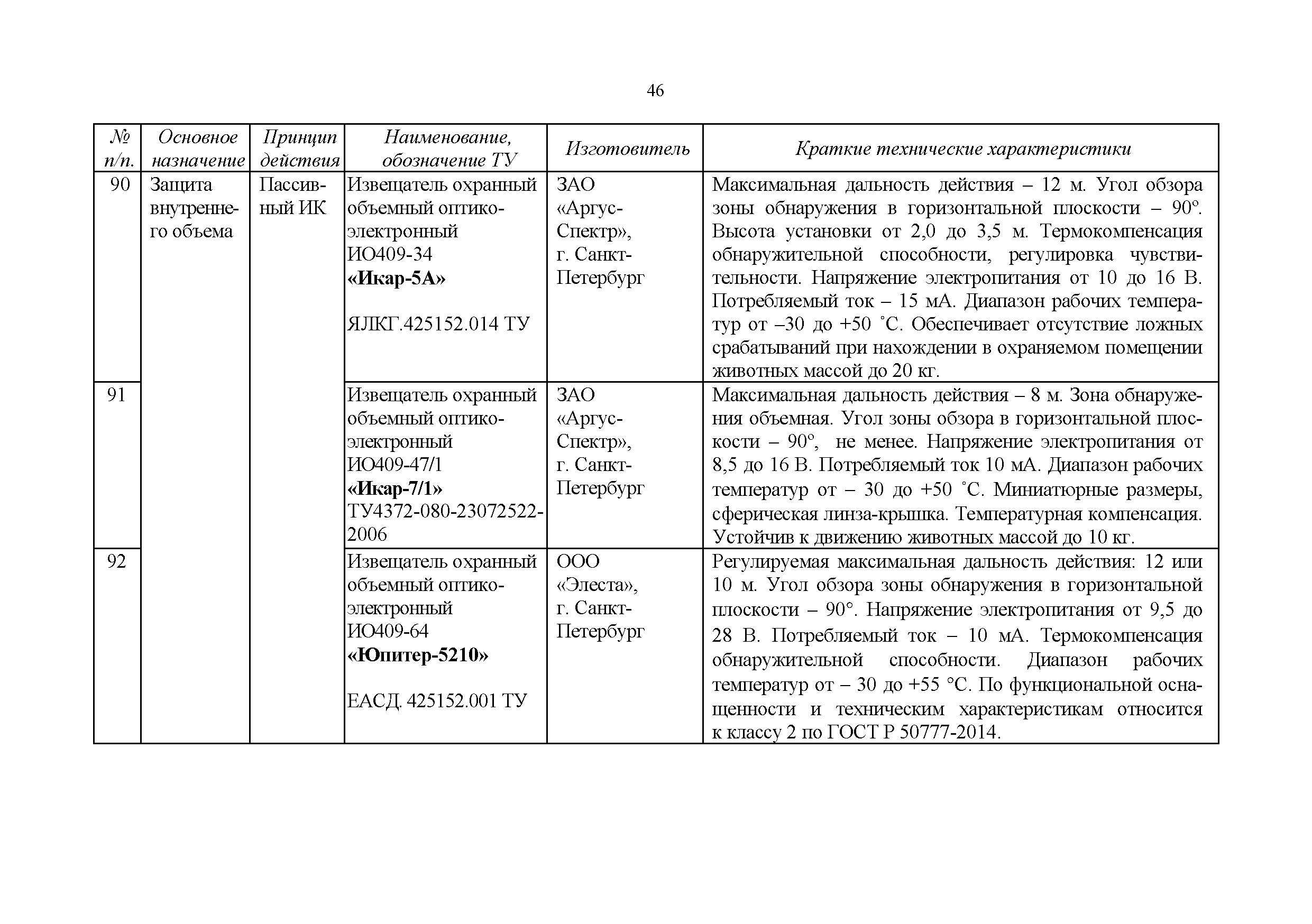 Список технических средств безопасности, удовлетворяющих "Единым требованиям к системам передачи извещений, объектовым техническим средствам охраны и охранным сигнально-противоугонным устройствам автотранспортных средств, предназначенным для применения в подразделениях вневедомственной охраны войск национальной гвардии Российской Федерации"| Статус: | не действует | | Название рус.: | Список технических средств безопасности, удовлетворяющих "Единым требованиям к системам передачи извещений, объектовым техническим средствам охраны и охранным сигнально-противоугонным устройствам автотранспортных средств, предназначенным для применения в подразделениях вневедомственной охраны войск национальной гвардии Российской Федерации" | | Дата добавления в базу: | 01.01.2021 | | Дата актуализации: | 01.01.2021 | | Область применения: | Список включает в себя аппаратуру, удовлетворяющую "Единым требованиям к системам передачи извещений, объектовым техническим средствам охраны и охранным сигнально-противоугонным устройствам автотранспортных средств, предназначенным для применения в подразделениях вневедомственной охраны войск национальной гвардии Российской Федерации". Список подготовлен в целях реализации единой технической политики в обеспечении надежной централизованной охраны объектов, квартир и других мест хранения личного имущества граждан. | | Оглавление: | Введение 1 Средства централизованного наблюдения 2 Средства обнаружения 2.1. Извещатели для помещений 2.2. Извещатели для открытых площадок 3 Объектовые средства 3.1. Интегрированные системы безопасности (комплексы технических средств безопасности, комбинированные системы безопасности) 3.2. Источники электропитания 3.3. Средства тревожной сигнализации 3.4. Средства беспроводной охранной сигнализации 3.5. Охранные сигнально-противоугонные устройства автотранспортных средств | | Разработан: | ФКУ НИЦ Охрана Росгвардии