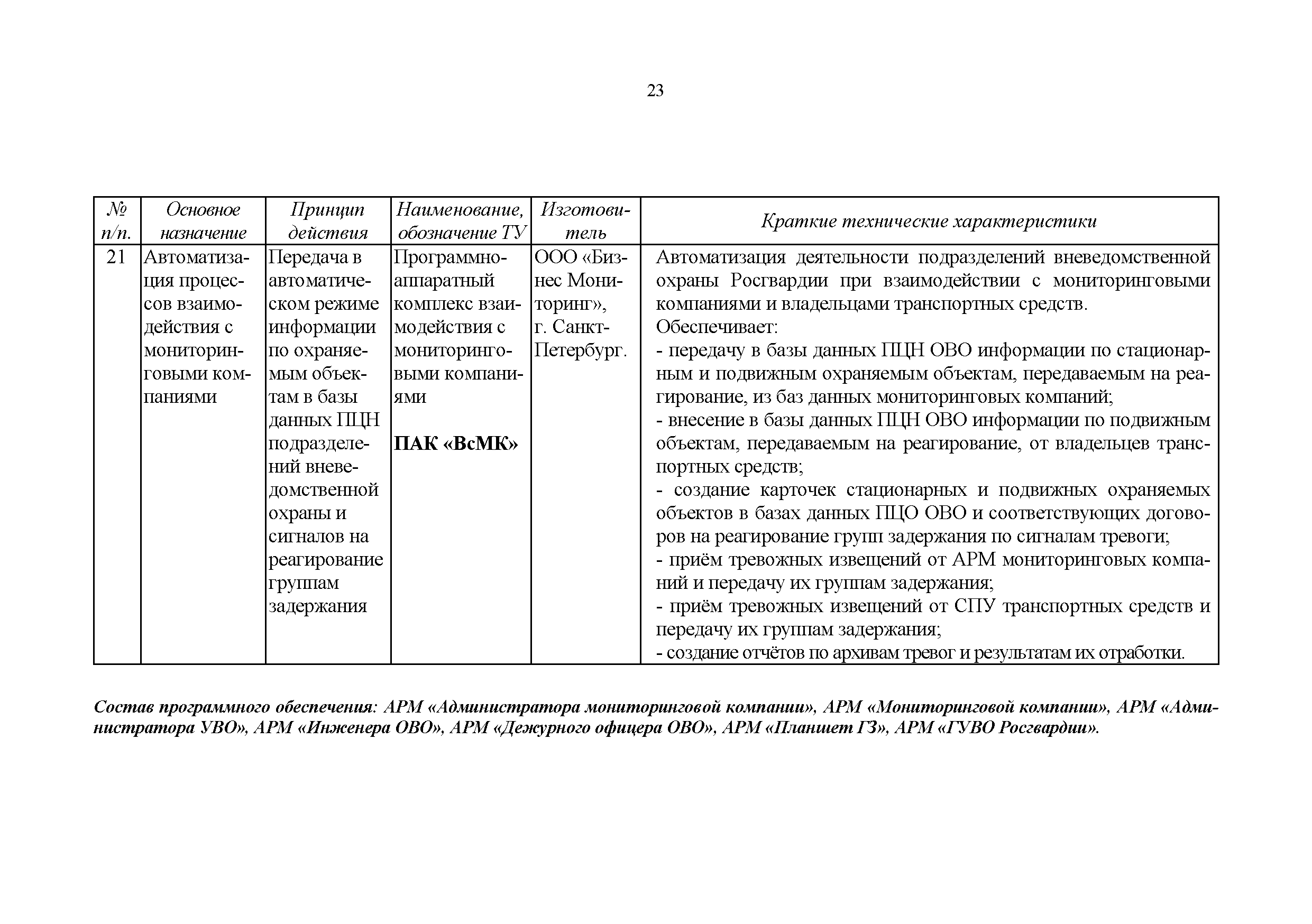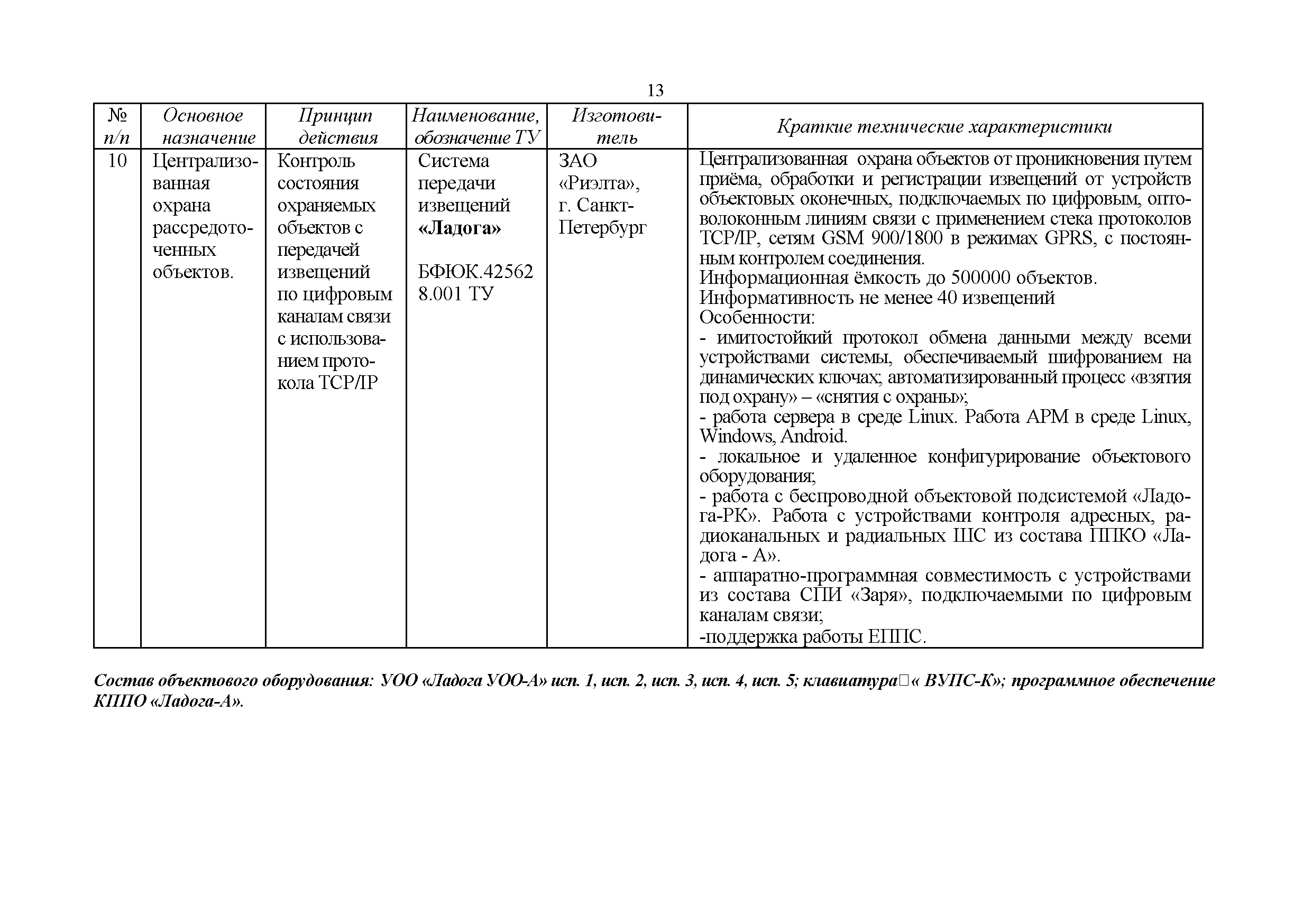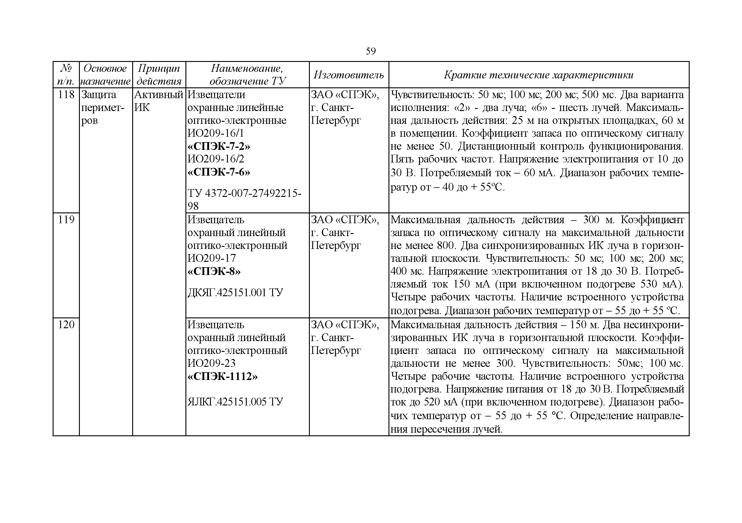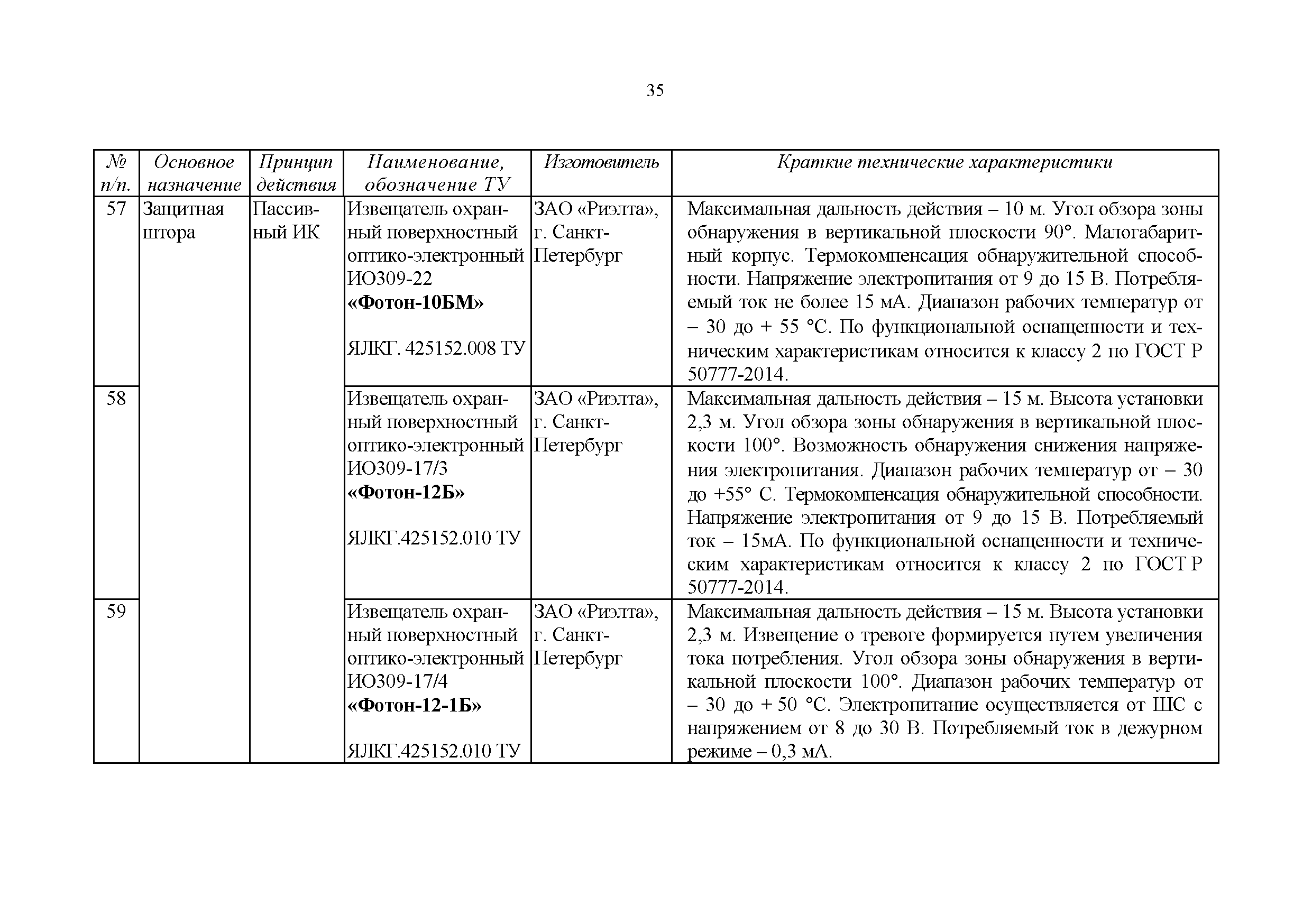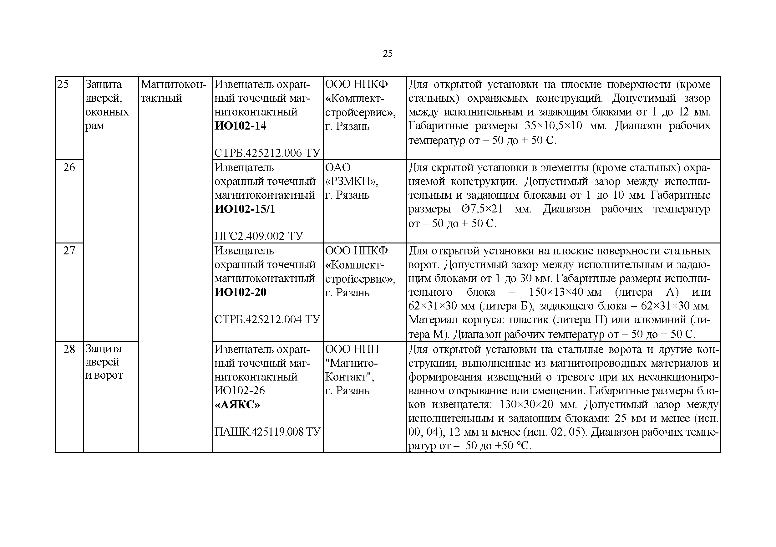 Список технических средств безопасности, удовлетворяющих "Единым требованиям к системам передачи извещений, объектовым техническим средствам охраны и охранным сигнально-противоугонным устройствам автотранспортных средств, предназначенным для применения в подразделениях вневедомственной охраны войск национальной гвардии Российской Федерации"| Статус: | не действует | | Название рус.: | Список технических средств безопасности, удовлетворяющих "Единым требованиям к системам передачи извещений, объектовым техническим средствам охраны и охранным сигнально-противоугонным устройствам автотранспортных средств, предназначенным для применения в подразделениях вневедомственной охраны войск национальной гвардии Российской Федерации" | | Дата добавления в базу: | 01.01.2021 | | Дата актуализации: | 01.01.2021 | | Область применения: | Список включает в себя аппаратуру, удовлетворяющую "Единым требованиям к системам передачи извещений, объектовым техническим средствам охраны и охранным сигнально-противоугонным устройствам автотранспортных средств, предназначенным для применения в подразделениях вневедомственной охраны войск национальной гвардии Российской Федерации". Список подготовлен в целях реализации единой технической политики в обеспечении надежной централизованной охраны объектов, квартир и других мест хранения личного имущества граждан. | | Оглавление: | Введение 1 Средства централизованного наблюдения 2 Средства обнаружения 2.1. Извещатели для помещений 2.2. Извещатели для открытых площадок 3 Объектовые средства 3.1. Интегрированные системы безопасности (комплексы технических средств безопасности, комбинированные системы безопасности) 3.2. Источники электропитания 3.3. Средства тревожной сигнализации 3.4. Средства беспроводной охранной сигнализации 3.5. Охранные сигнально-противоугонные устройства автотранспортных средств | | Разработан: | ФКУ НИЦ Охрана Росгвардии