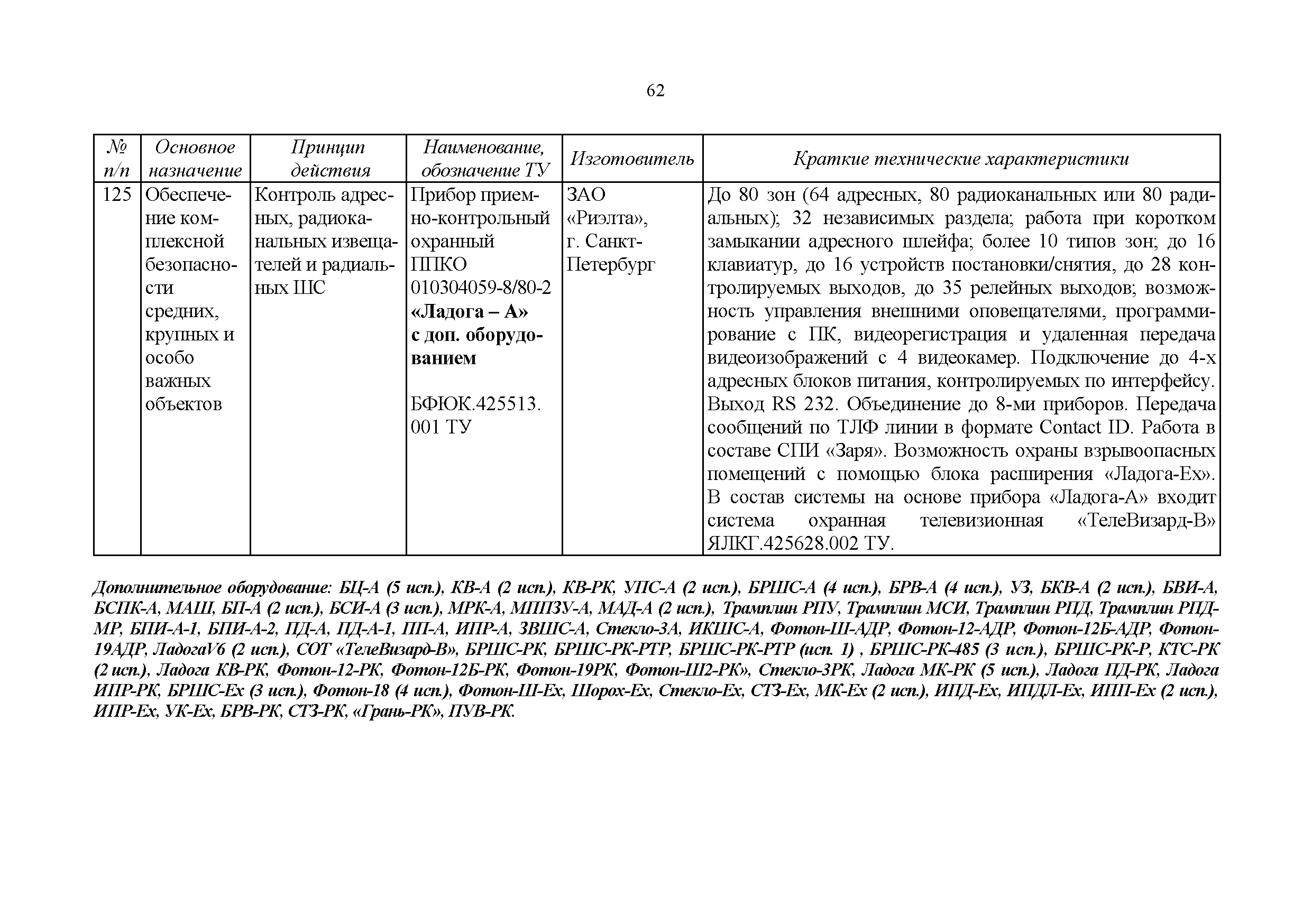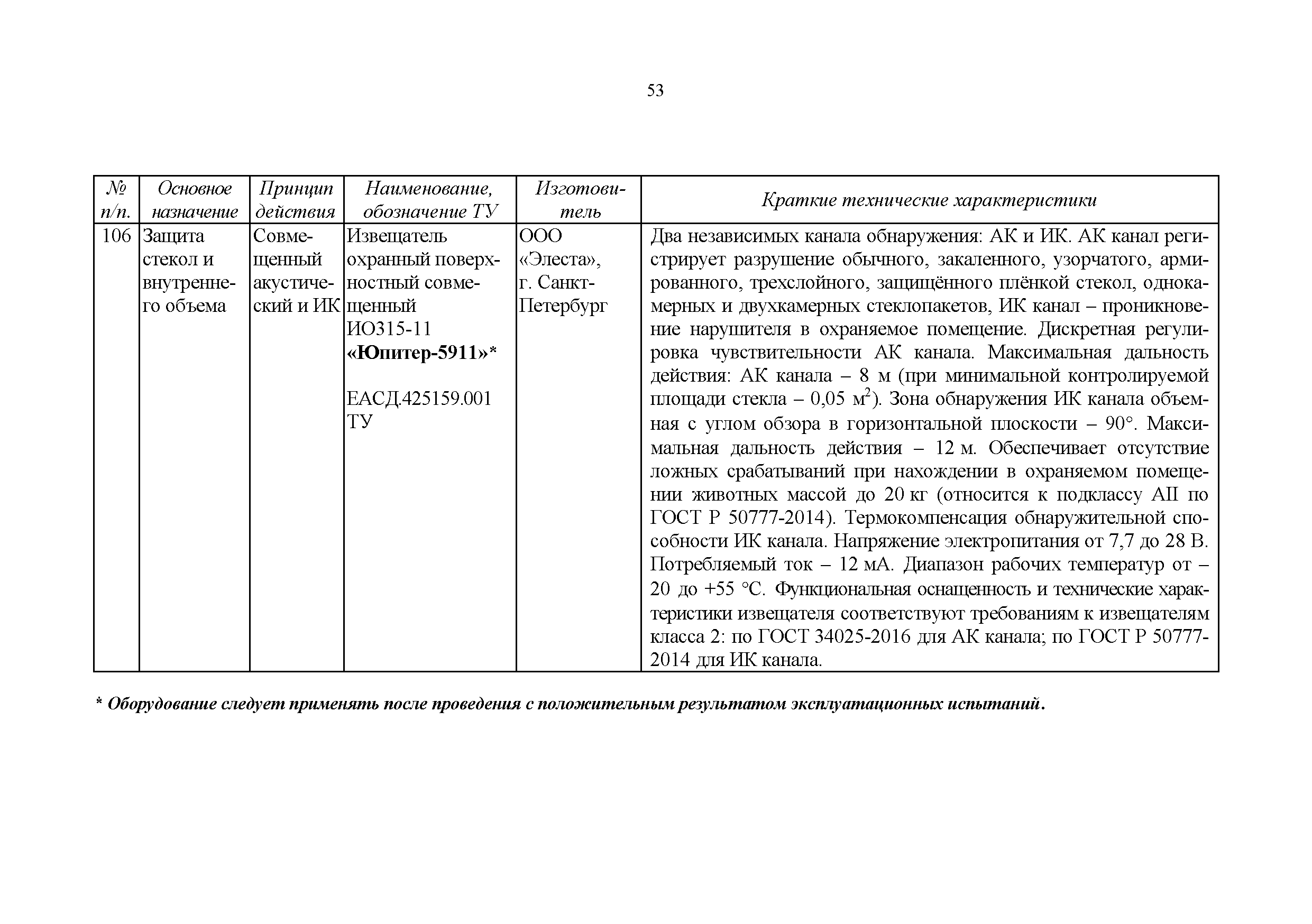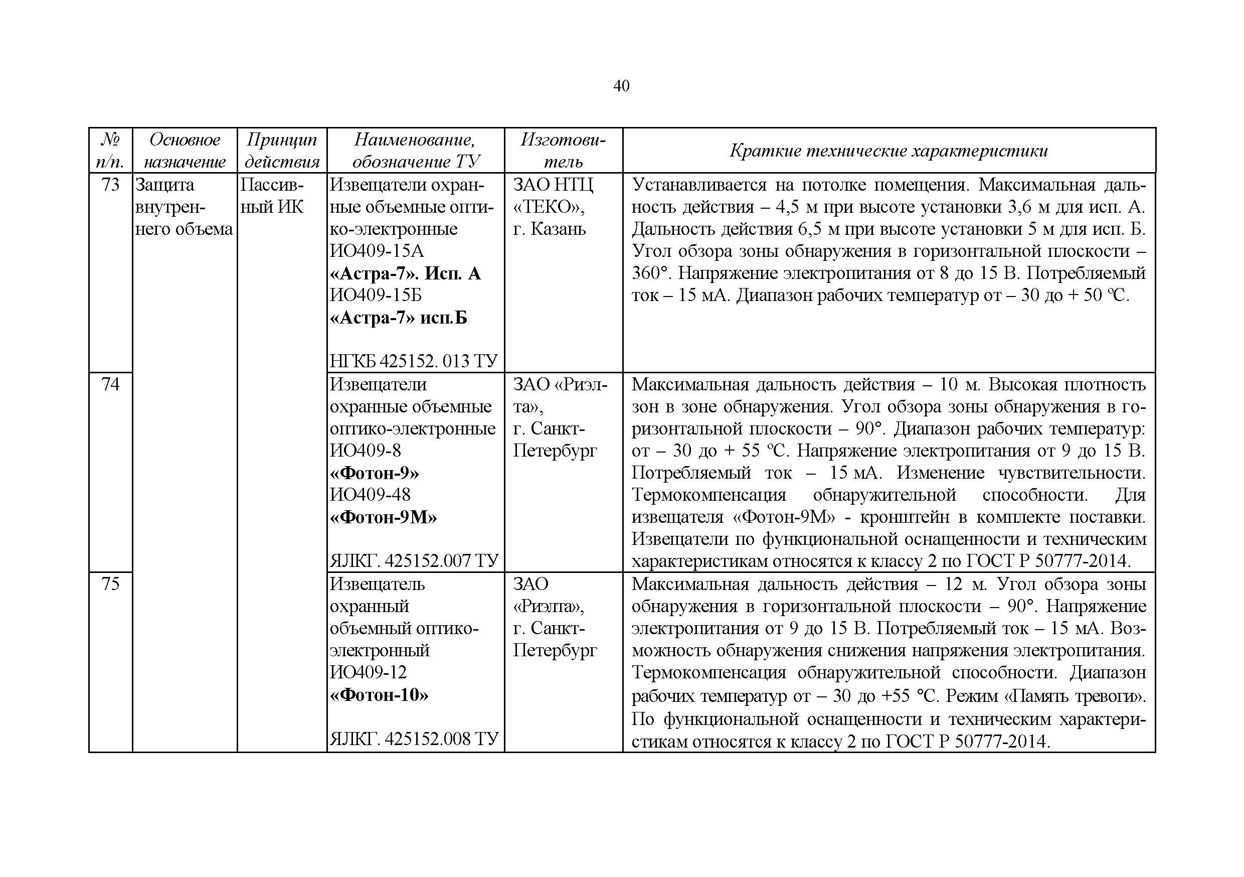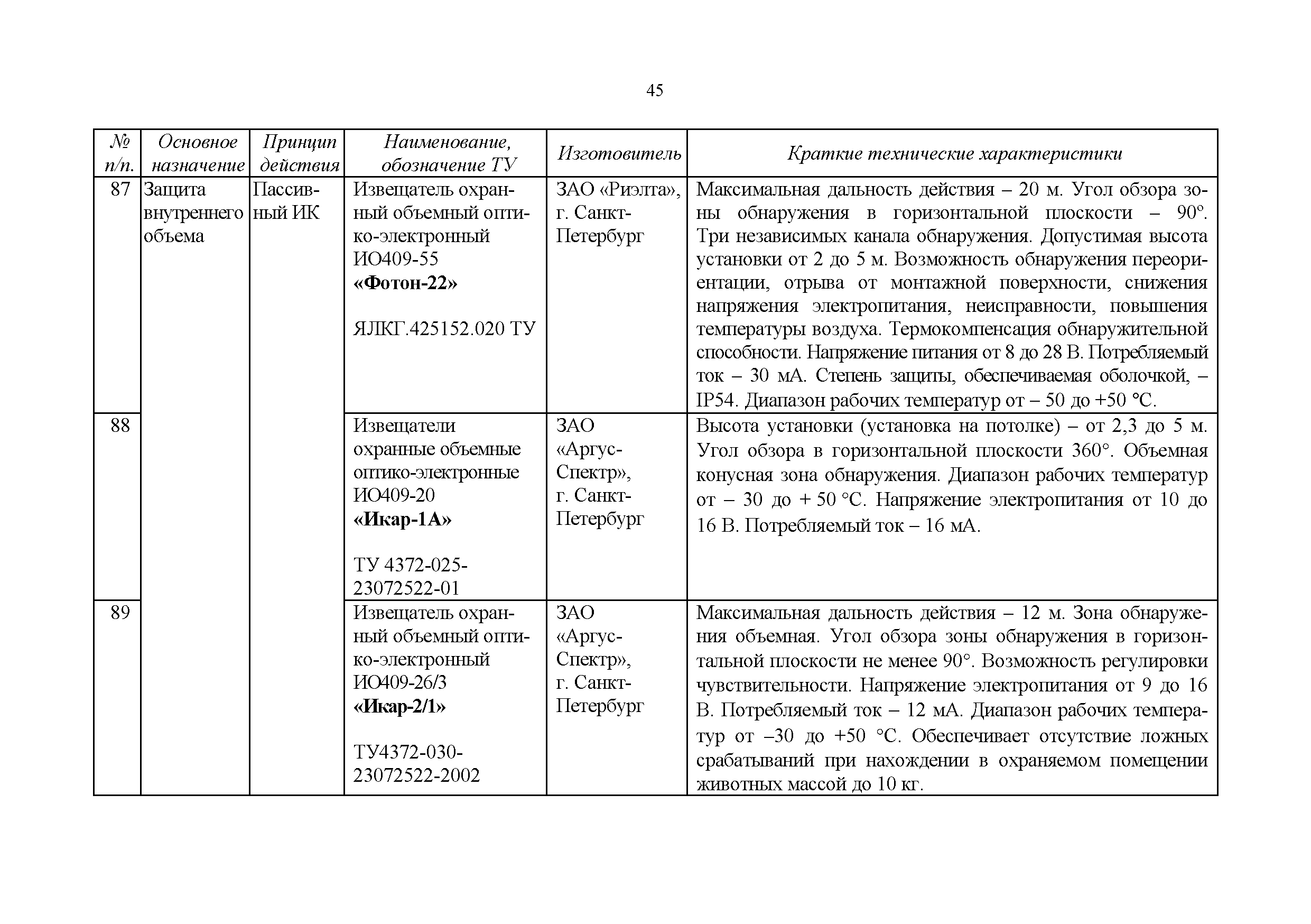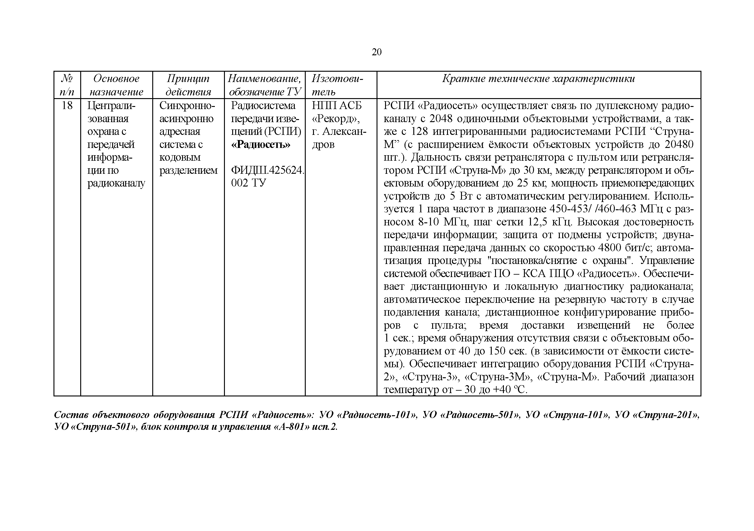 Список технических средств безопасности, удовлетворяющих "Единым требованиям к системам передачи извещений, объектовым техническим средствам охраны и охранным сигнально-противоугонным устройствам автотранспортных средств, предназначенным для применения в подразделениях вневедомственной охраны войск национальной гвардии Российской Федерации"| Статус: | не действует | | Название рус.: | Список технических средств безопасности, удовлетворяющих "Единым требованиям к системам передачи извещений, объектовым техническим средствам охраны и охранным сигнально-противоугонным устройствам автотранспортных средств, предназначенным для применения в подразделениях вневедомственной охраны войск национальной гвардии Российской Федерации" | | Дата добавления в базу: | 01.01.2021 | | Дата актуализации: | 01.01.2021 | | Область применения: | Список включает в себя аппаратуру, удовлетворяющую "Единым требованиям к системам передачи извещений, объектовым техническим средствам охраны и охранным сигнально-противоугонным устройствам автотранспортных средств, предназначенным для применения в подразделениях вневедомственной охраны войск национальной гвардии Российской Федерации". Список подготовлен в целях реализации единой технической политики в обеспечении надежной централизованной охраны объектов, квартир и других мест хранения личного имущества граждан. | | Оглавление: | Введение 1 Средства централизованного наблюдения 2 Средства обнаружения 2.1. Извещатели для помещений 2.2. Извещатели для открытых площадок 3 Объектовые средства 3.1. Интегрированные системы безопасности (комплексы технических средств безопасности, комбинированные системы безопасности) 3.2. Источники электропитания 3.3. Средства тревожной сигнализации 3.4. Средства беспроводной охранной сигнализации 3.5. Охранные сигнально-противоугонные устройства автотранспортных средств | | Разработан: | ФКУ НИЦ Охрана Росгвардии