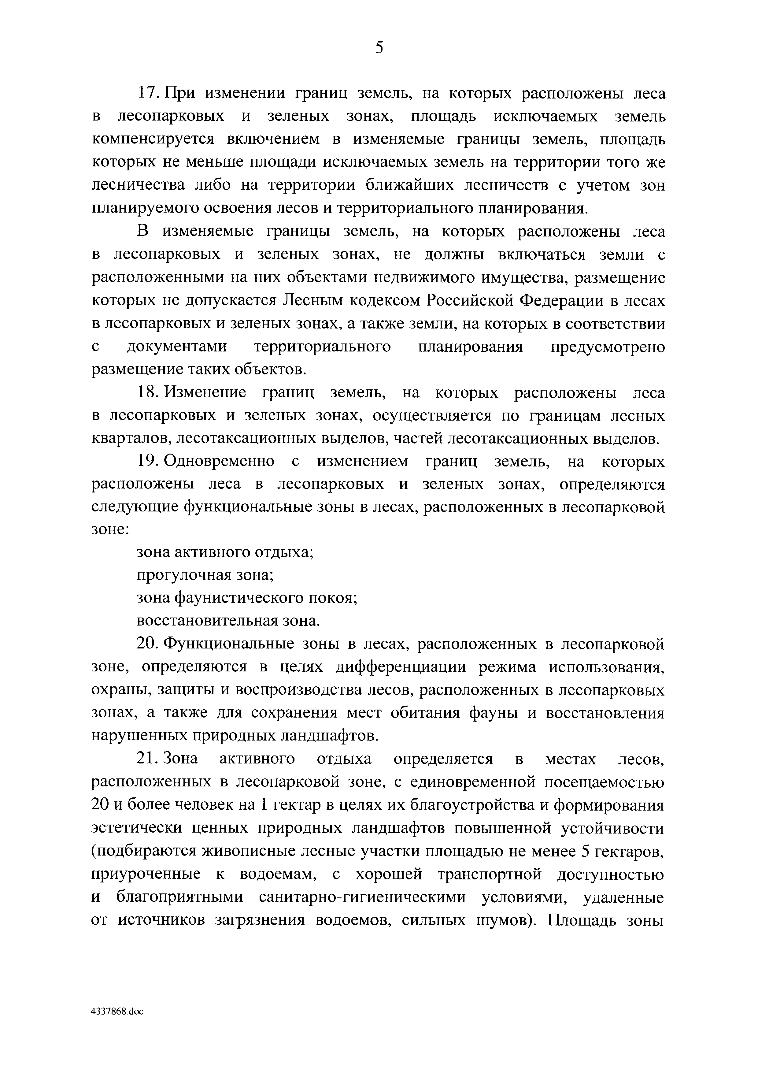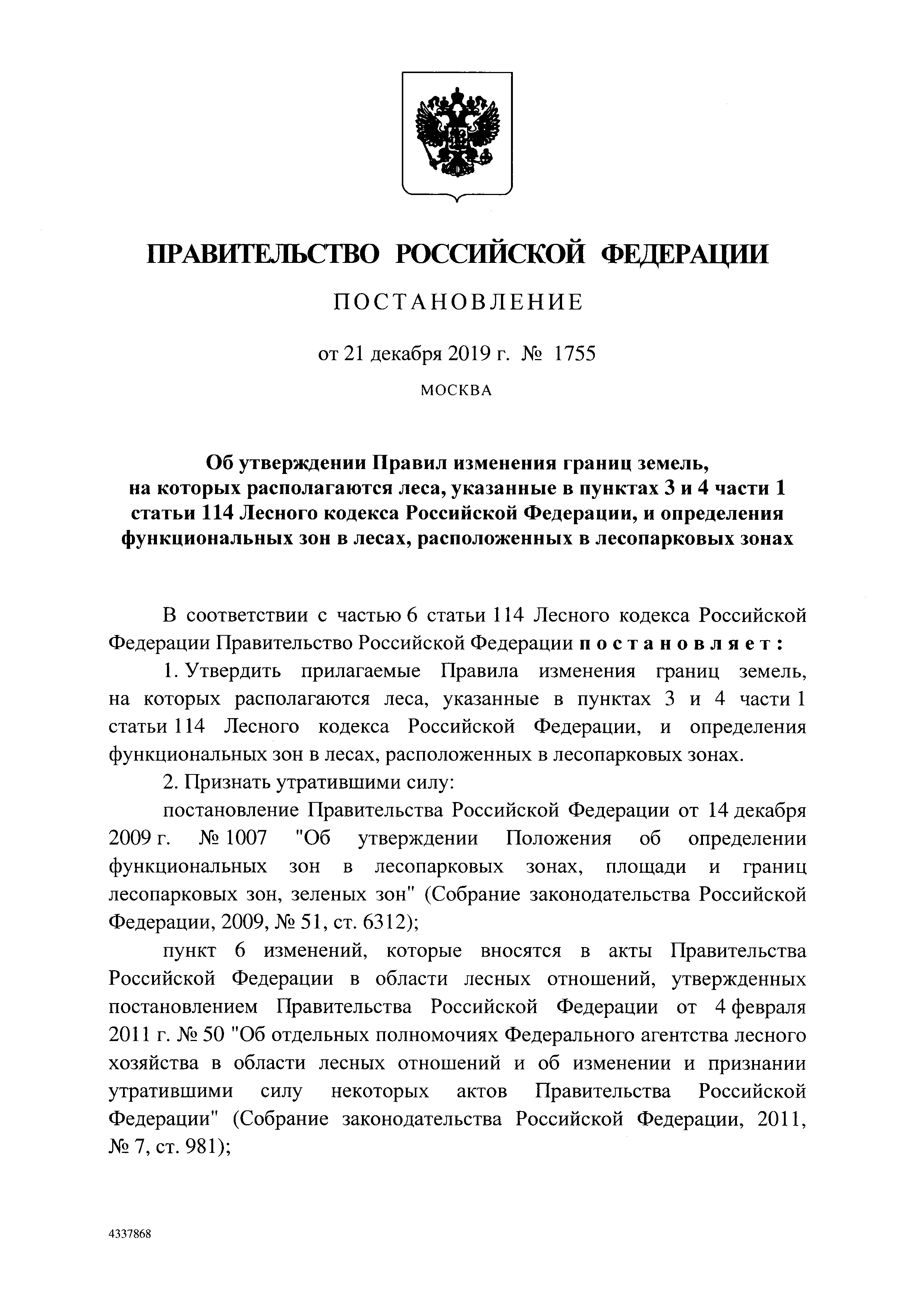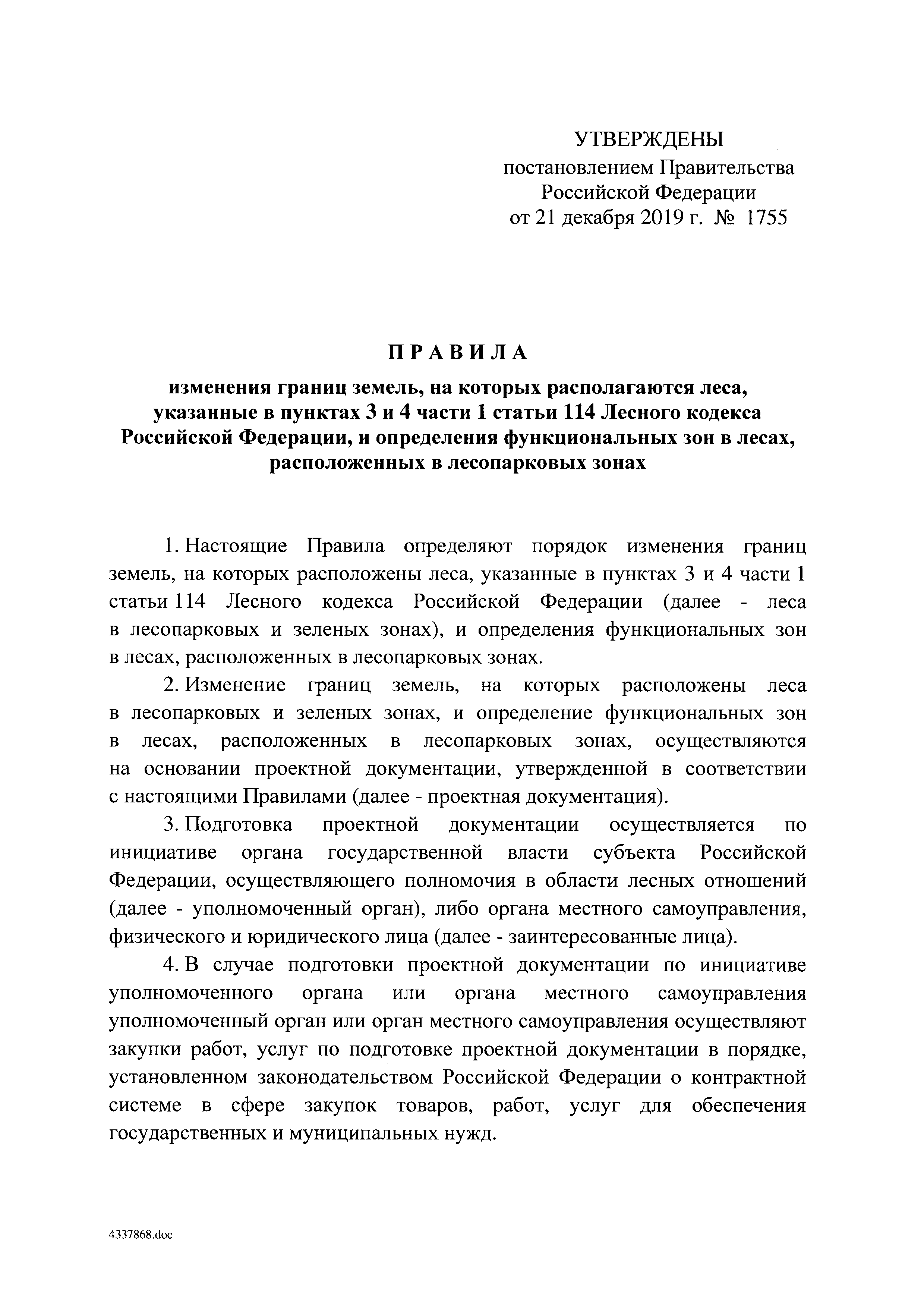 Правила изменения границ земель, на которых располагаются леса, указанные в пунктах 3 и 4 части 1 статьи 114 Лесного кодекса Российской Федерации, и определения функциональных зон в лесах, расположенных в лесопарковых зонах| Статус: | действует | | Название рус.: | Правила изменения границ земель, на которых располагаются леса, указанные в пунктах 3 и 4 части 1 статьи 114 Лесного кодекса Российской Федерации, и определения функциональных зон в лесах, расположенных в лесопарковых зонах | | Дата добавления в базу: | 01.02.2020 | | Дата актуализации: | 01.01.2021 | | Дата введения: | 02.01.2020 | | Область применения: | Правила определяют порядок изменения границ земель, на которых расположены леса, указанные в пунктах 3 и 4 части 1 статьи 114 Лесного кодекса Российской Федерации, и определения функциональных зон в лесах, расположенных в лесопарковых зонах | | Утверждён: | 21.12.2019 Правительство Российской Федерации (1755)