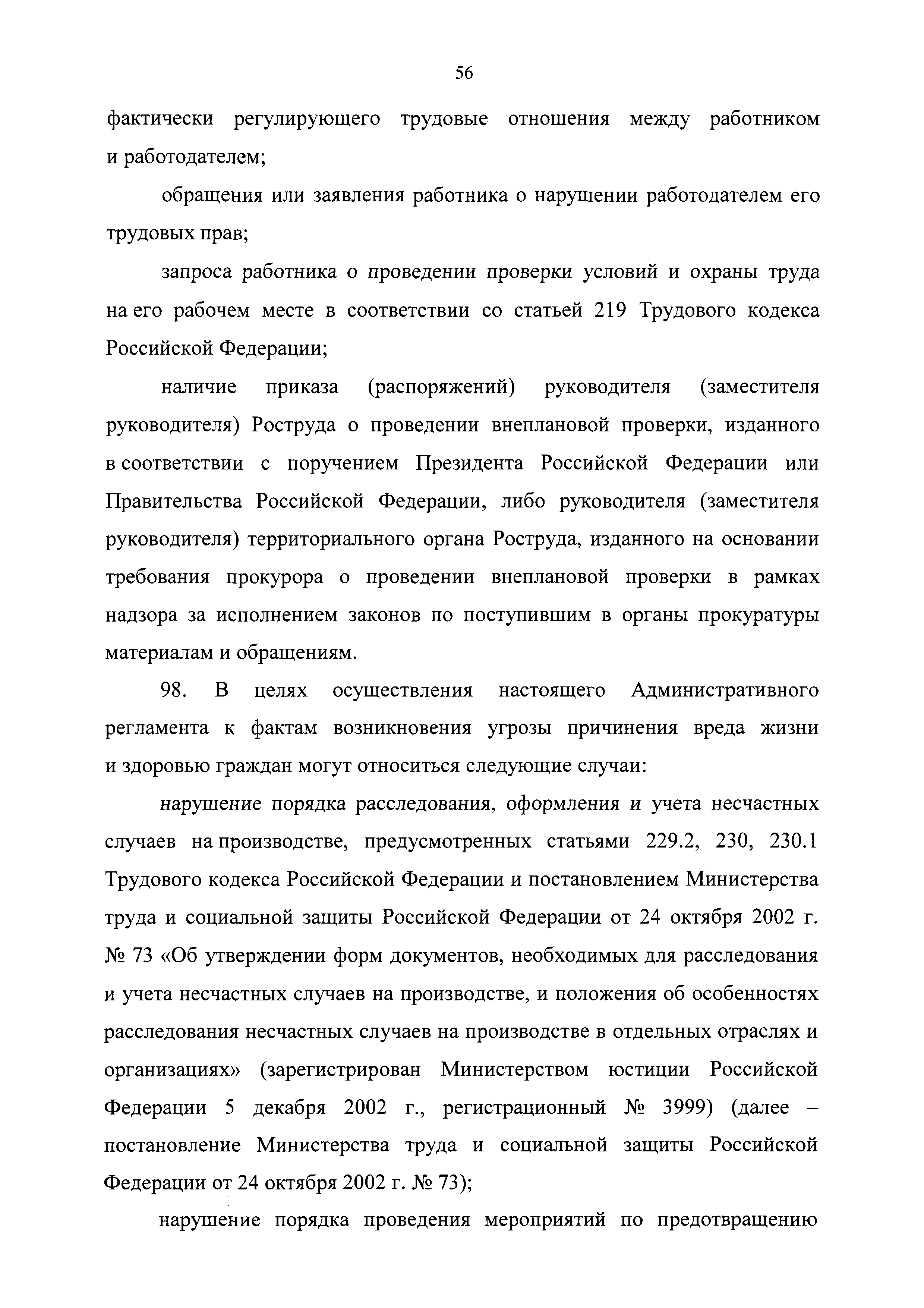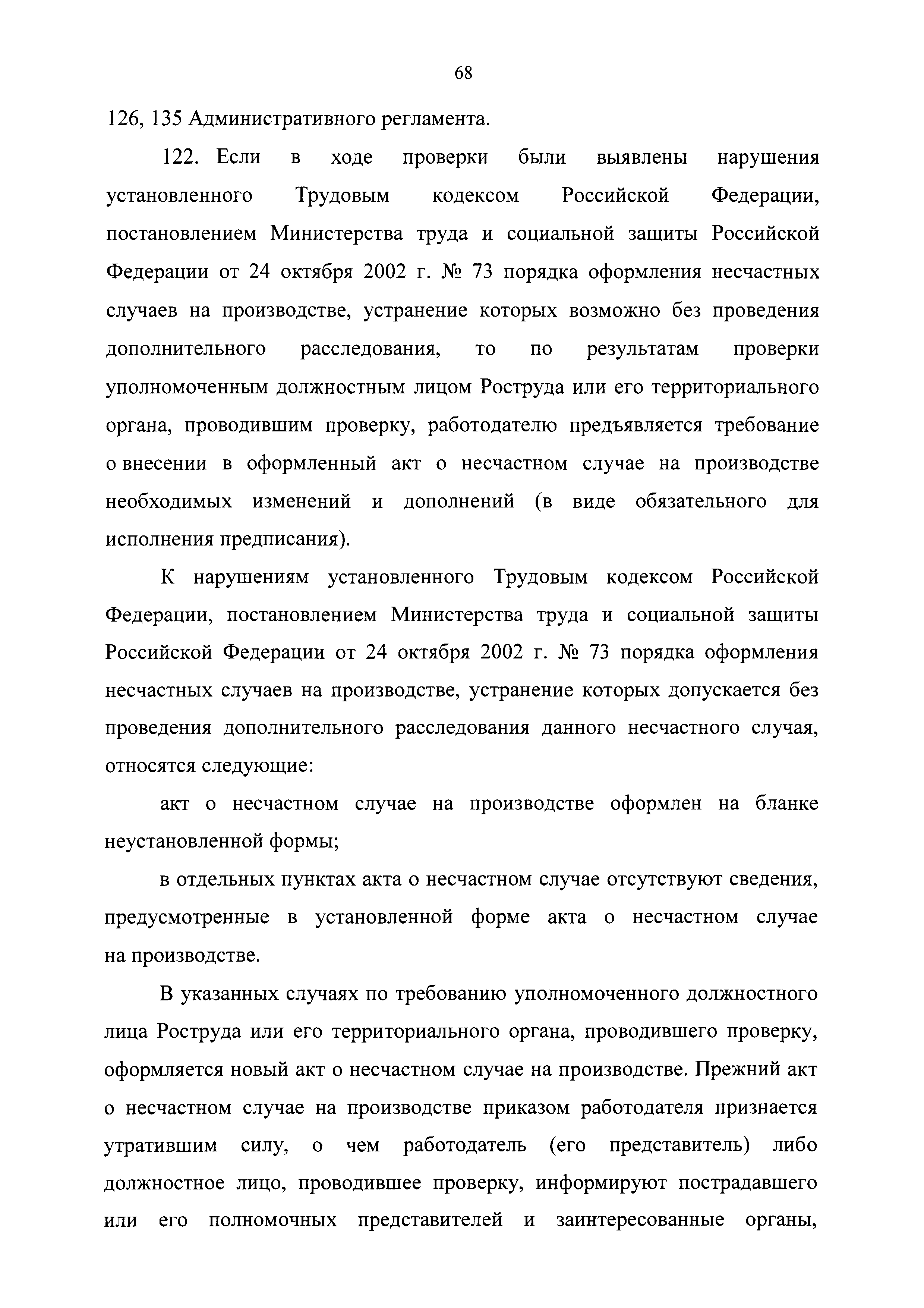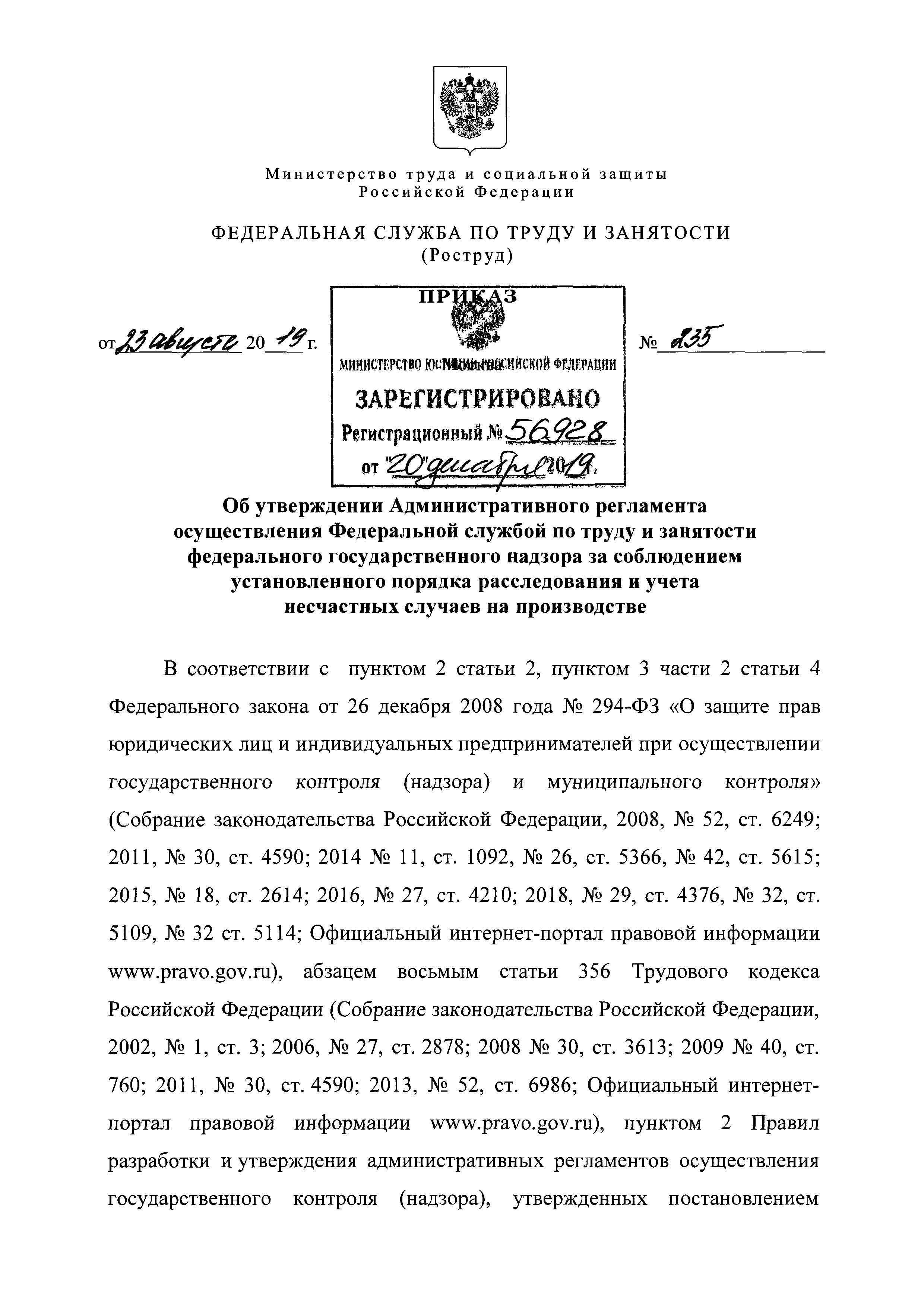 Название рус.:Административный регламент осуществления Федеральной службой по труду и занятости федерального государственного надзора за соблюдением установленного порядка расследования и учета несчастных случаев на производстве