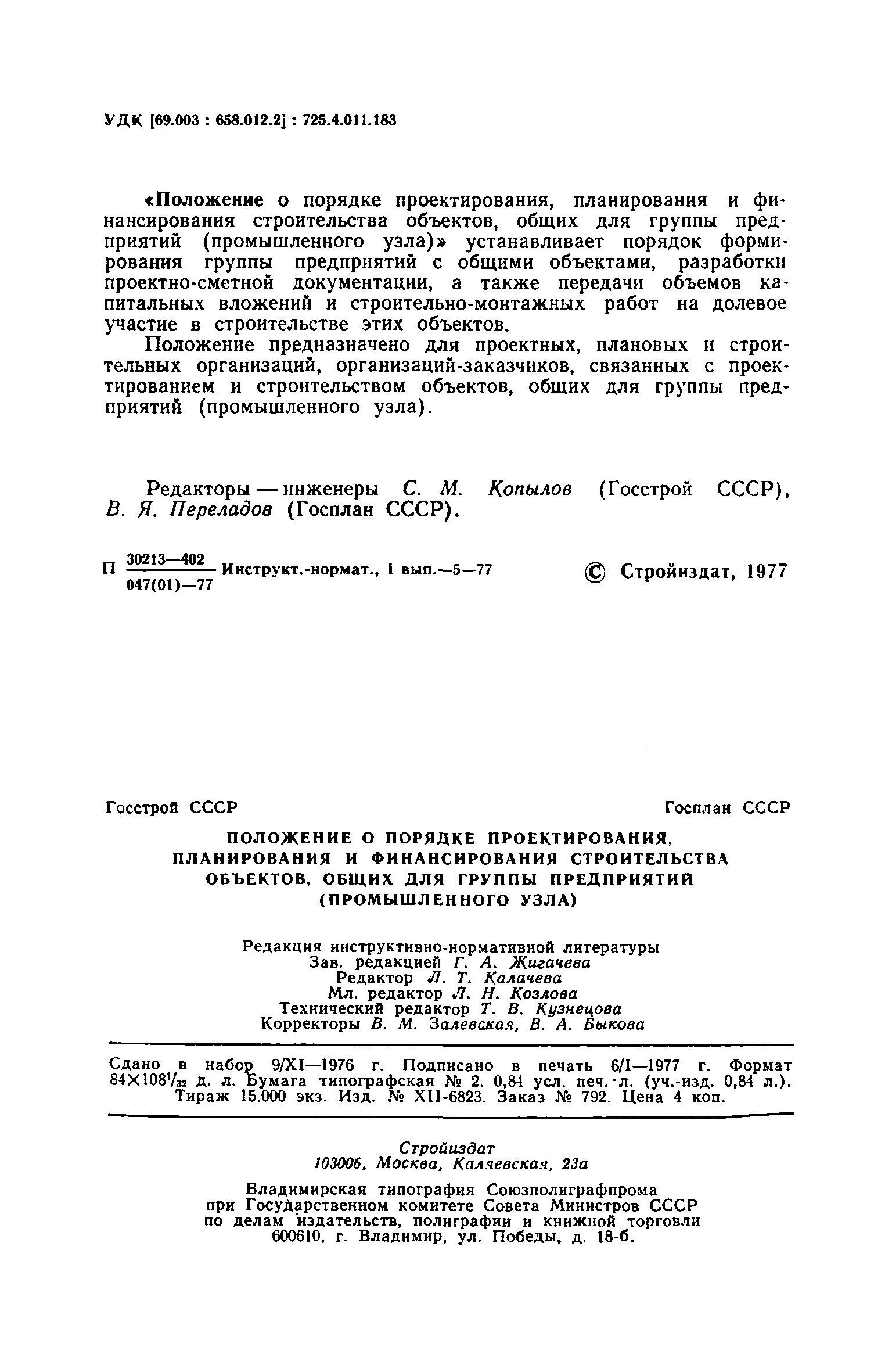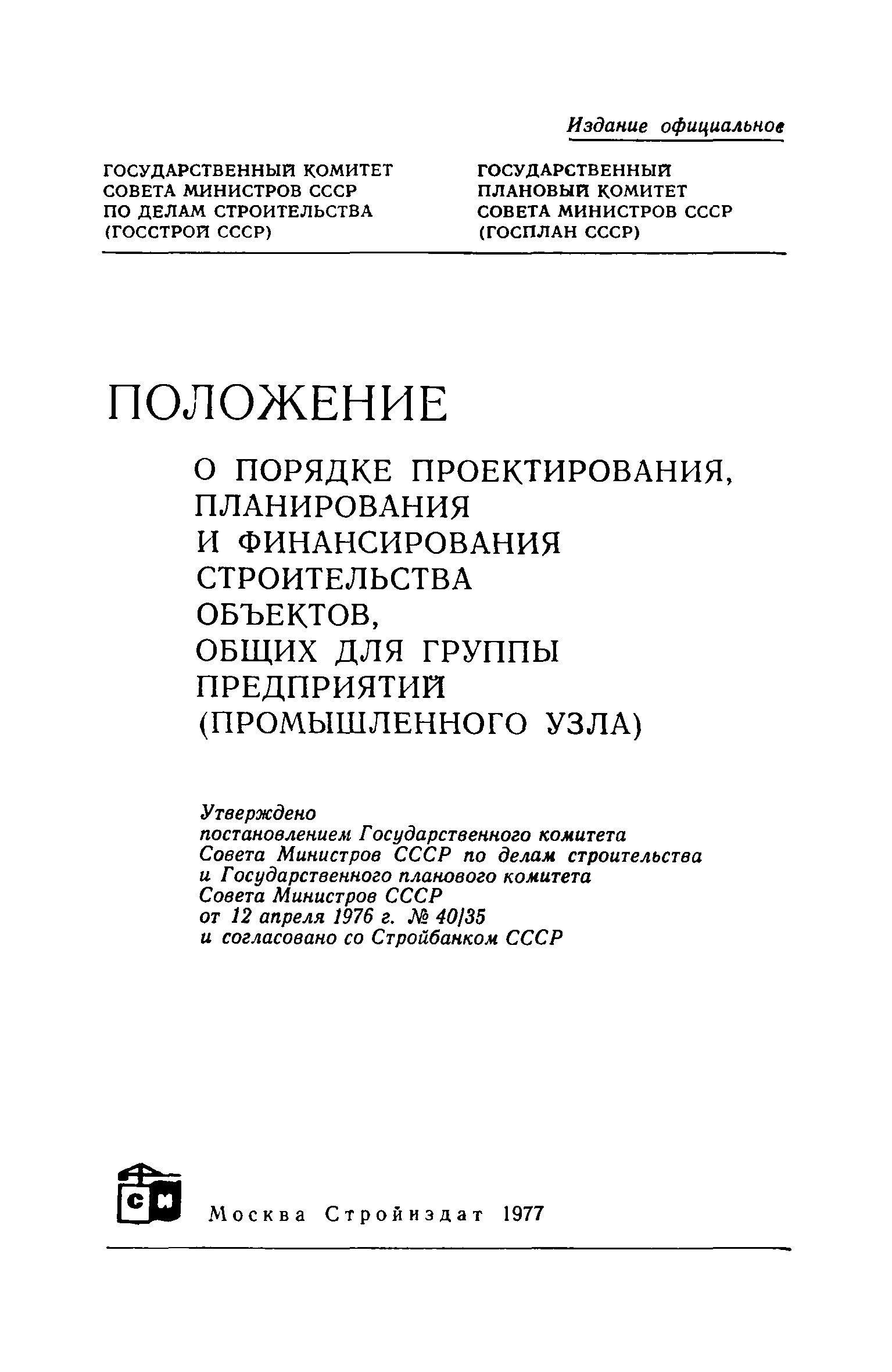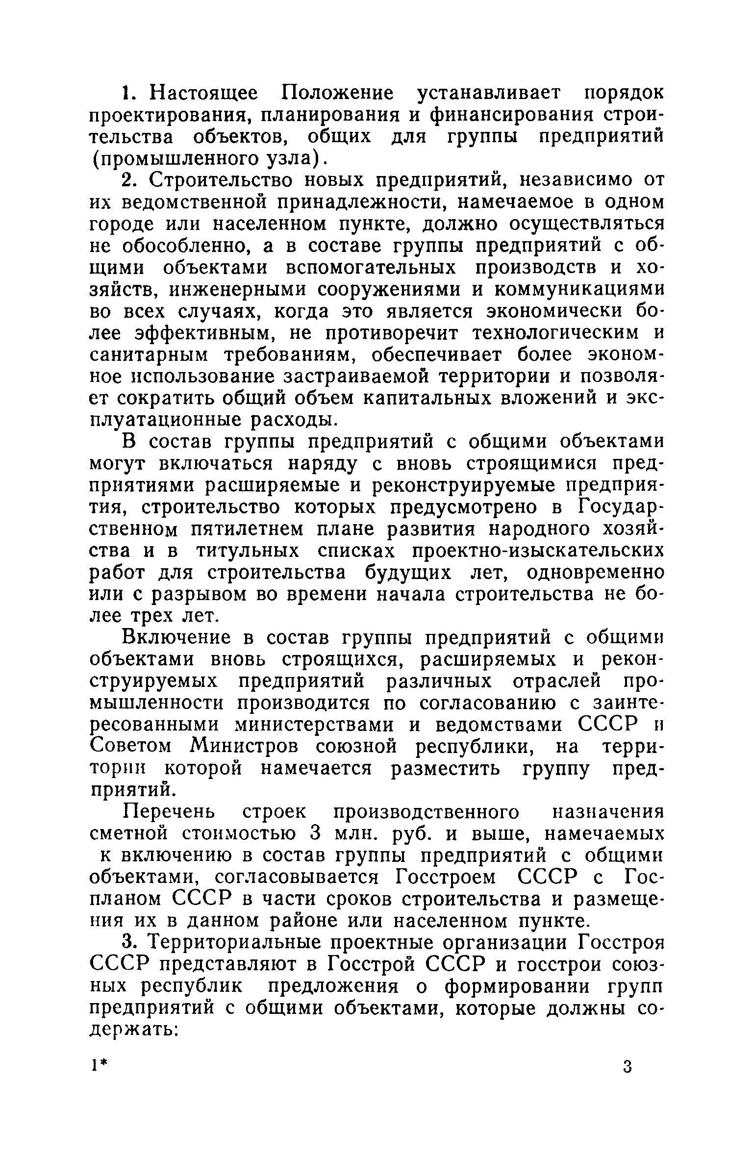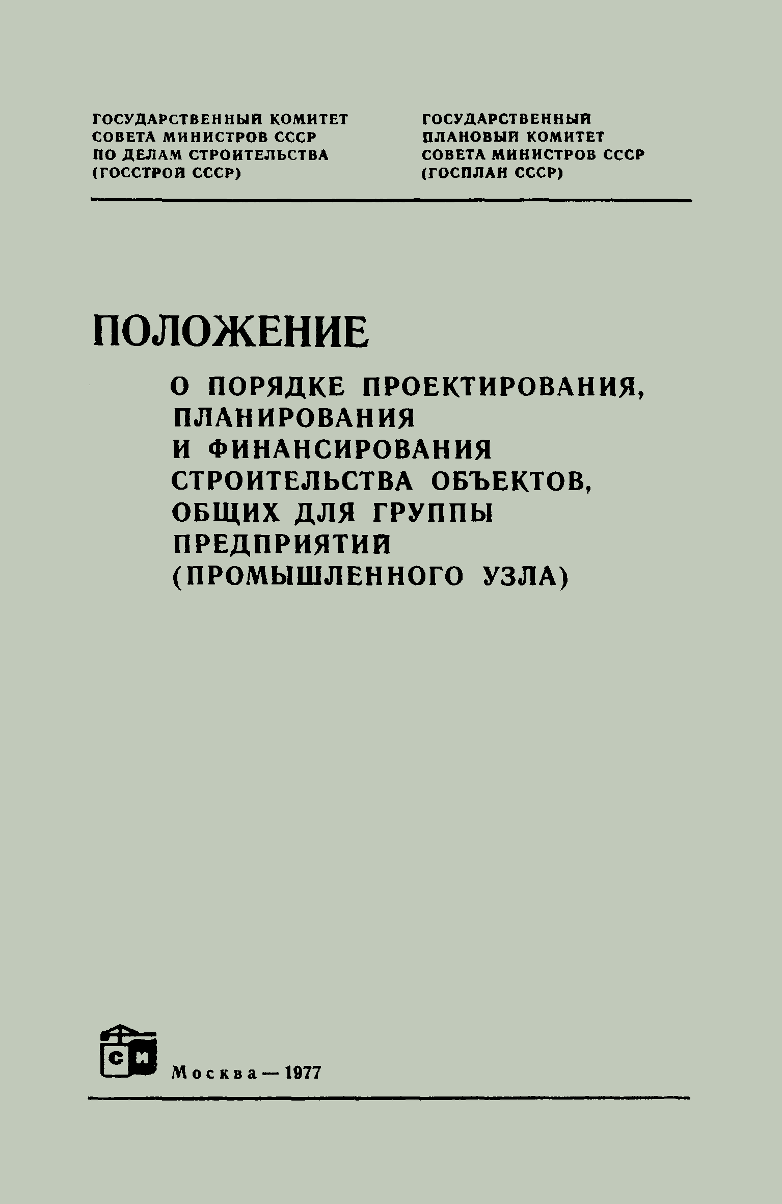 Положение о порядке проектирования, планирования и финансирования строительства объектов общих для группы предприятий (промышленного узла)| Статус: | справочные материалы, мп, тпр | | Название рус.: | Положение о порядке проектирования, планирования и финансирования строительства объектов общих для группы предприятий (промышленного узла) | | Дата добавления в базу: | 01.01.2021 | | Дата актуализации: | 01.01.2021 | | Область применения: | Положение устанавливает порядок проектирования, планирования и финансирования строительства объектов, общих для группы предприятий (промышленного узла). | | Утверждён: | 12.04.1976 Государственный комитет Совета Министров СССР по делам строительства (40/35) Государственный плановый комитет Совета Министров СССР