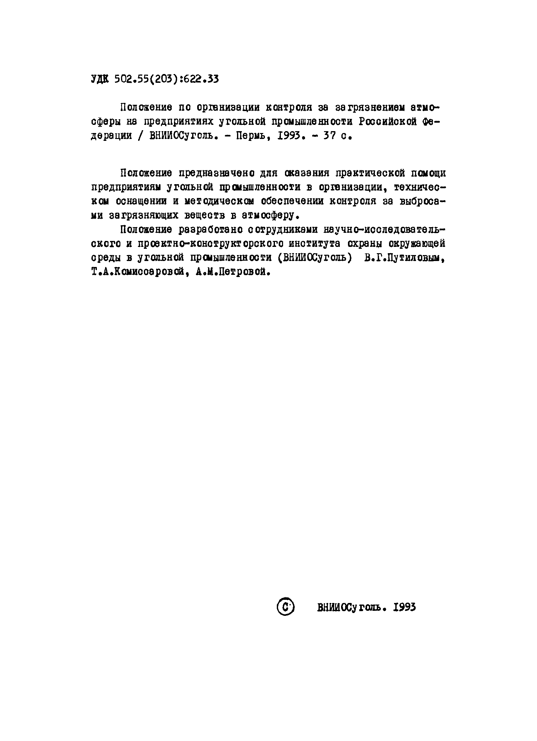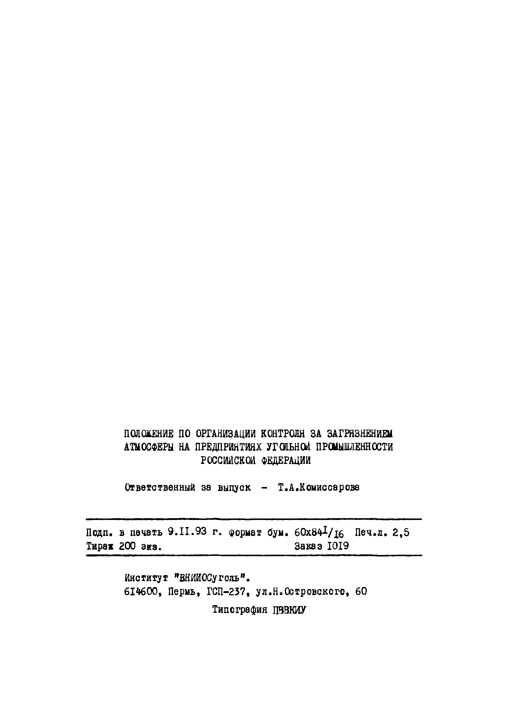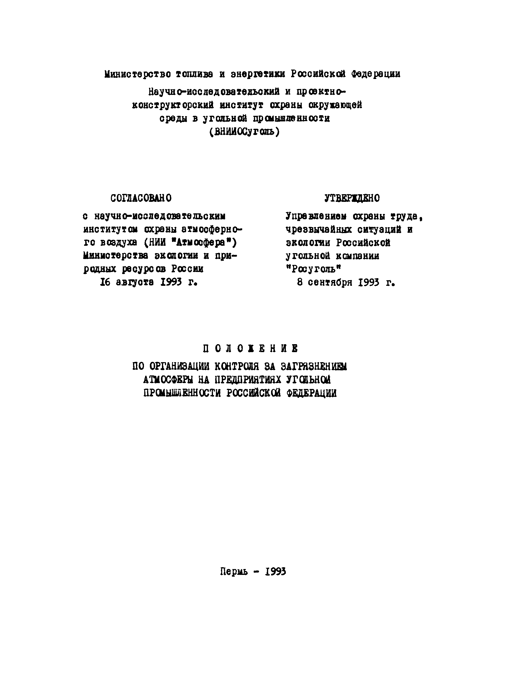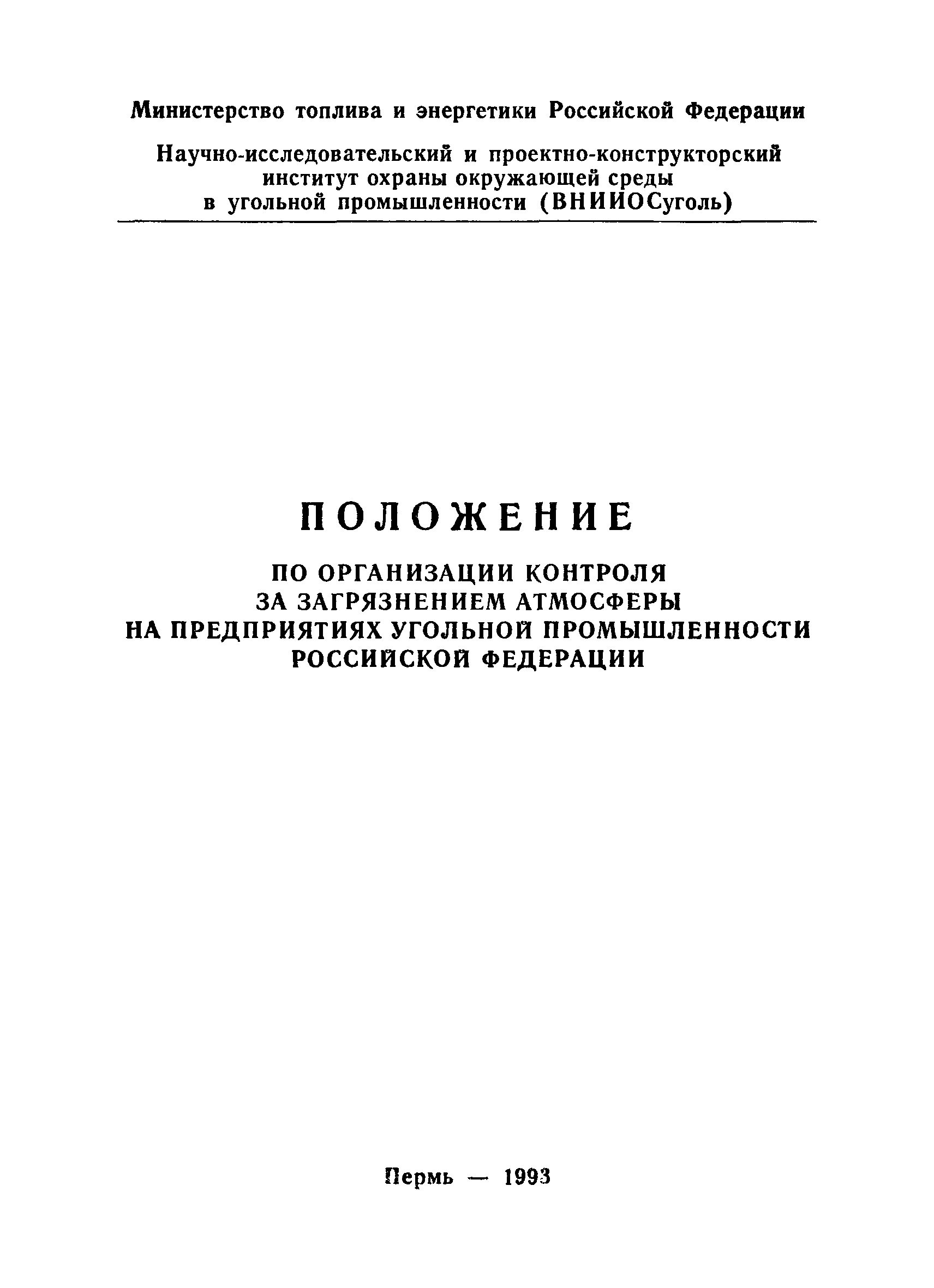 | Название рус.: | Положение по организации контроля за загрязнением атмосферы на предприятиях угольной промышленности Российской Федерации |