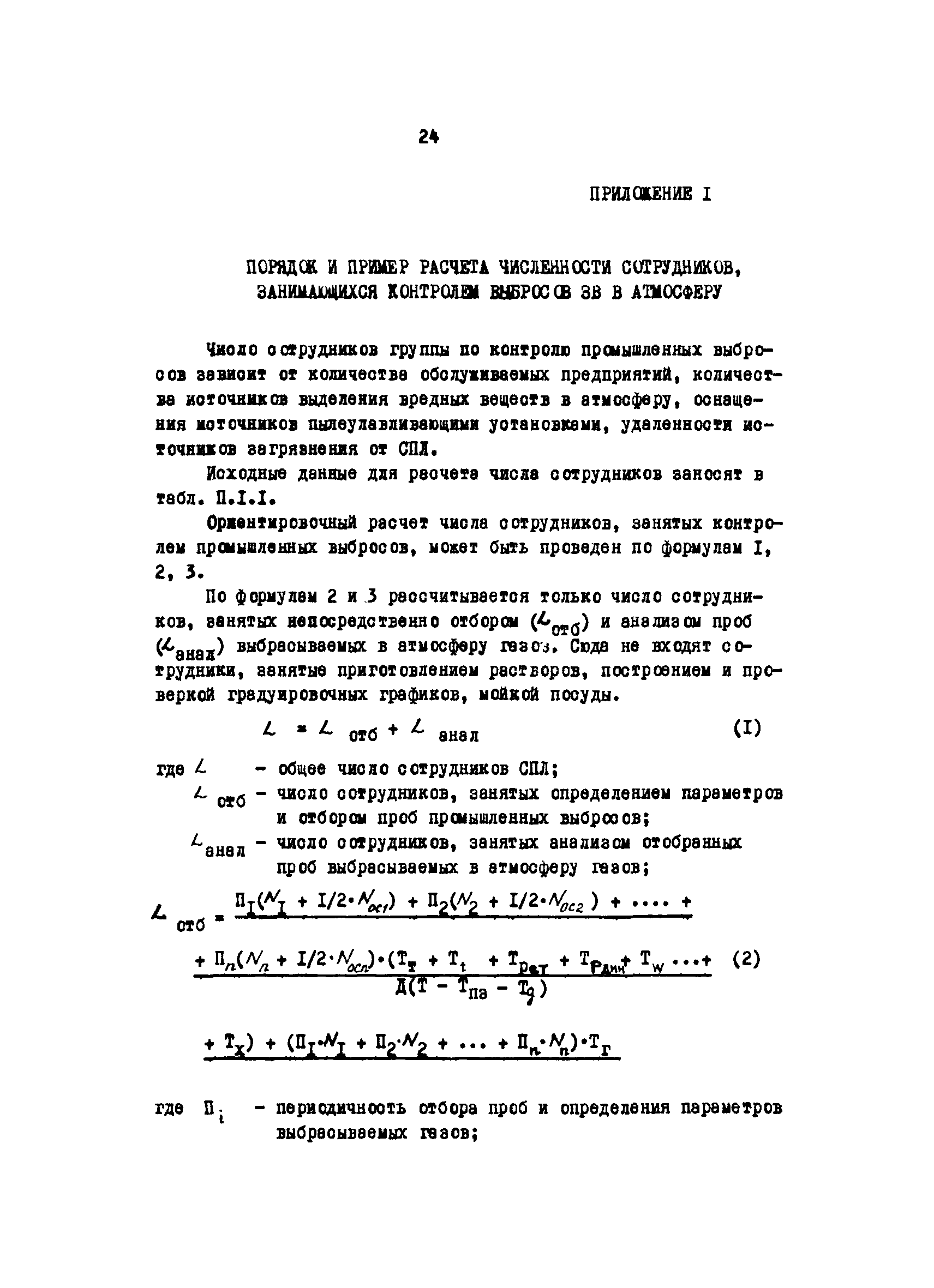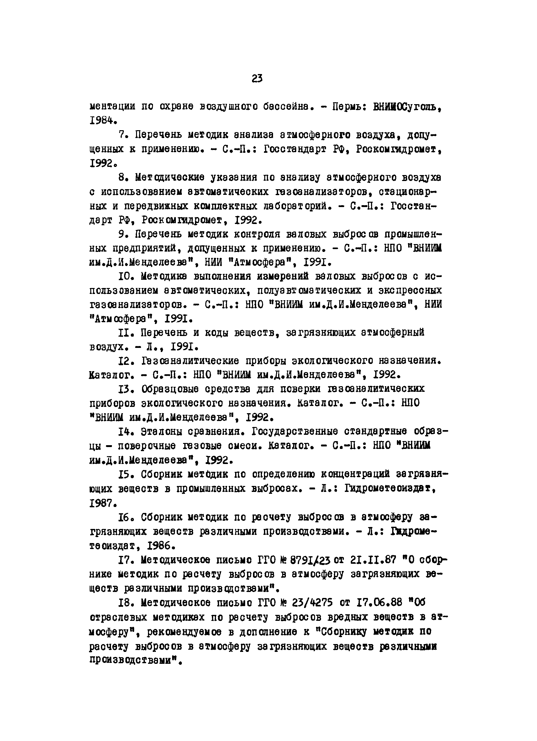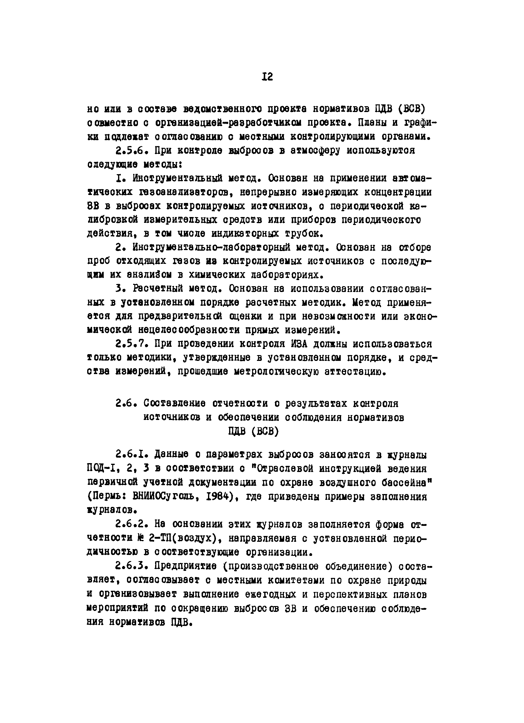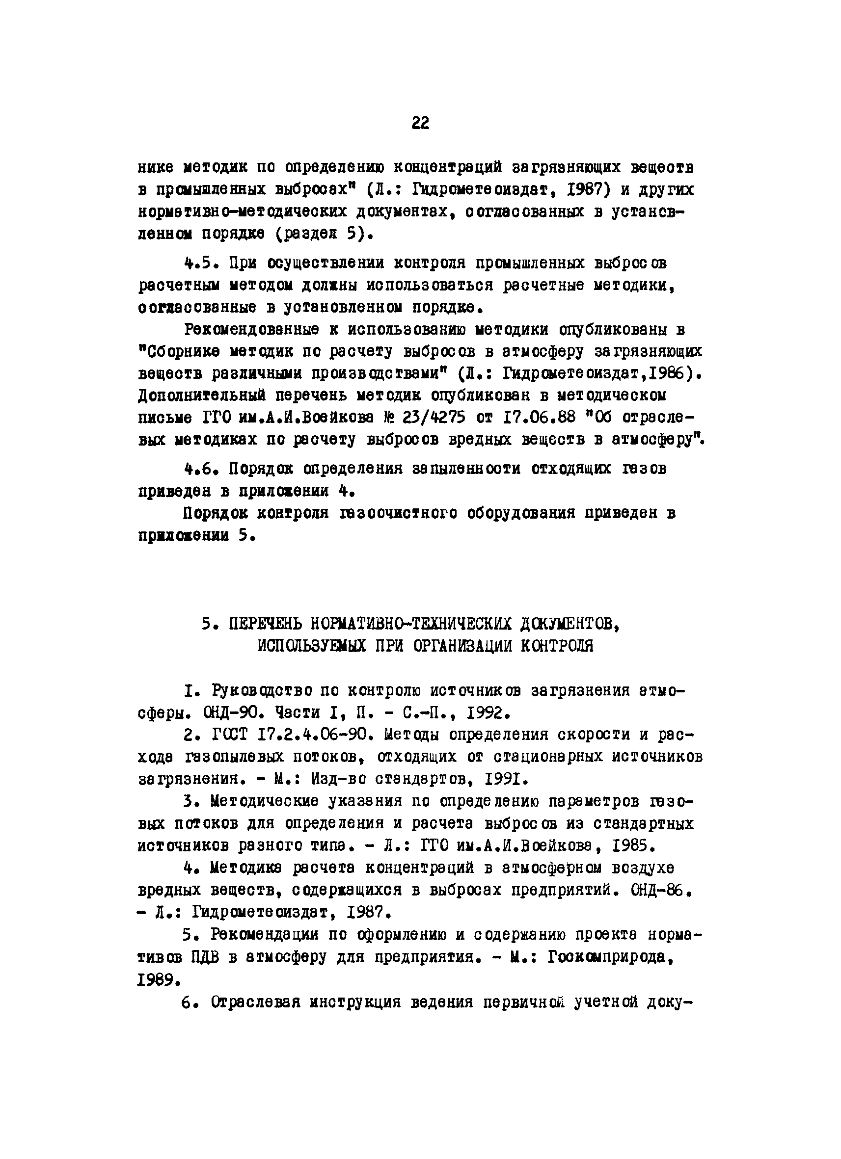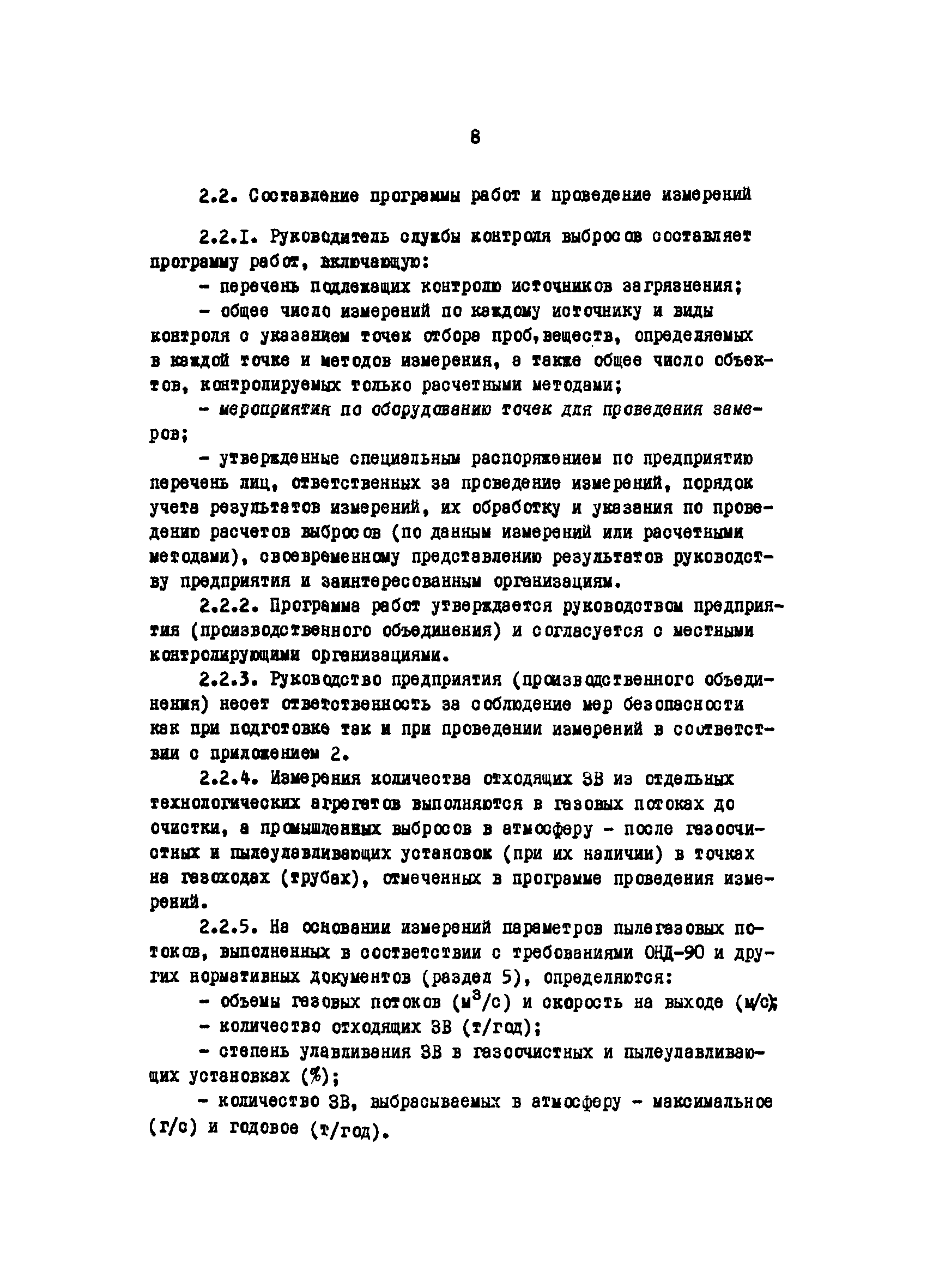 | Оглавление: | 1. Общие положения 2. Организация работ по контролю за выбросами на предприятиях 2.1. Создание службы контроля промышленных выбросов 2.2. Составление программы работ и проведение измерений 2.3. Выбор точек отбора проб 2.4. Определение перечня ЗВ и ИЗА, подлежащих контролю 2.5. Определение необходимого числа плановых измерений на ИЗА и выбор метода контроля 2.6. Составление отчетности о результатах контроля источников и обспечении соблюдения нормативов ПДВ (ВСВ) 3. Структура отраслевого контроля 4. Перечень применяемых методов и средств контроля выбросов загрязняющих веществ в атмосферу 5. Перечень нормативно-технических документов, используемых при организации контроля Приложение 1 Порядок и пример расчета численности сотрудников, занимающихся контролем выбросов ВЗ в атмосферу Приложение 2 Техника безопасности при проведении измерений Приложение 3 Пример расчета необходимого числа плановых измерений на ИЗА Приложение 4 Порядок определения запыленности отходящих газов на организованных ИЗА Приложение 5 Порядок контроля газоочистного оборудования |