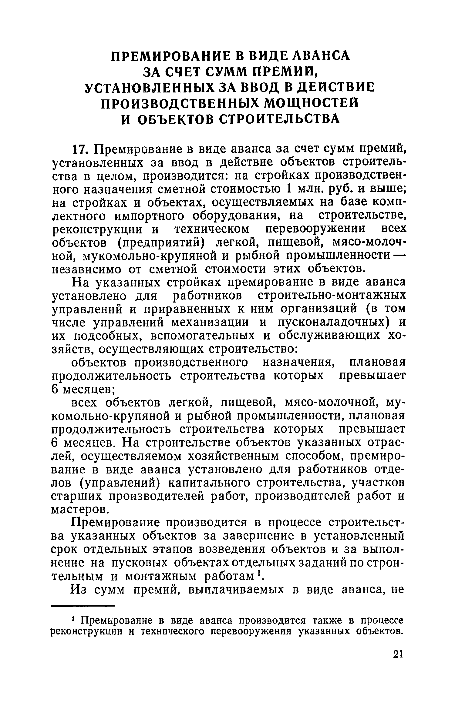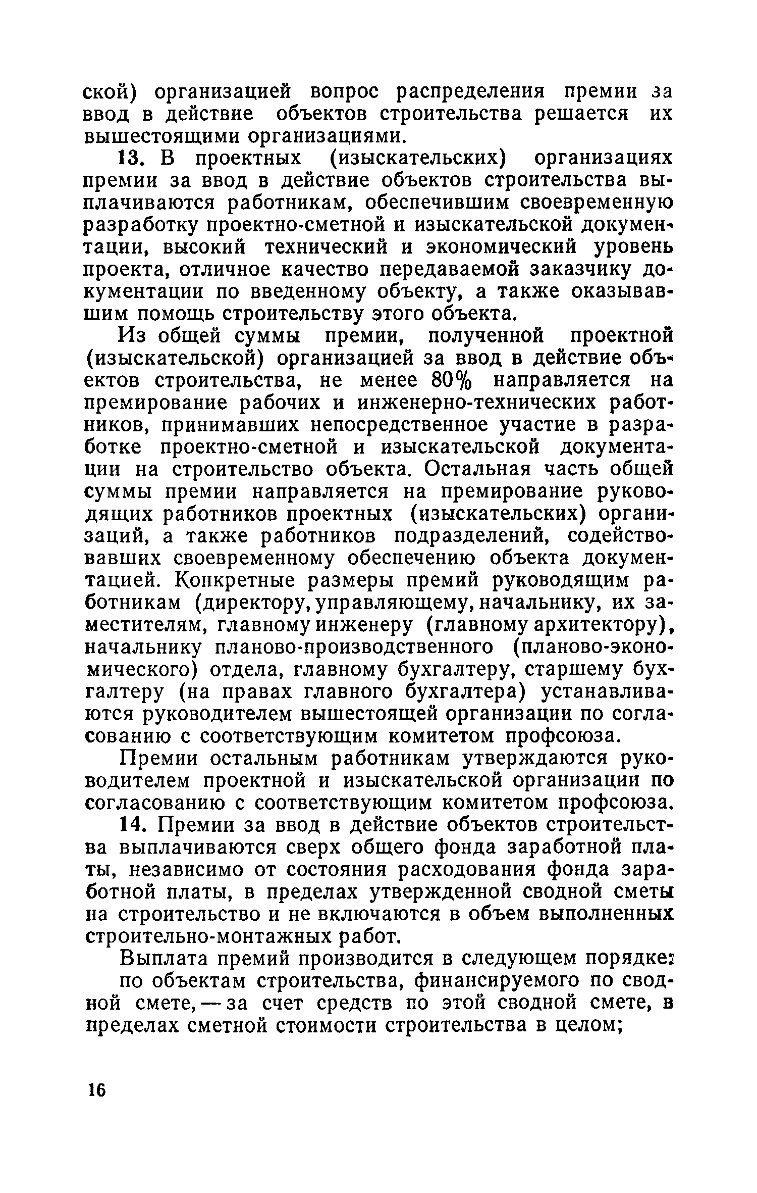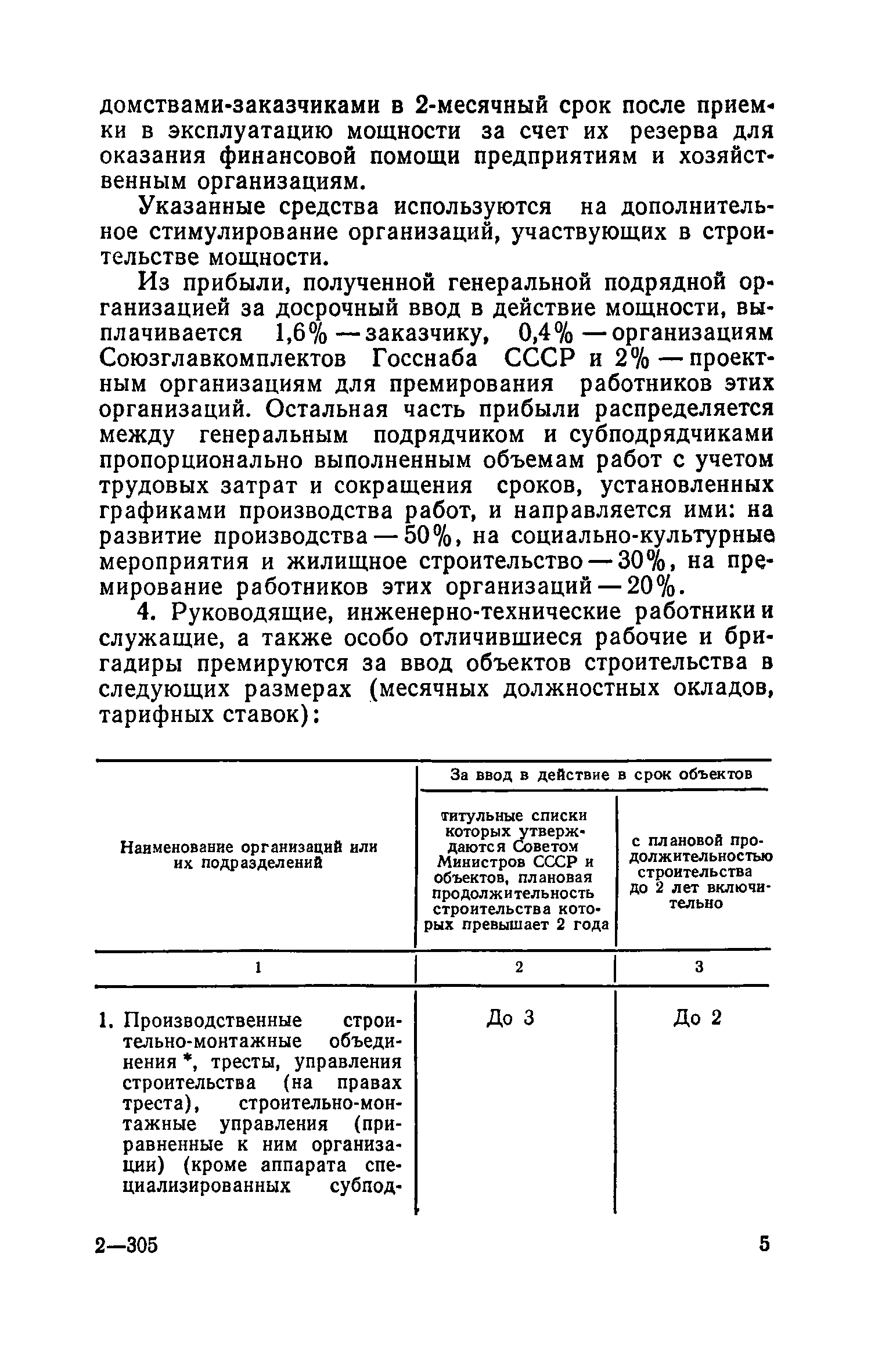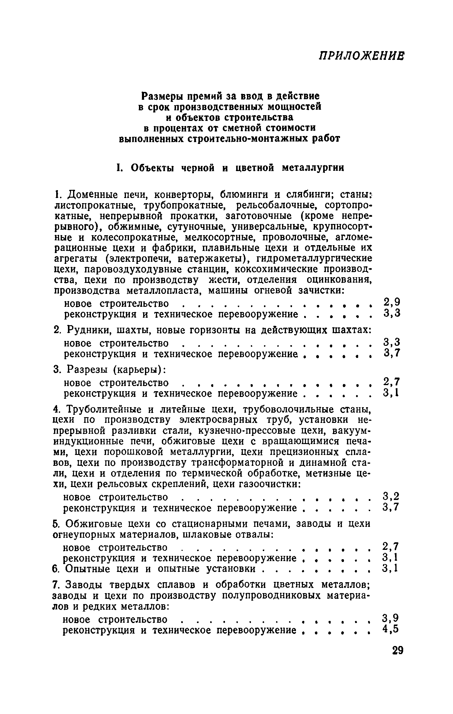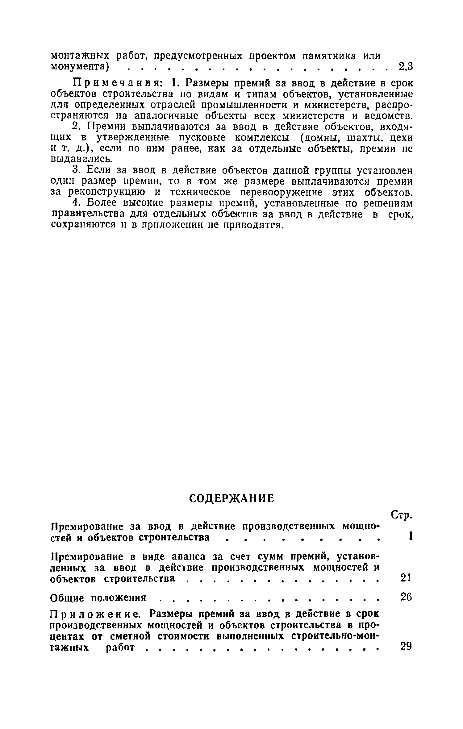 | Оглавление: | Премирование за ввод в действие производственных мощностей и объектов строительства Премирование в виде аванса за счет сумм премий, установленных за ввод в действие производственных мощностей и объектов строительства Общие положения Приложение. Размеры премий за ввод в действие в срок производственных мощностей и объектов строительства в процентах от сметной стоимости выполненных строительно-монтажных работ |