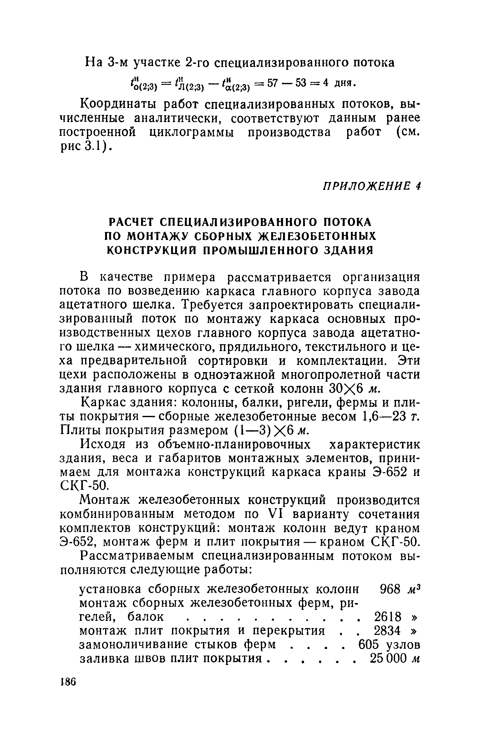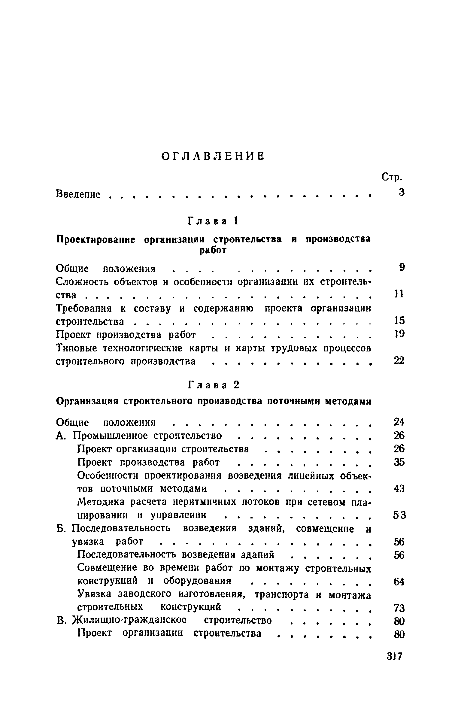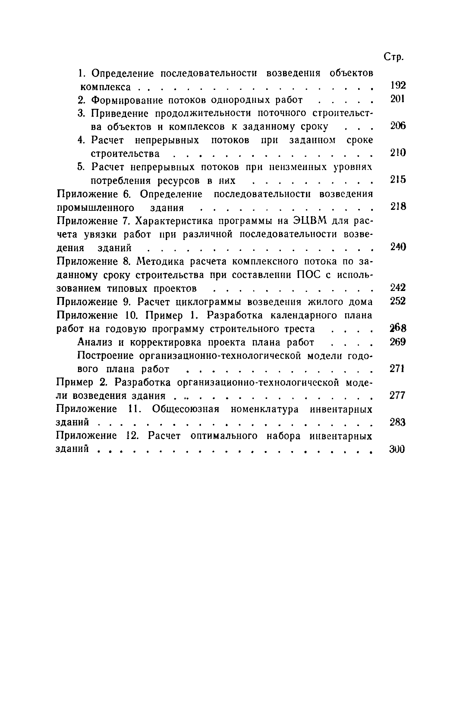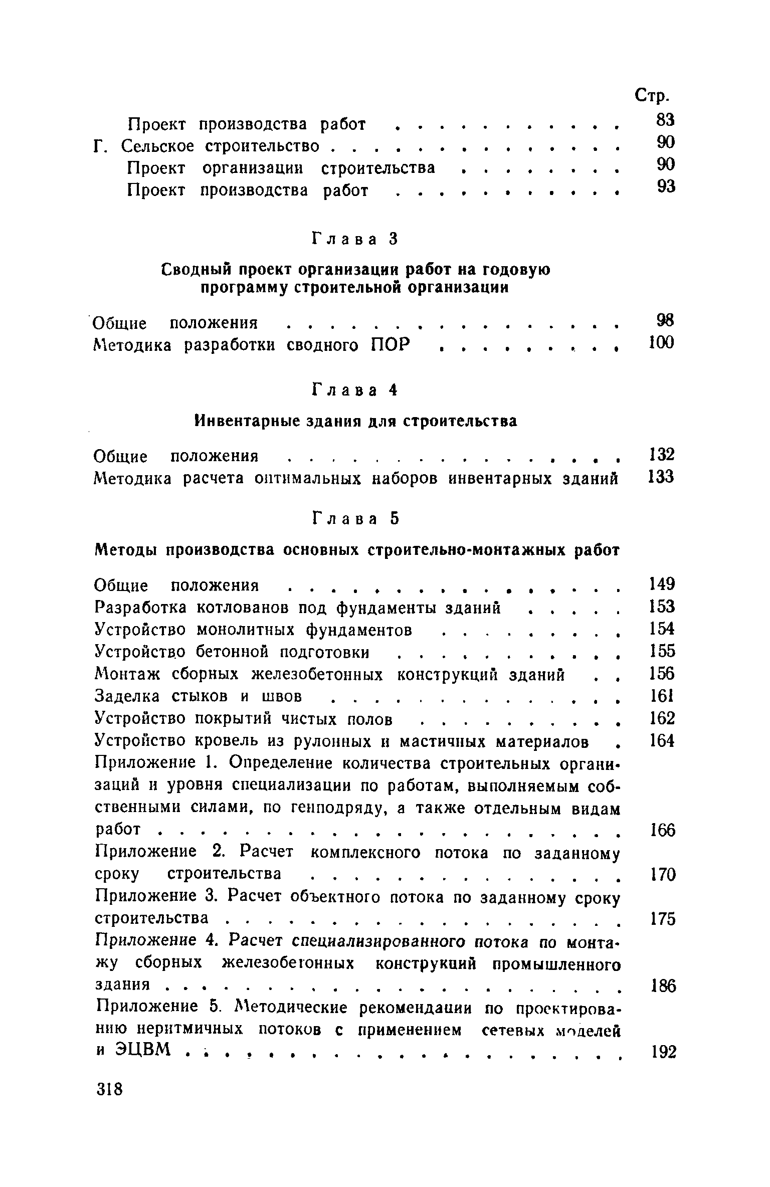 | Оглавление: | Введение Глава 1. Проектирование организации строительства и производства работ Глава 2. Организация строительного производства поточными методами Глава 3. Сводный проект организации работ на годовую программу строительной организации Глава 4. Инвентарные здания для строительства Глава 5. Методы производства основных строительно-монтажных работ Приложение 1. Определение количества строительных организаций и уровня специализации по работам, выполняемым собственными силами, по генподряду, а также отдельным видам работ Приложение 2. Расчет комплексного потока по заданному сроку строительства Приложение 3. Расчет объектного потока по заданному сроку строительства Приложение 4. Расчет специализированного потока по монтажу сборных железобетонных конструкций промышленного здания Приложение 5. Методические рекомендации по проектированию неритмичных потоков с применением сетевых моделей и ЭЦВМ 1. Определение последовательности возведения объектов комплекса 2. Формирование потоков однородных работ 3. Приведение продолжительности поточного строительства объектов и комплексов к заданному сроку 4. Расчет непрерывных потоков при заданном сроке строительства 5. Расчет непрерывных потоков при неизменных уровнях потребления ресурсов в них Приложение 6. Определение последовательности возведения промышленного здания Приложение 7. Характеристика программы на ЭЦВМ для расчета увязки работ при различной последовательности возведения зданий Приложение 8. Методика расчета комплексного потока по заданному сроку строительства при составлении ПОС с использованием типовых проектов Приложение 9. Расчет циклограммы возведения жилого дома Приложение 10. Пример 1. Разработка календарного плана работ на годовую программу строительного треста Анализ и корректировка проекта плана работ Построение организационно-технологической модели годового плана работ Пример 2. Разработка организационно-технологической модели возведения здания Приложение 11. Общесоюзная номенклатура инвентарных зданий Приложение 12. Расчет оптимального набора инвентарных зданий |