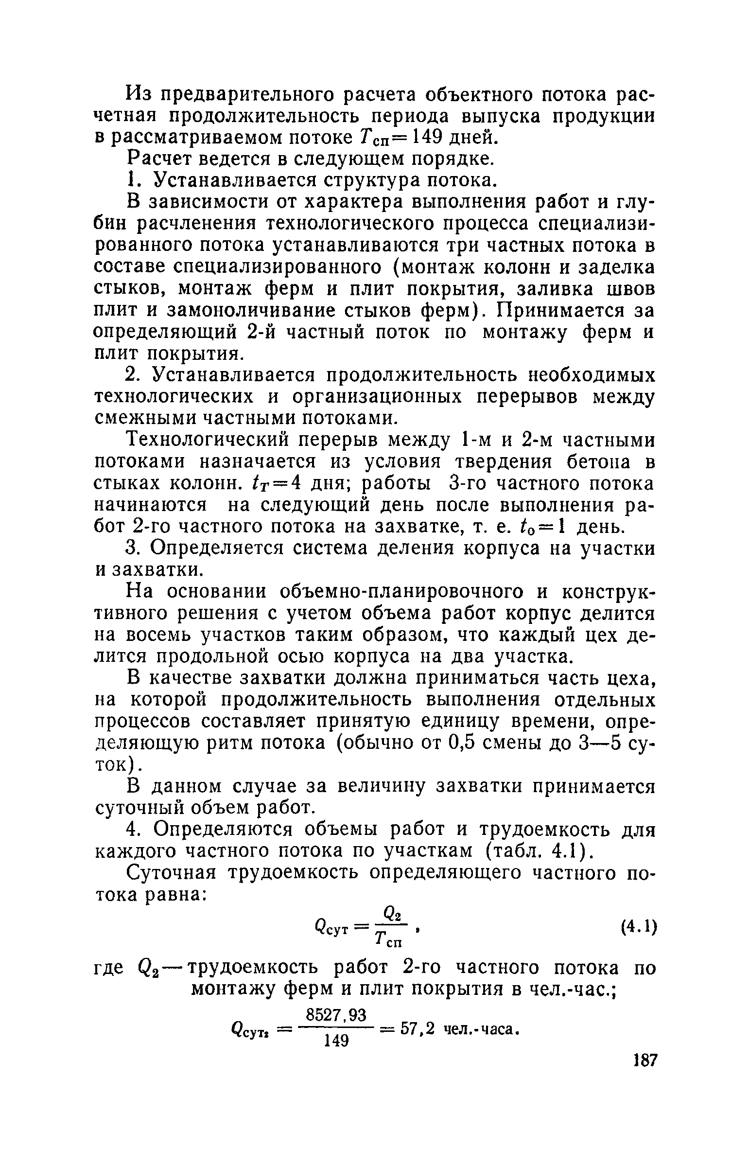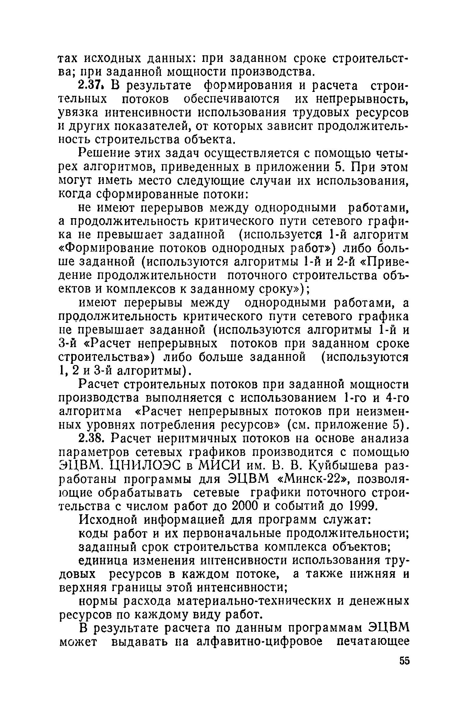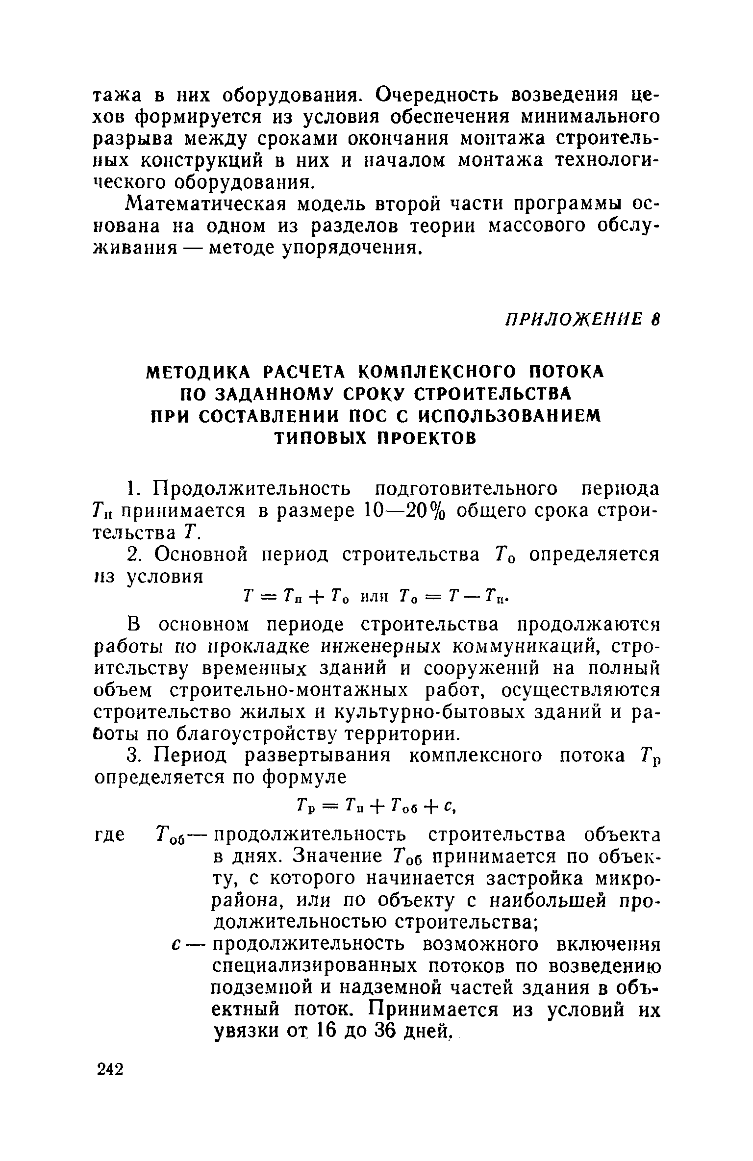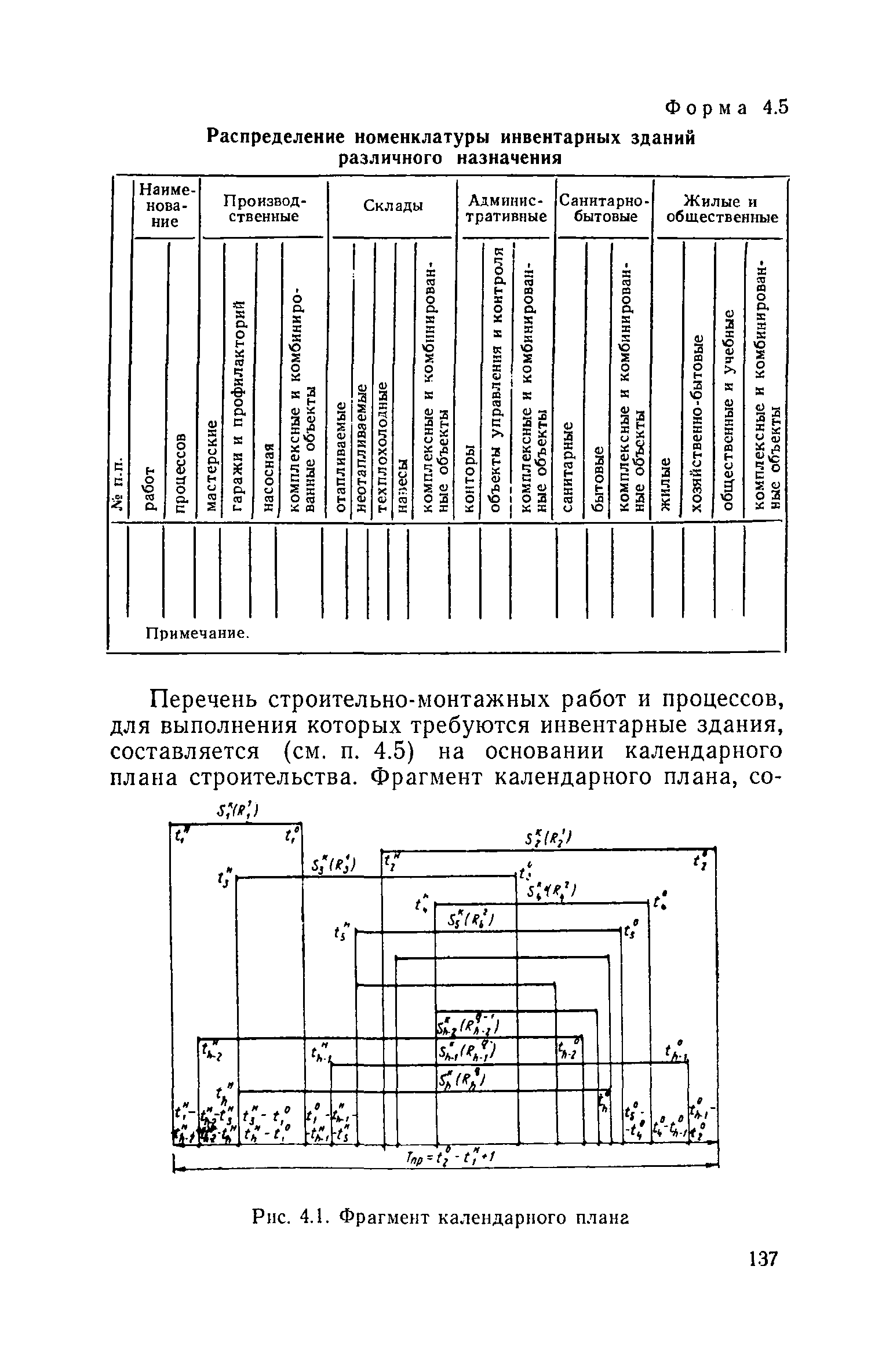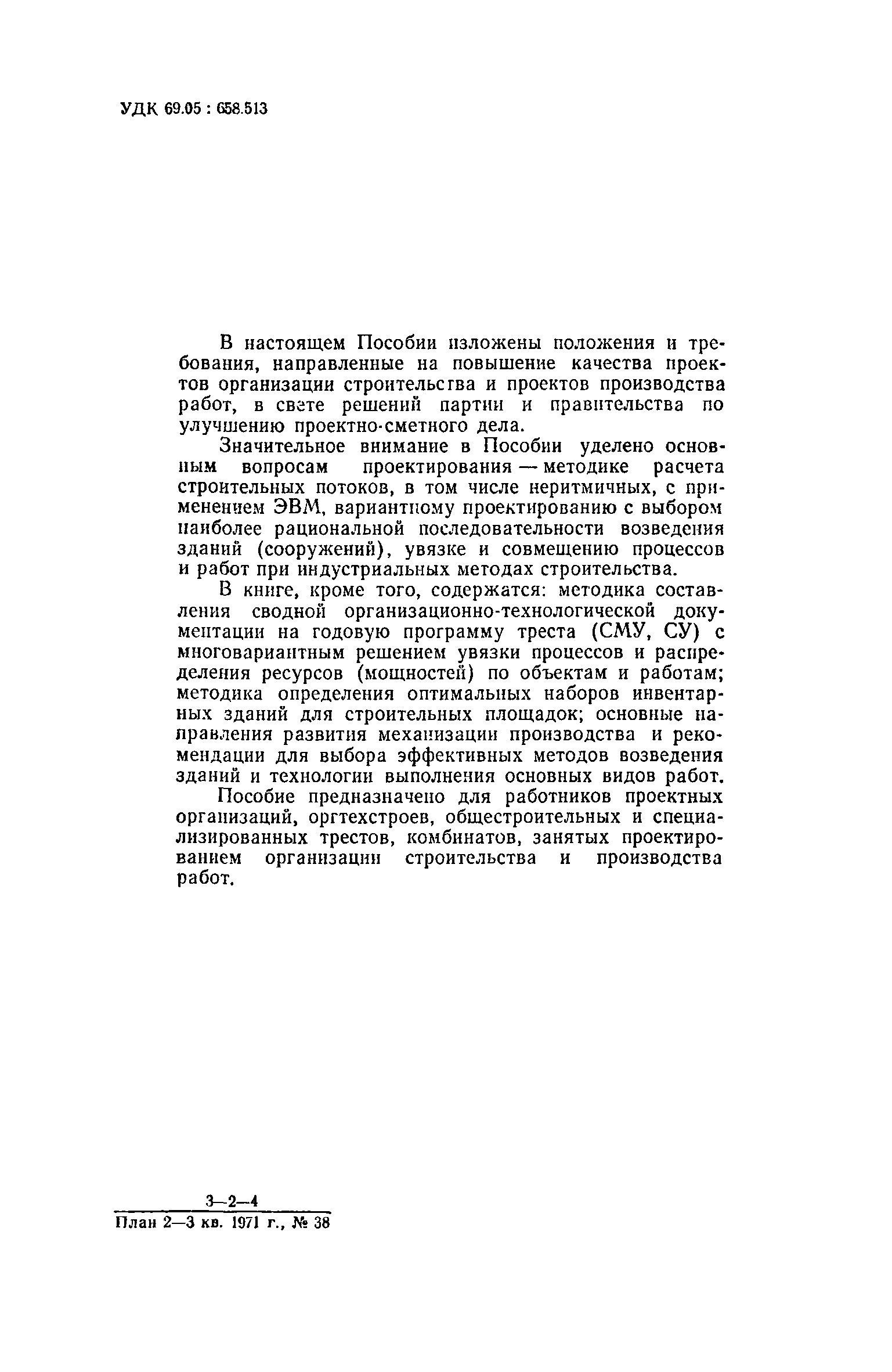 | Оглавление: | Введение Глава 1. Проектирование организации строительства и производства работ Глава 2. Организация строительного производства поточными методами Глава 3. Сводный проект организации работ на годовую программу строительной организации Глава 4. Инвентарные здания для строительства Глава 5. Методы производства основных строительно-монтажных работ Приложение 1. Определение количества строительных организаций и уровня специализации по работам, выполняемым собственными силами, по генподряду, а также отдельным видам работ Приложение 2. Расчет комплексного потока по заданному сроку строительства Приложение 3. Расчет объектного потока по заданному сроку строительства Приложение 4. Расчет специализированного потока по монтажу сборных железобетонных конструкций промышленного здания Приложение 5. Методические рекомендации по проектированию неритмичных потоков с применением сетевых моделей и ЭЦВМ 1. Определение последовательности возведения объектов комплекса 2. Формирование потоков однородных работ 3. Приведение продолжительности поточного строительства объектов и комплексов к заданному сроку 4. Расчет непрерывных потоков при заданном сроке строительства 5. Расчет непрерывных потоков при неизменных уровнях потребления ресурсов в них Приложение 6. Определение последовательности возведения промышленного здания Приложение 7. Характеристика программы на ЭЦВМ для расчета увязки работ при различной последовательности возведения зданий Приложение 8. Методика расчета комплексного потока по заданному сроку строительства при составлении ПОС с использованием типовых проектов Приложение 9. Расчет циклограммы возведения жилого дома Приложение 10. Пример 1. Разработка календарного плана работ на годовую программу строительного треста Анализ и корректировка проекта плана работ Построение организационно-технологической модели годового плана работ Пример 2. Разработка организационно-технологической модели возведения здания Приложение 11. Общесоюзная номенклатура инвентарных зданий Приложение 12. Расчет оптимального набора инвентарных зданий |