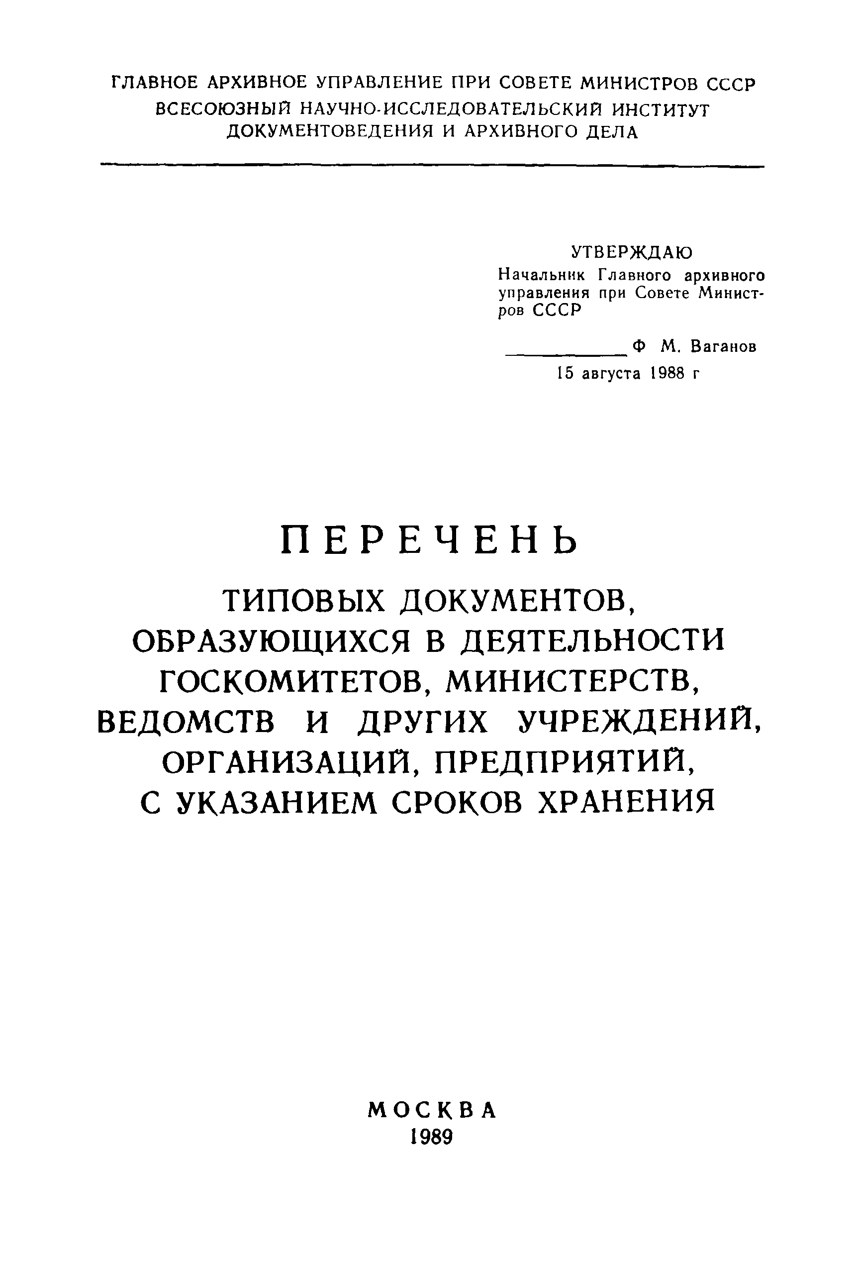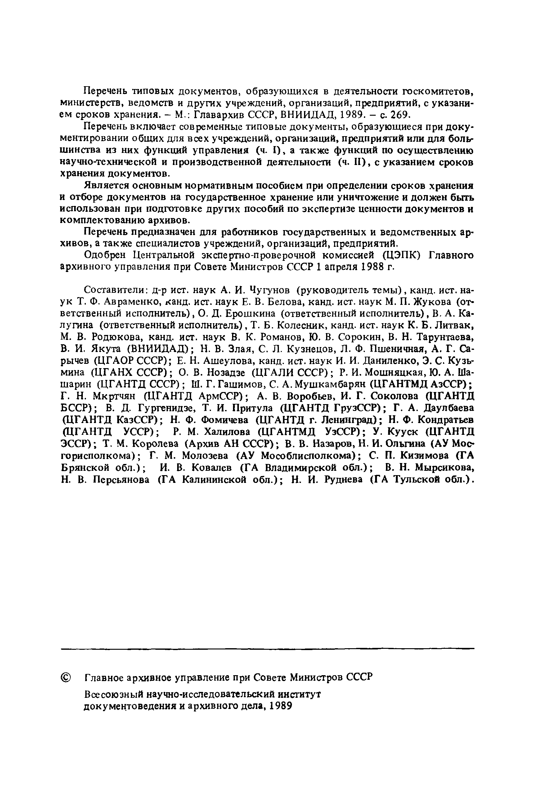 | | Утверждён: | 15.08.1988 Главное архивное управление при СМ СССР (National Archives Administration at the USSR Cabinet of Ministers )