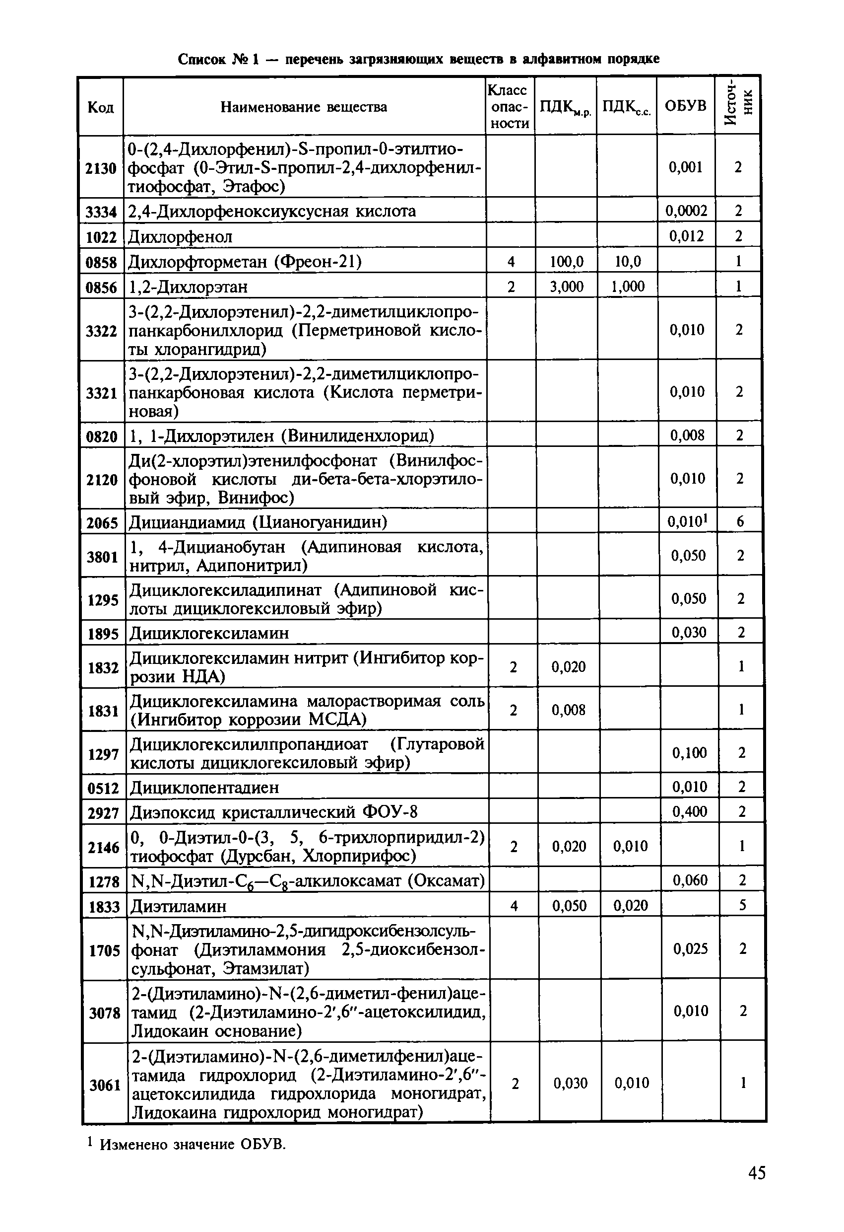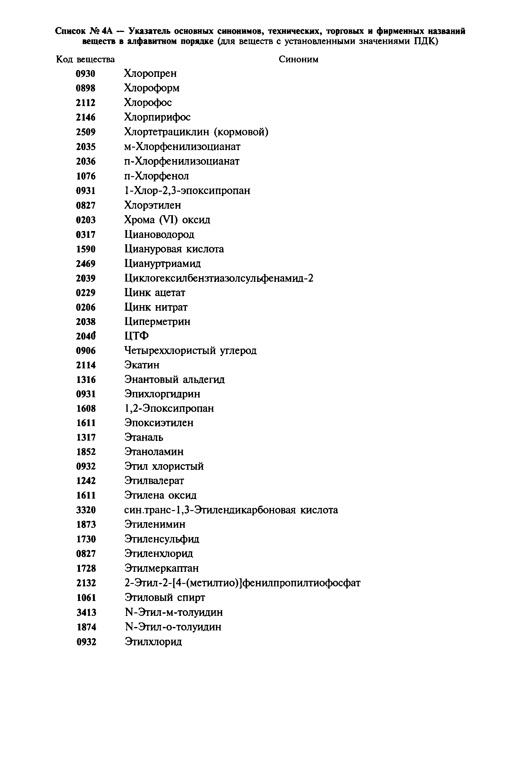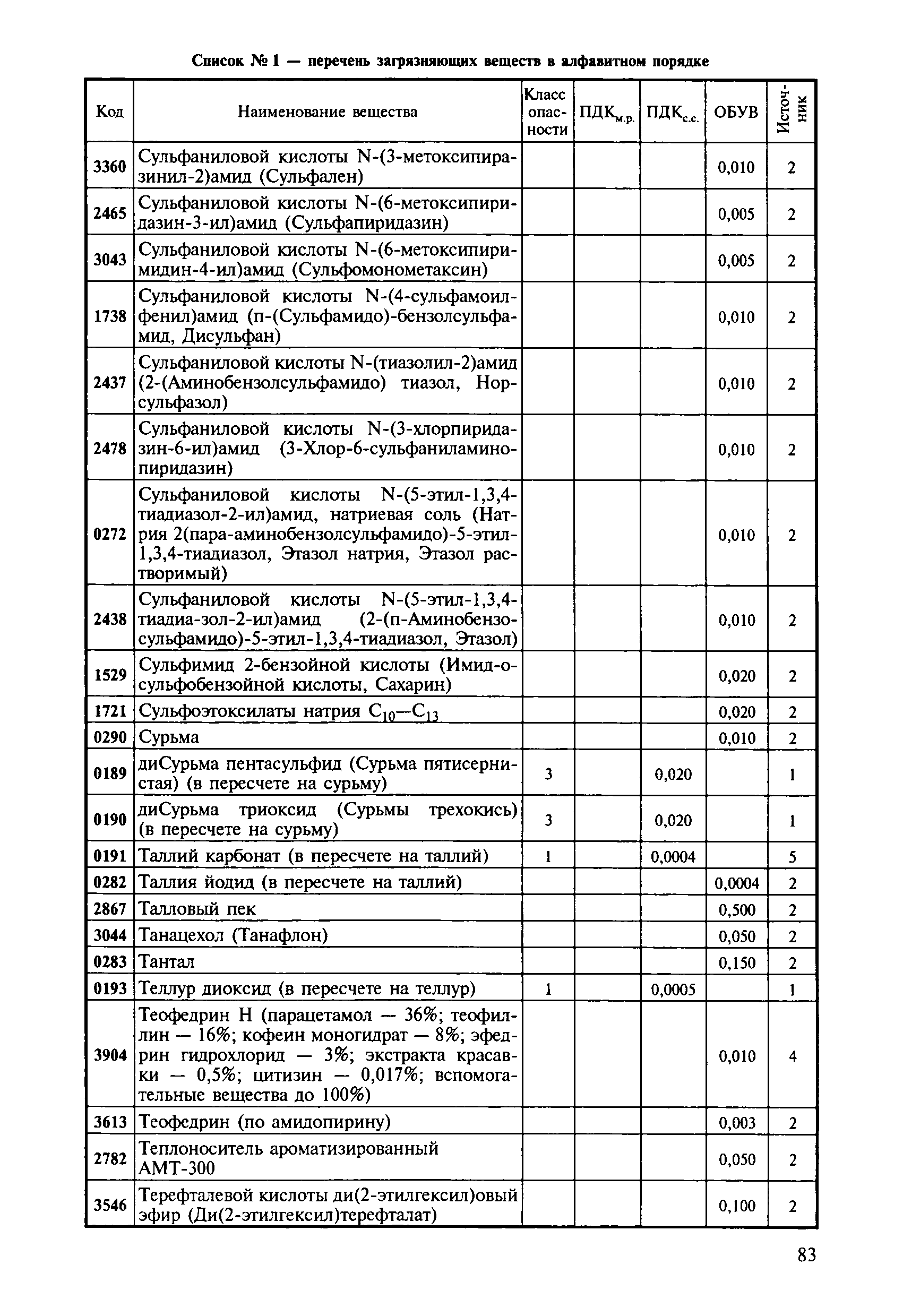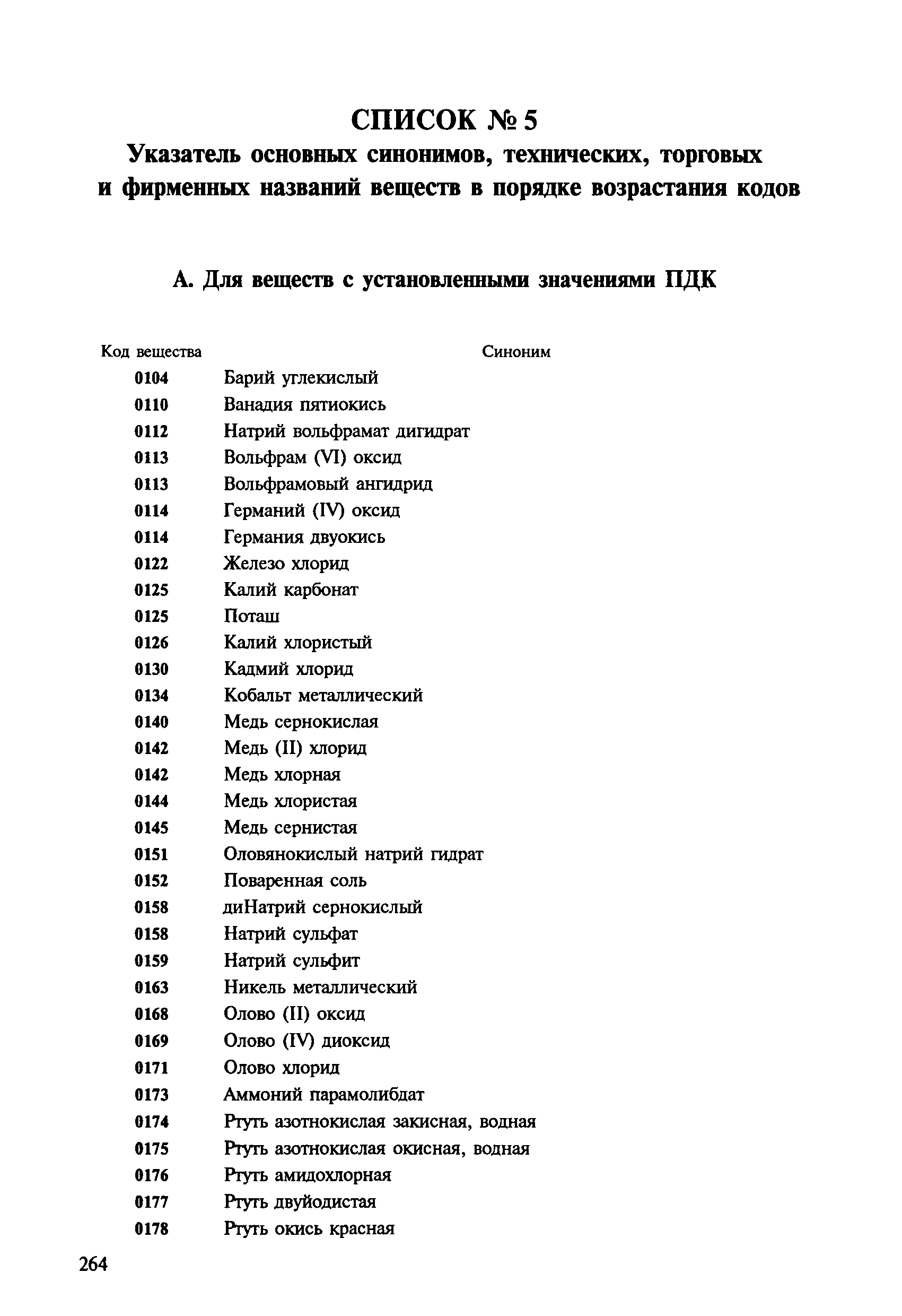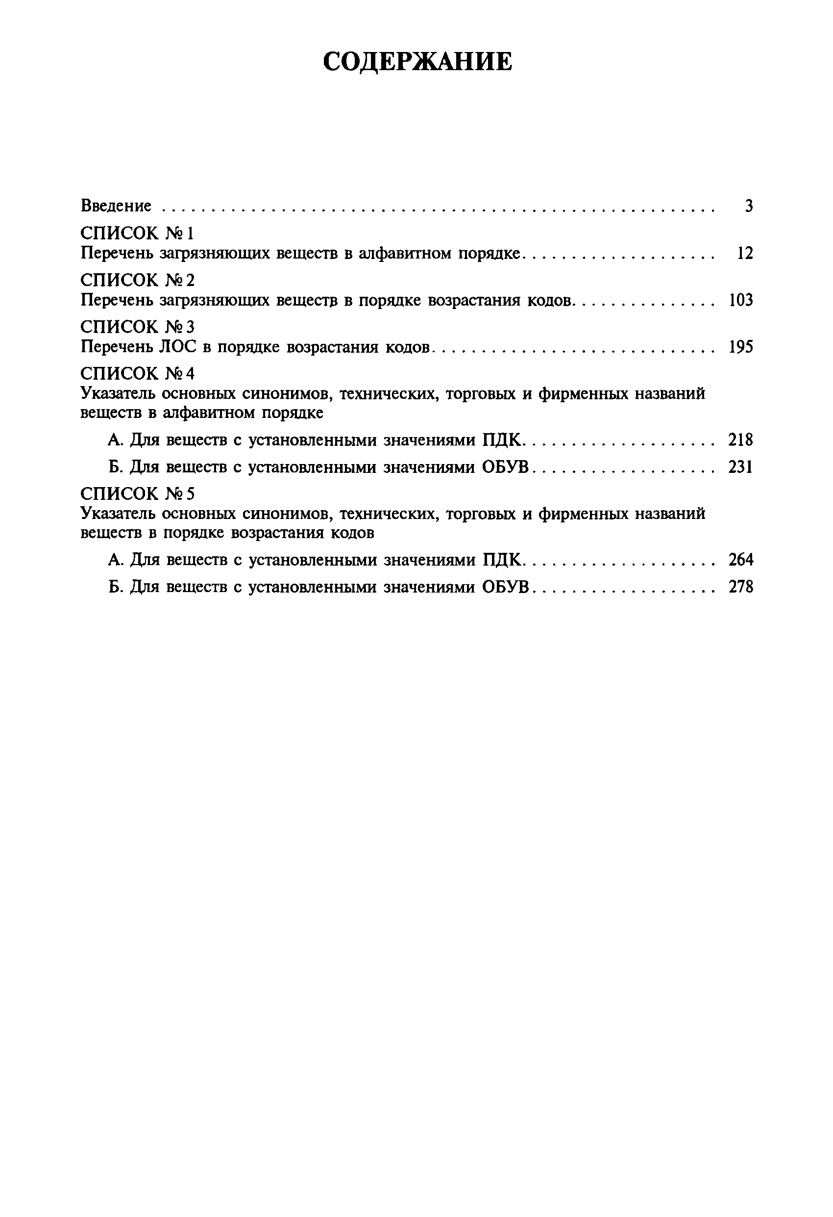 | Оглавление: | Список № 1 Перечень загрязняющих веществ в алфавитном порядке Список № 2 Перечень загрязняющих веществ в порядке возрастания кодов Список № 3 Перечень ЛОС в порядке возрастания кодов Список № 4 Указатель основных синонимов, технических, торговых и фирменных названий веществ в алфавитном порядке А. Для веществ с установленными значениями ПДК Б. Для веществ с установленными значениями ОБУВ Список № 5 Указатель основных синонимов, технических, торговых и фирменных названий веществ в порядке возрастания кодов А. Для веществ с установленными значениями ПДК Б. Для веществ с установленными значениями ОБУВ |