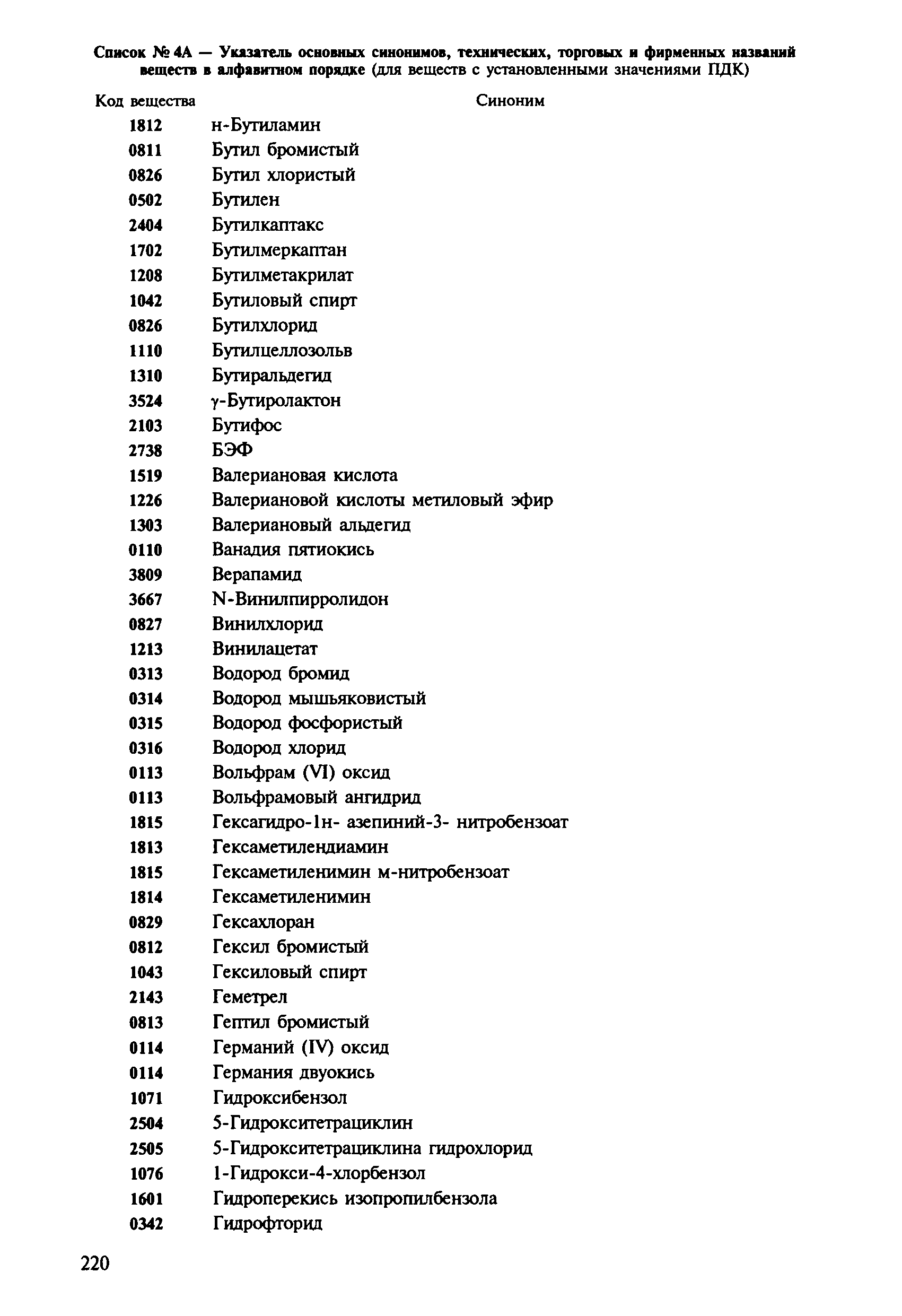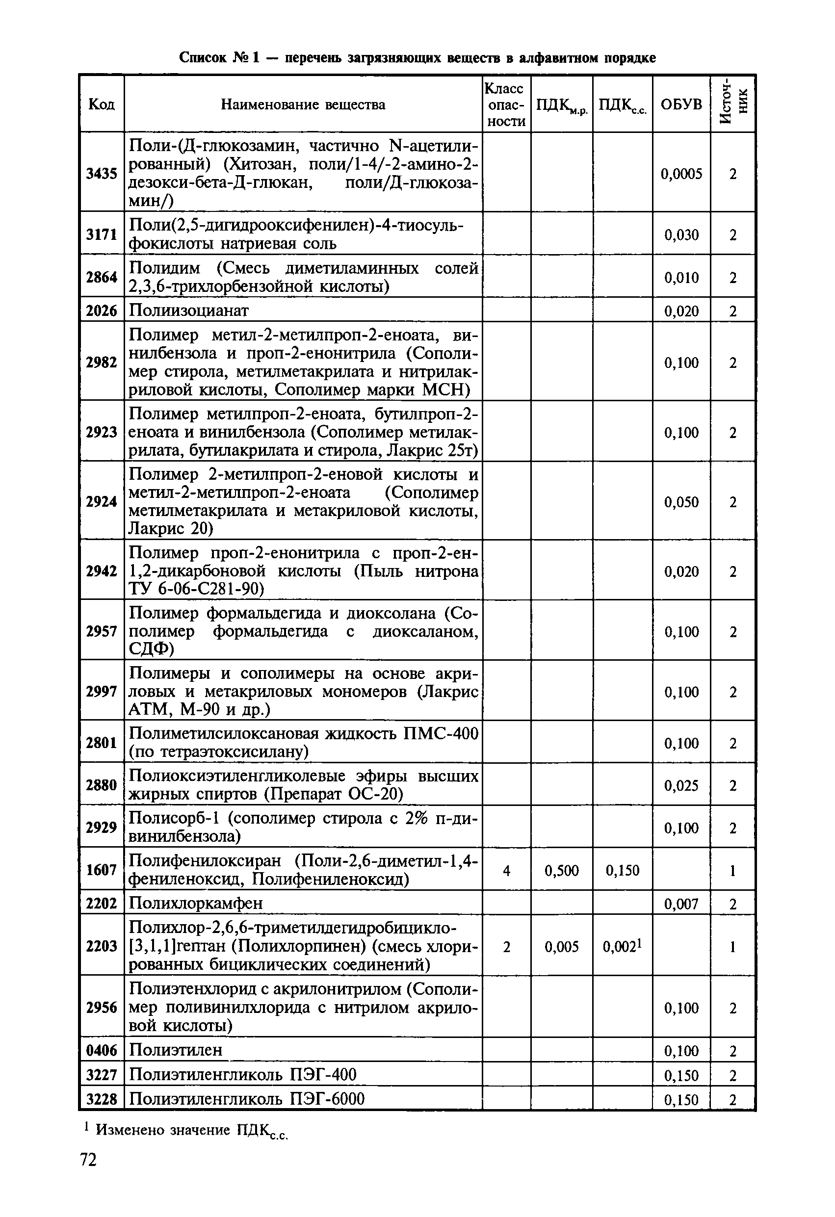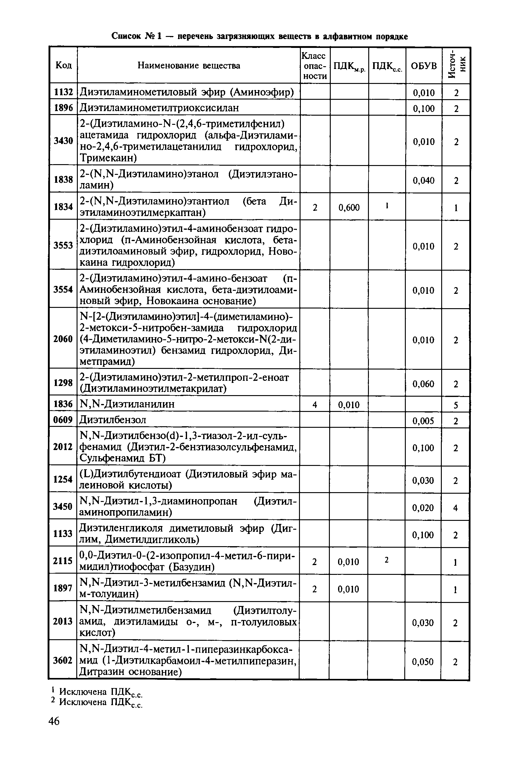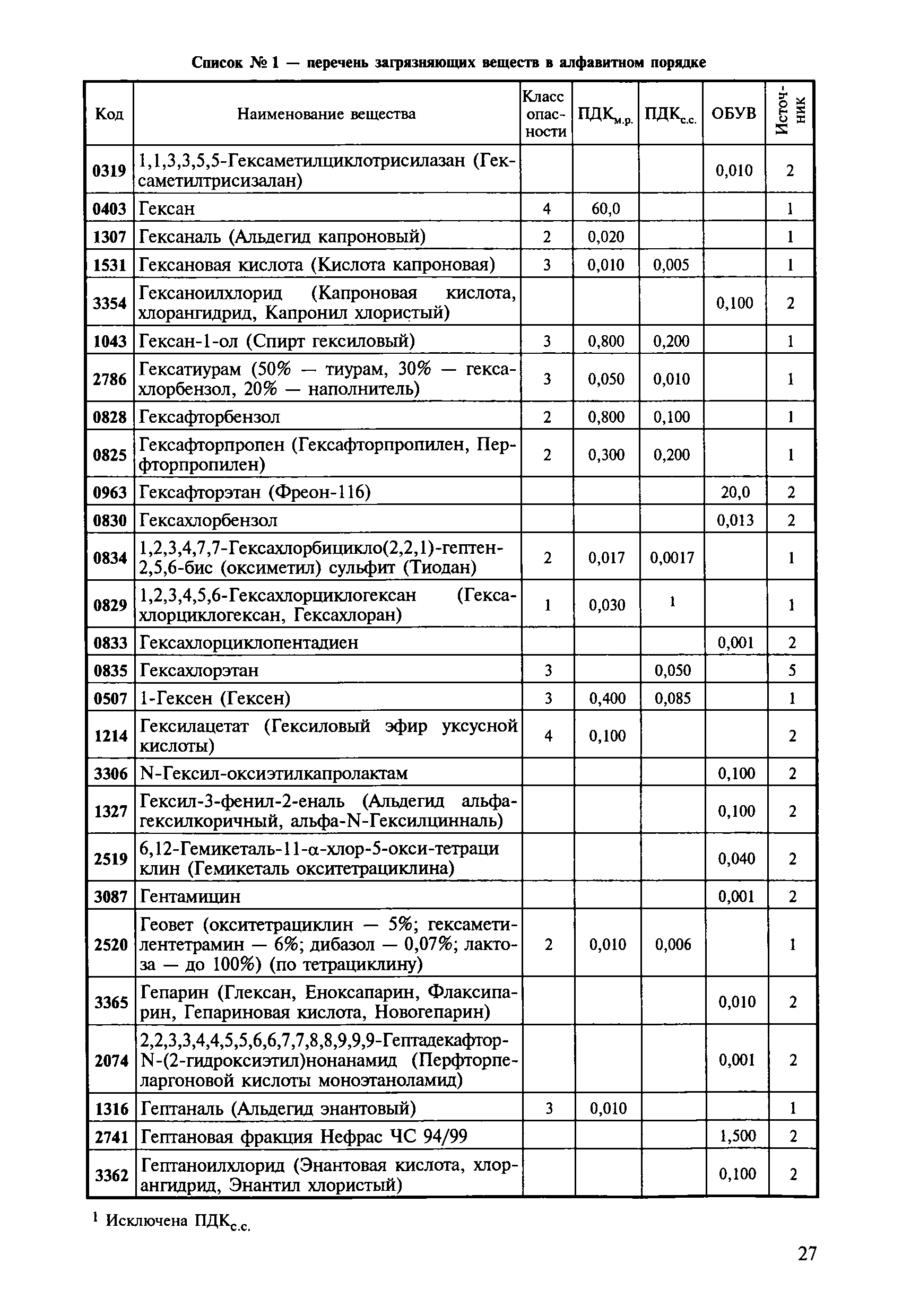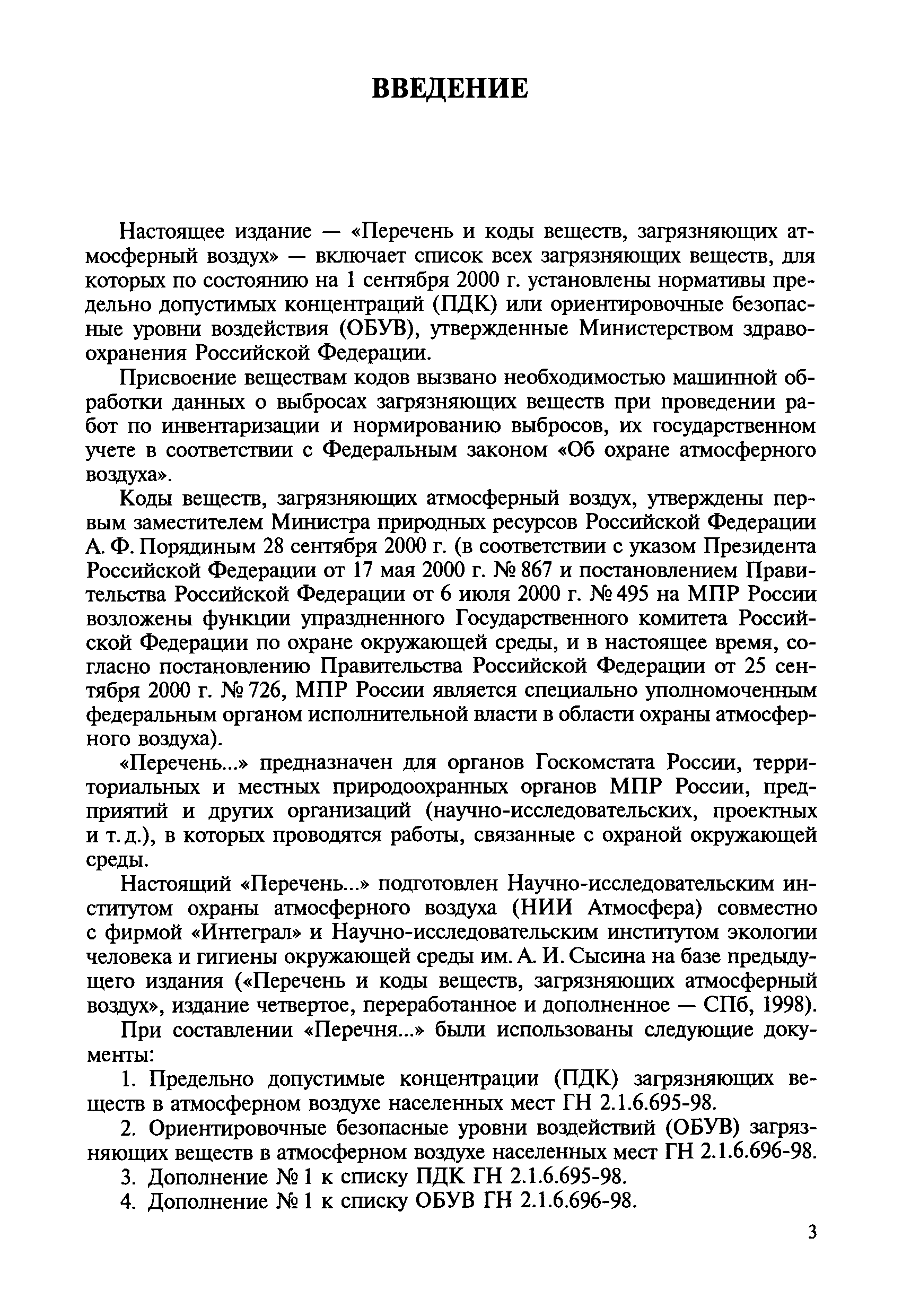 | Оглавление: | Список № 1 Перечень загрязняющих веществ в алфавитном порядке Список № 2 Перечень загрязняющих веществ в порядке возрастания кодов Список № 3 Перечень ЛОС в порядке возрастания кодов Список № 4 Указатель основных синонимов, технических, торговых и фирменных названий веществ в алфавитном порядке А. Для веществ с установленными значениями ПДК Б. Для веществ с установленными значениями ОБУВ Список № 5 Указатель основных синонимов, технических, торговых и фирменных названий веществ в порядке возрастания кодов А. Для веществ с установленными значениями ПДК Б. Для веществ с установленными значениями ОБУВ |
