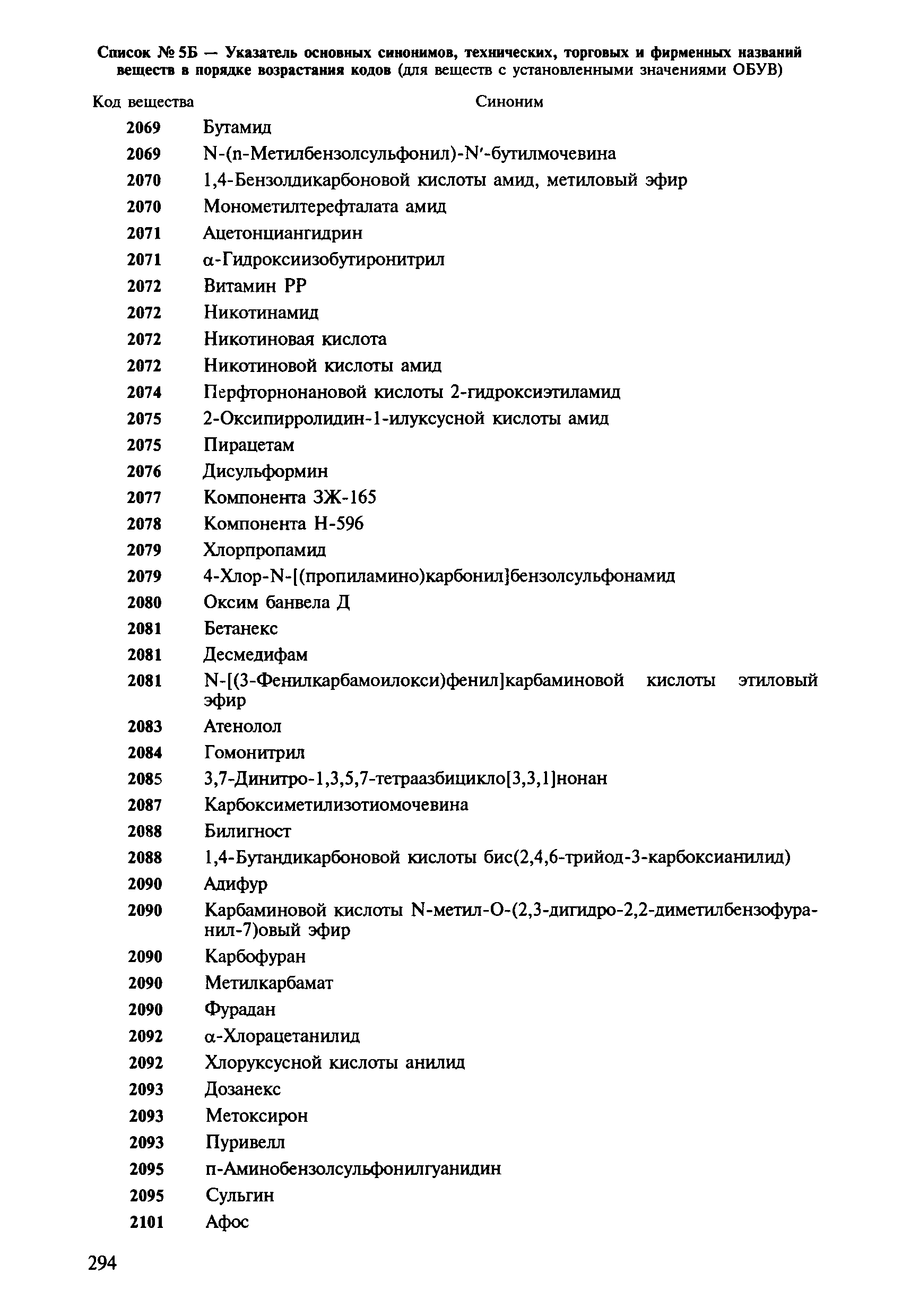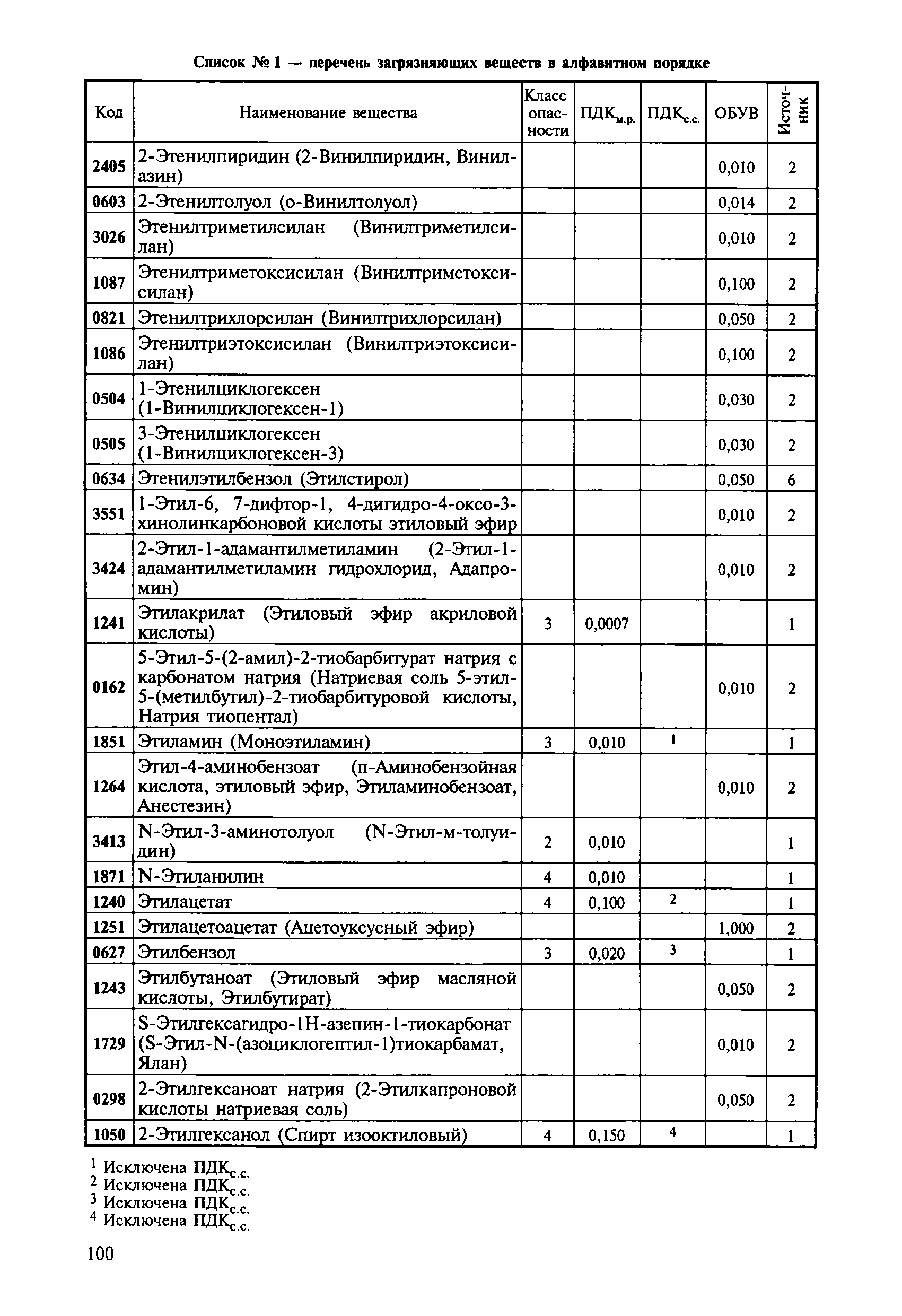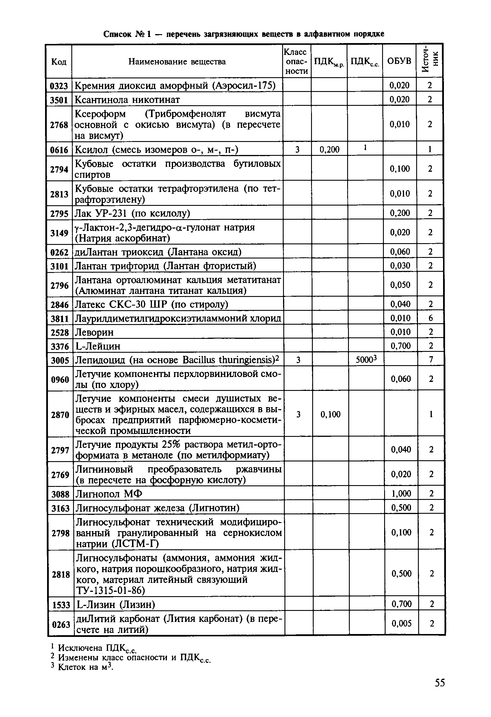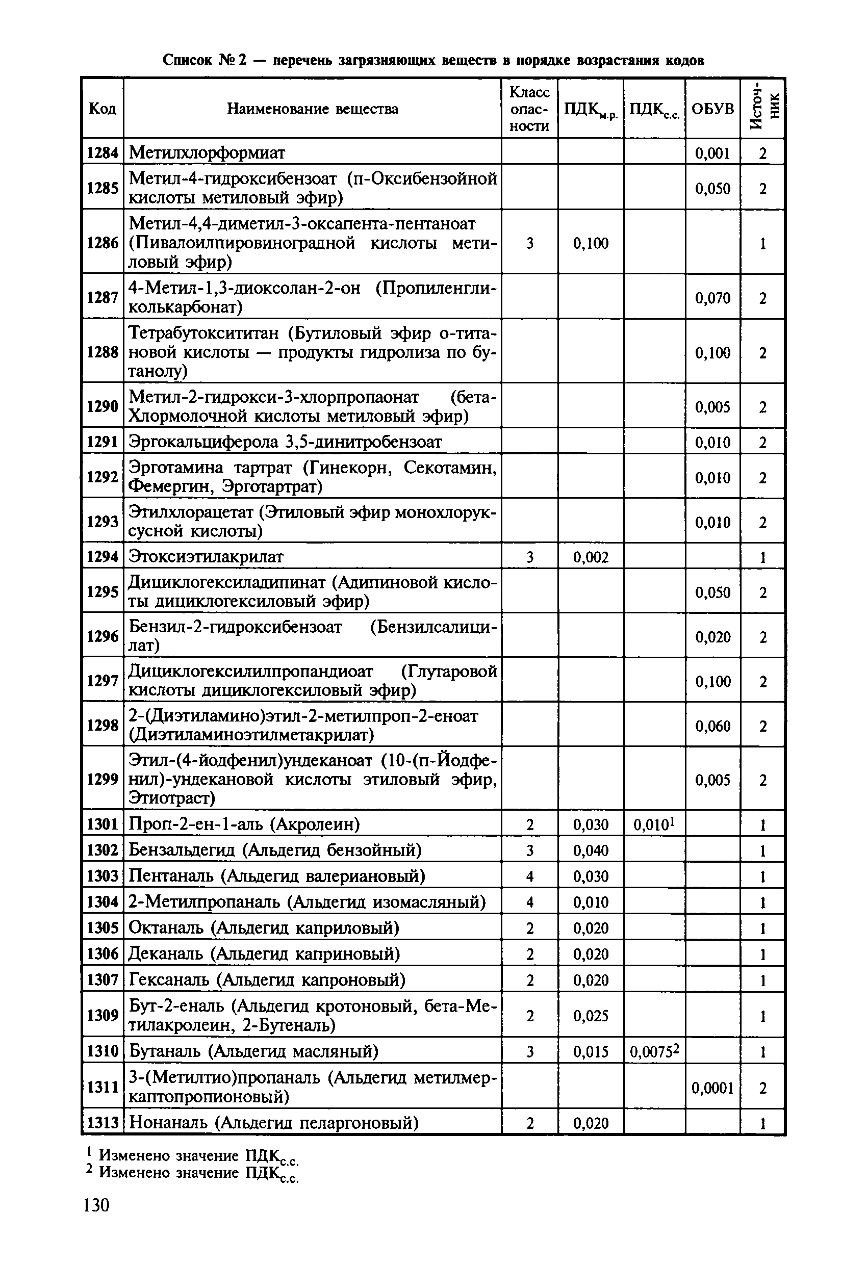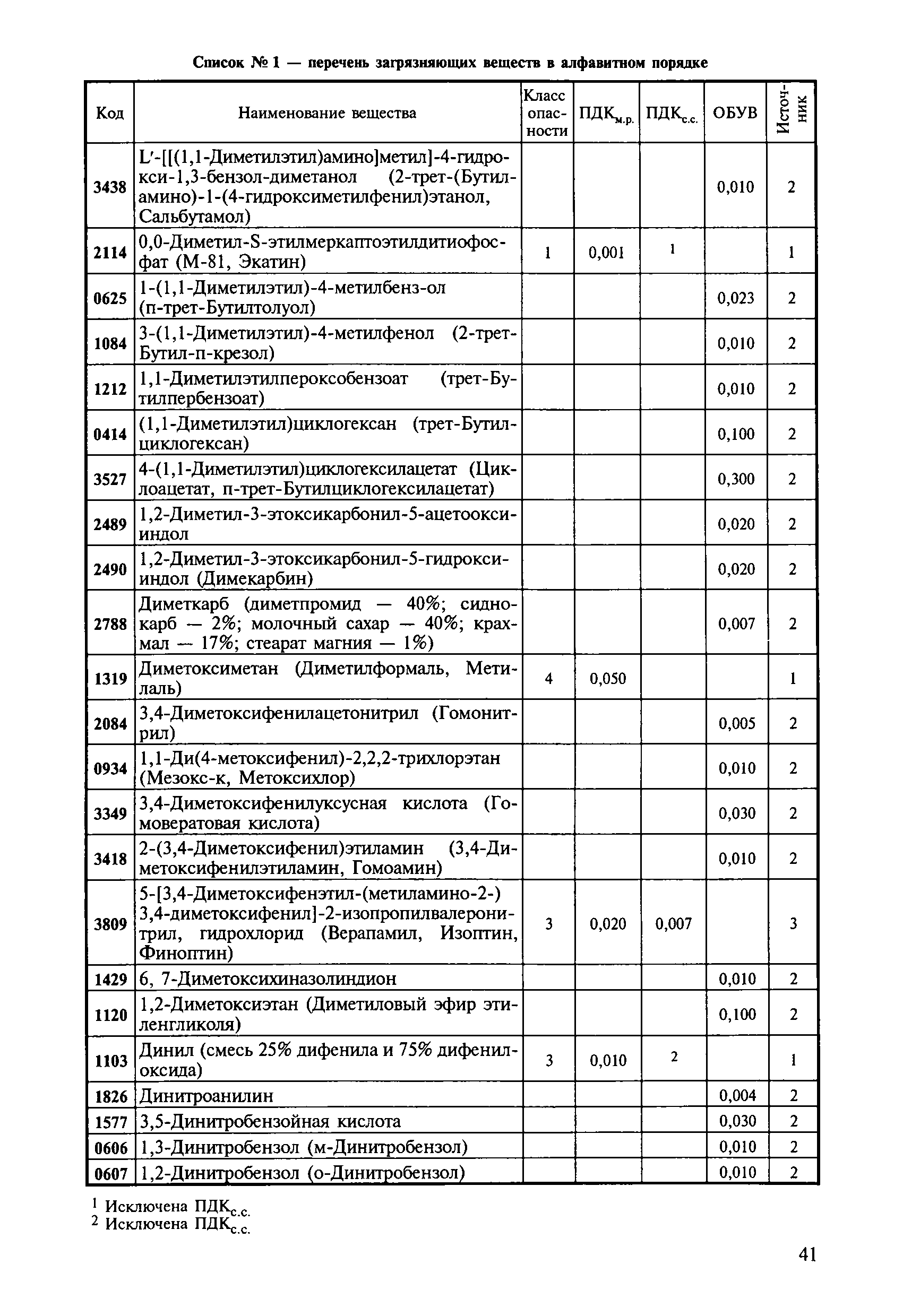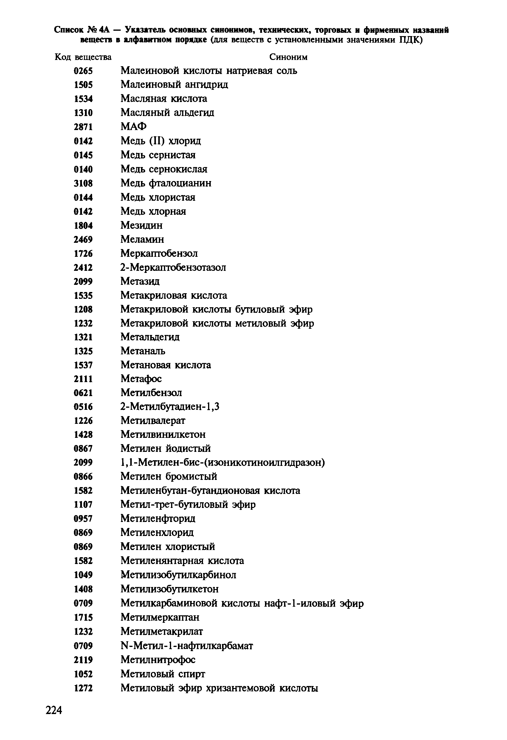 | Оглавление: | Список № 1 Перечень загрязняющих веществ в алфавитном порядке Список № 2 Перечень загрязняющих веществ в порядке возрастания кодов Список № 3 Перечень ЛОС в порядке возрастания кодов Список № 4 Указатель основных синонимов, технических, торговых и фирменных названий веществ в алфавитном порядке А. Для веществ с установленными значениями ПДК Б. Для веществ с установленными значениями ОБУВ Список № 5 Указатель основных синонимов, технических, торговых и фирменных названий веществ в порядке возрастания кодов А. Для веществ с установленными значениями ПДК Б. Для веществ с установленными значениями ОБУВ |