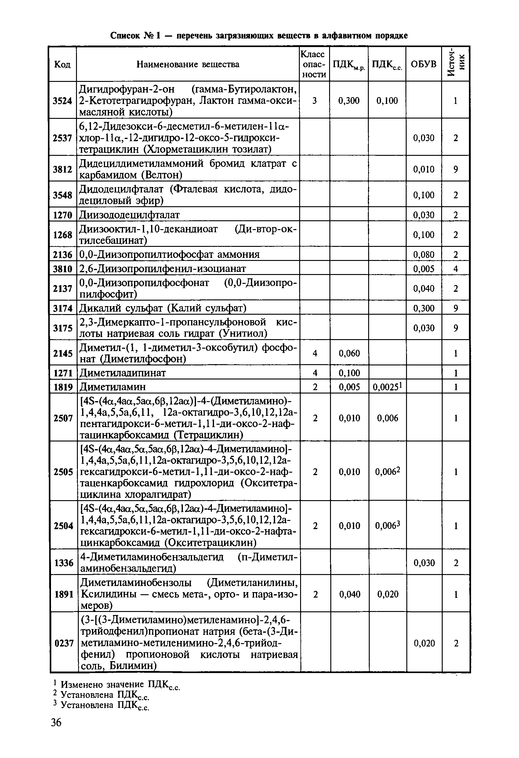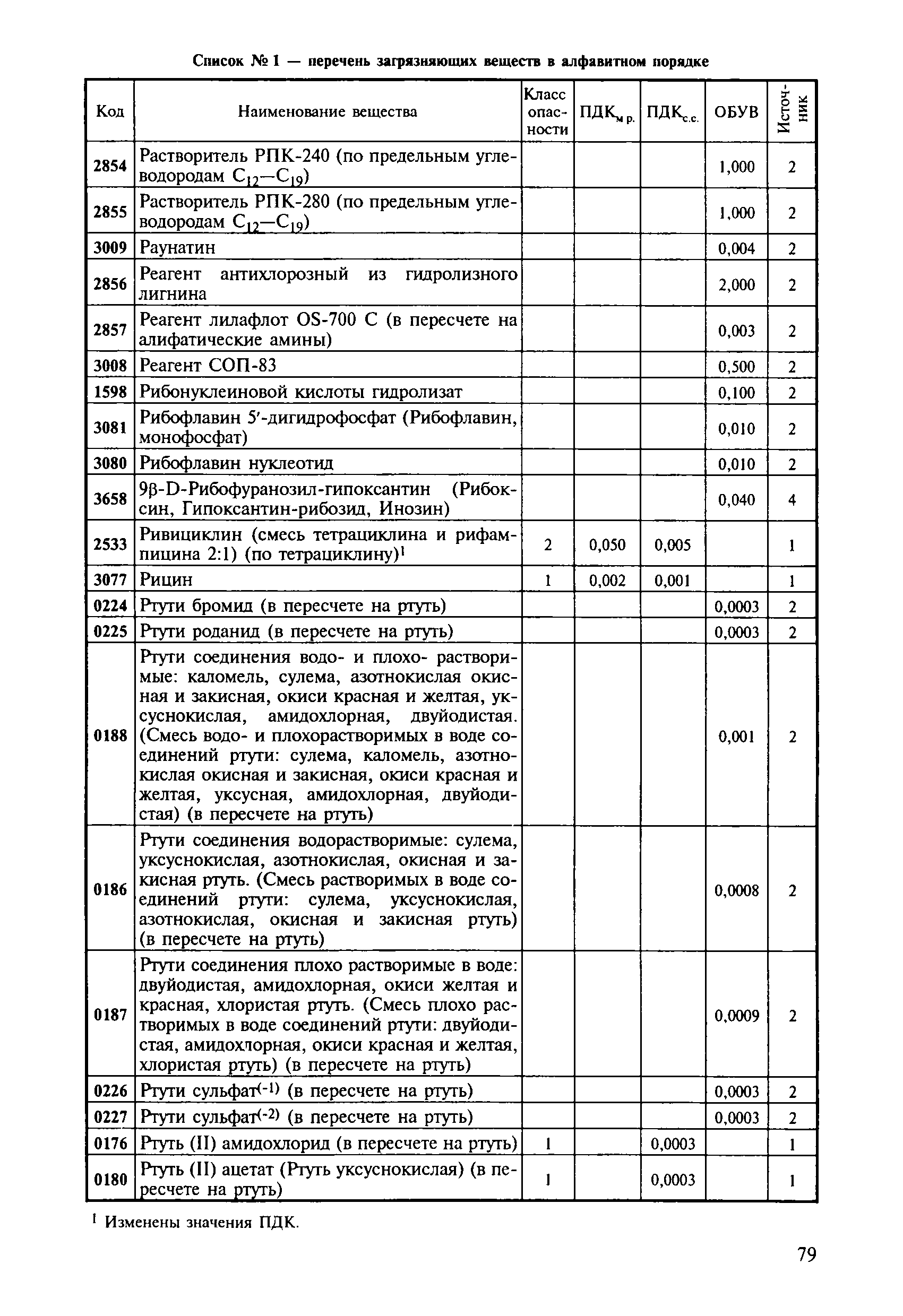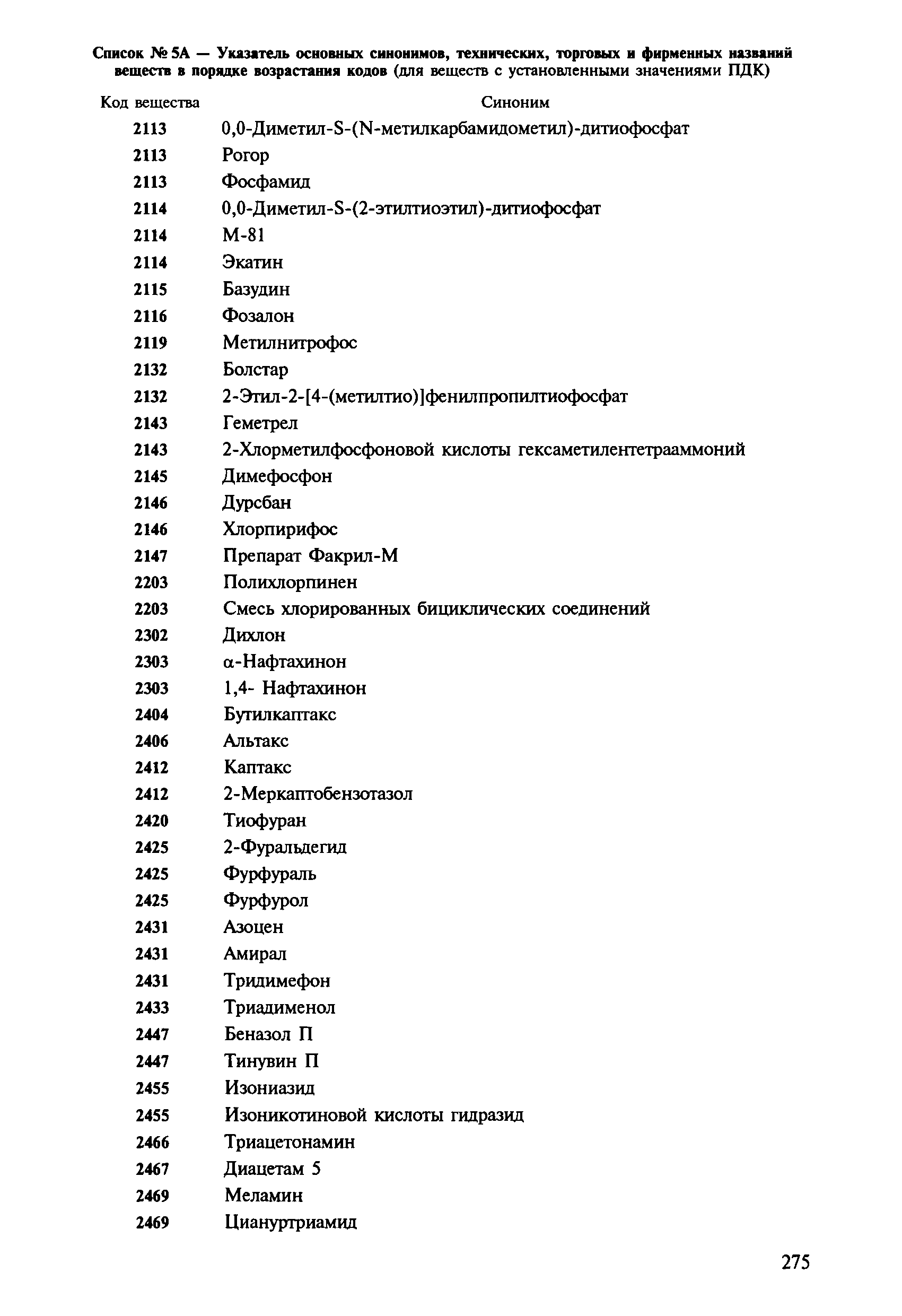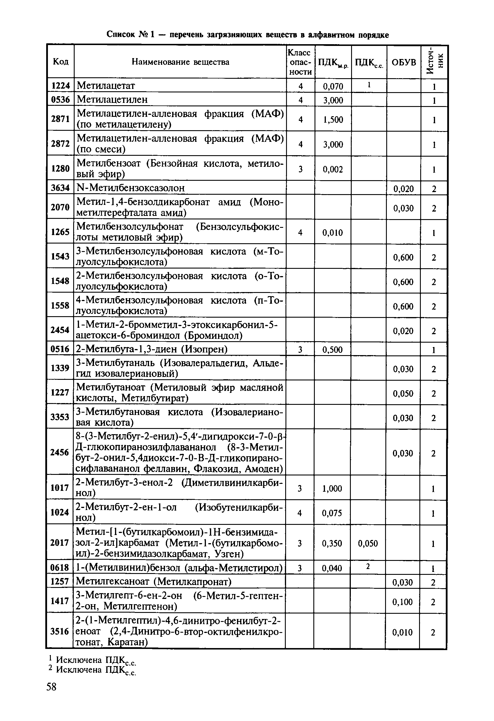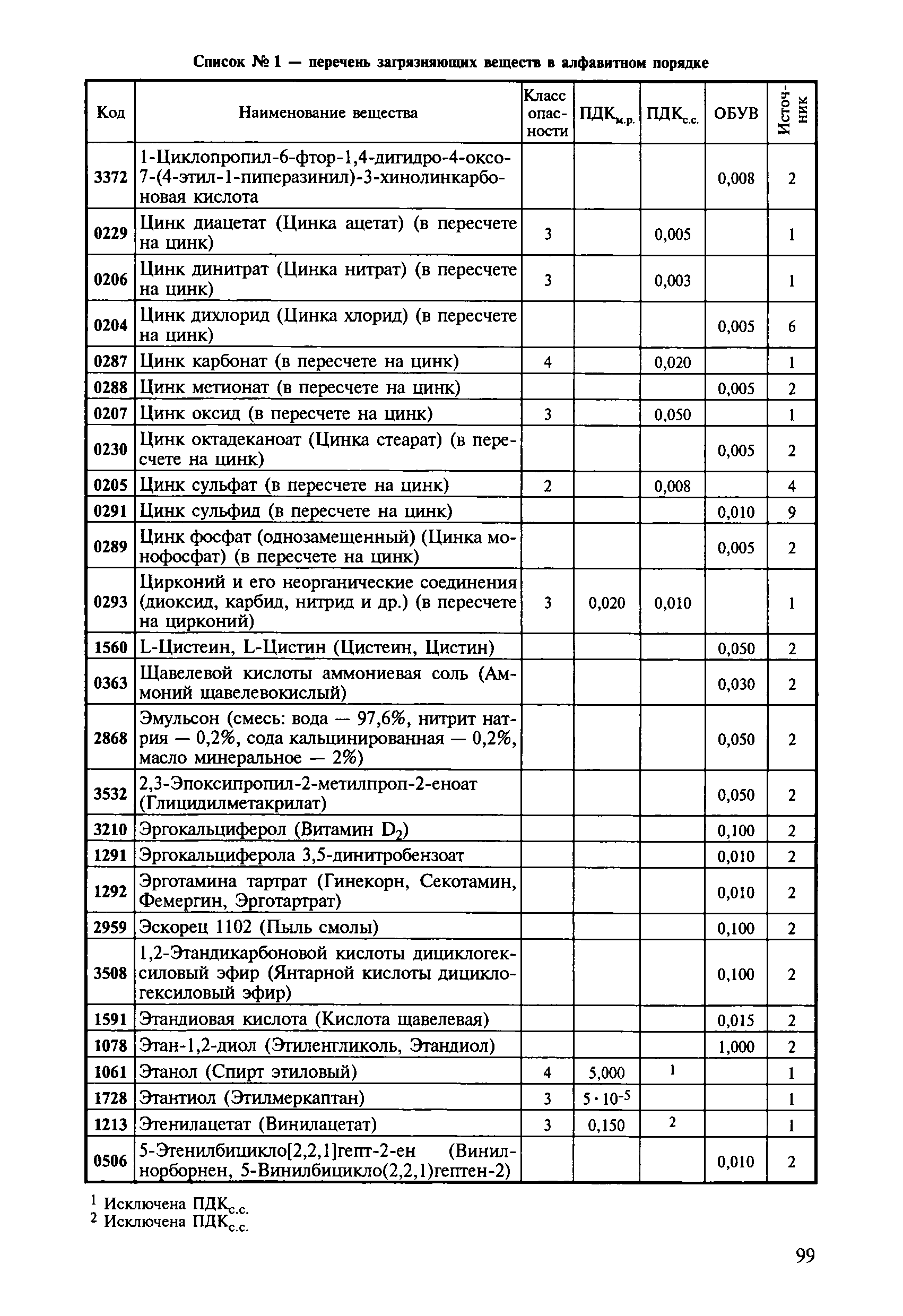 | Оглавление: | Список № 1 Перечень загрязняющих веществ в алфавитном порядке Список № 2 Перечень загрязняющих веществ в порядке возрастания кодов Список № 3 Перечень ЛОС в порядке возрастания кодов Список № 4 Указатель основных синонимов, технических, торговых и фирменных названий веществ в алфавитном порядке А. Для веществ с установленными значениями ПДК Б. Для веществ с установленными значениями ОБУВ Список № 5 Указатель основных синонимов, технических, торговых и фирменных названий веществ в порядке возрастания кодов А. Для веществ с установленными значениями ПДК Б. Для веществ с установленными значениями ОБУВ |