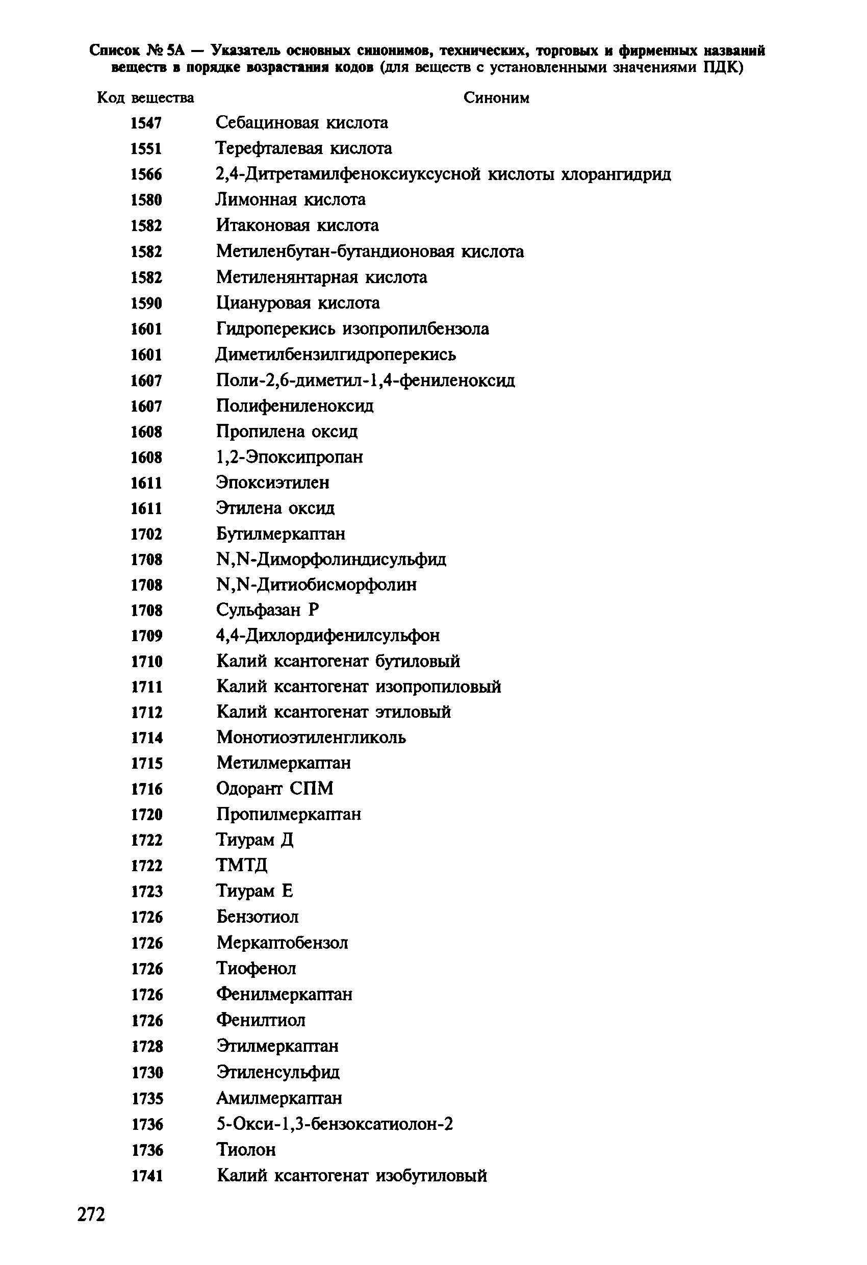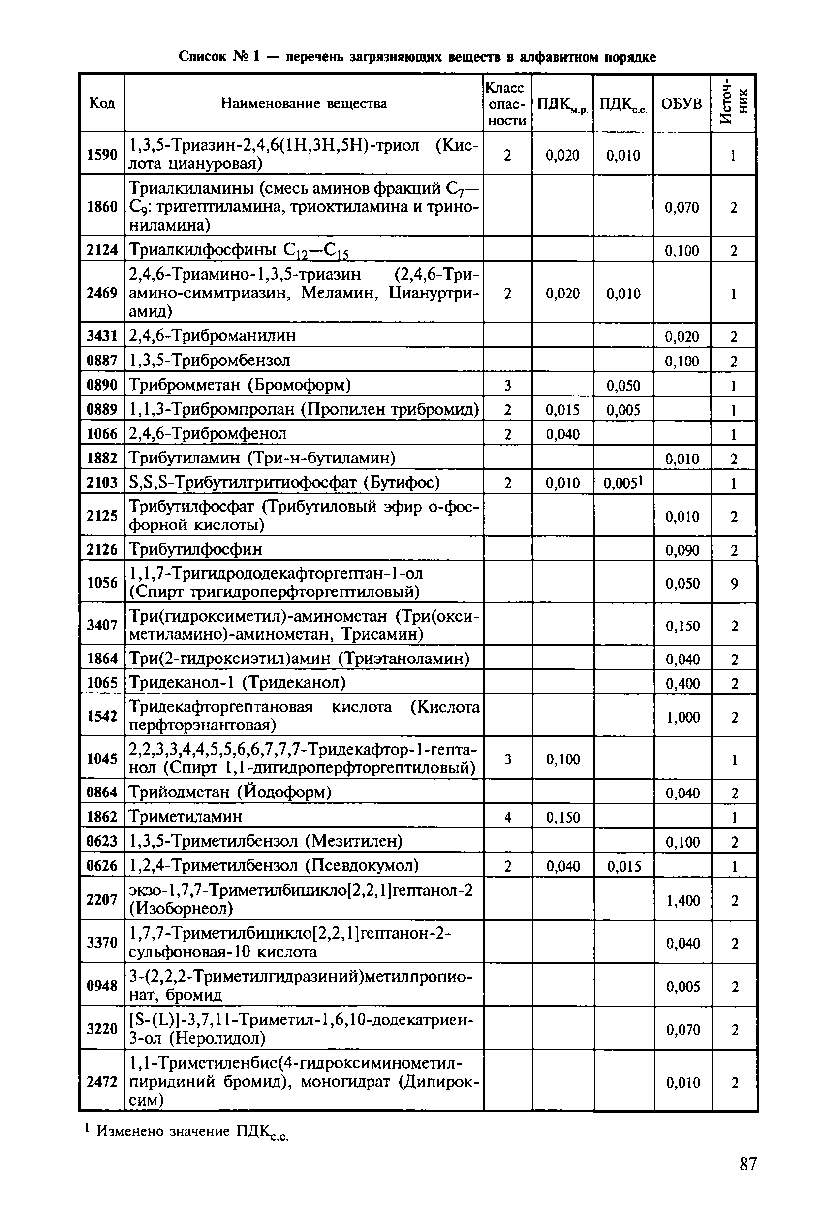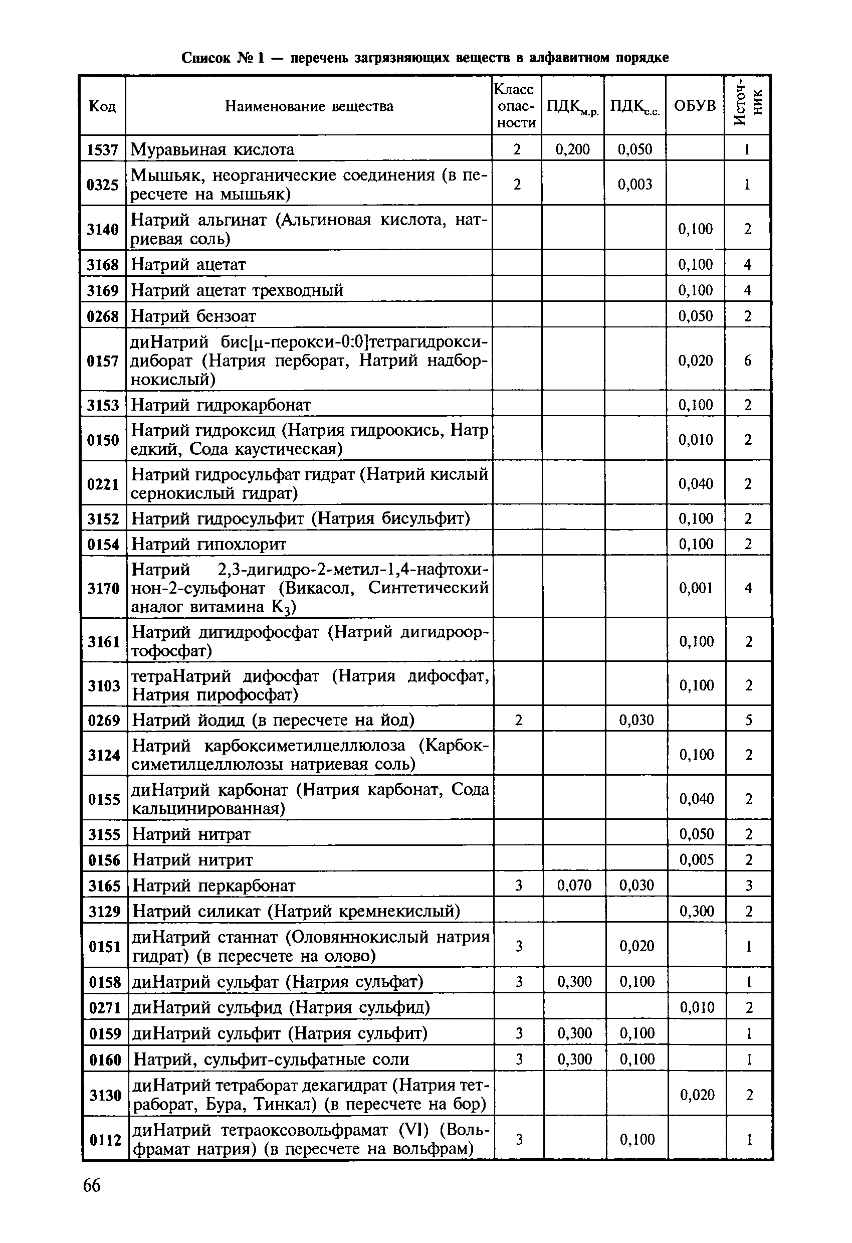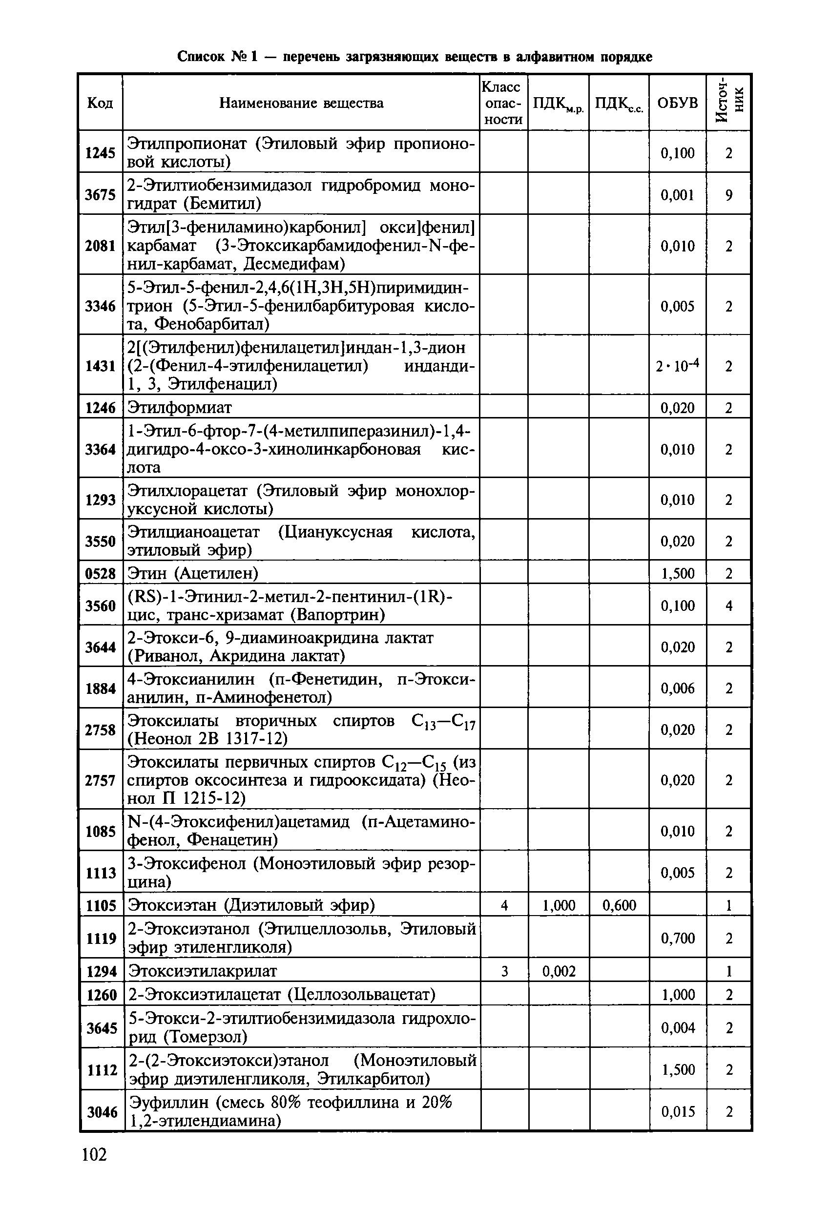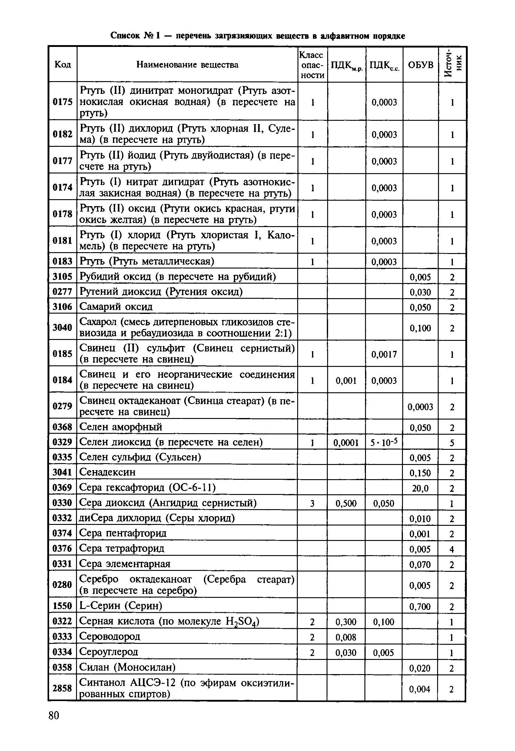 | Оглавление: | Список № 1 Перечень загрязняющих веществ в алфавитном порядке Список № 2 Перечень загрязняющих веществ в порядке возрастания кодов Список № 3 Перечень ЛОС в порядке возрастания кодов Список № 4 Указатель основных синонимов, технических, торговых и фирменных названий веществ в алфавитном порядке А. Для веществ с установленными значениями ПДК Б. Для веществ с установленными значениями ОБУВ Список № 5 Указатель основных синонимов, технических, торговых и фирменных названий веществ в порядке возрастания кодов А. Для веществ с установленными значениями ПДК Б. Для веществ с установленными значениями ОБУВ |