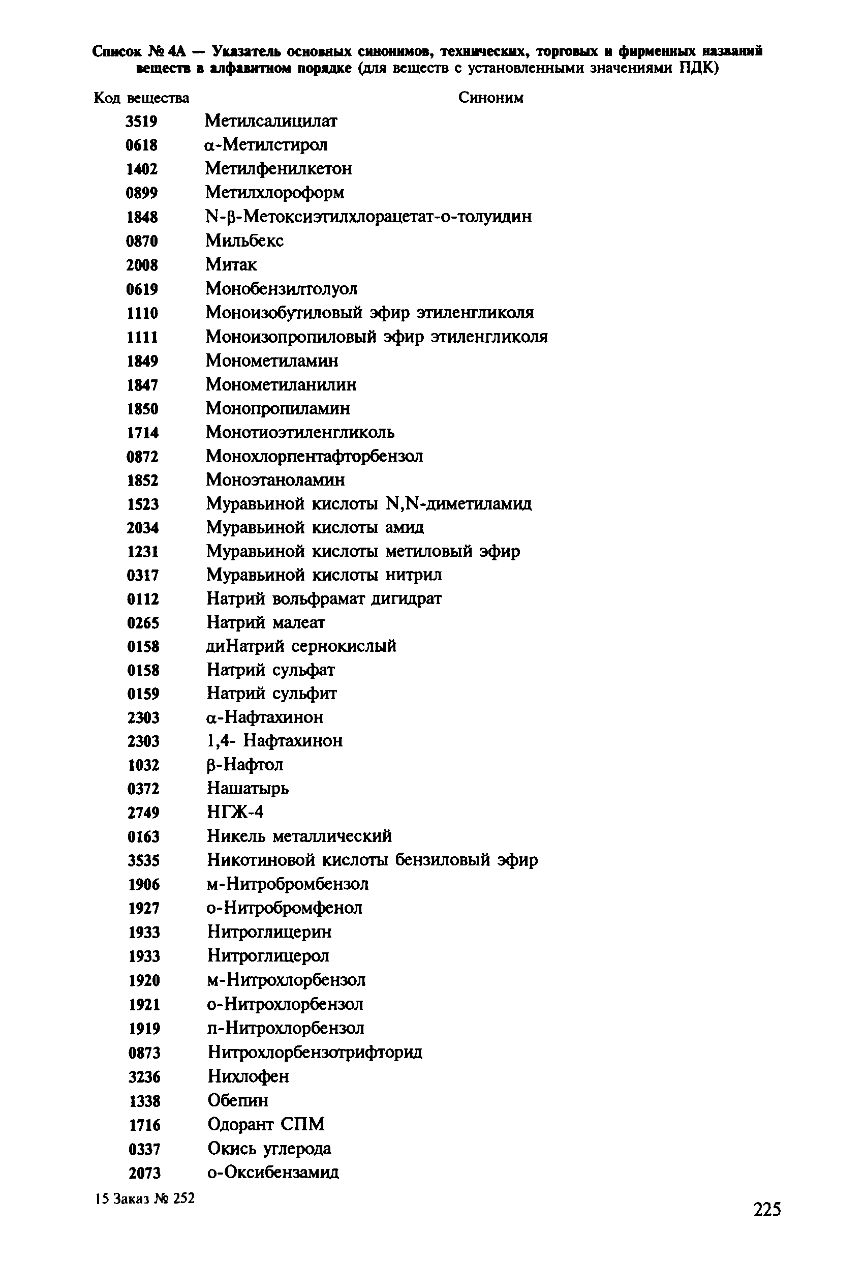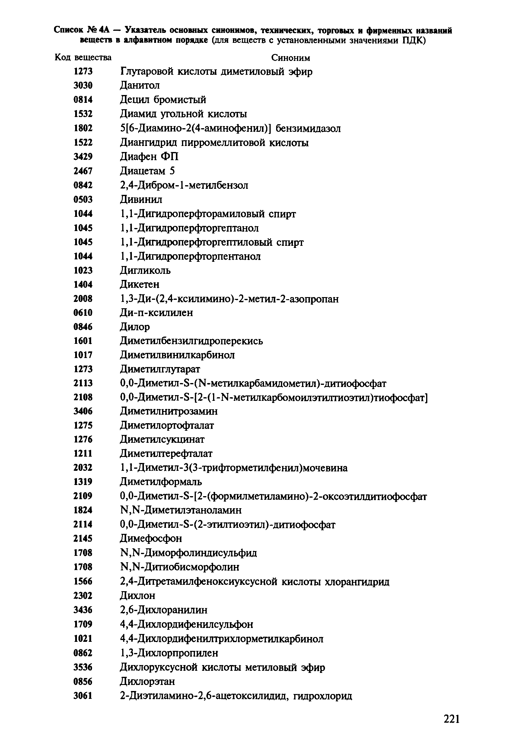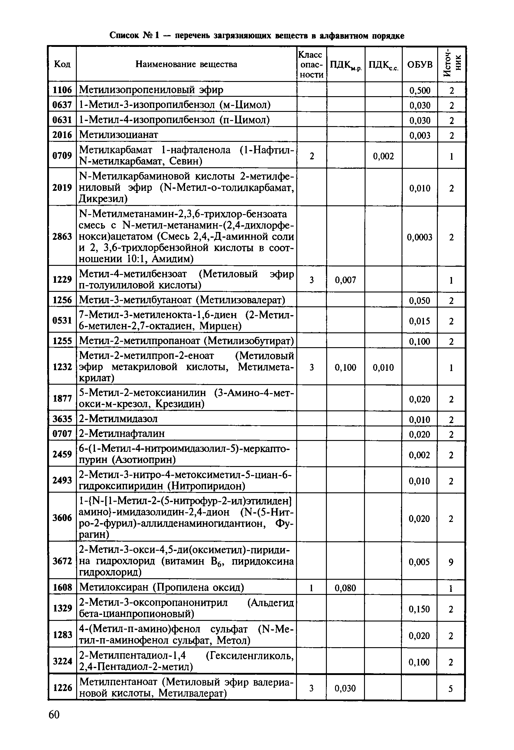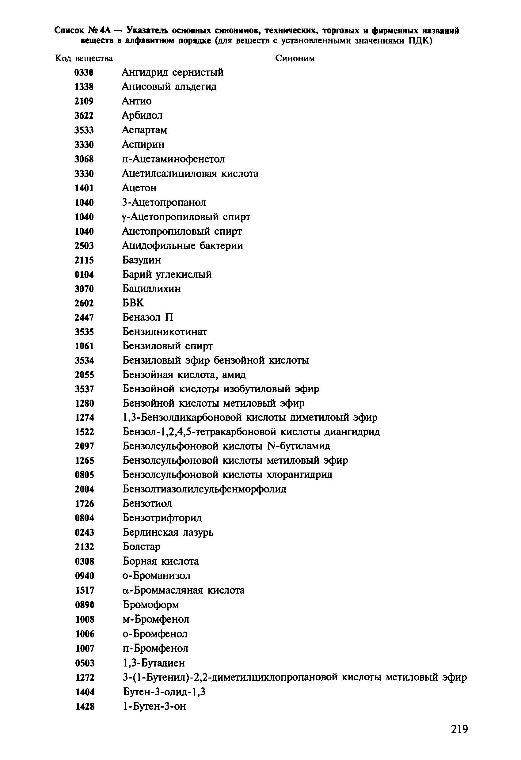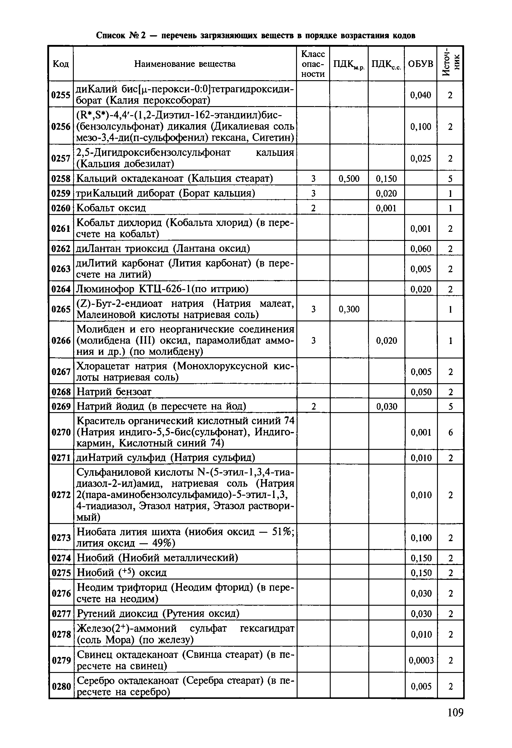 | Оглавление: | Список № 1 Перечень загрязняющих веществ в алфавитном порядке Список № 2 Перечень загрязняющих веществ в порядке возрастания кодов Список № 3 Перечень ЛОС в порядке возрастания кодов Список № 4 Указатель основных синонимов, технических, торговых и фирменных названий веществ в алфавитном порядке А. Для веществ с установленными значениями ПДК Б. Для веществ с установленными значениями ОБУВ Список № 5 Указатель основных синонимов, технических, торговых и фирменных названий веществ в порядке возрастания кодов А. Для веществ с установленными значениями ПДК Б. Для веществ с установленными значениями ОБУВ |