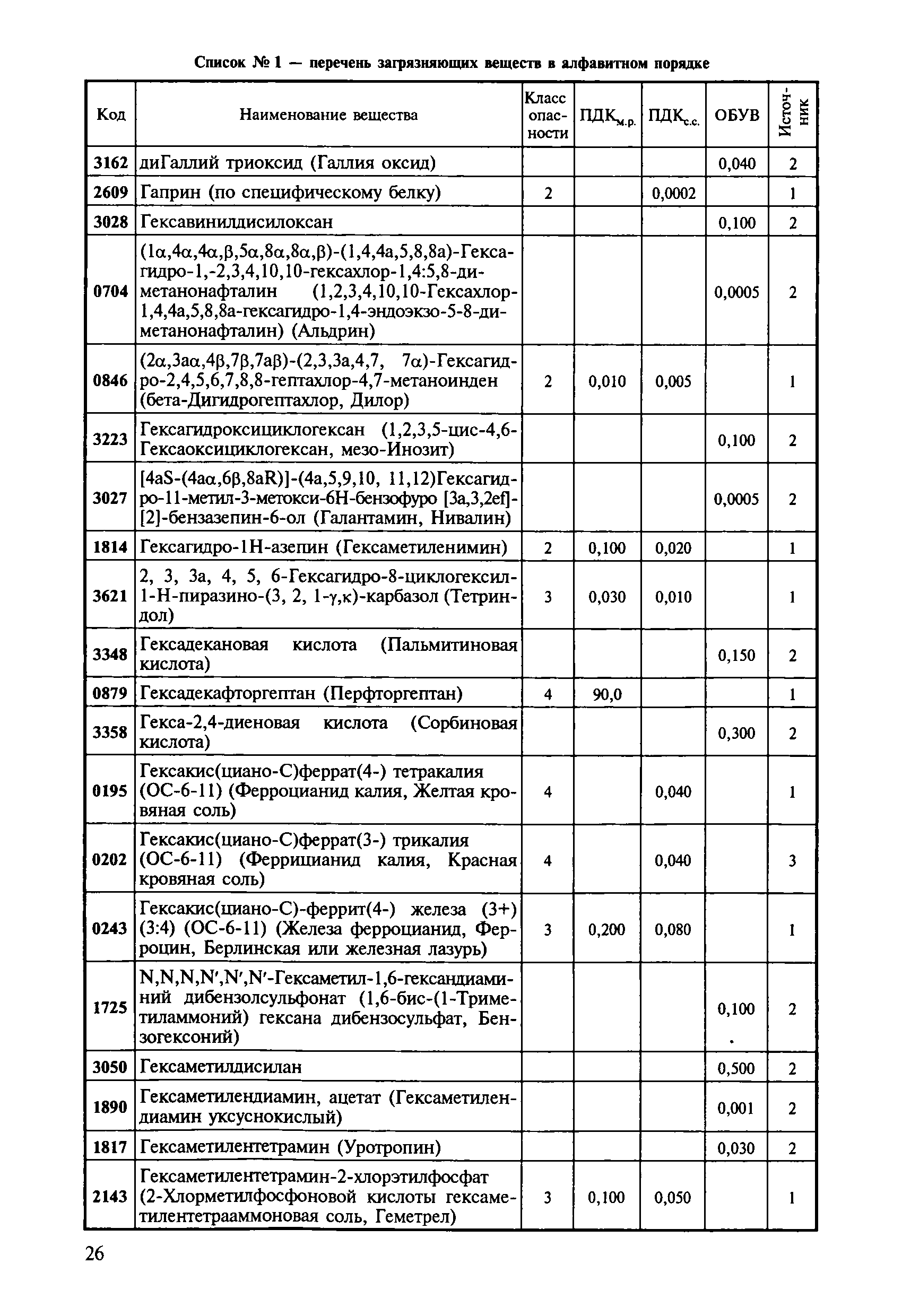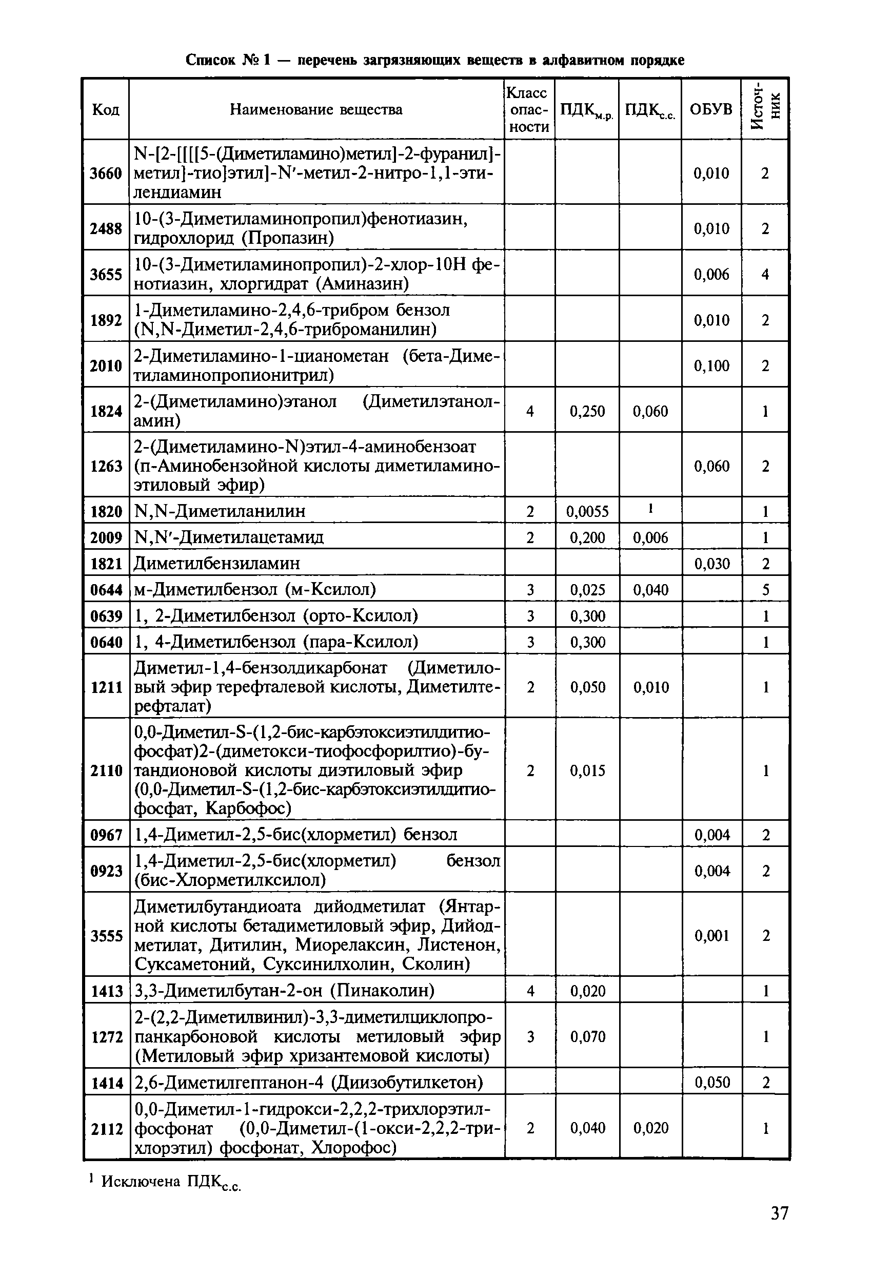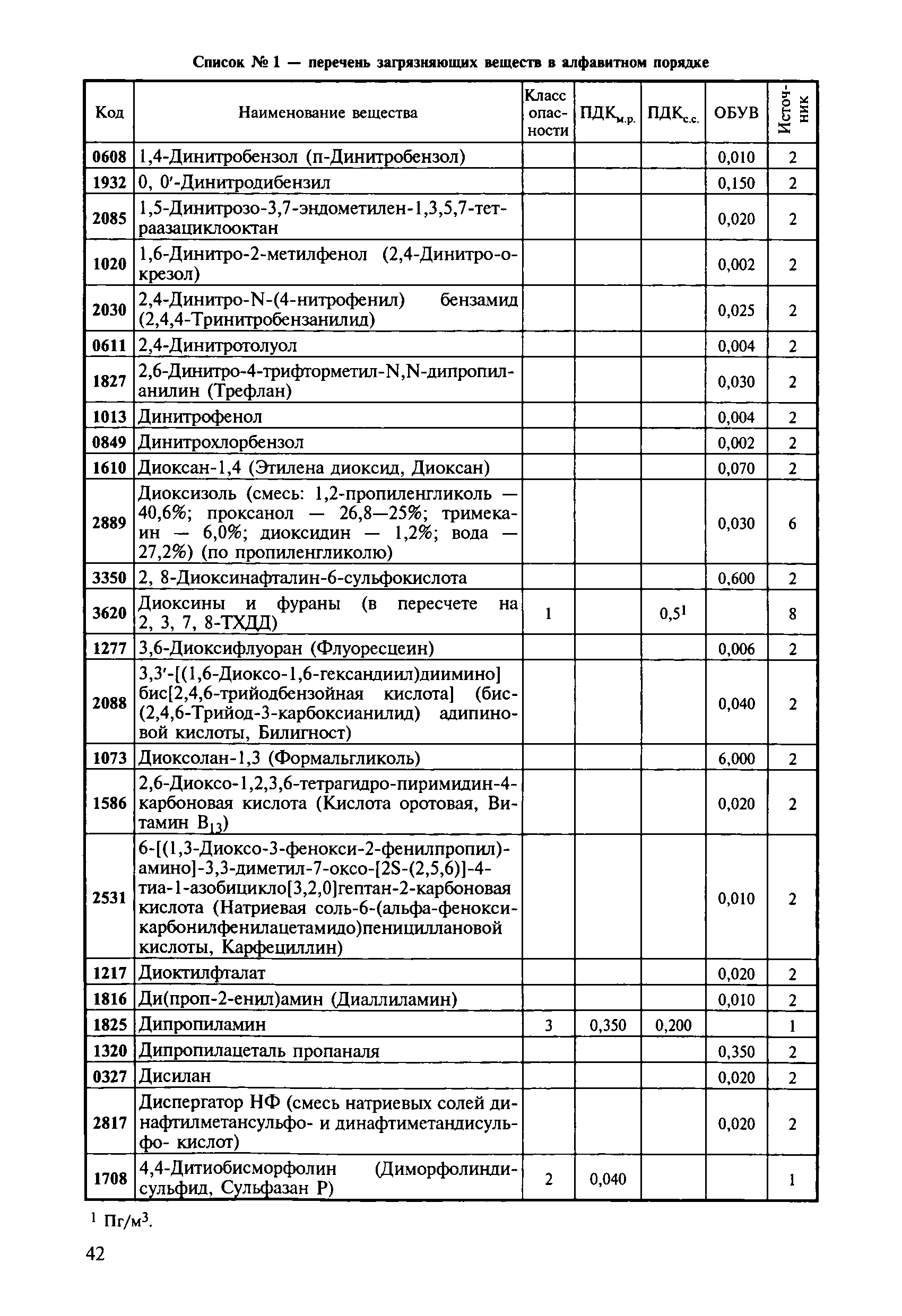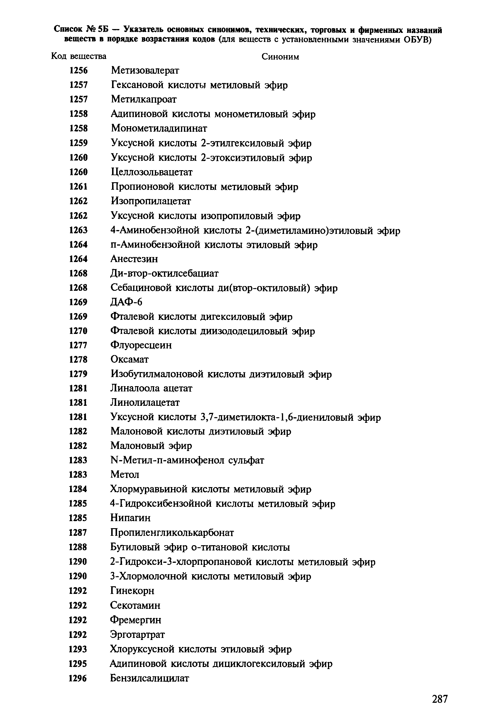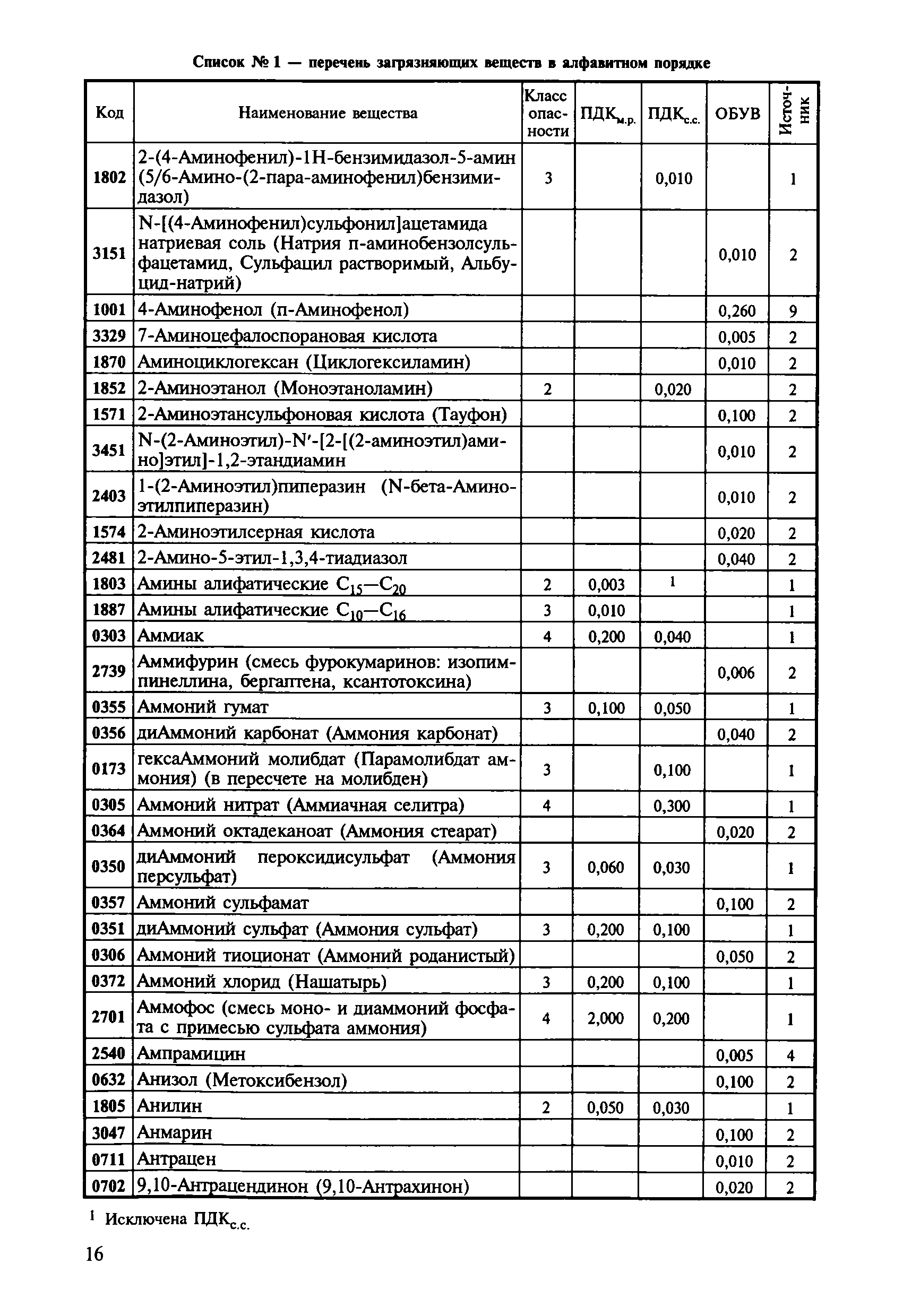 | Оглавление: | Список № 1 Перечень загрязняющих веществ в алфавитном порядке Список № 2 Перечень загрязняющих веществ в порядке возрастания кодов Список № 3 Перечень ЛОС в порядке возрастания кодов Список № 4 Указатель основных синонимов, технических, торговых и фирменных названий веществ в алфавитном порядке А. Для веществ с установленными значениями ПДК Б. Для веществ с установленными значениями ОБУВ Список № 5 Указатель основных синонимов, технических, торговых и фирменных названий веществ в порядке возрастания кодов А. Для веществ с установленными значениями ПДК Б. Для веществ с установленными значениями ОБУВ |