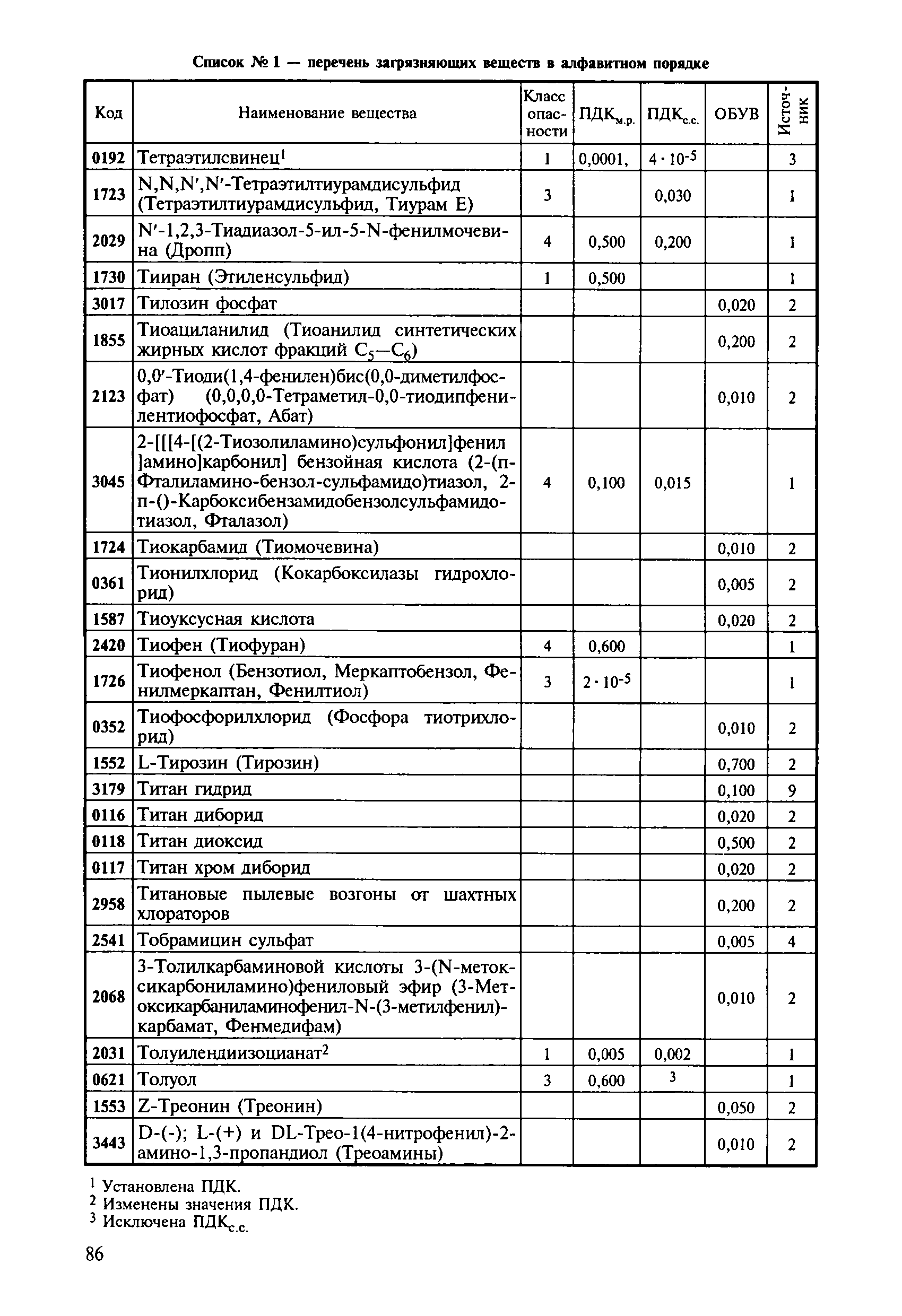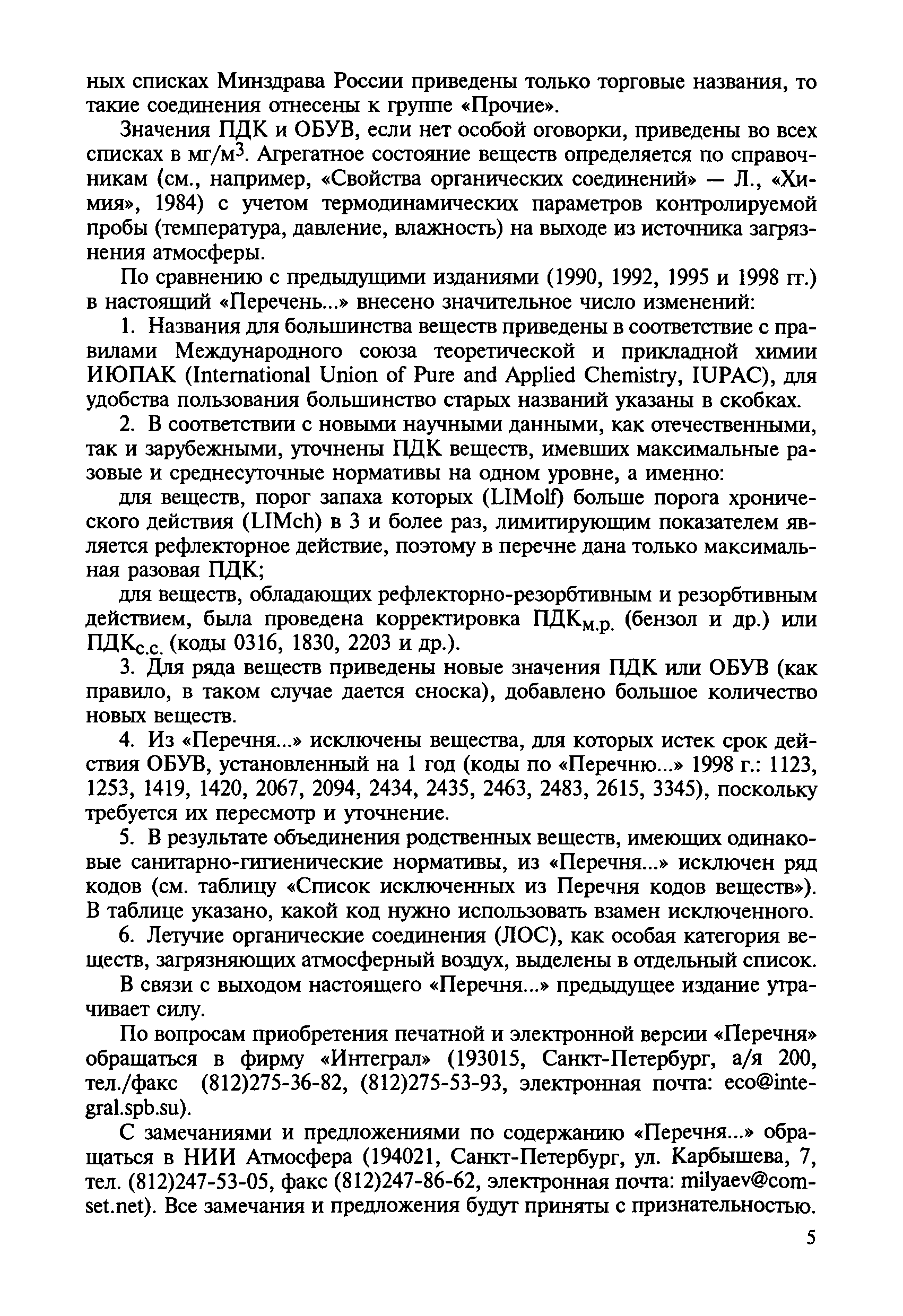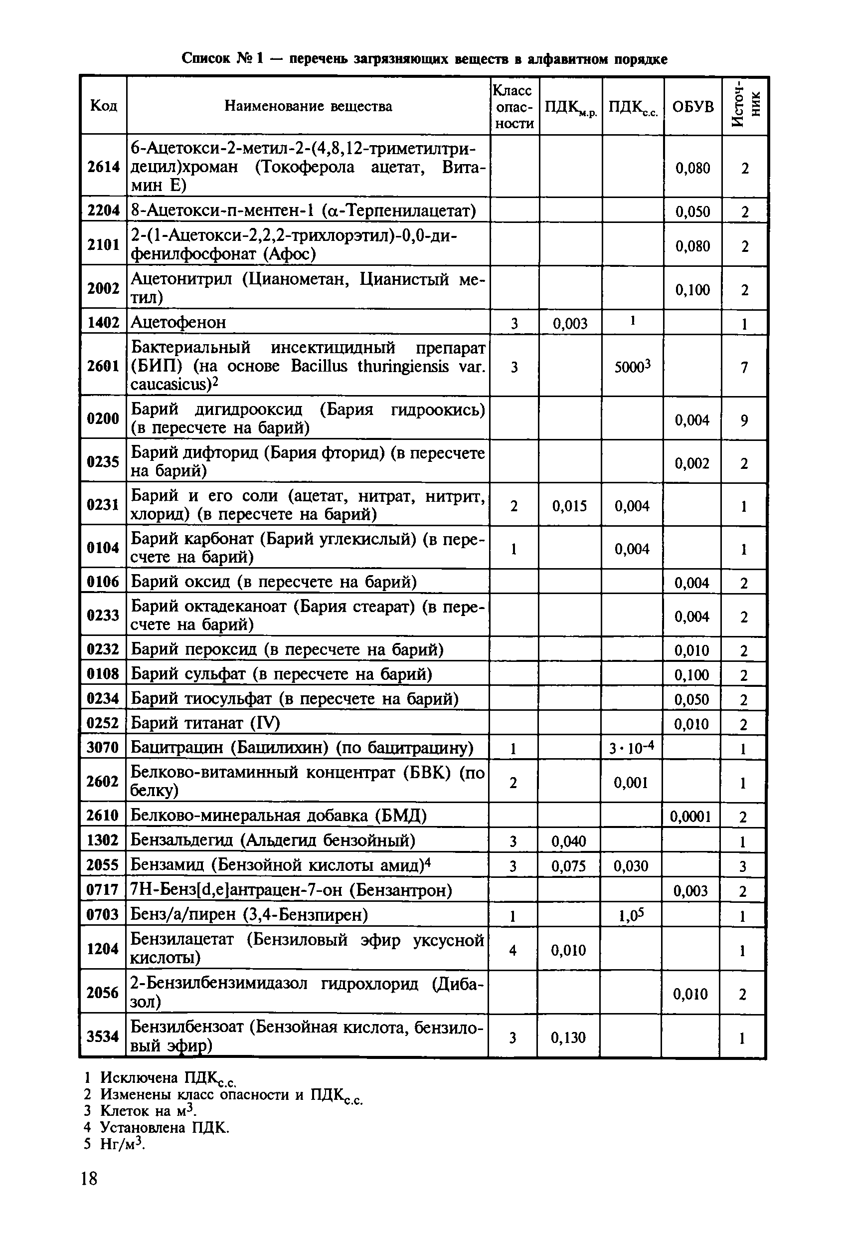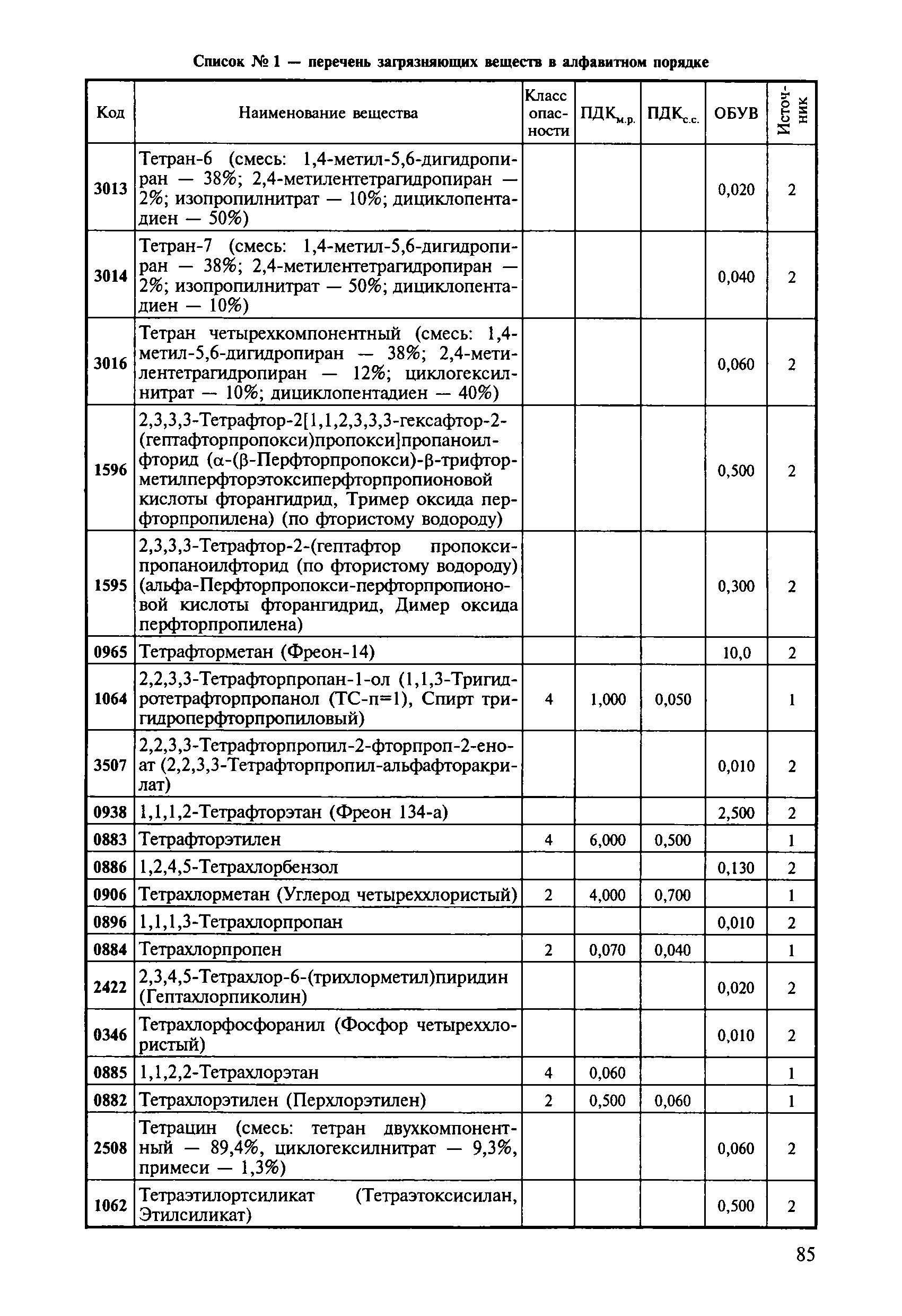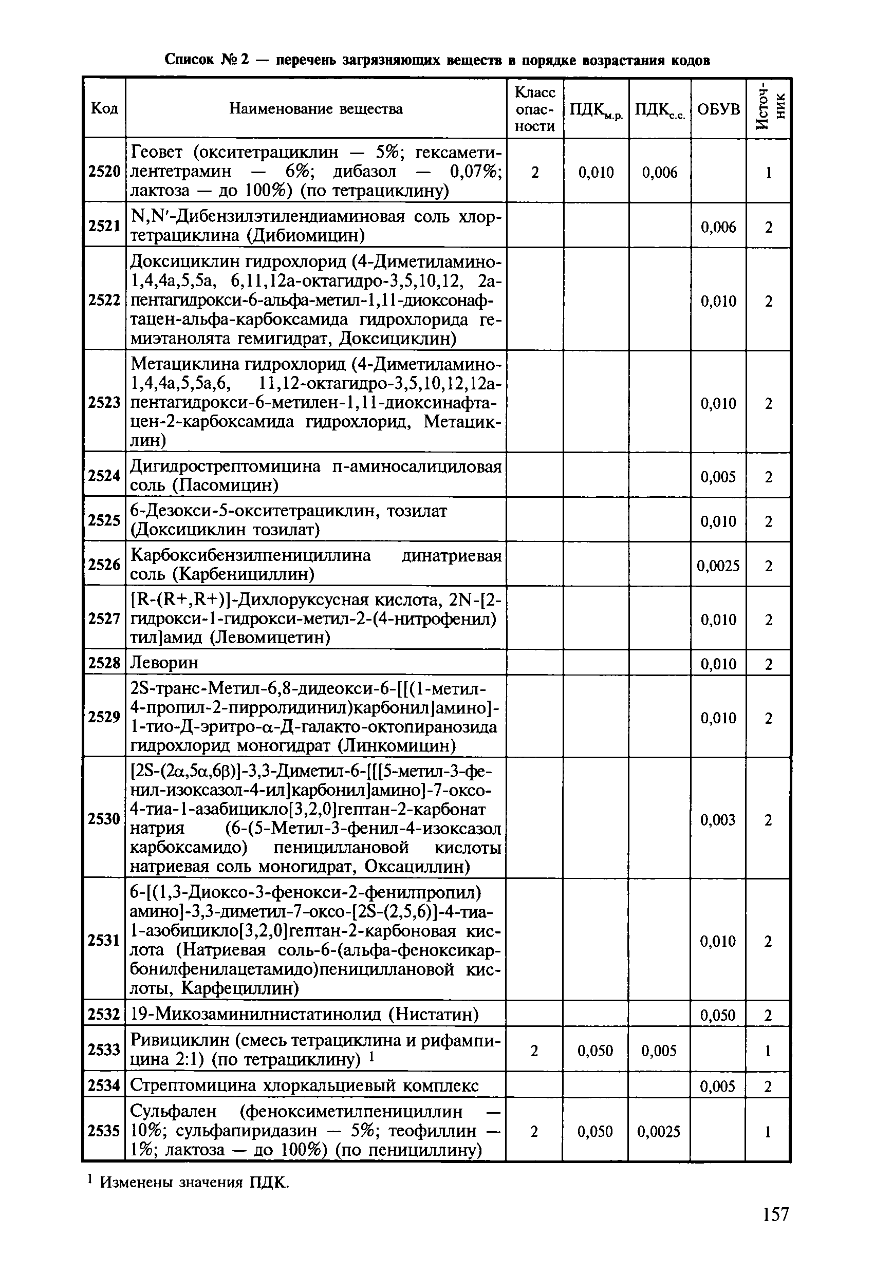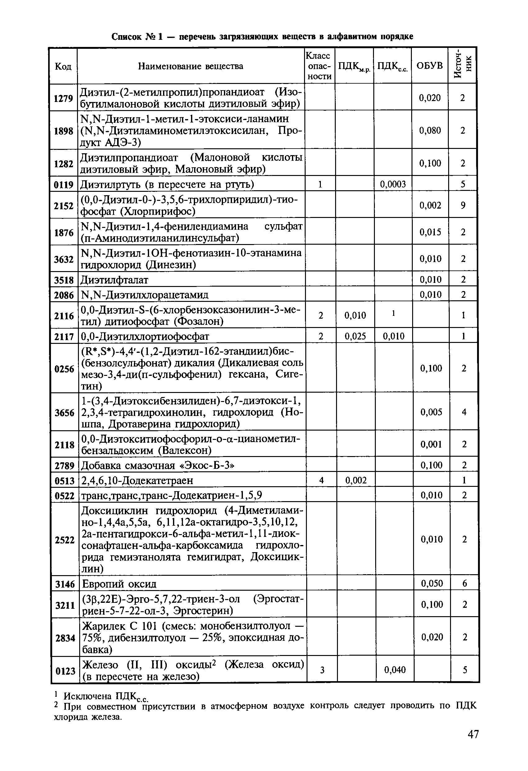 | Оглавление: | Список № 1 Перечень загрязняющих веществ в алфавитном порядке Список № 2 Перечень загрязняющих веществ в порядке возрастания кодов Список № 3 Перечень ЛОС в порядке возрастания кодов Список № 4 Указатель основных синонимов, технических, торговых и фирменных названий веществ в алфавитном порядке А. Для веществ с установленными значениями ПДК Б. Для веществ с установленными значениями ОБУВ Список № 5 Указатель основных синонимов, технических, торговых и фирменных названий веществ в порядке возрастания кодов А. Для веществ с установленными значениями ПДК Б. Для веществ с установленными значениями ОБУВ |