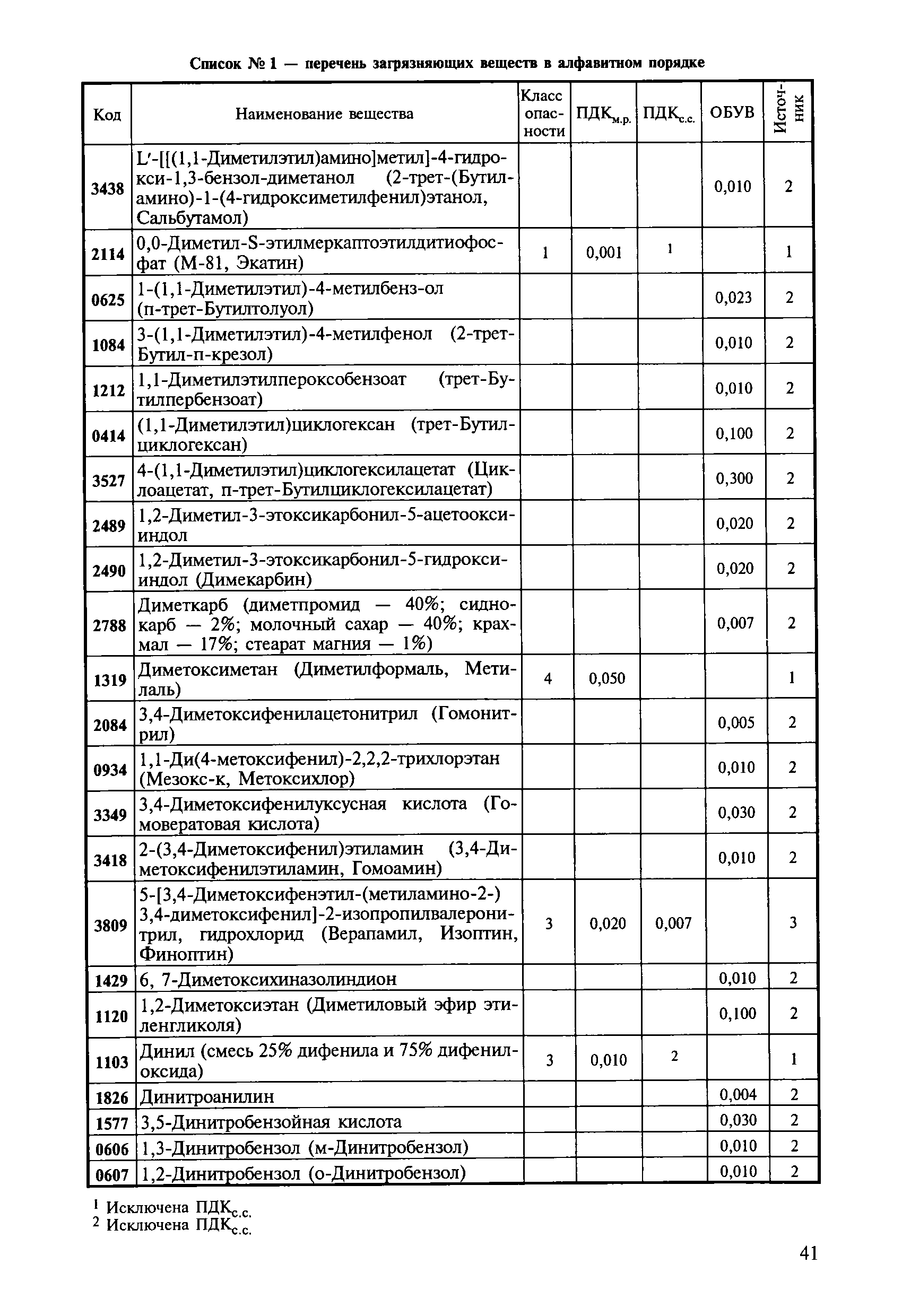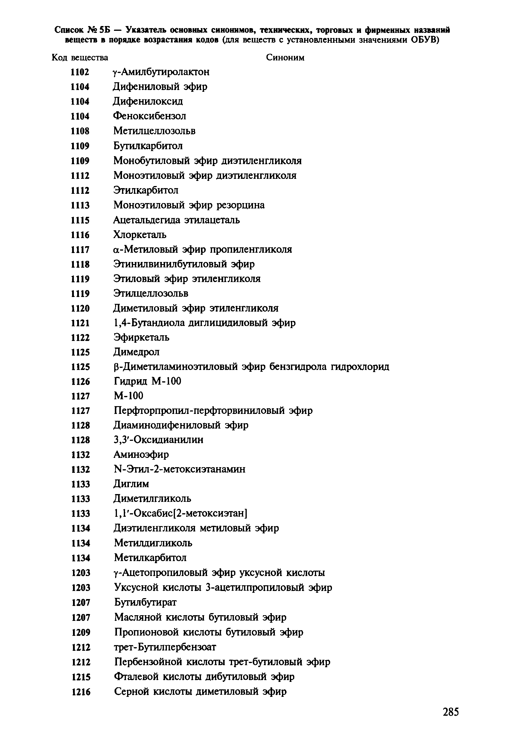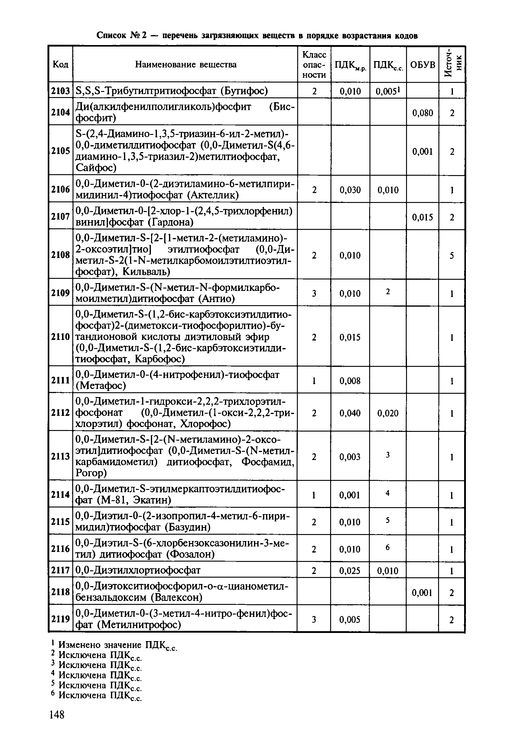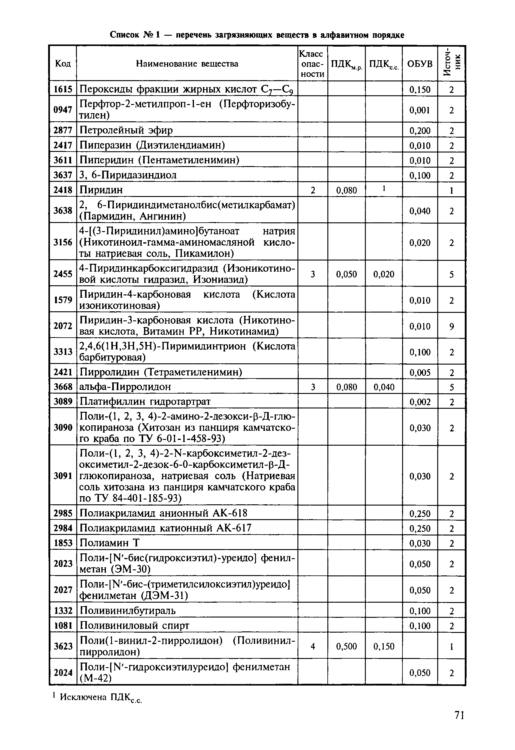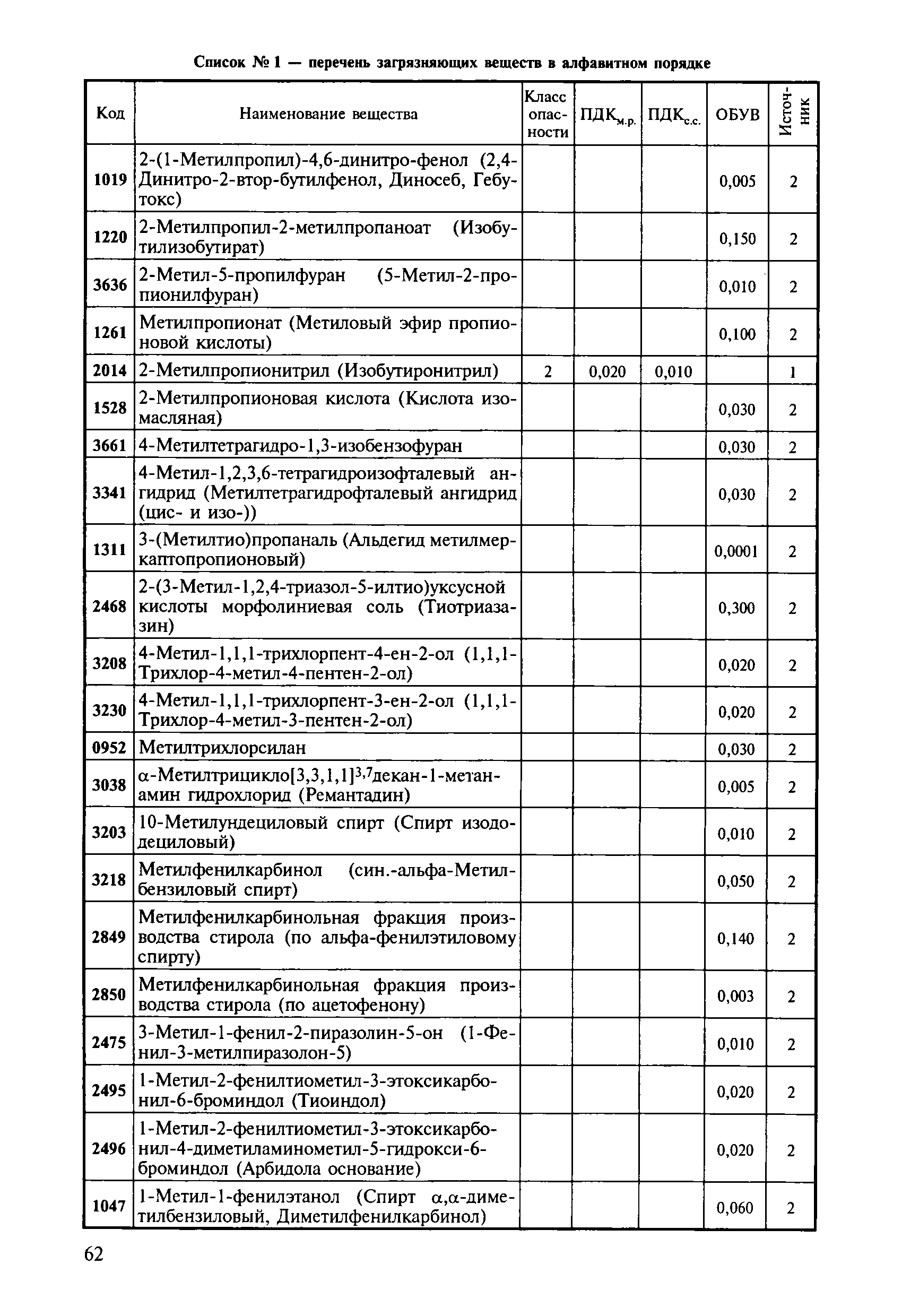 | Оглавление: | Список № 1 Перечень загрязняющих веществ в алфавитном порядке Список № 2 Перечень загрязняющих веществ в порядке возрастания кодов Список № 3 Перечень ЛОС в порядке возрастания кодов Список № 4 Указатель основных синонимов, технических, торговых и фирменных названий веществ в алфавитном порядке А. Для веществ с установленными значениями ПДК Б. Для веществ с установленными значениями ОБУВ Список № 5 Указатель основных синонимов, технических, торговых и фирменных названий веществ в порядке возрастания кодов А. Для веществ с установленными значениями ПДК Б. Для веществ с установленными значениями ОБУВ |