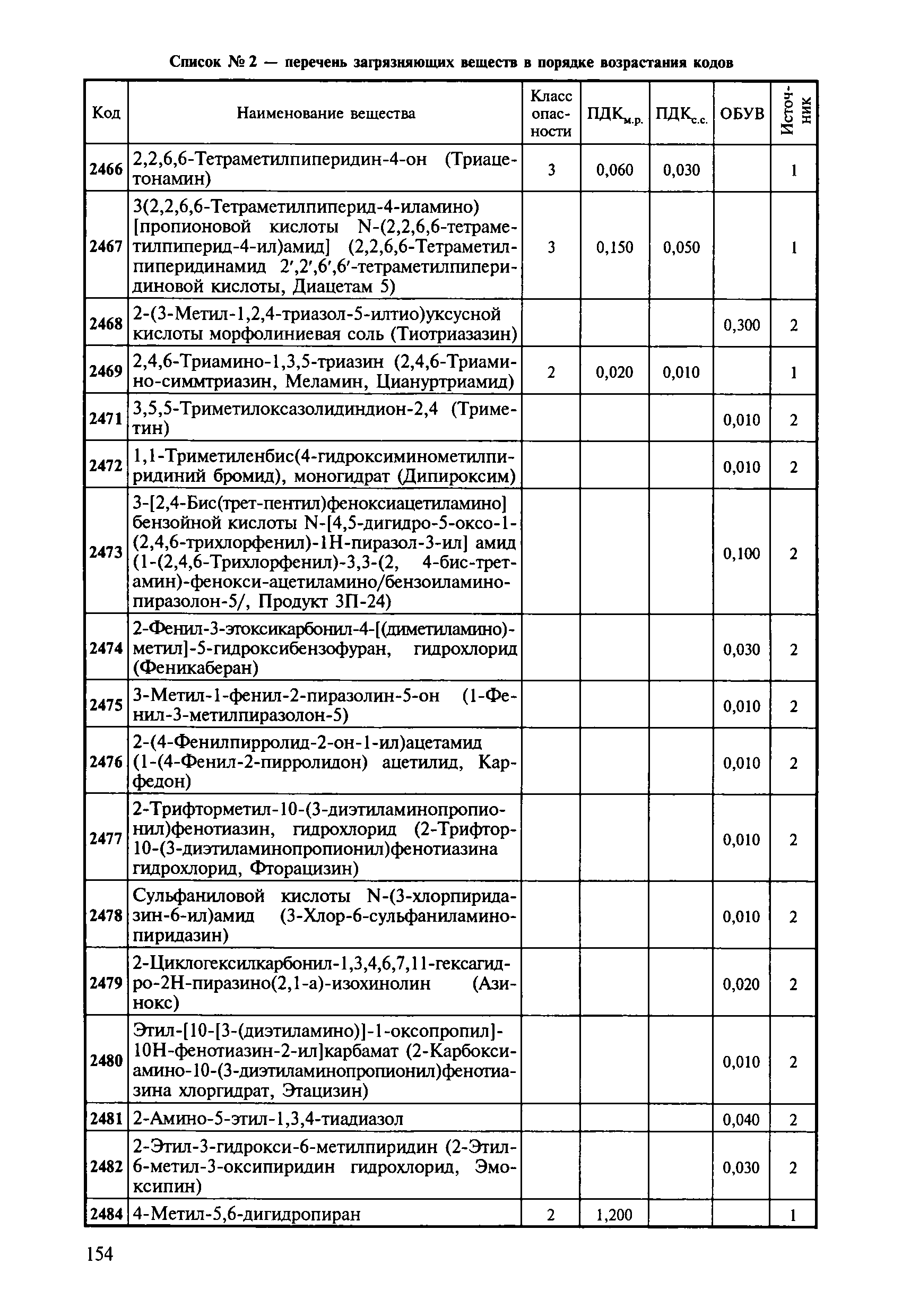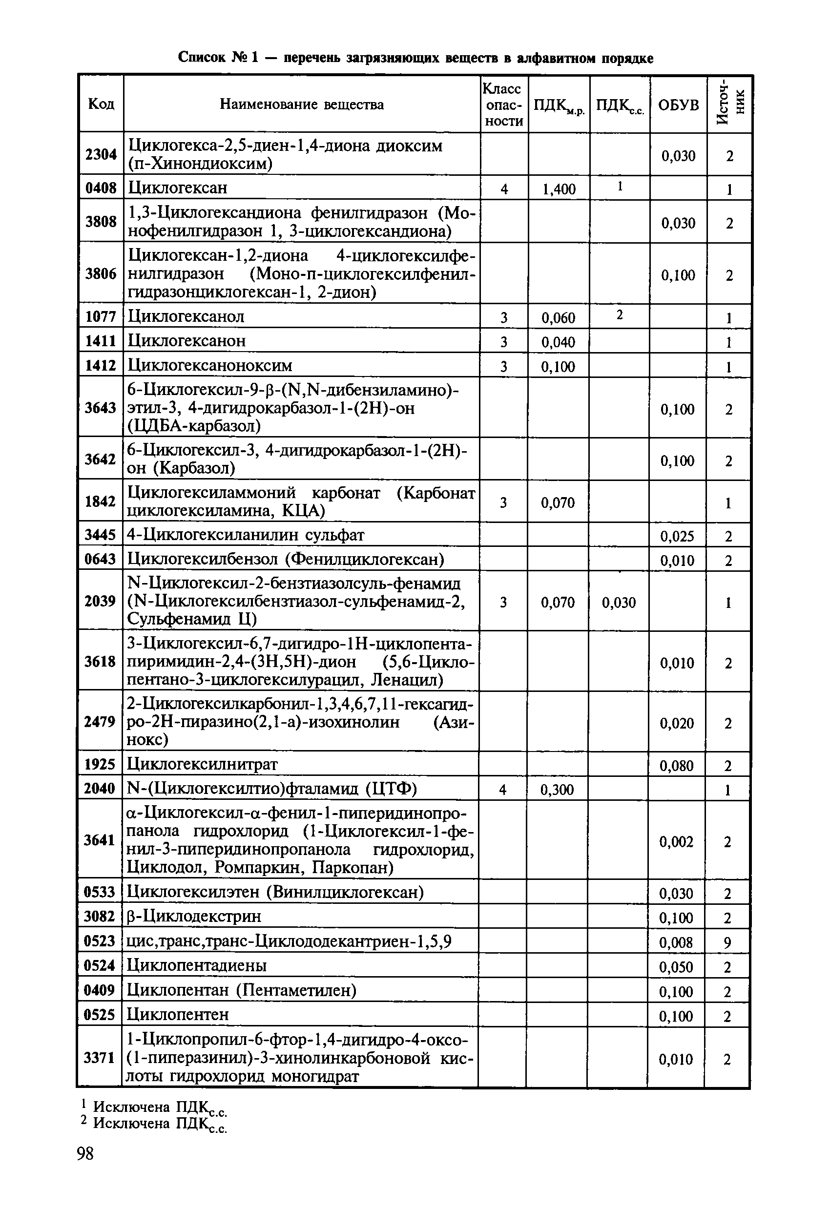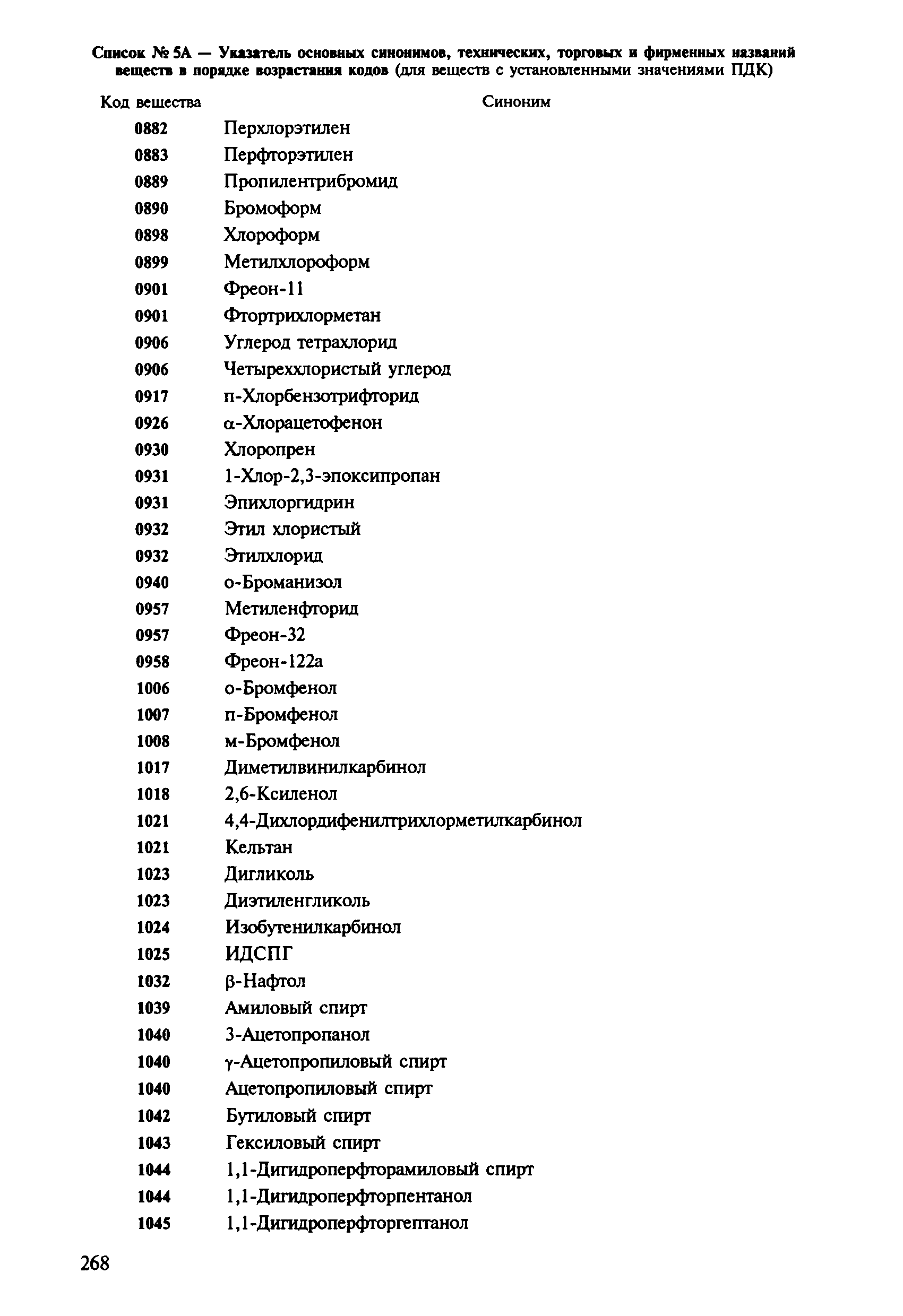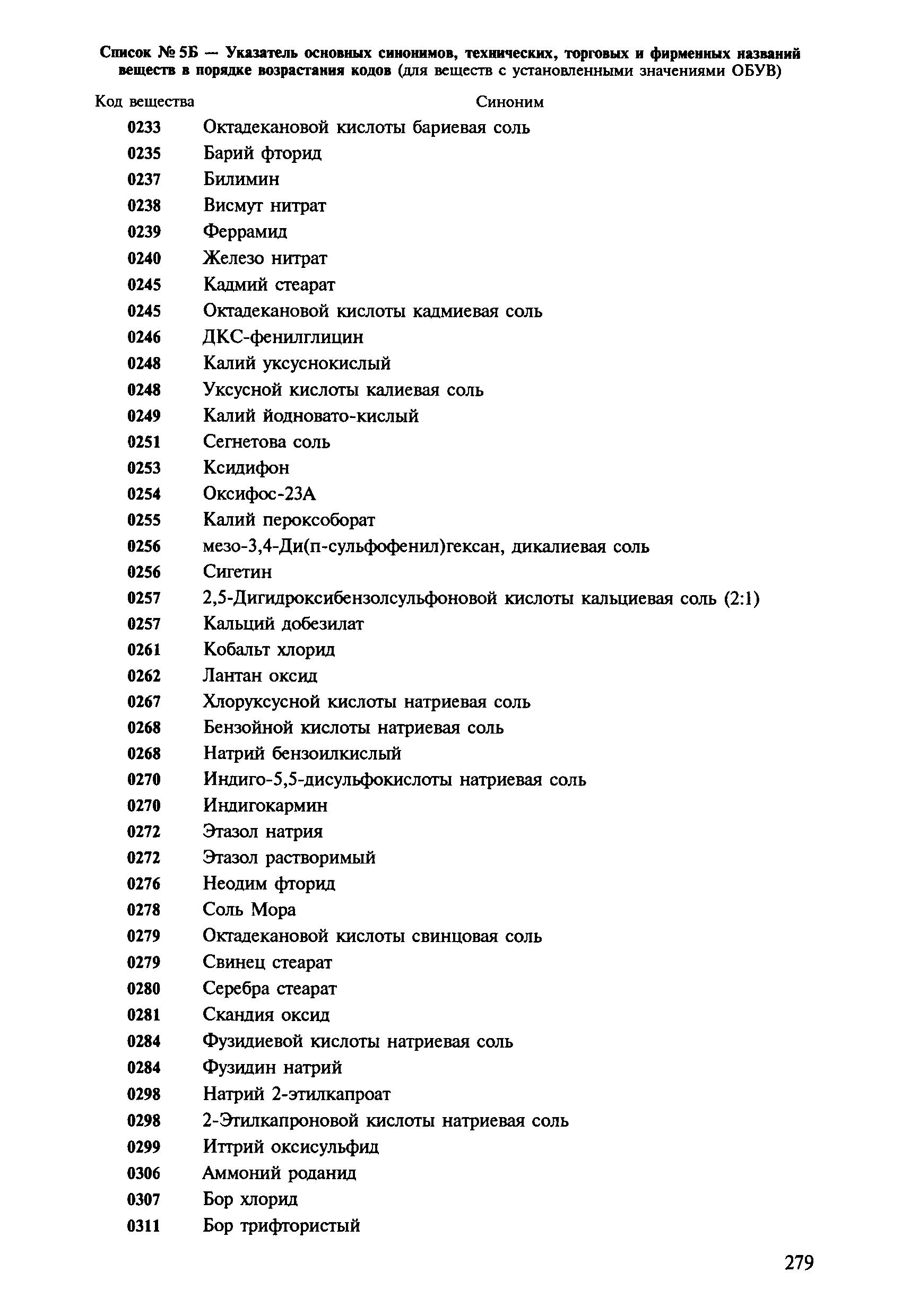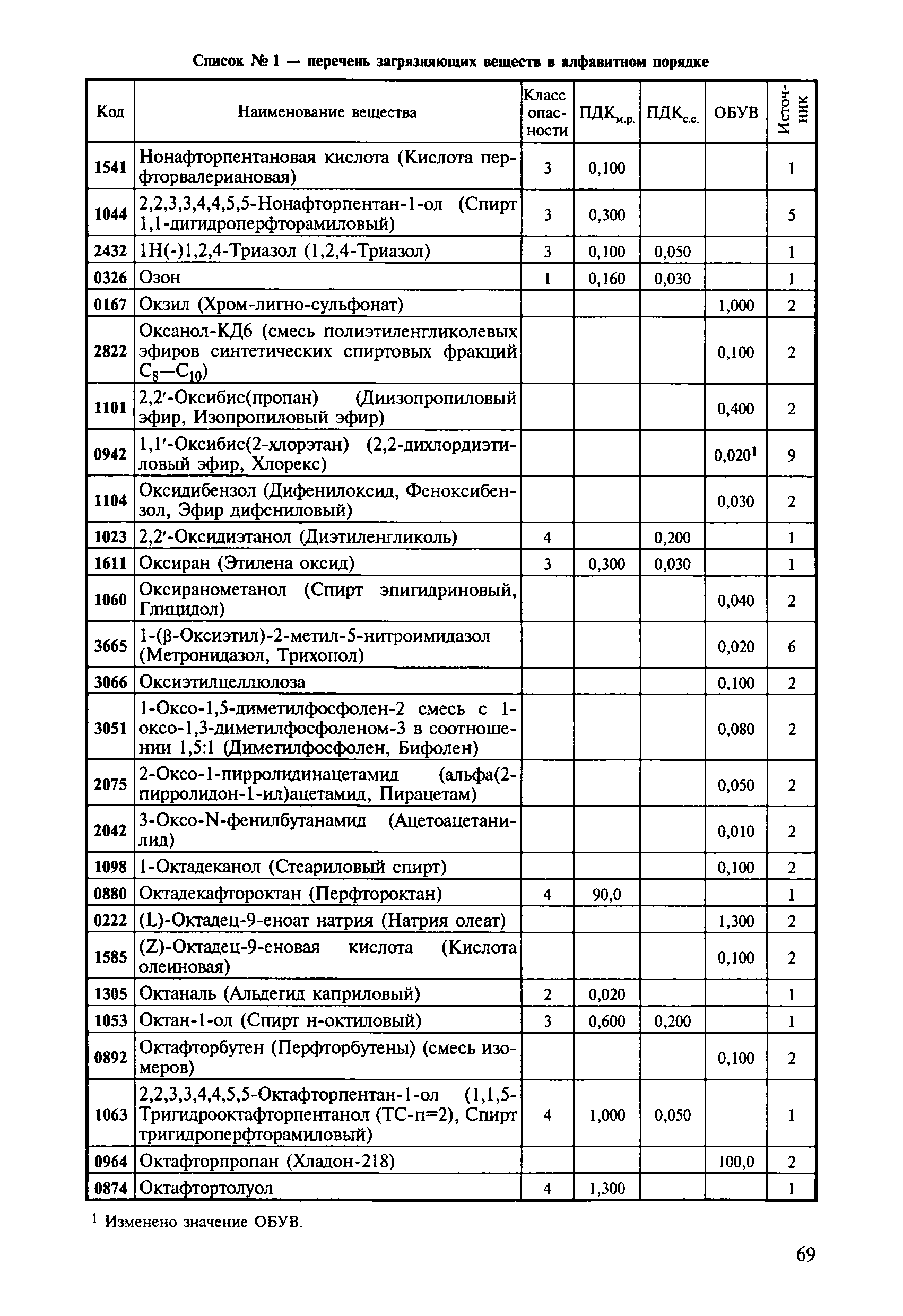 | Оглавление: | Список № 1 Перечень загрязняющих веществ в алфавитном порядке Список № 2 Перечень загрязняющих веществ в порядке возрастания кодов Список № 3 Перечень ЛОС в порядке возрастания кодов Список № 4 Указатель основных синонимов, технических, торговых и фирменных названий веществ в алфавитном порядке А. Для веществ с установленными значениями ПДК Б. Для веществ с установленными значениями ОБУВ Список № 5 Указатель основных синонимов, технических, торговых и фирменных названий веществ в порядке возрастания кодов А. Для веществ с установленными значениями ПДК Б. Для веществ с установленными значениями ОБУВ |