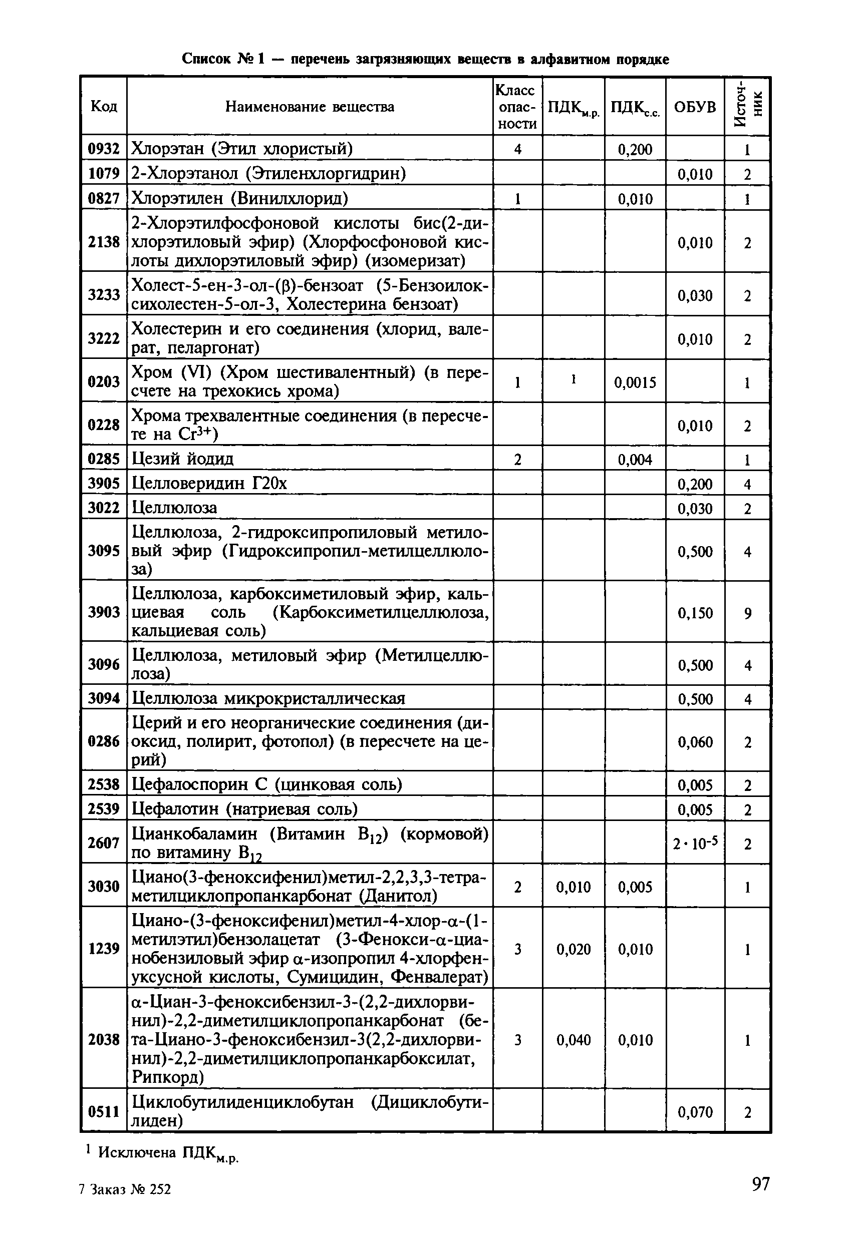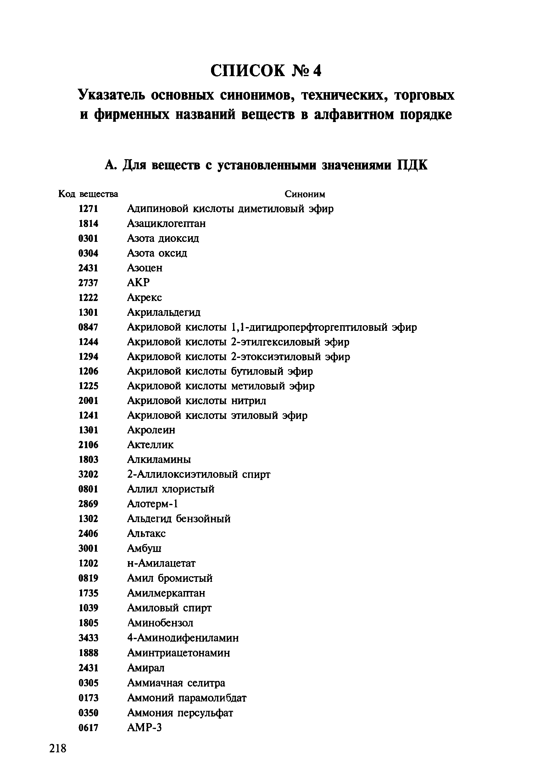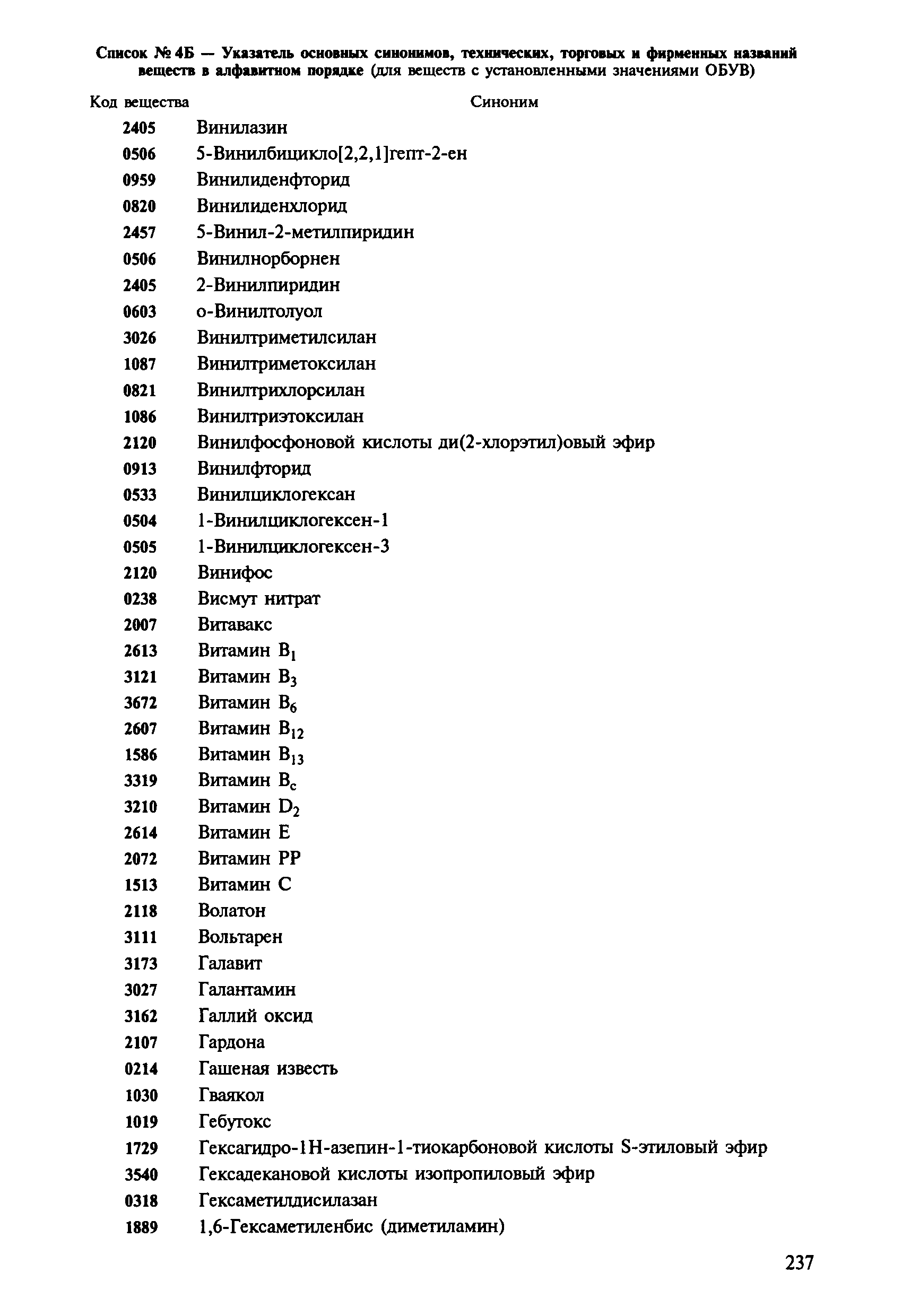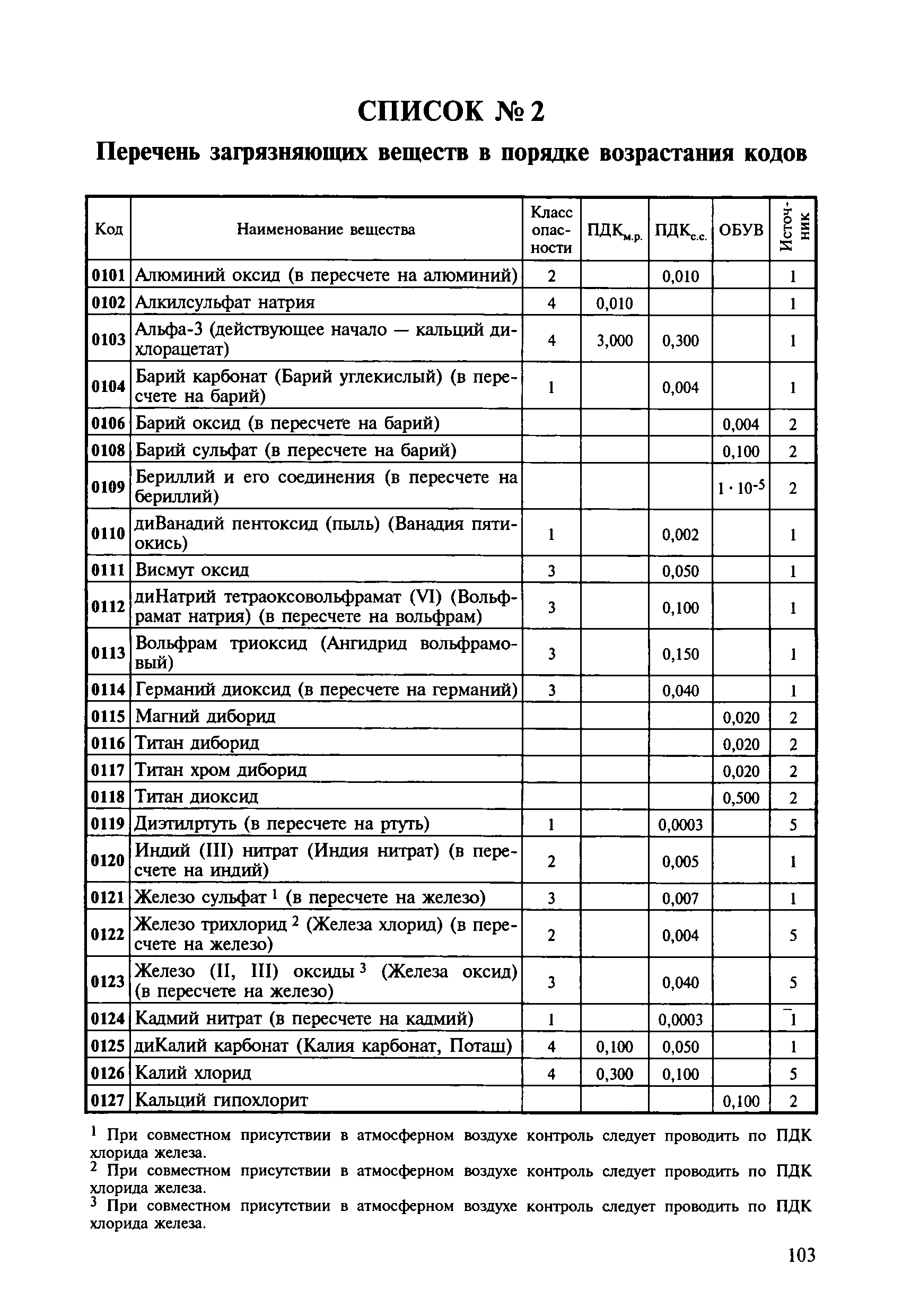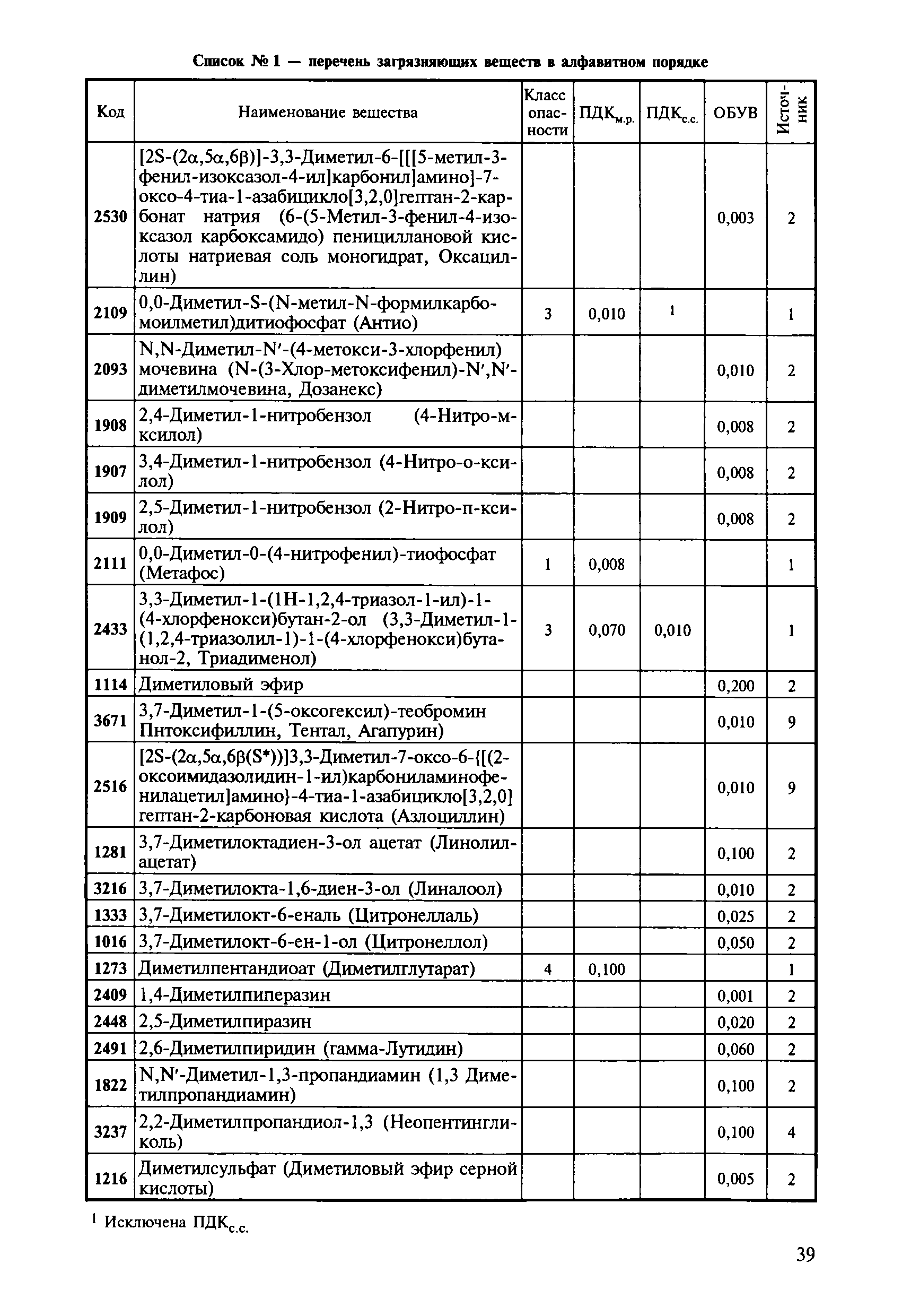| Оглавление: | Список № 1 Перечень загрязняющих веществ в алфавитном порядке Список № 2 Перечень загрязняющих веществ в порядке возрастания кодов Список № 3 Перечень ЛОС в порядке возрастания кодов Список № 4 Указатель основных синонимов, технических, торговых и фирменных названий веществ в алфавитном порядке А. Для веществ с установленными значениями ПДК Б. Для веществ с установленными значениями ОБУВ Список № 5 Указатель основных синонимов, технических, торговых и фирменных названий веществ в порядке возрастания кодов А. Для веществ с установленными значениями ПДК Б. Для веществ с установленными значениями ОБУВ |