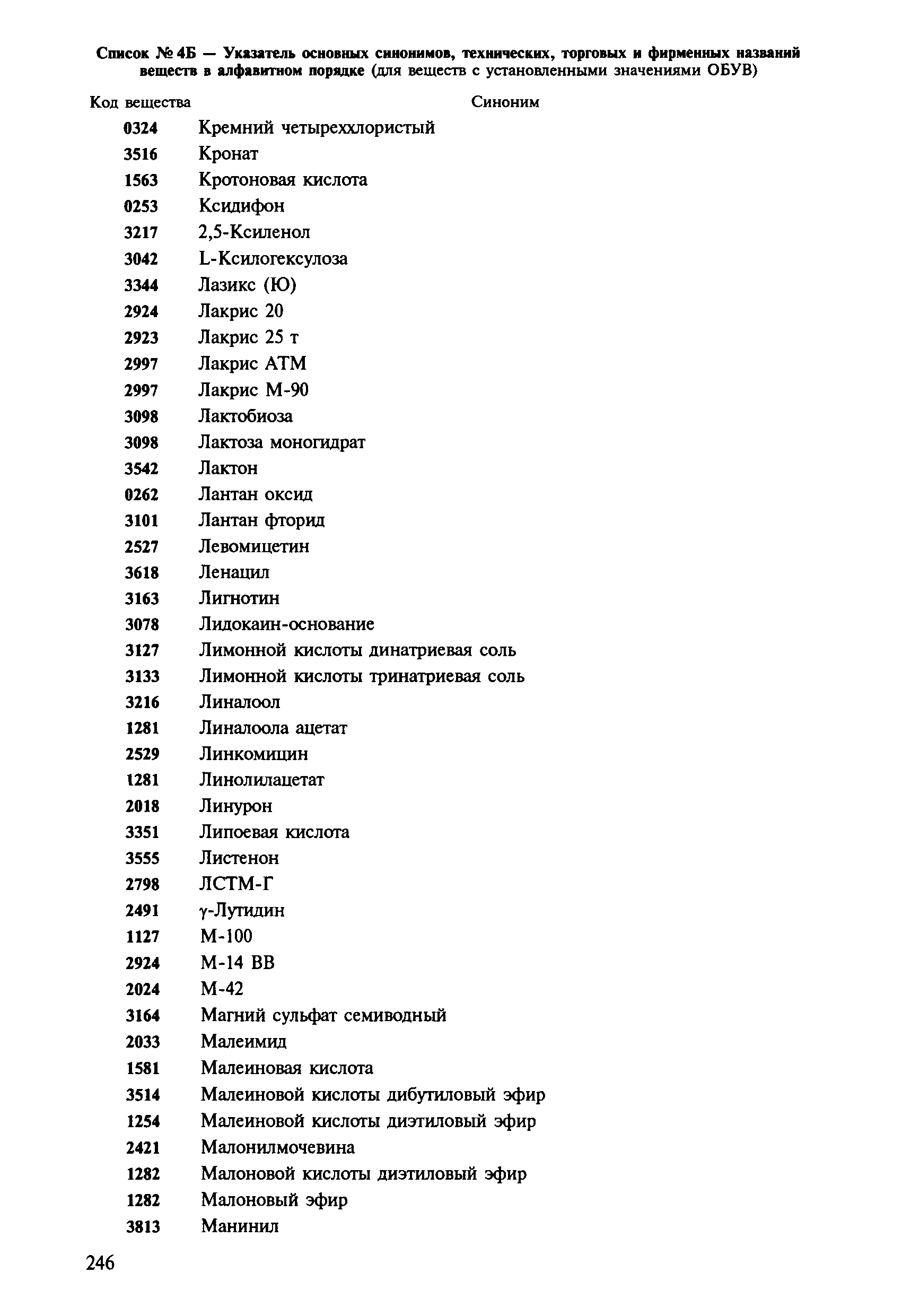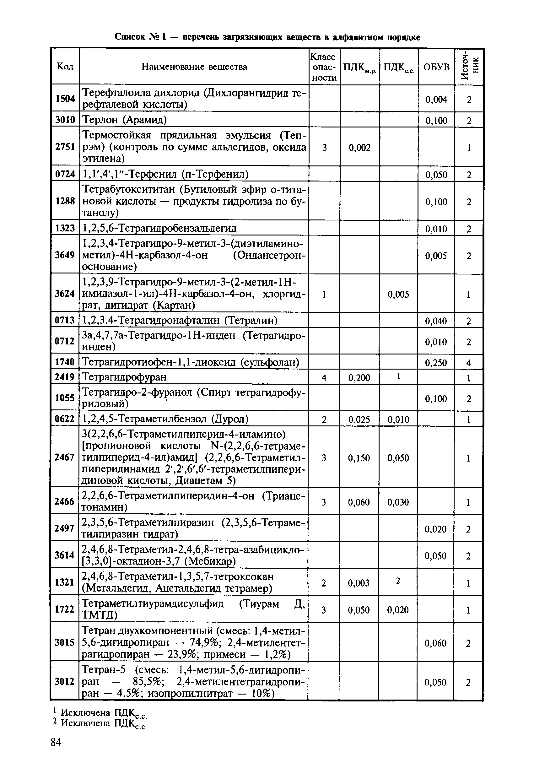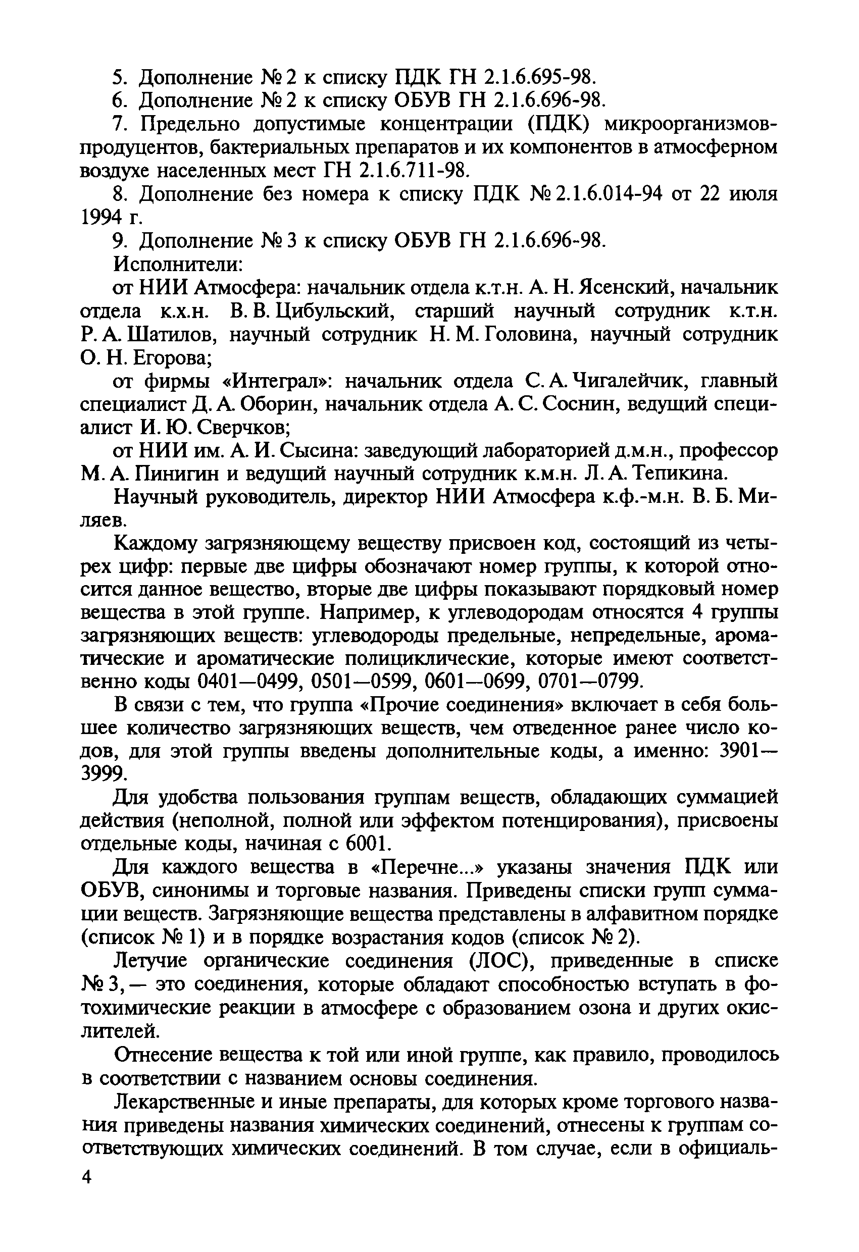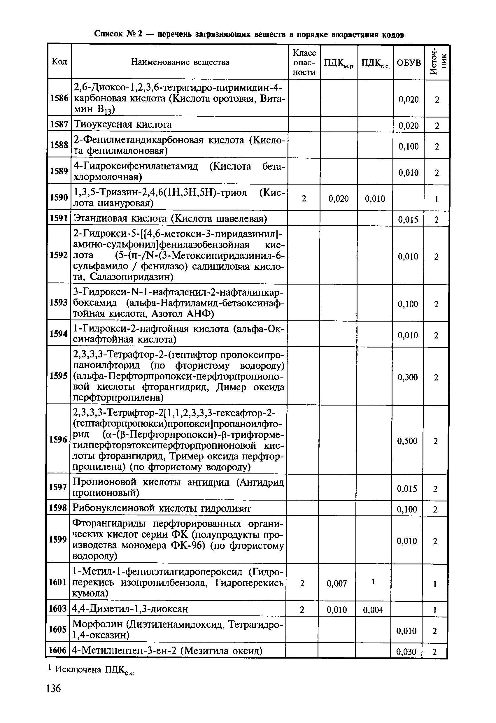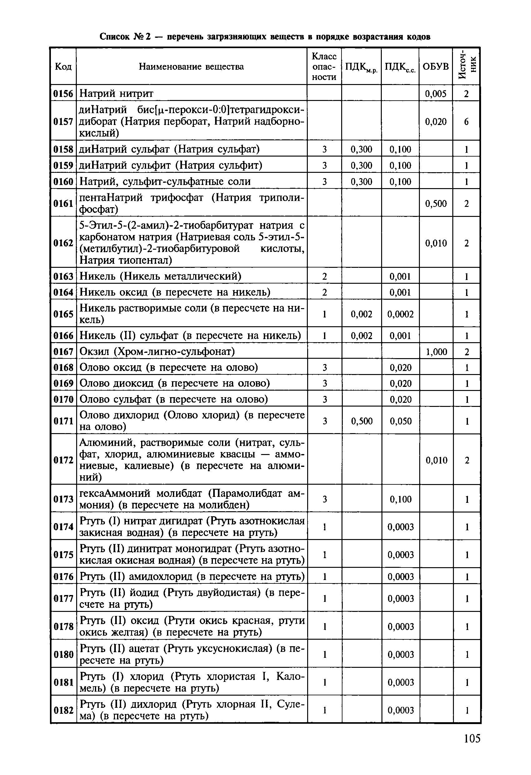 | Оглавление: | Список № 1 Перечень загрязняющих веществ в алфавитном порядке Список № 2 Перечень загрязняющих веществ в порядке возрастания кодов Список № 3 Перечень ЛОС в порядке возрастания кодов Список № 4 Указатель основных синонимов, технических, торговых и фирменных названий веществ в алфавитном порядке А. Для веществ с установленными значениями ПДК Б. Для веществ с установленными значениями ОБУВ Список № 5 Указатель основных синонимов, технических, торговых и фирменных названий веществ в порядке возрастания кодов А. Для веществ с установленными значениями ПДК Б. Для веществ с установленными значениями ОБУВ |