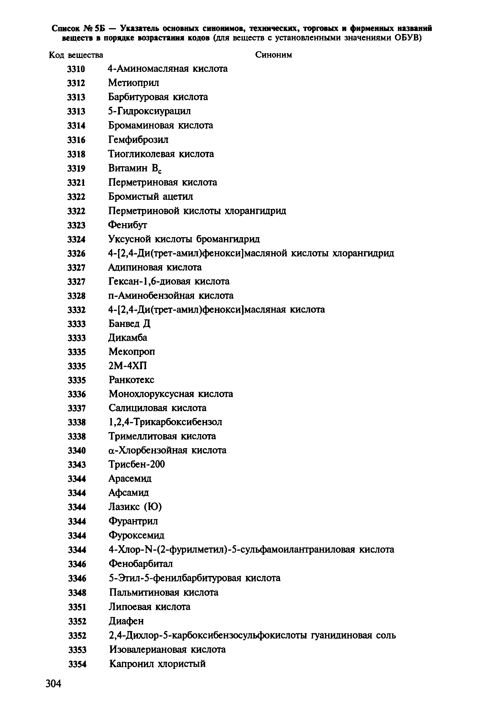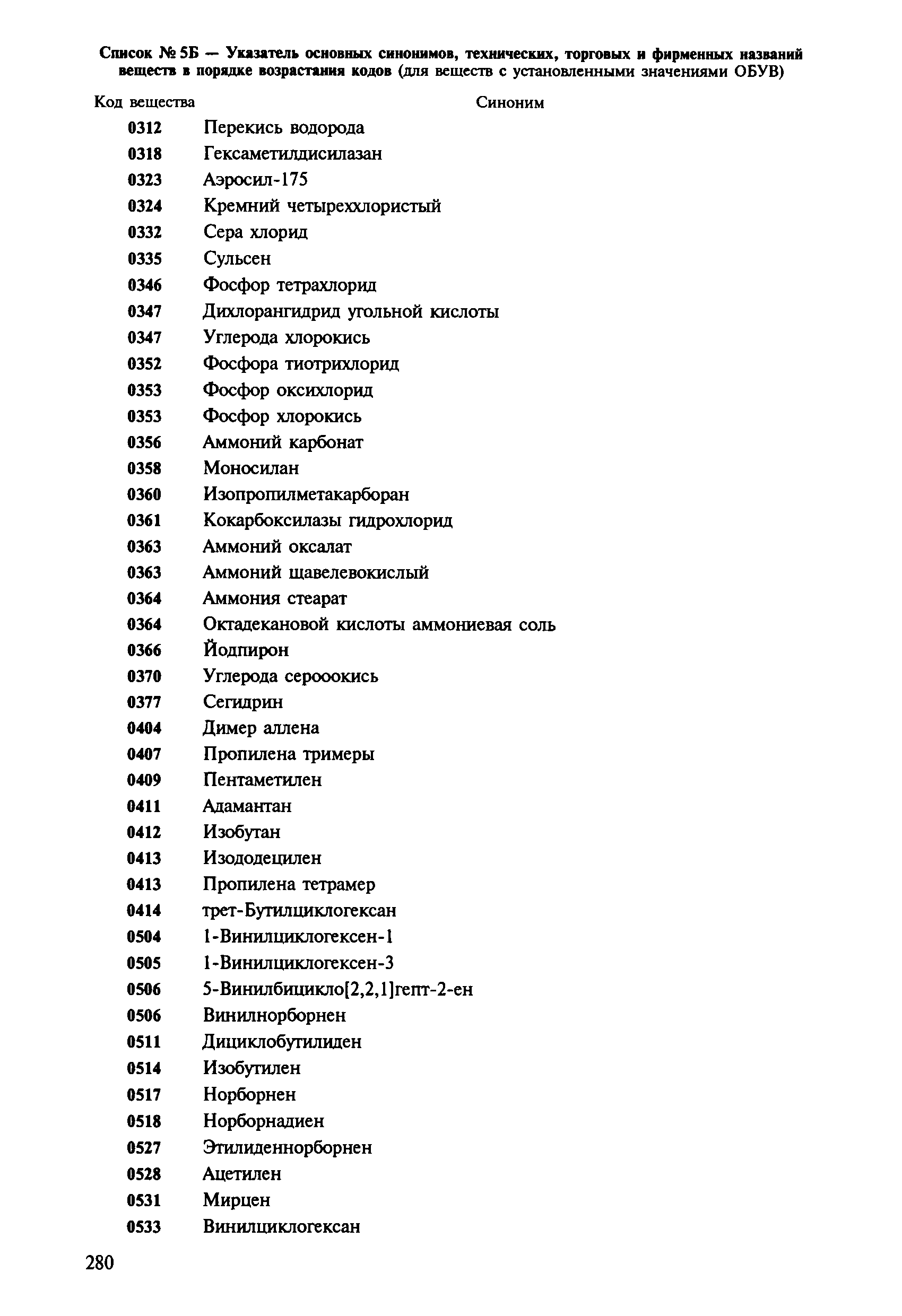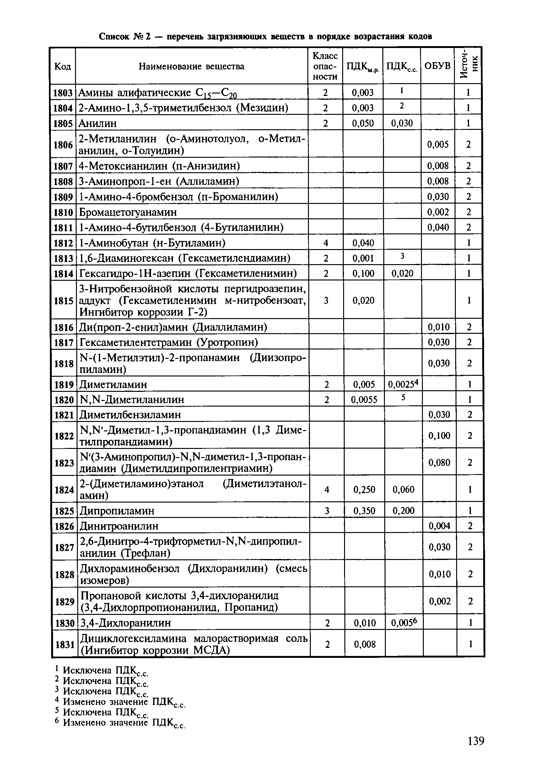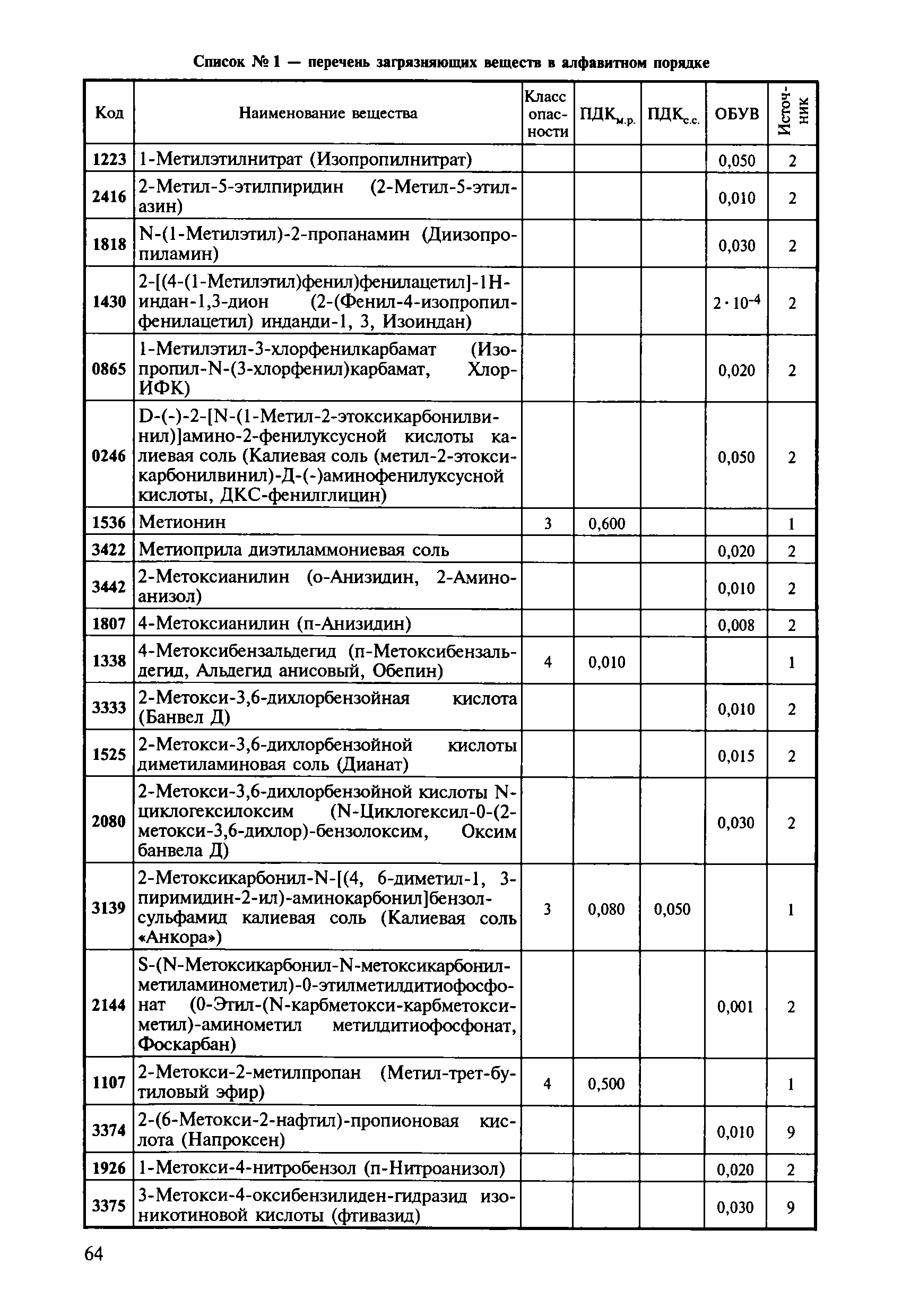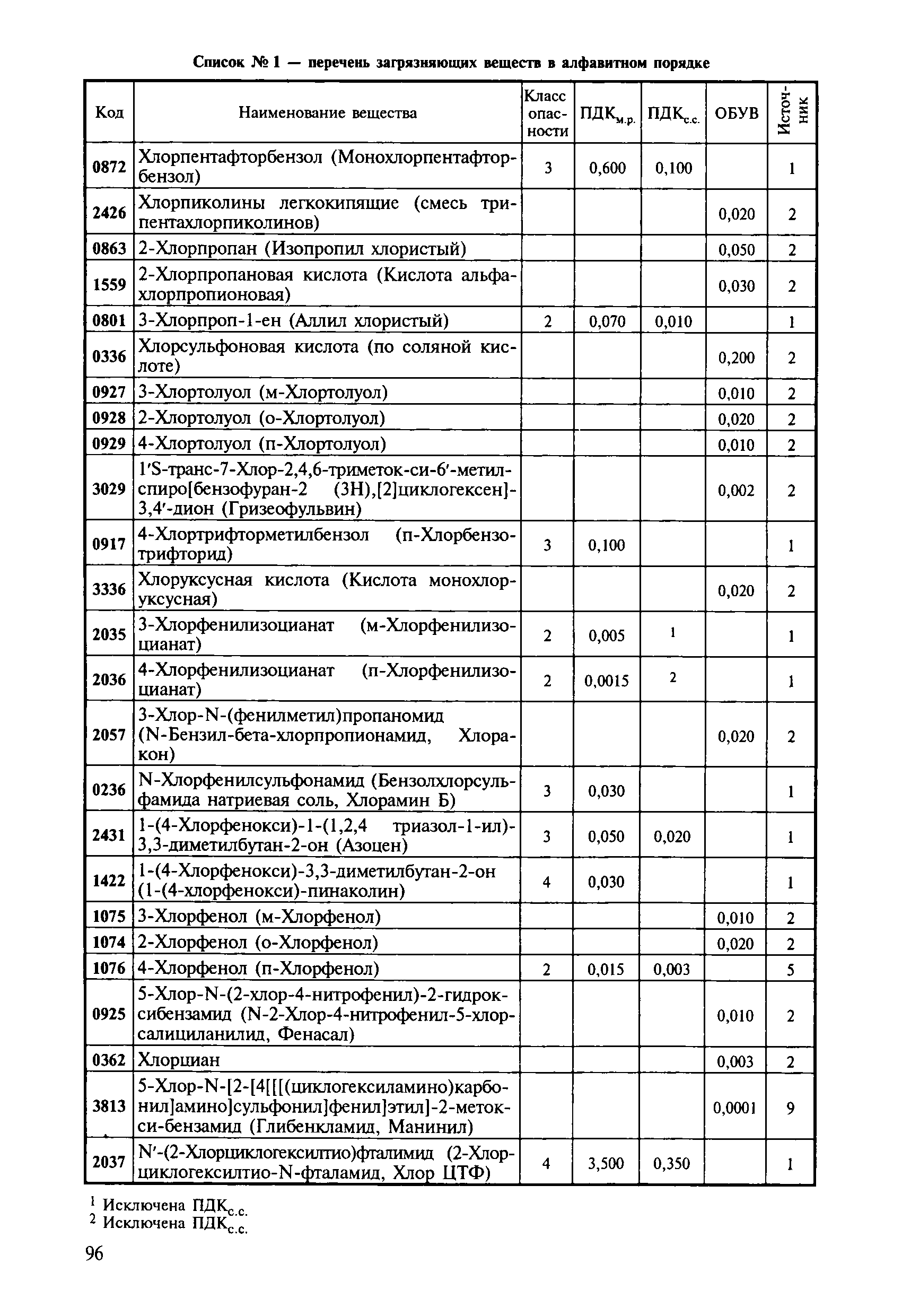 | Оглавление: | Список № 1 Перечень загрязняющих веществ в алфавитном порядке Список № 2 Перечень загрязняющих веществ в порядке возрастания кодов Список № 3 Перечень ЛОС в порядке возрастания кодов Список № 4 Указатель основных синонимов, технических, торговых и фирменных названий веществ в алфавитном порядке А. Для веществ с установленными значениями ПДК Б. Для веществ с установленными значениями ОБУВ Список № 5 Указатель основных синонимов, технических, торговых и фирменных названий веществ в порядке возрастания кодов А. Для веществ с установленными значениями ПДК Б. Для веществ с установленными значениями ОБУВ |