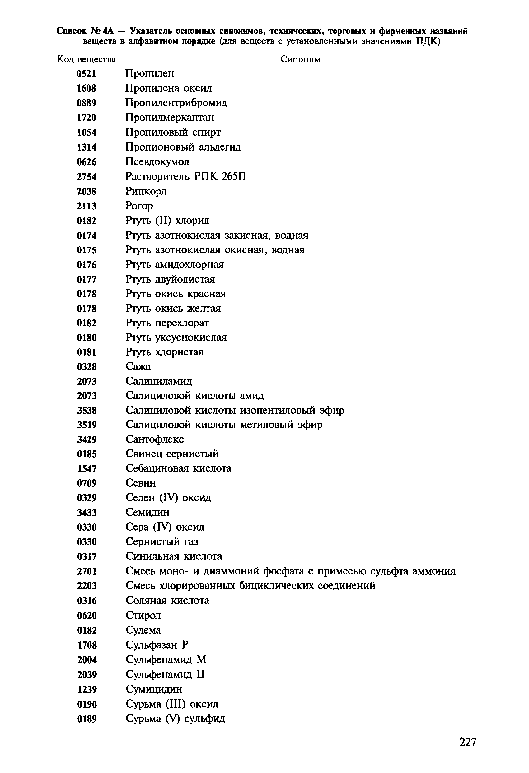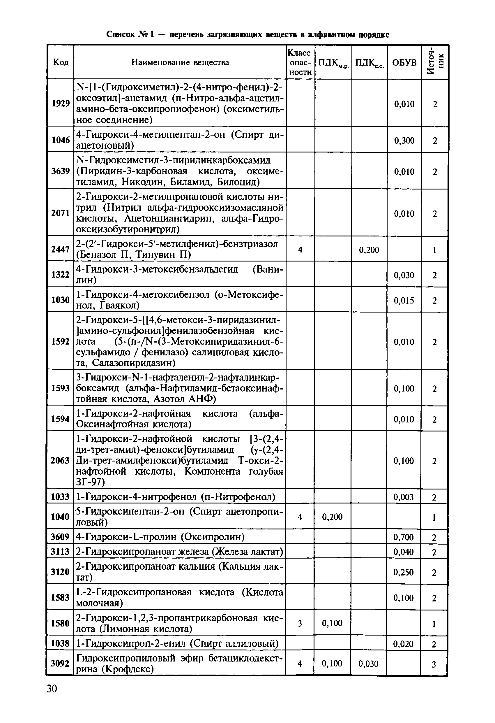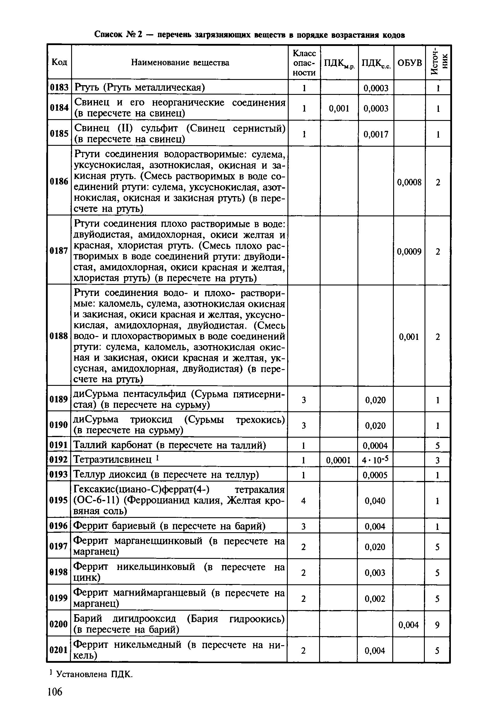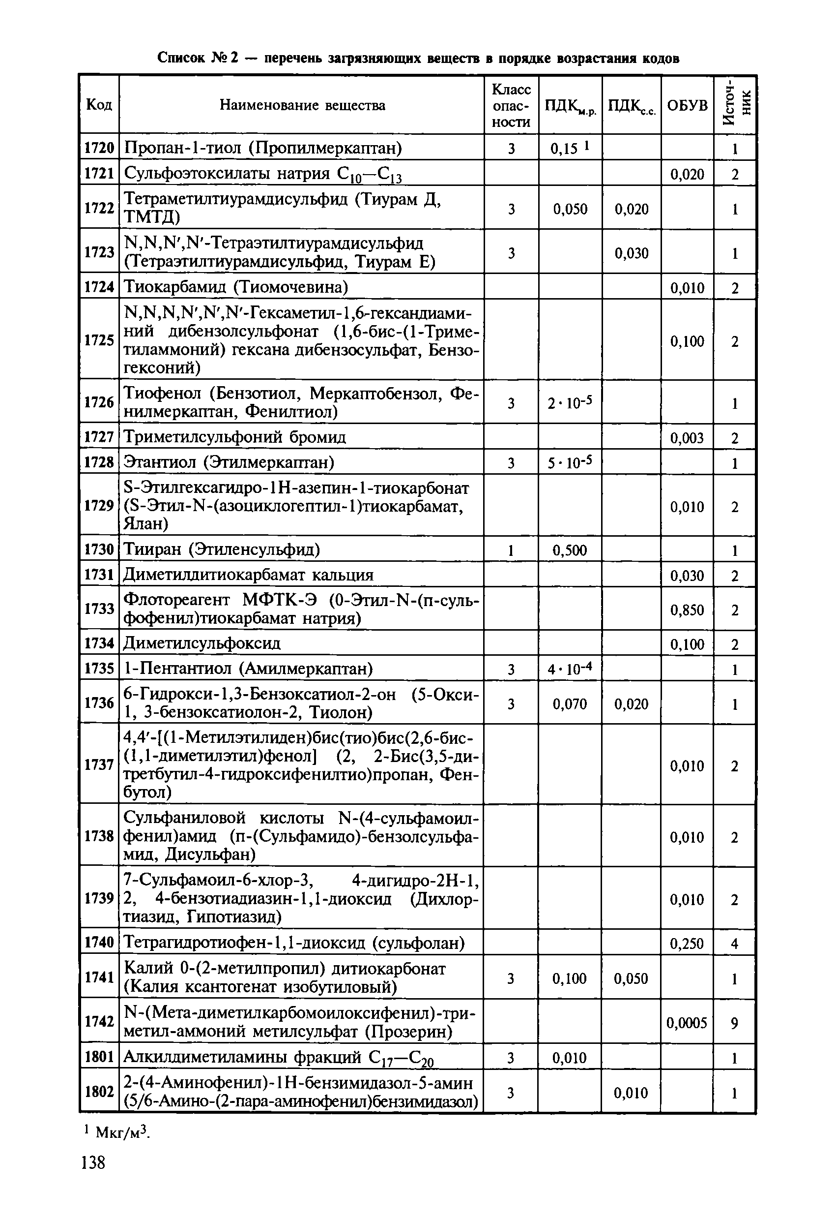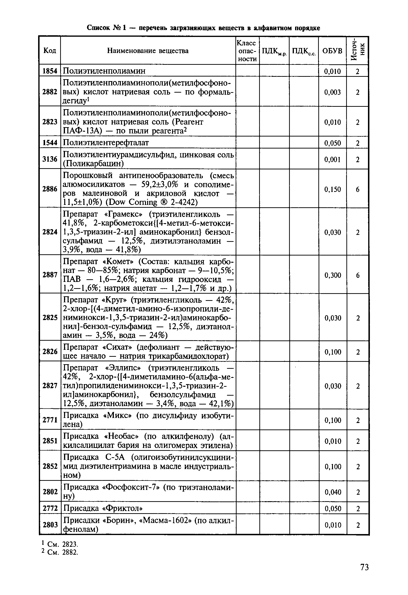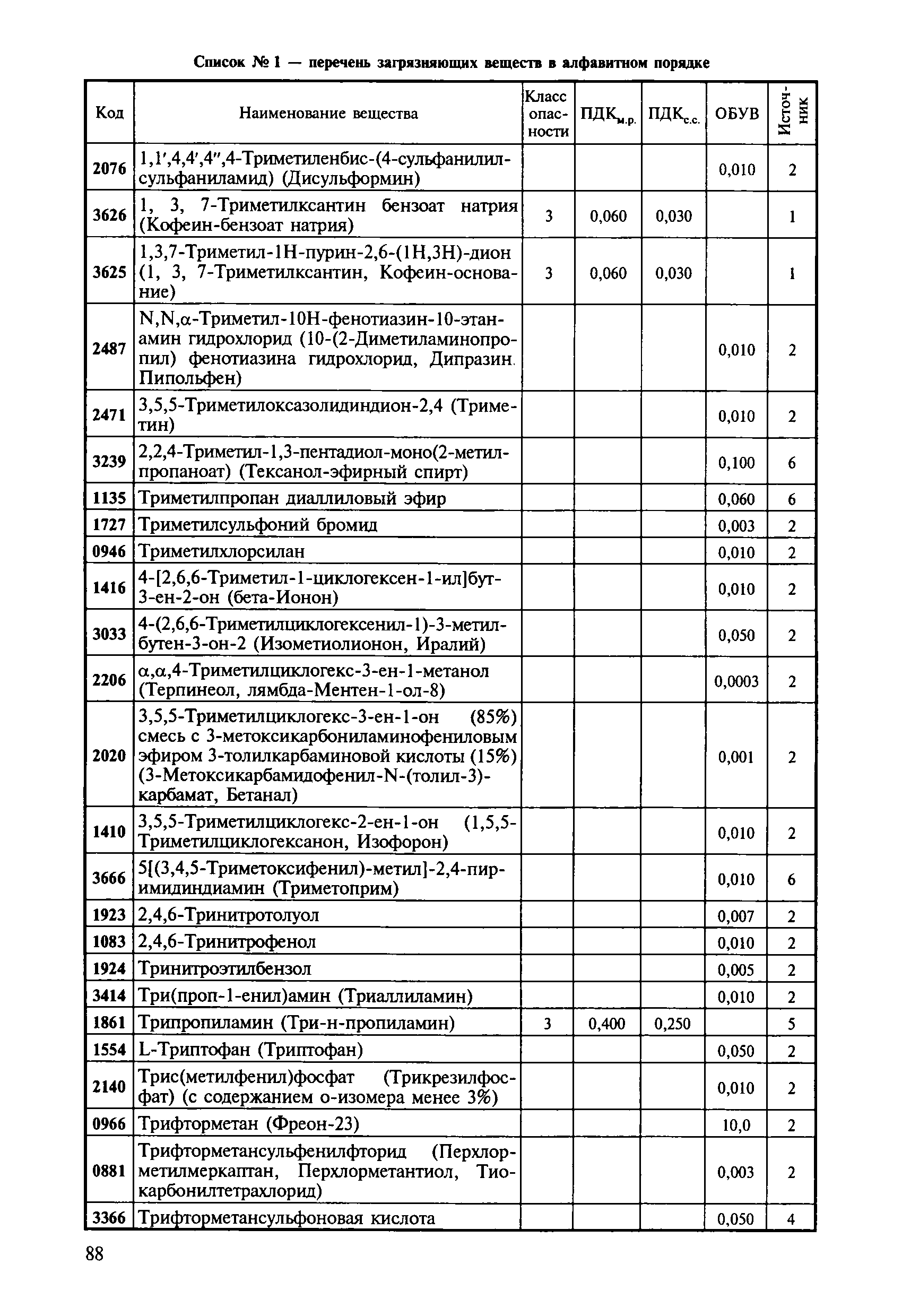 | Оглавление: | Список № 1 Перечень загрязняющих веществ в алфавитном порядке Список № 2 Перечень загрязняющих веществ в порядке возрастания кодов Список № 3 Перечень ЛОС в порядке возрастания кодов Список № 4 Указатель основных синонимов, технических, торговых и фирменных названий веществ в алфавитном порядке А. Для веществ с установленными значениями ПДК Б. Для веществ с установленными значениями ОБУВ Список № 5 Указатель основных синонимов, технических, торговых и фирменных названий веществ в порядке возрастания кодов А. Для веществ с установленными значениями ПДК Б. Для веществ с установленными значениями ОБУВ |