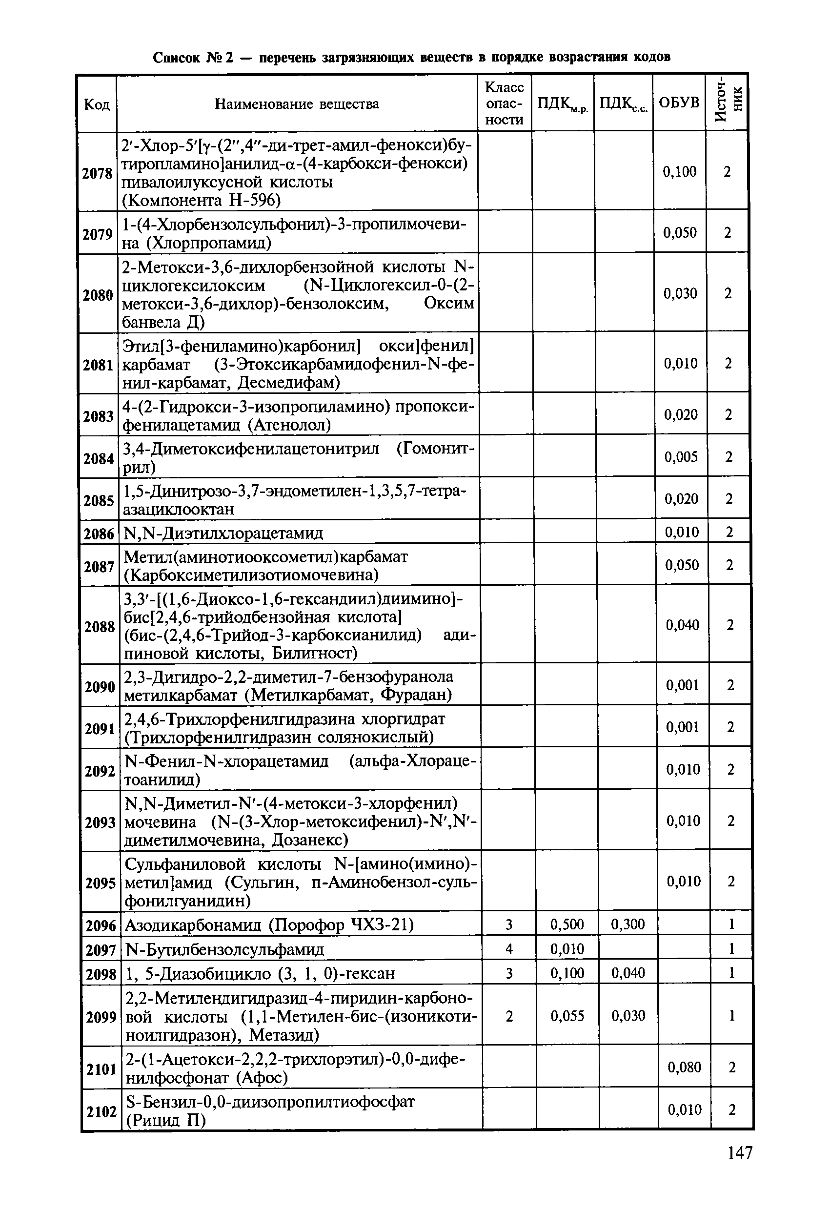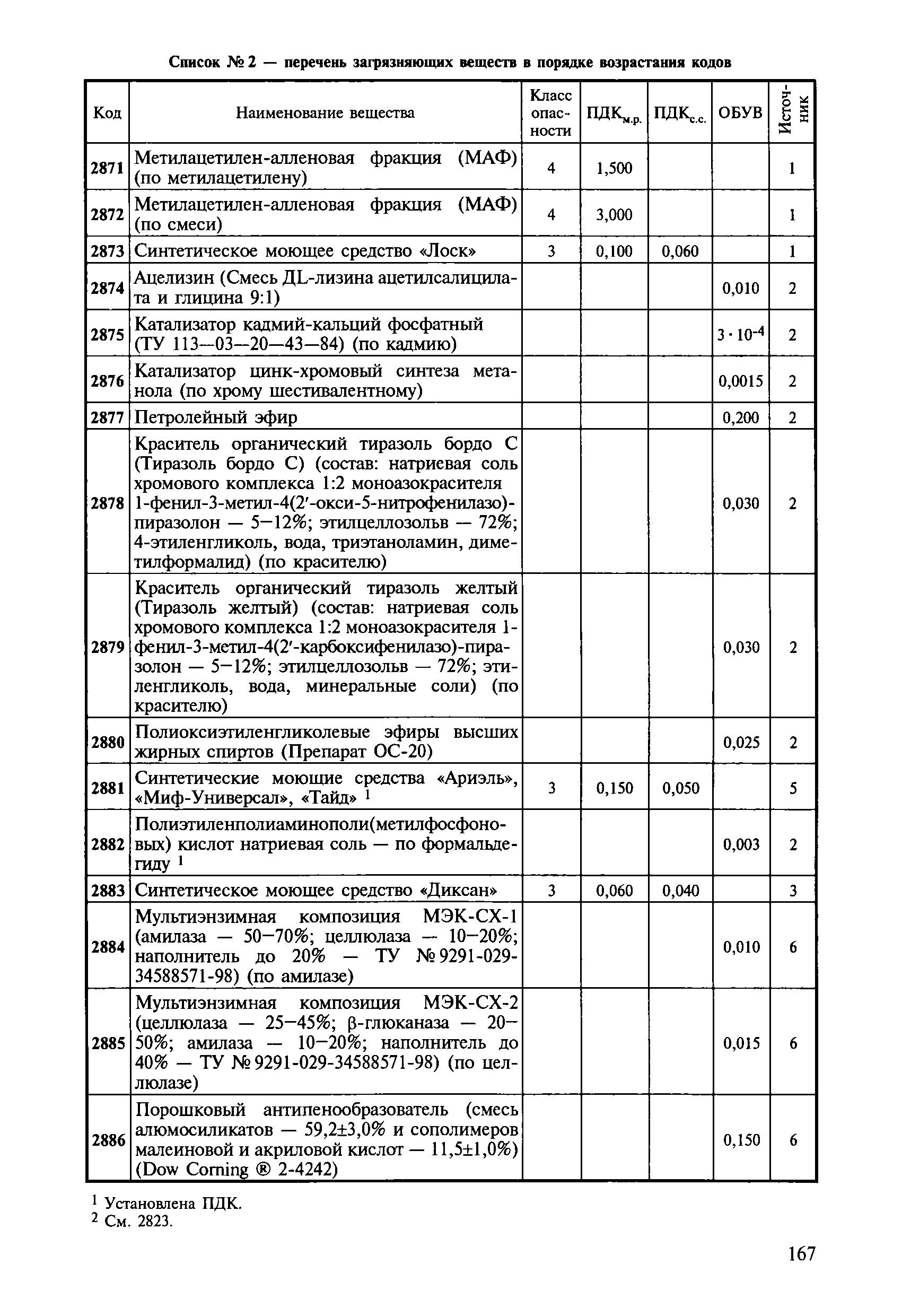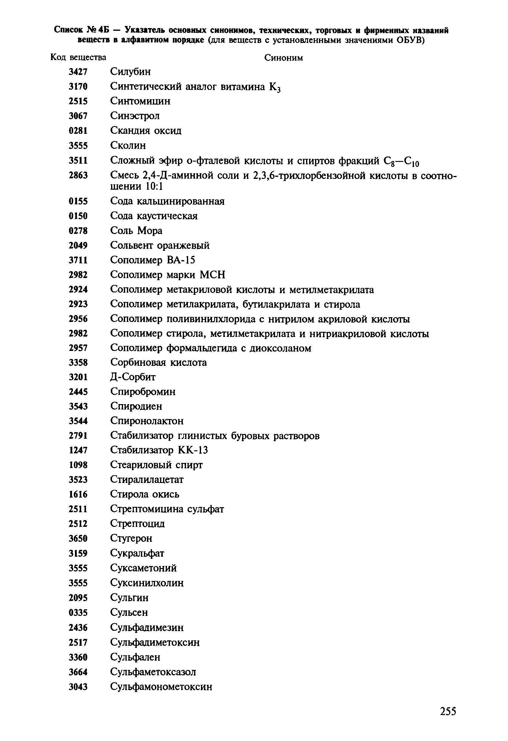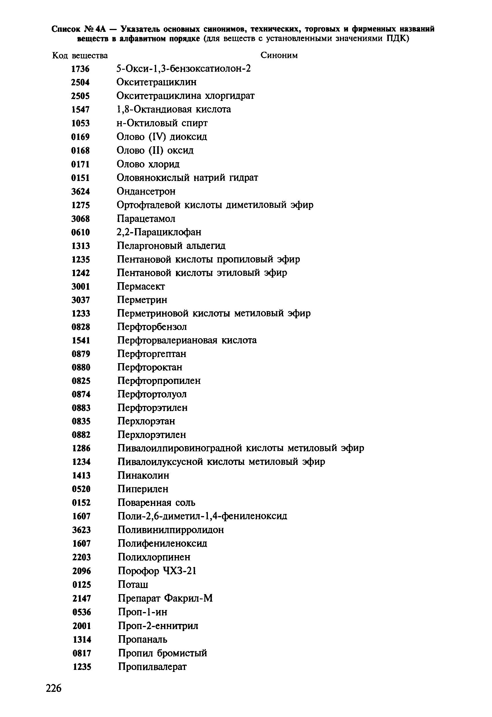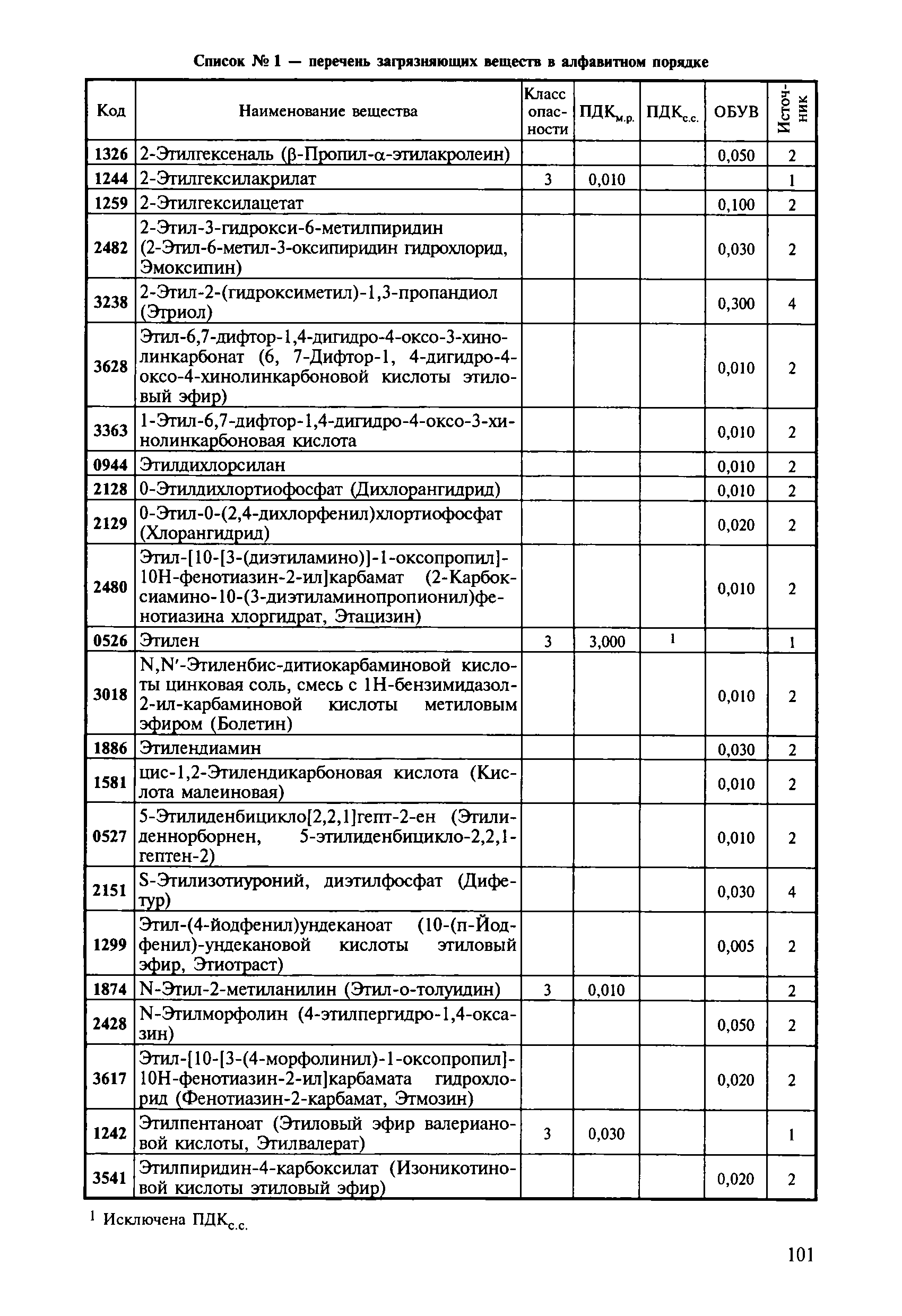 | Оглавление: | Список № 1 Перечень загрязняющих веществ в алфавитном порядке Список № 2 Перечень загрязняющих веществ в порядке возрастания кодов Список № 3 Перечень ЛОС в порядке возрастания кодов Список № 4 Указатель основных синонимов, технических, торговых и фирменных названий веществ в алфавитном порядке А. Для веществ с установленными значениями ПДК Б. Для веществ с установленными значениями ОБУВ Список № 5 Указатель основных синонимов, технических, торговых и фирменных названий веществ в порядке возрастания кодов А. Для веществ с установленными значениями ПДК Б. Для веществ с установленными значениями ОБУВ |