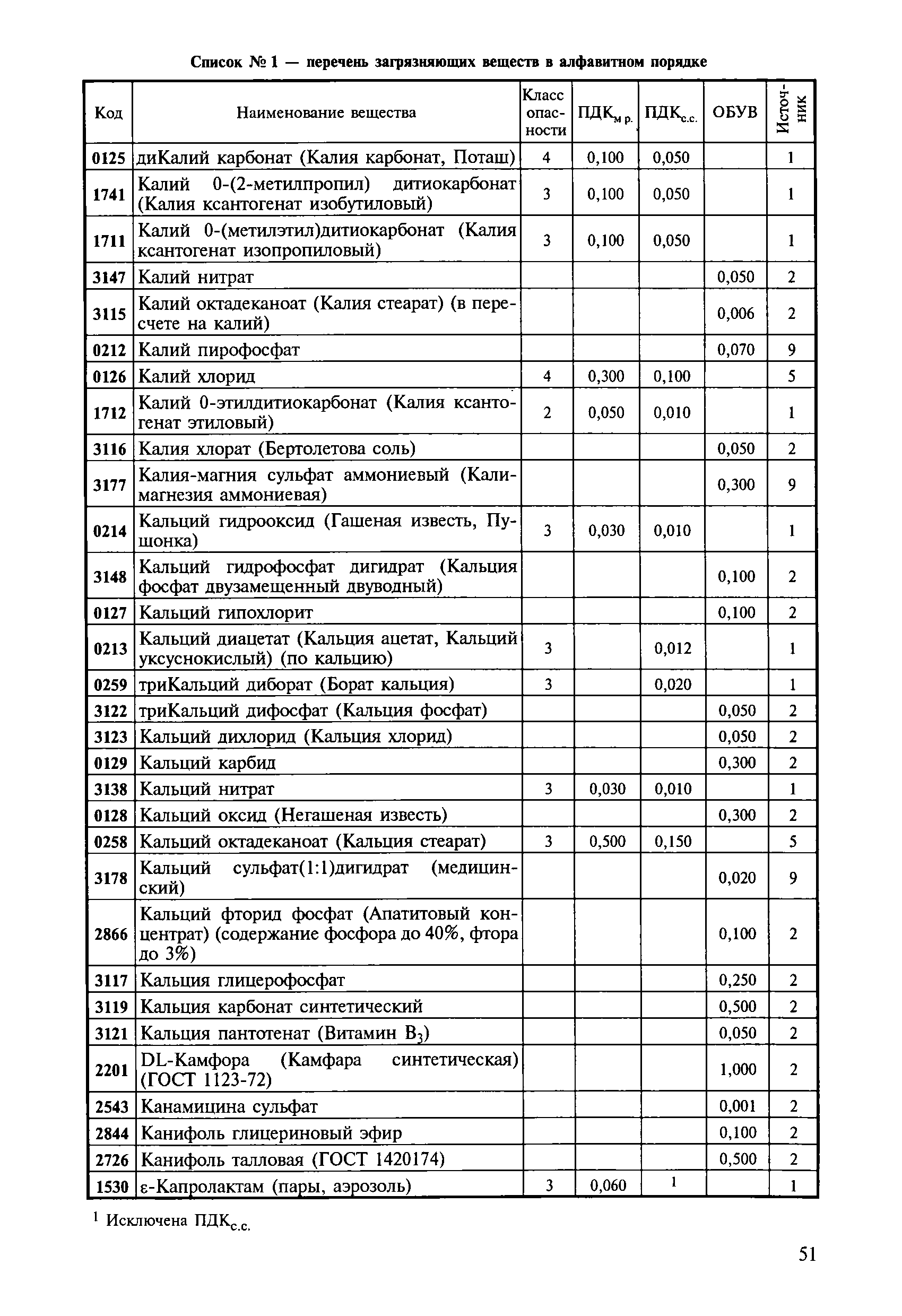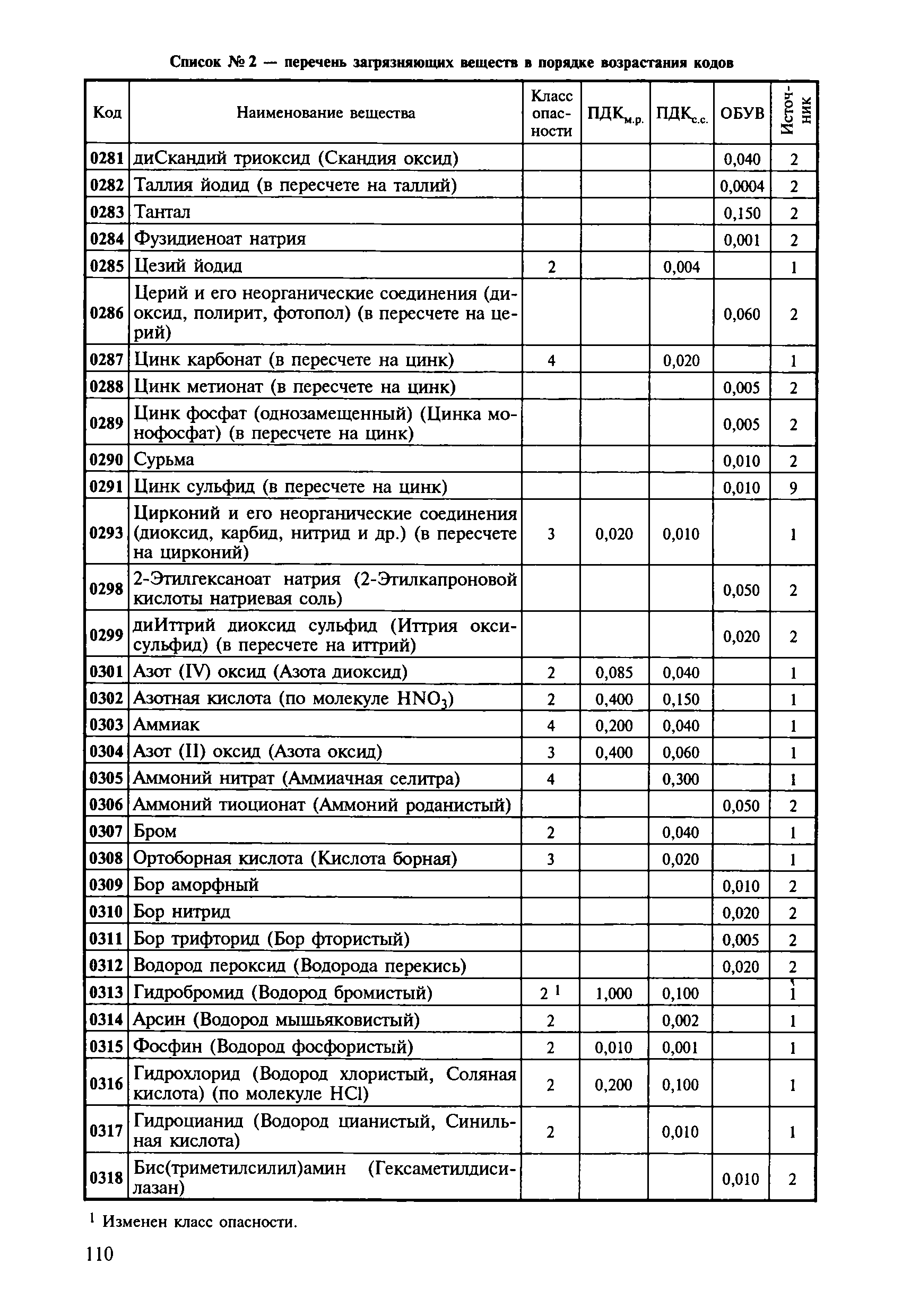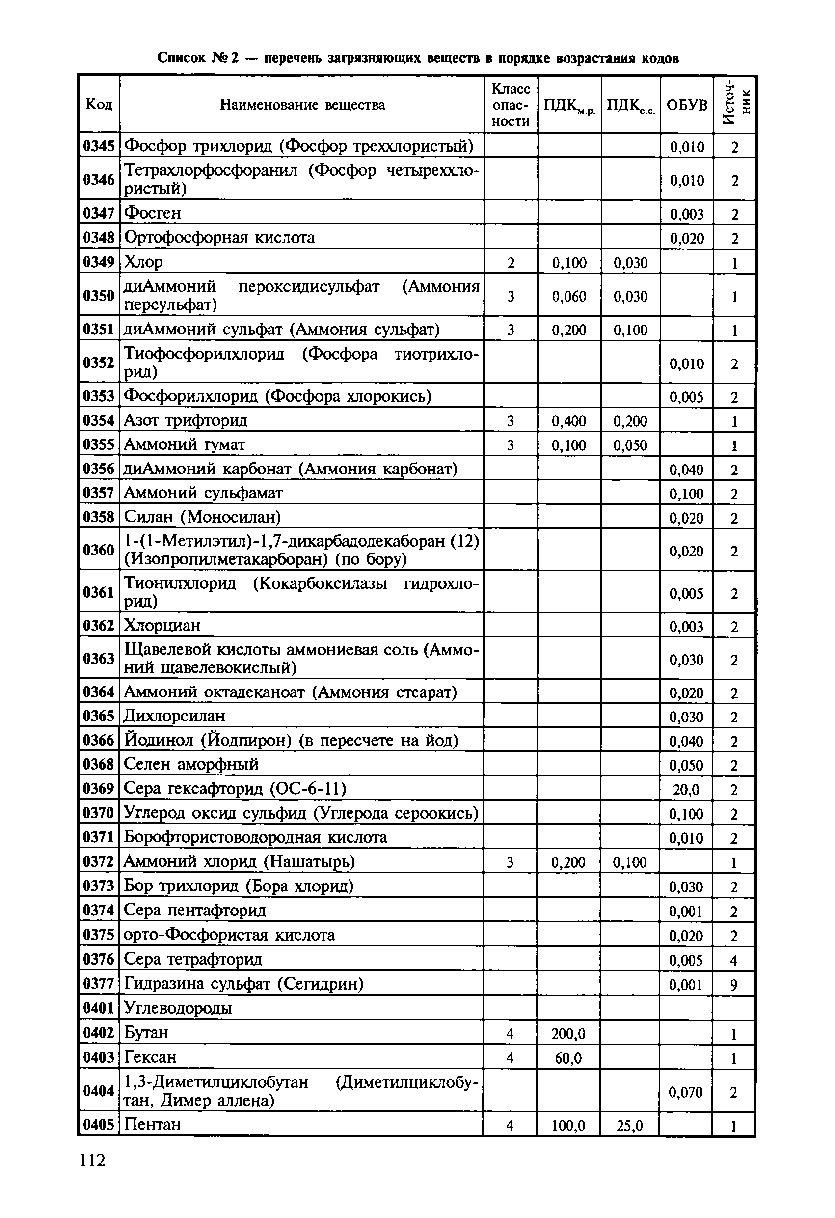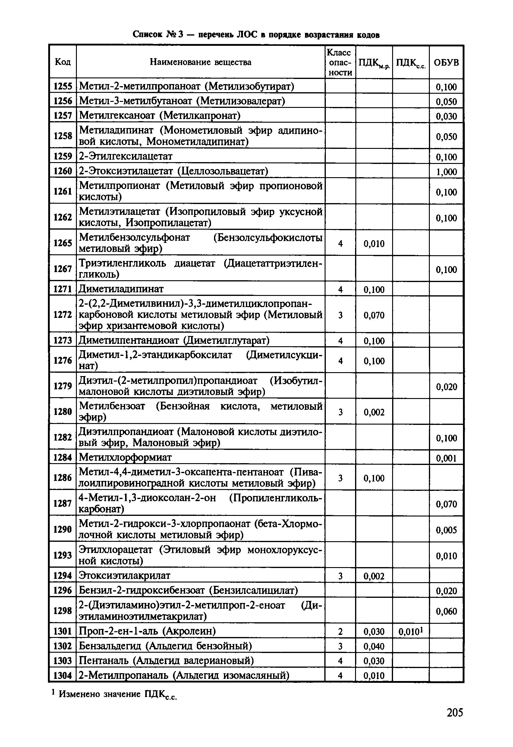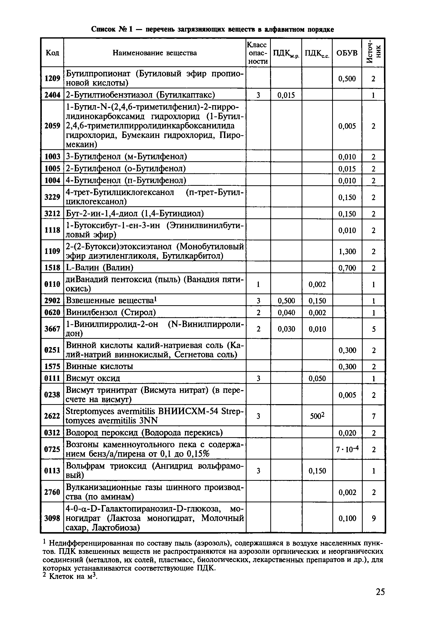 | Оглавление: | Список № 1 Перечень загрязняющих веществ в алфавитном порядке Список № 2 Перечень загрязняющих веществ в порядке возрастания кодов Список № 3 Перечень ЛОС в порядке возрастания кодов Список № 4 Указатель основных синонимов, технических, торговых и фирменных названий веществ в алфавитном порядке А. Для веществ с установленными значениями ПДК Б. Для веществ с установленными значениями ОБУВ Список № 5 Указатель основных синонимов, технических, торговых и фирменных названий веществ в порядке возрастания кодов А. Для веществ с установленными значениями ПДК Б. Для веществ с установленными значениями ОБУВ |