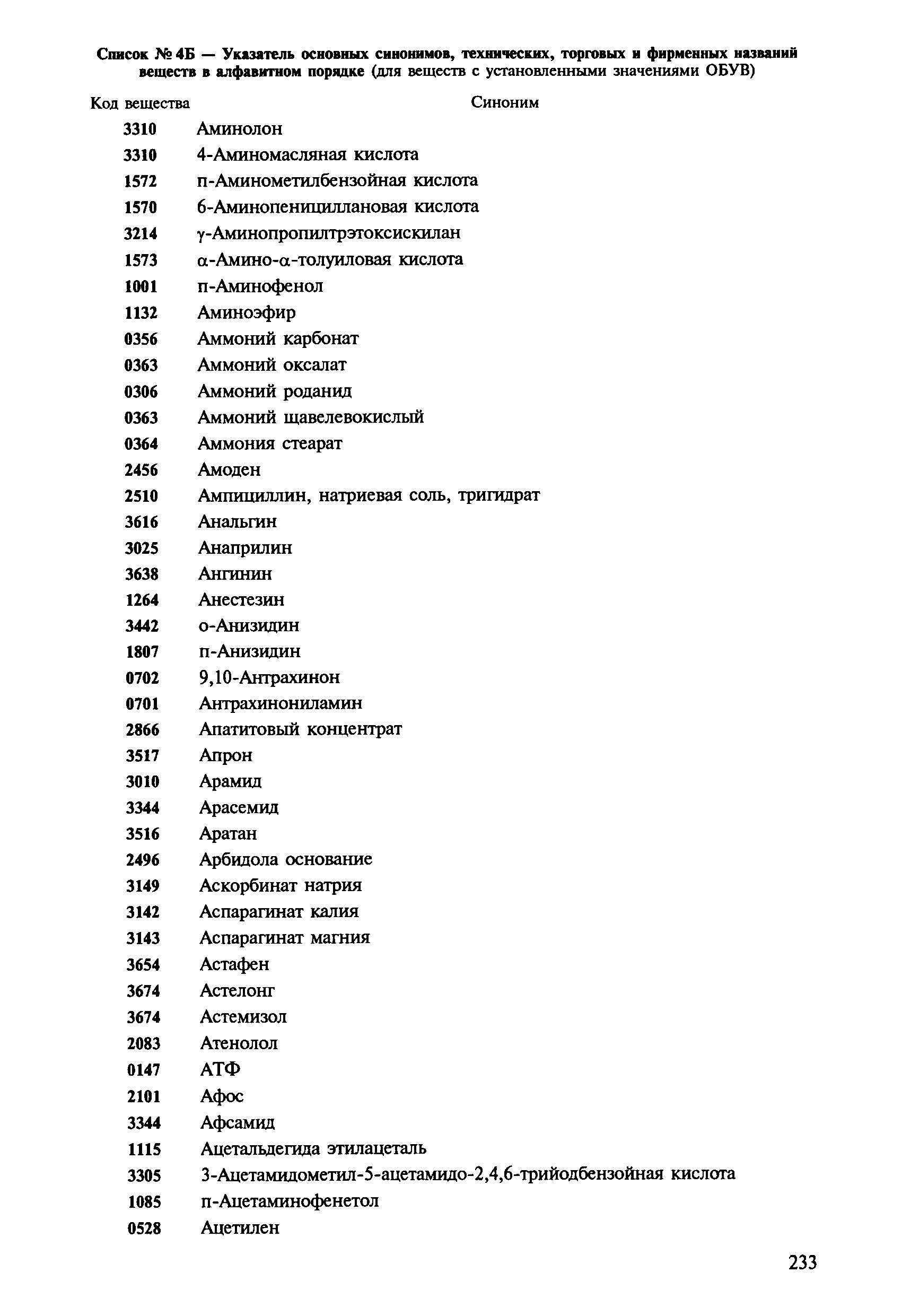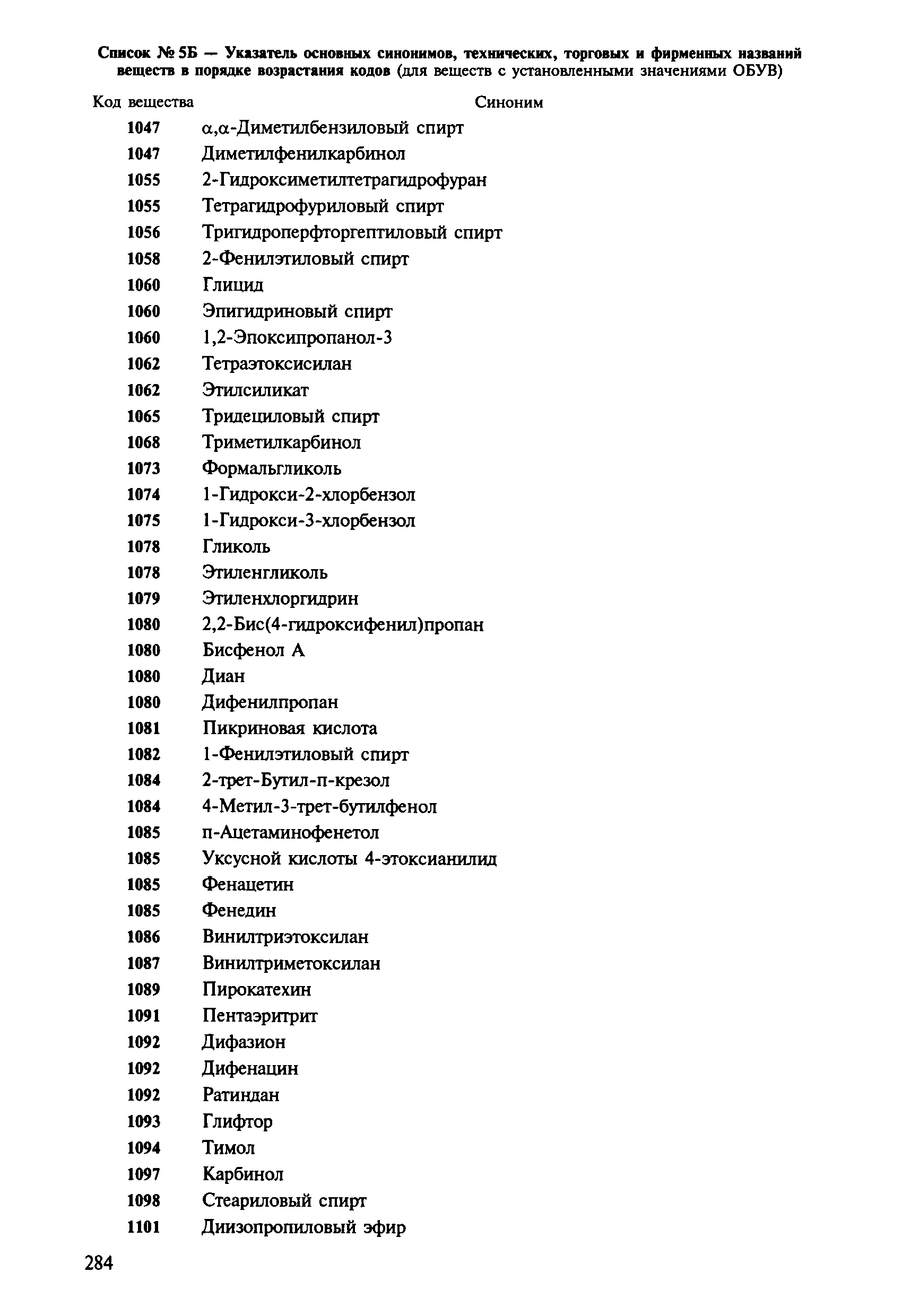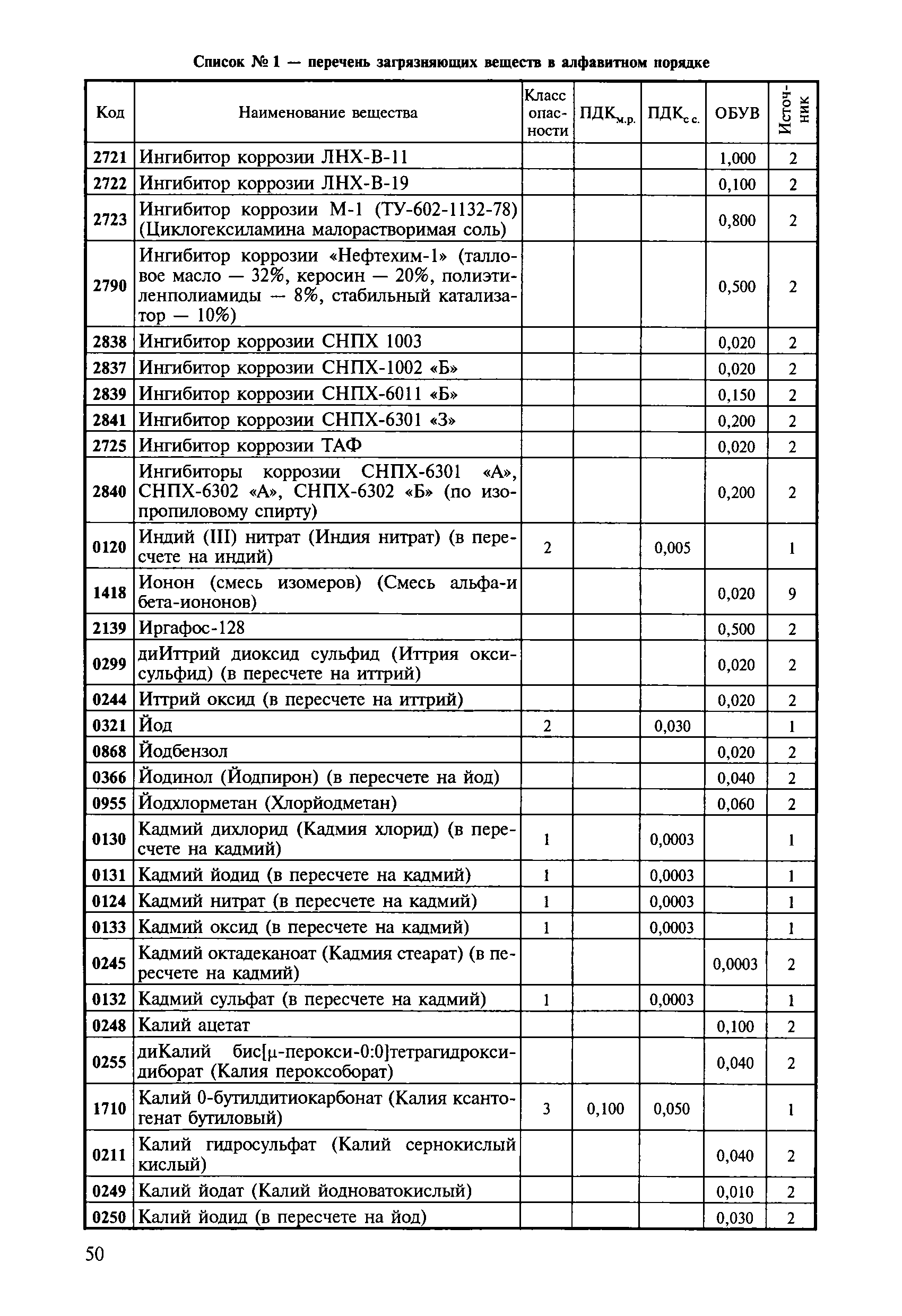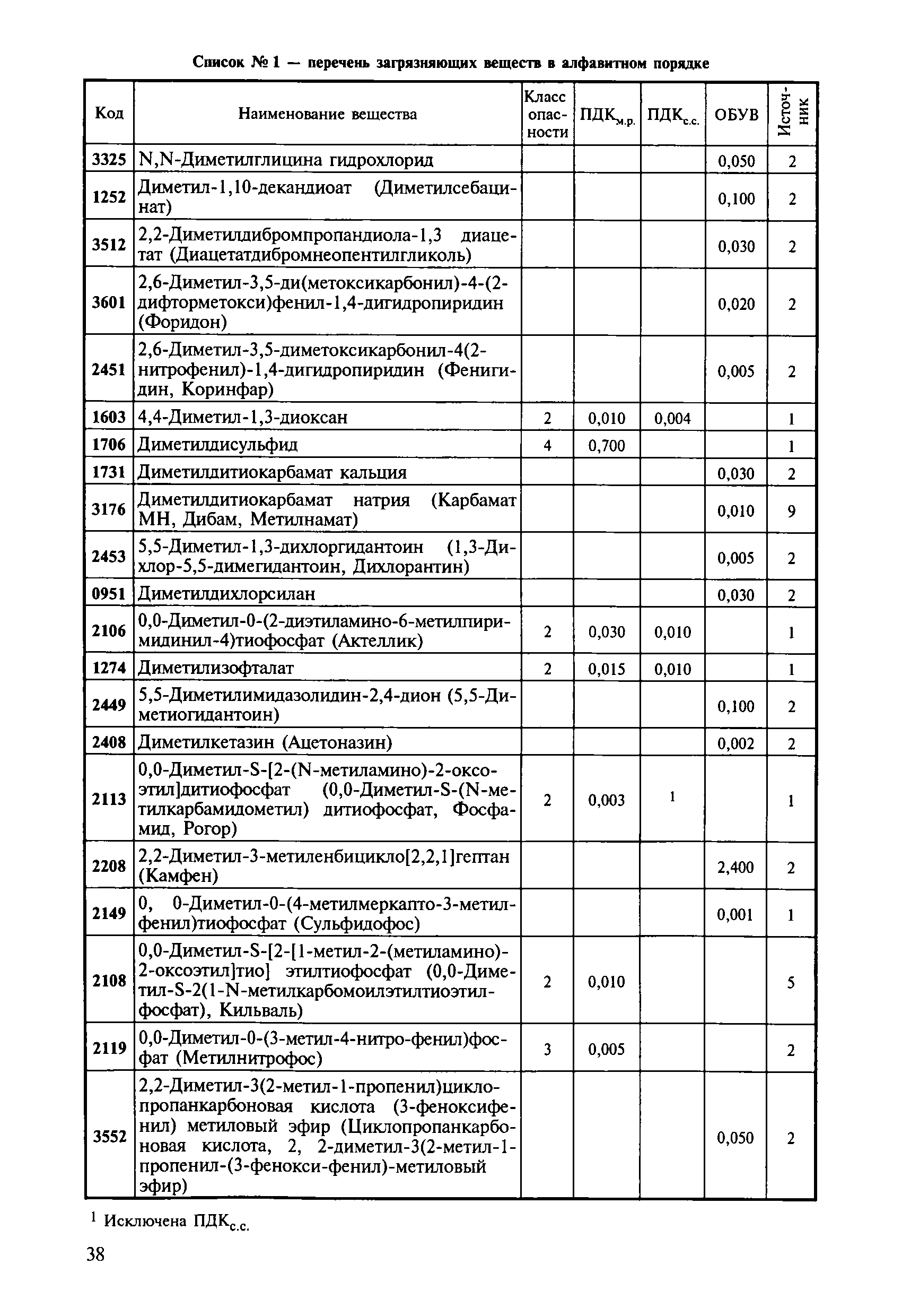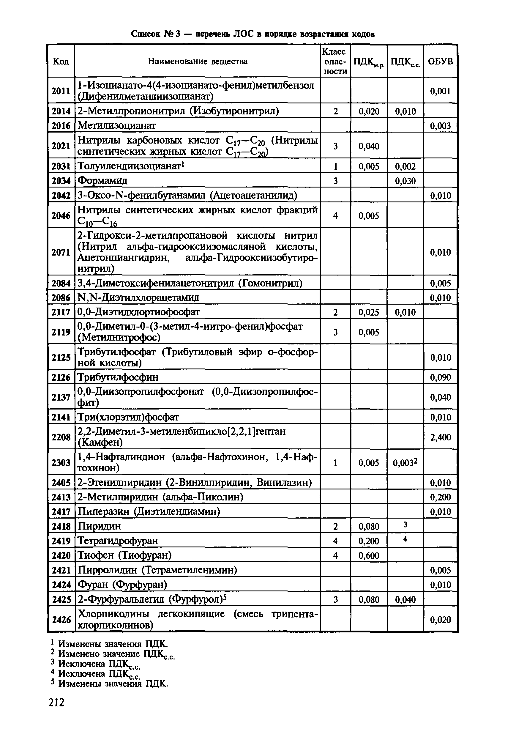 | Оглавление: | Список № 1 Перечень загрязняющих веществ в алфавитном порядке Список № 2 Перечень загрязняющих веществ в порядке возрастания кодов Список № 3 Перечень ЛОС в порядке возрастания кодов Список № 4 Указатель основных синонимов, технических, торговых и фирменных названий веществ в алфавитном порядке А. Для веществ с установленными значениями ПДК Б. Для веществ с установленными значениями ОБУВ Список № 5 Указатель основных синонимов, технических, торговых и фирменных названий веществ в порядке возрастания кодов А. Для веществ с установленными значениями ПДК Б. Для веществ с установленными значениями ОБУВ |